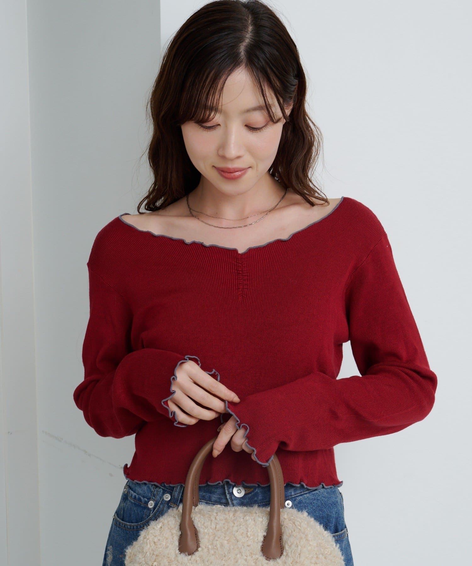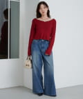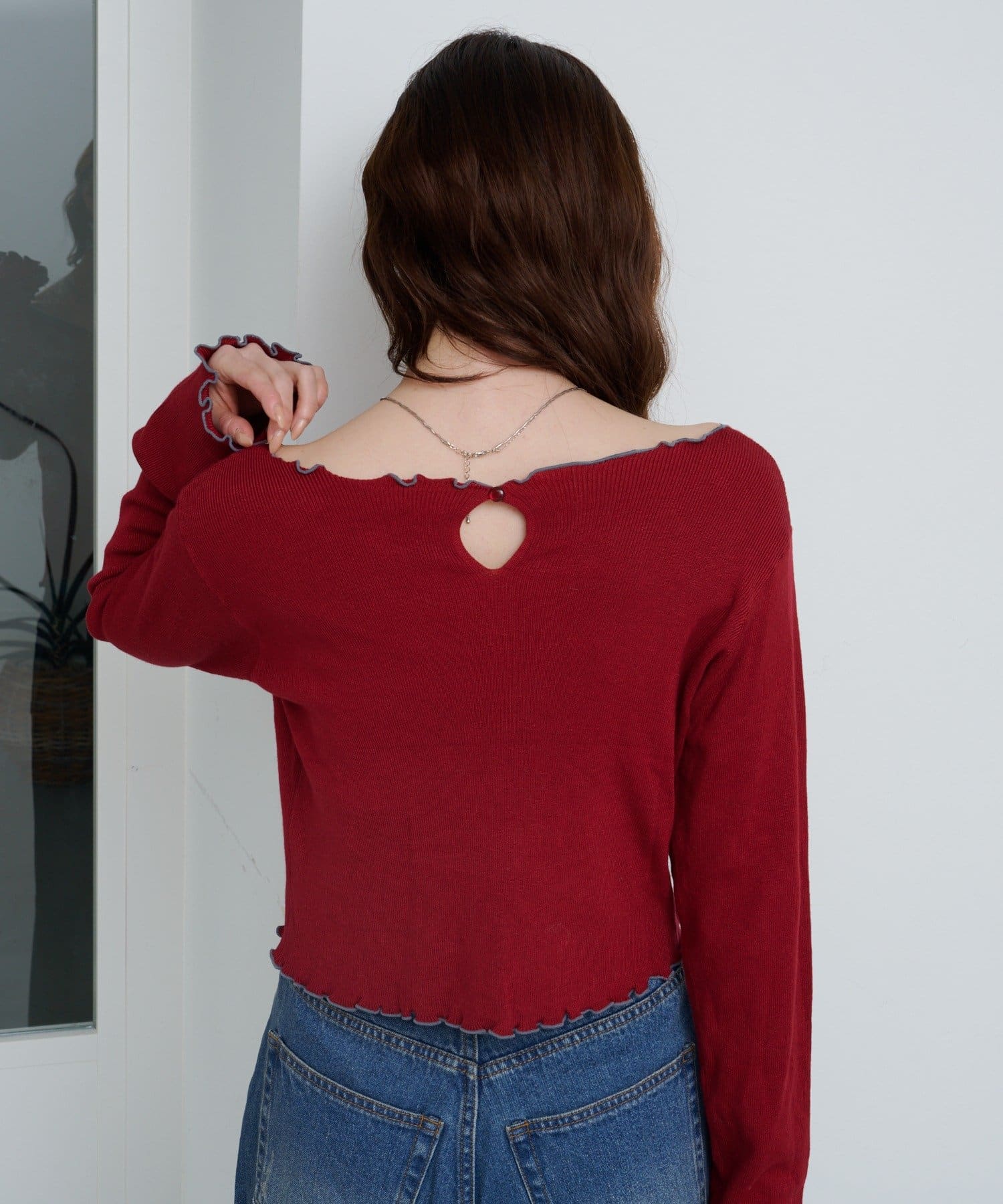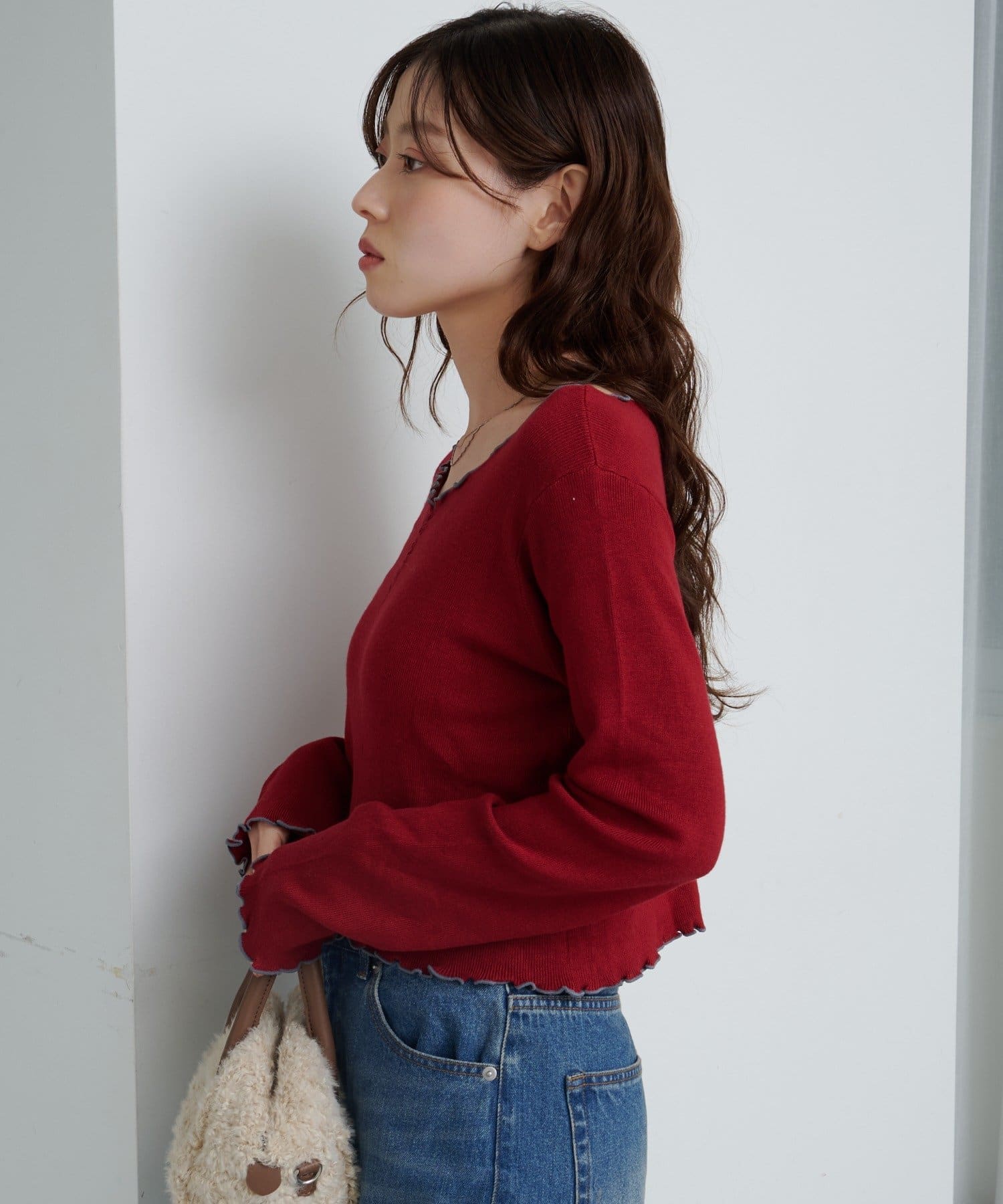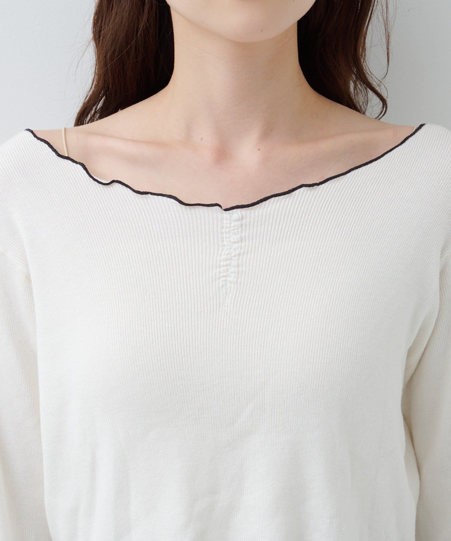 首元と袖口、裾に施されたメロウデザインがフェミニンな印象のニットプルオーバー。