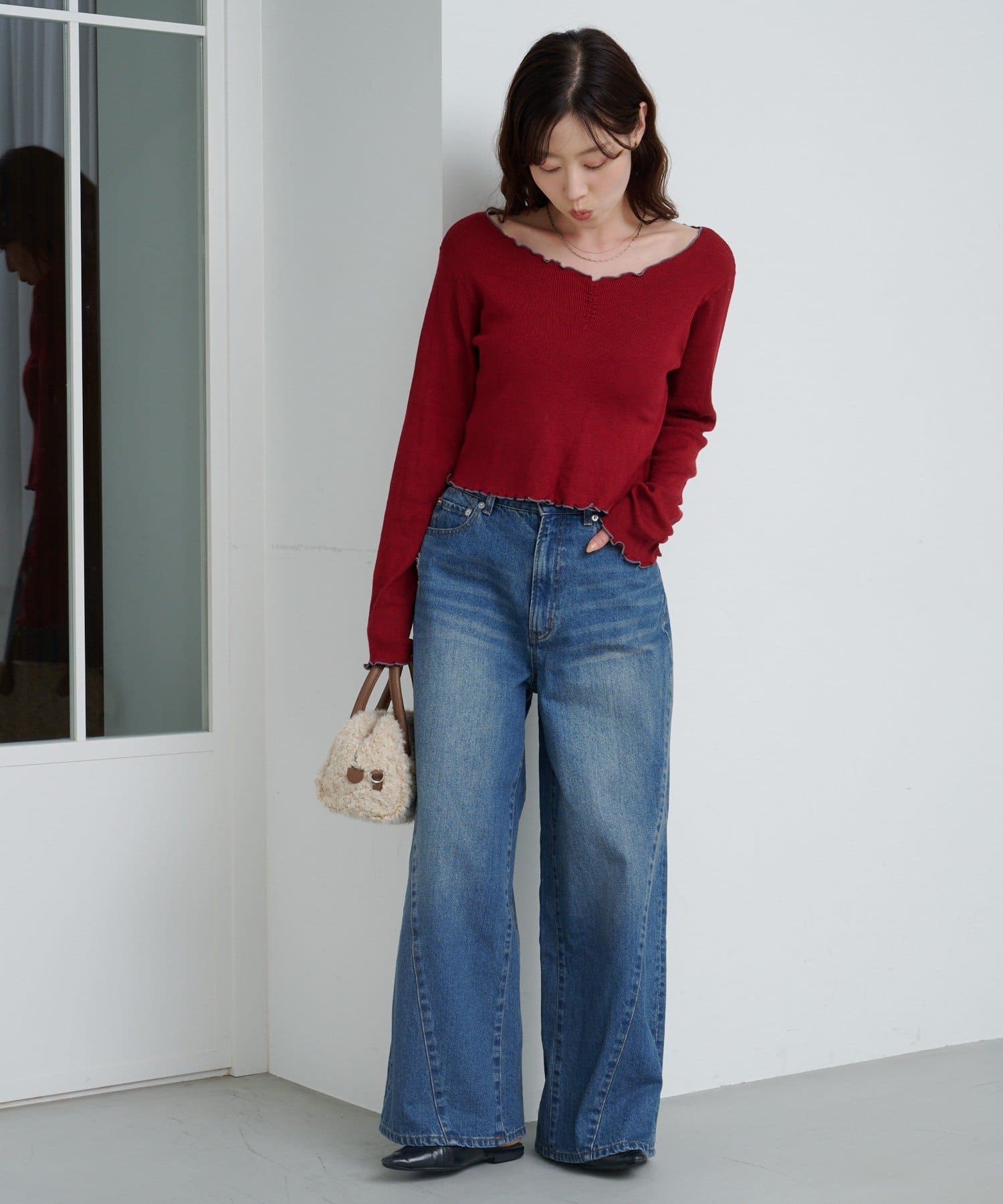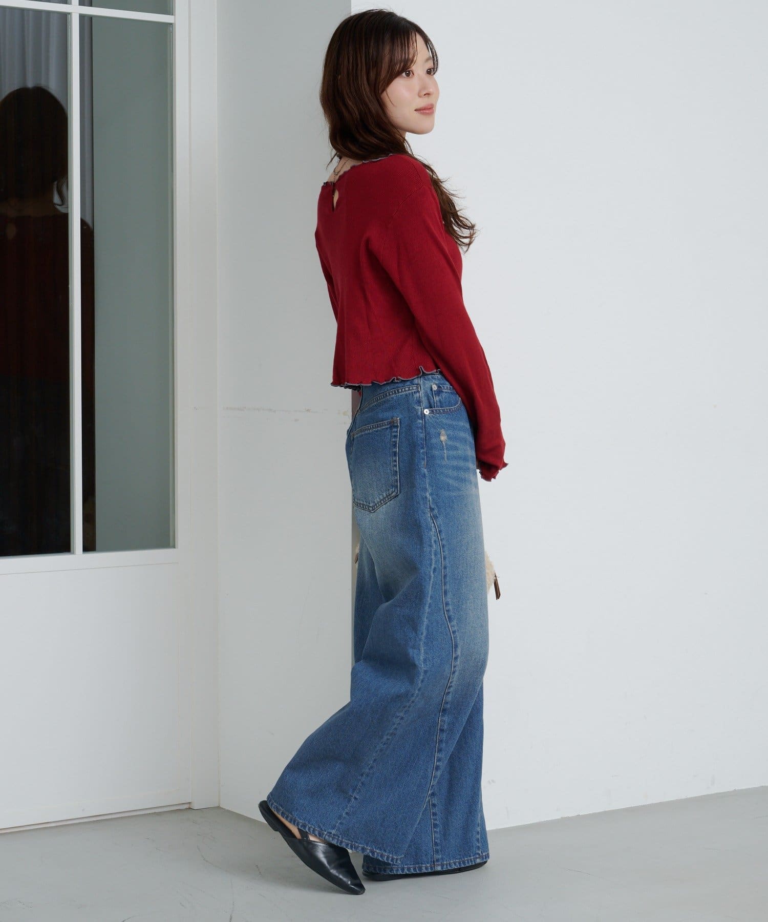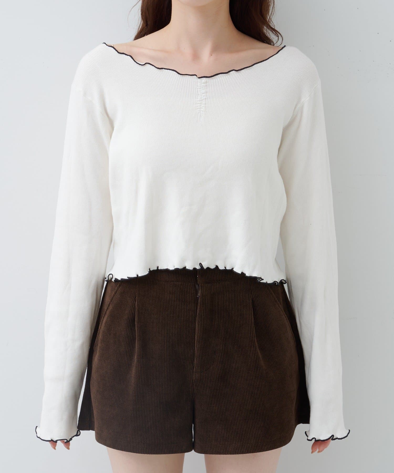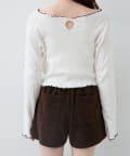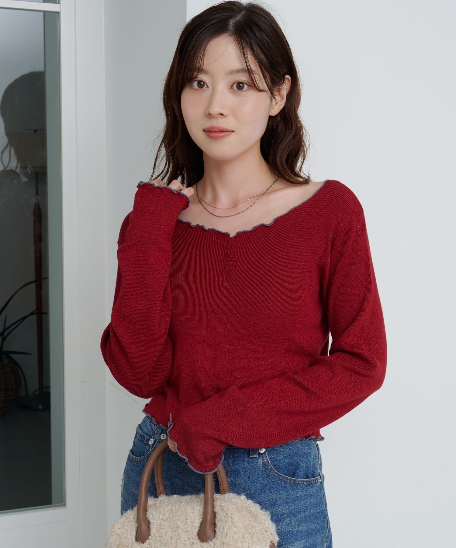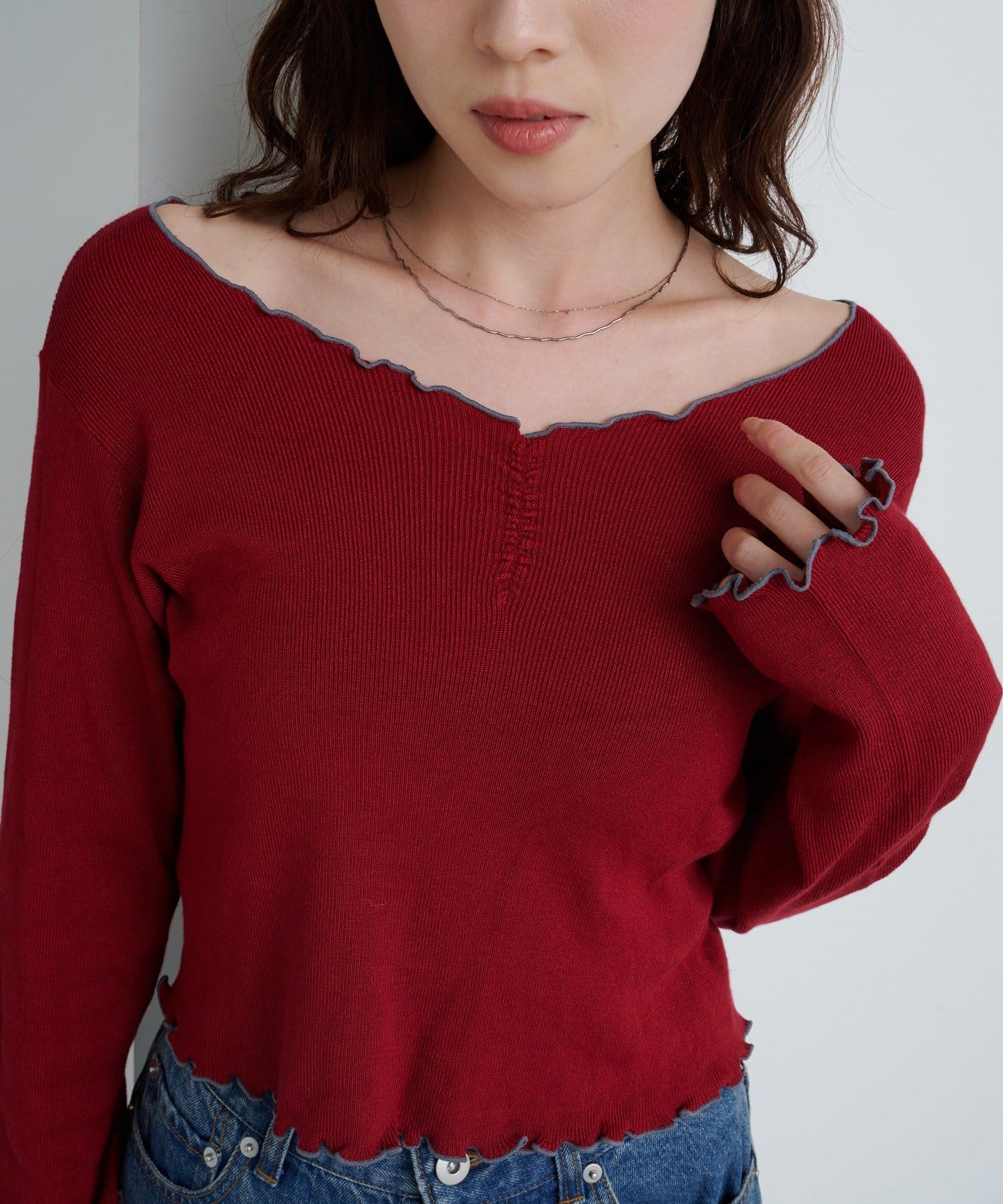 首元と袖口、裾に施されたメロウデザインがフェミニンな印象のニットプルオーバー。