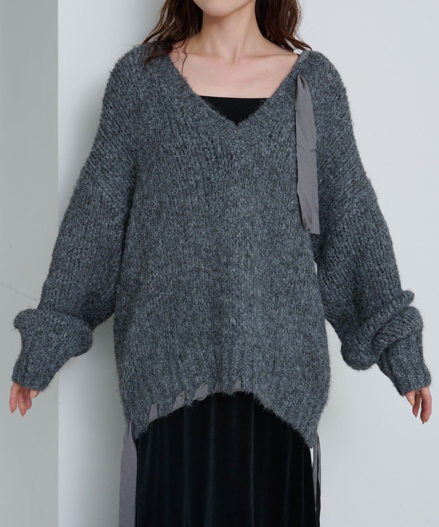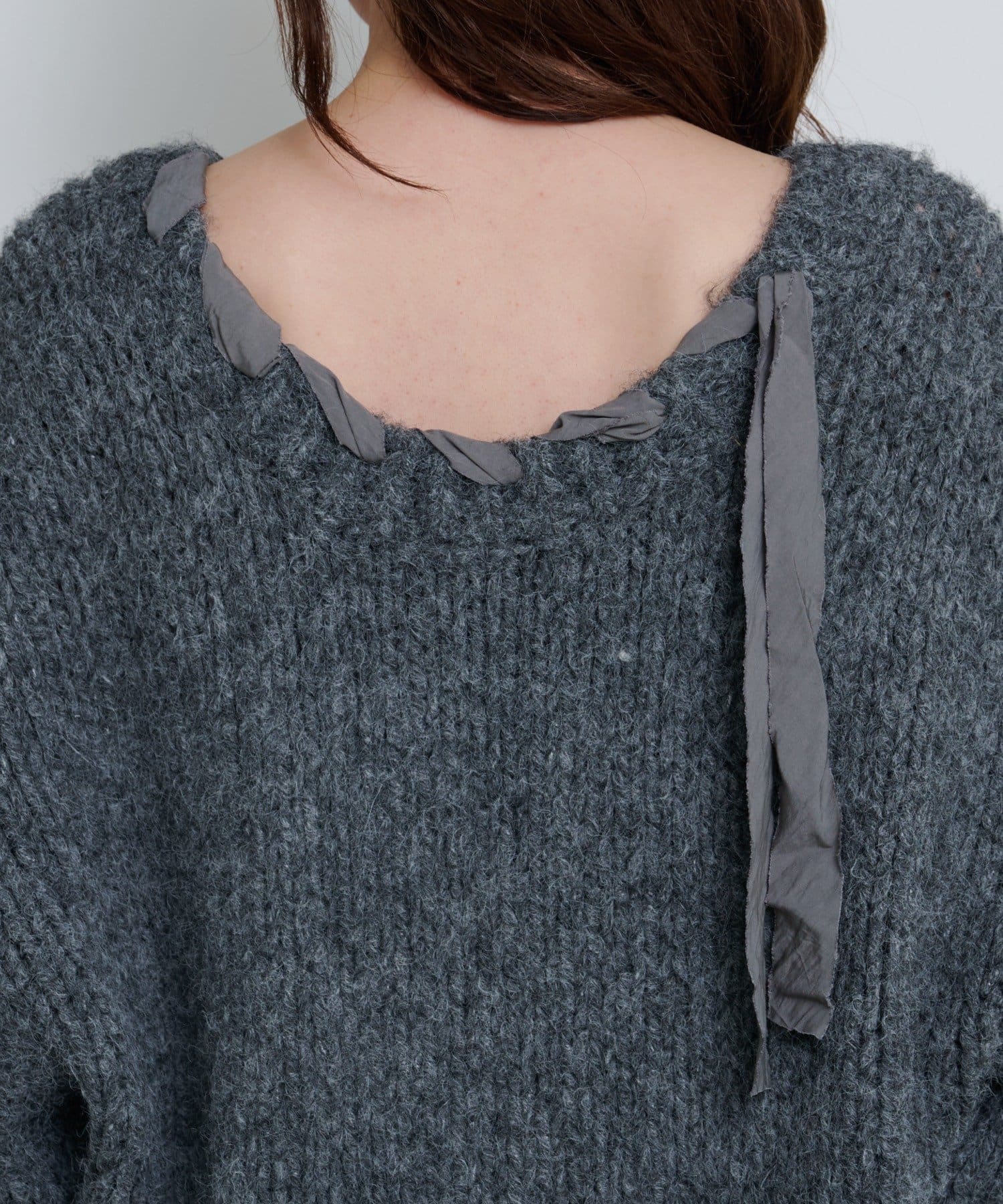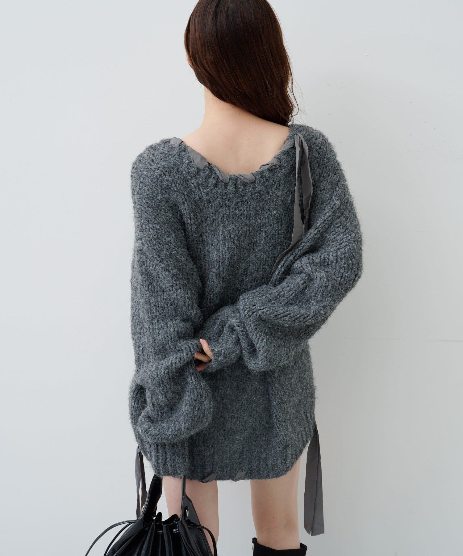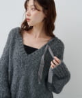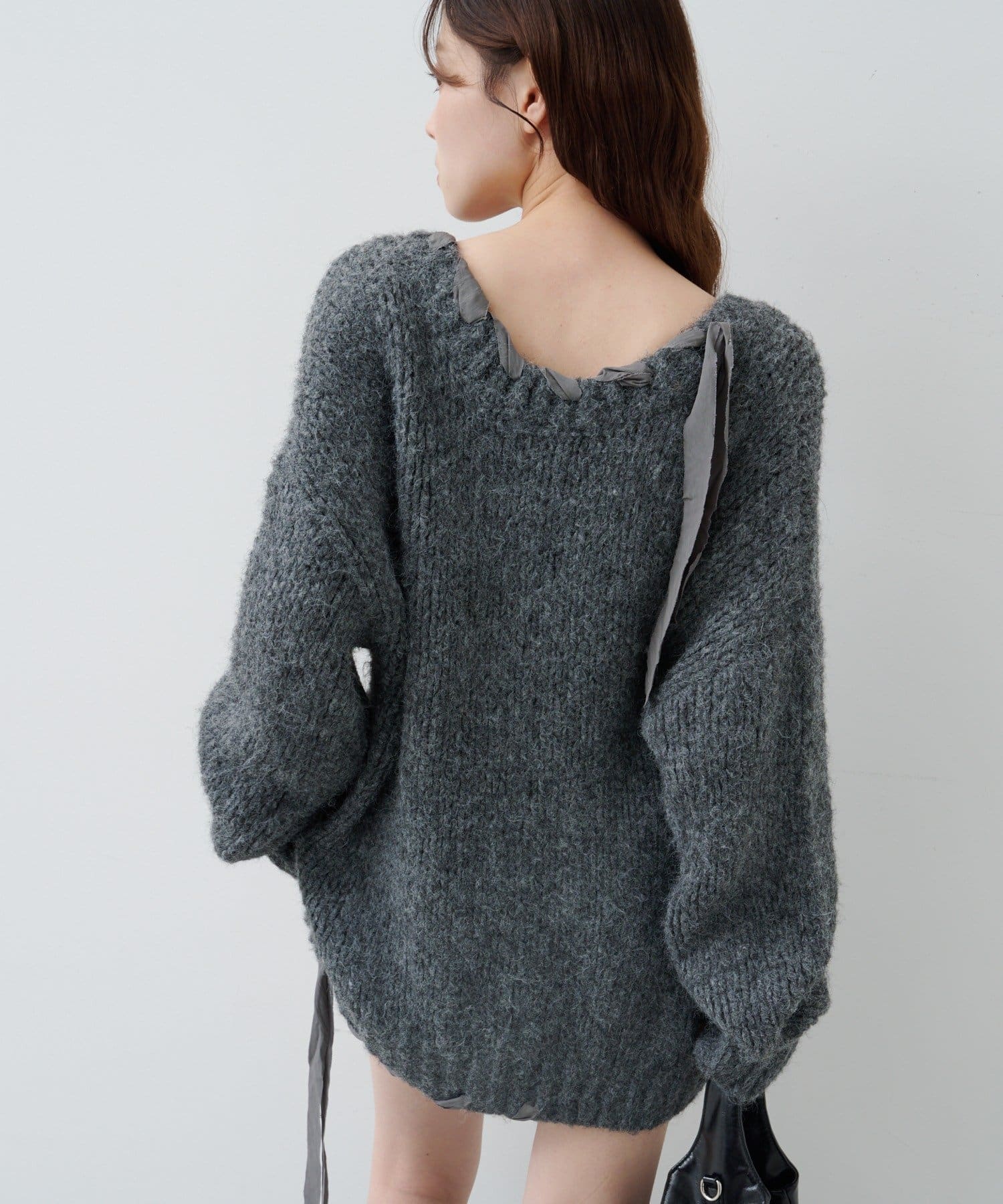 ゆったりとしたシルエットとリボンテープのディテールがポイントのローゲージニット。