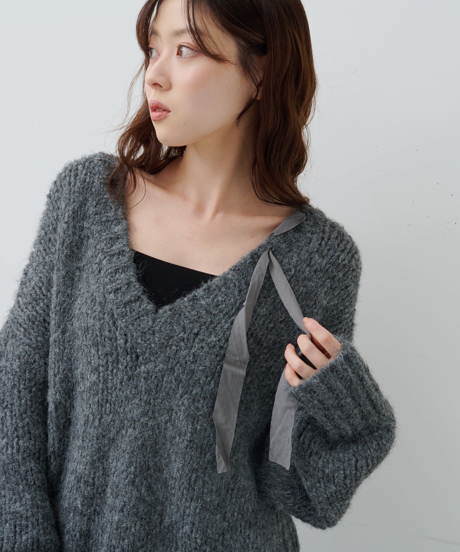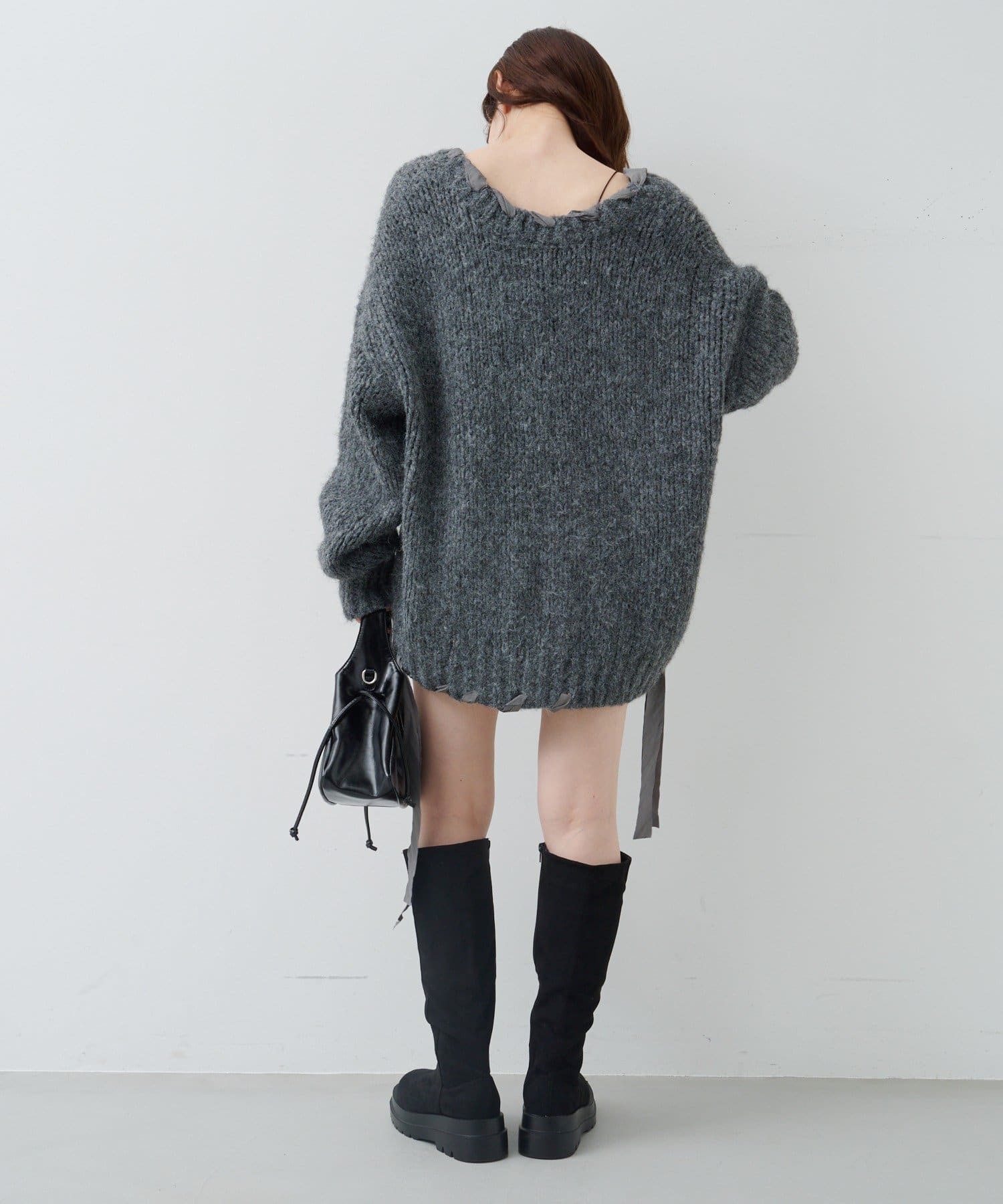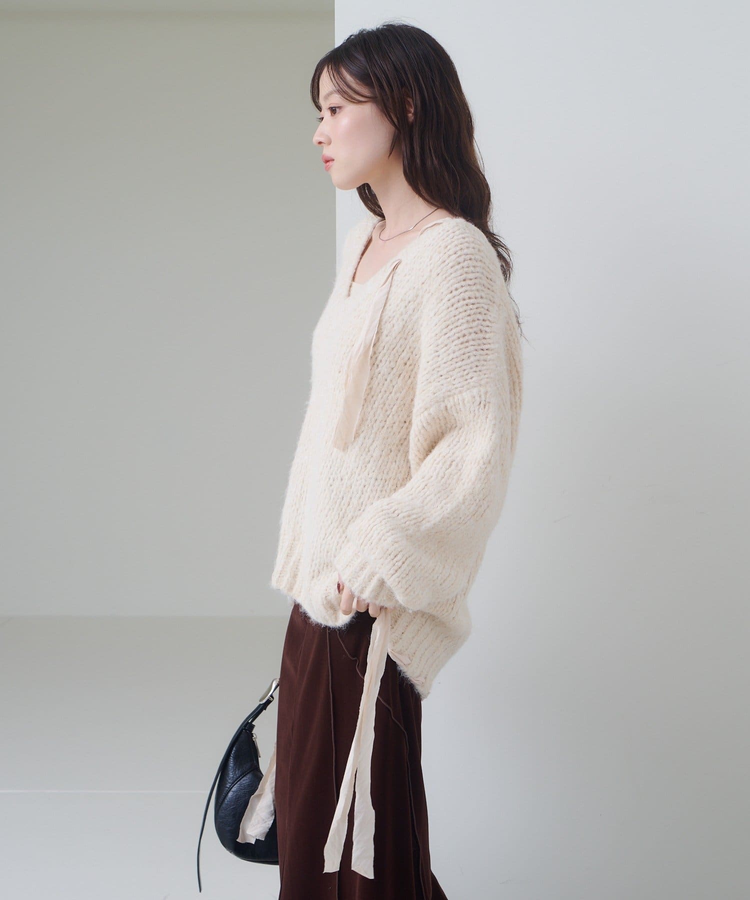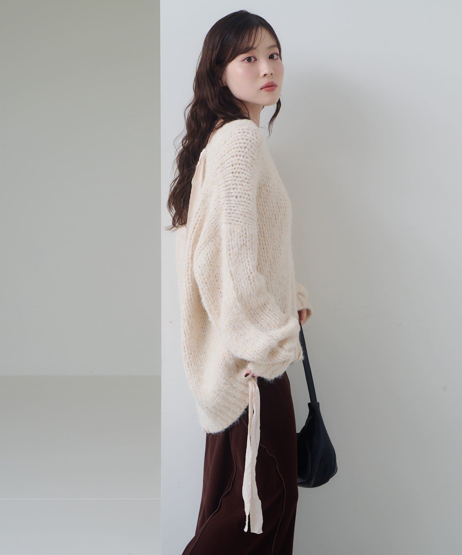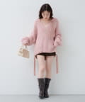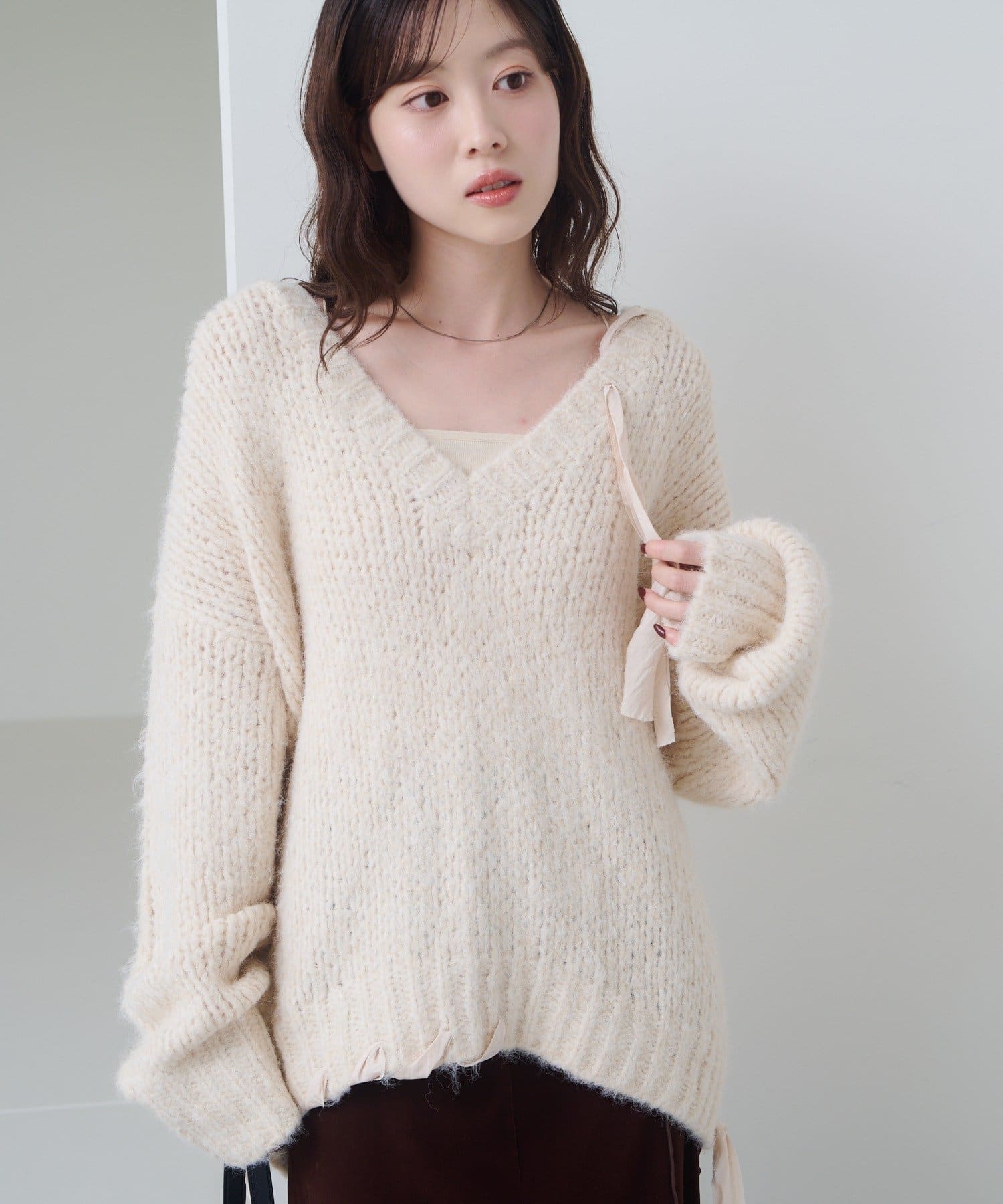 ゆったりとしたシルエットとリボンテープのディテールがポイントのローゲージニット。