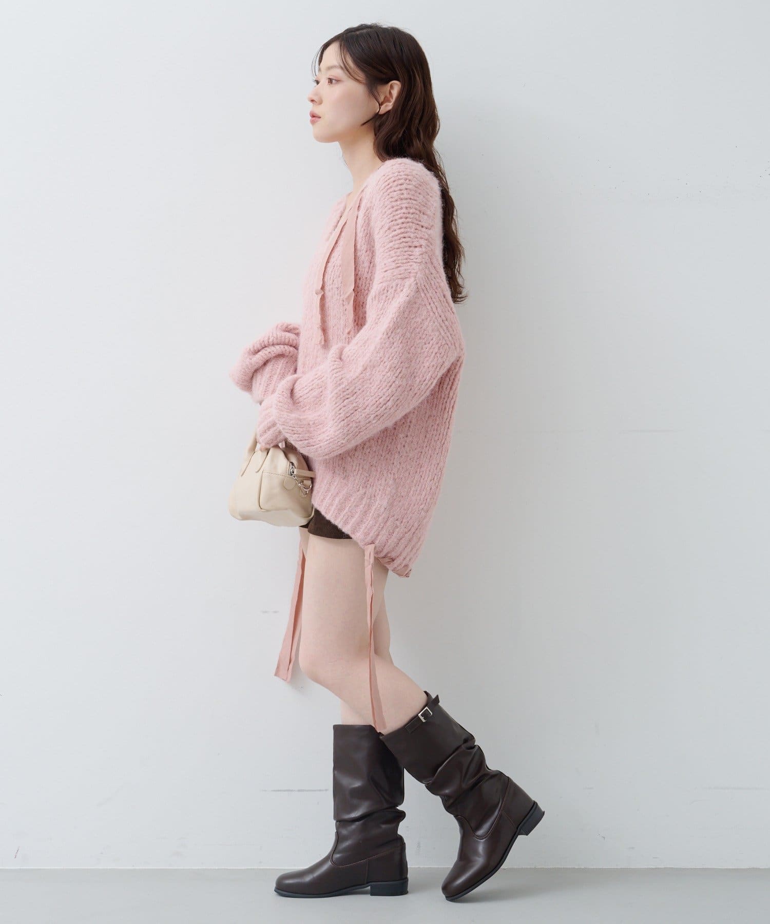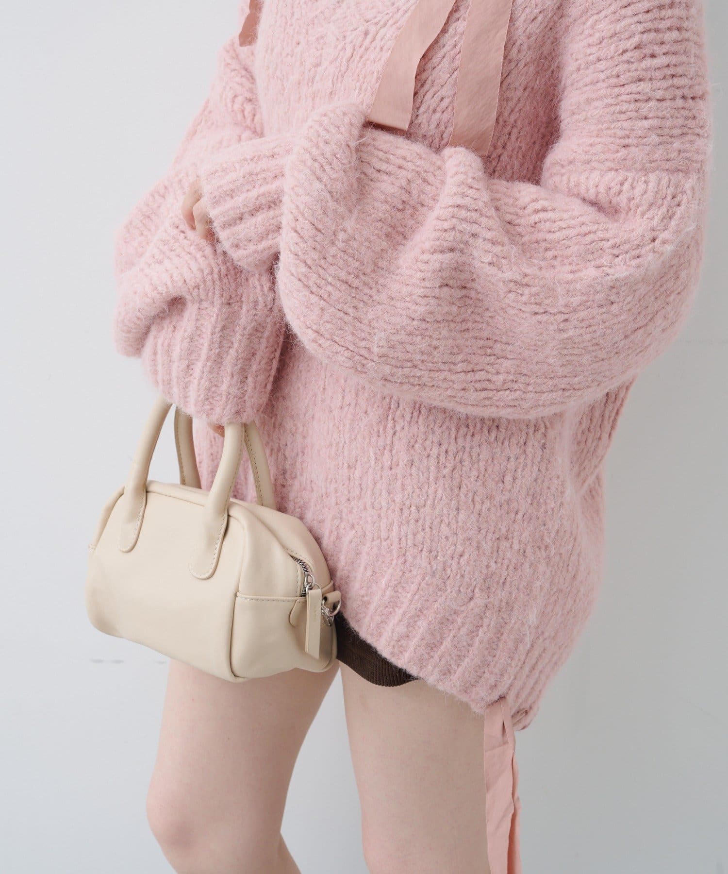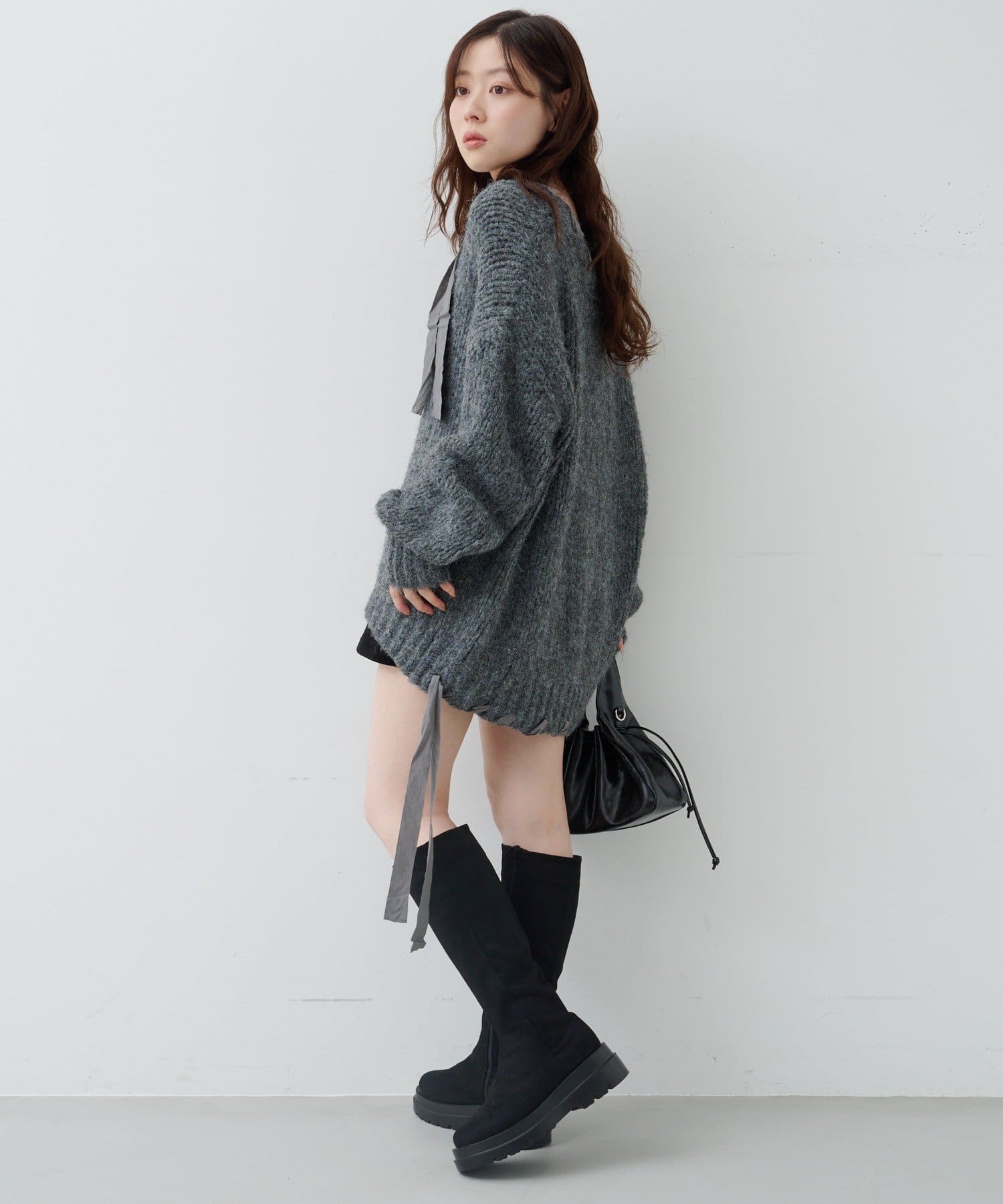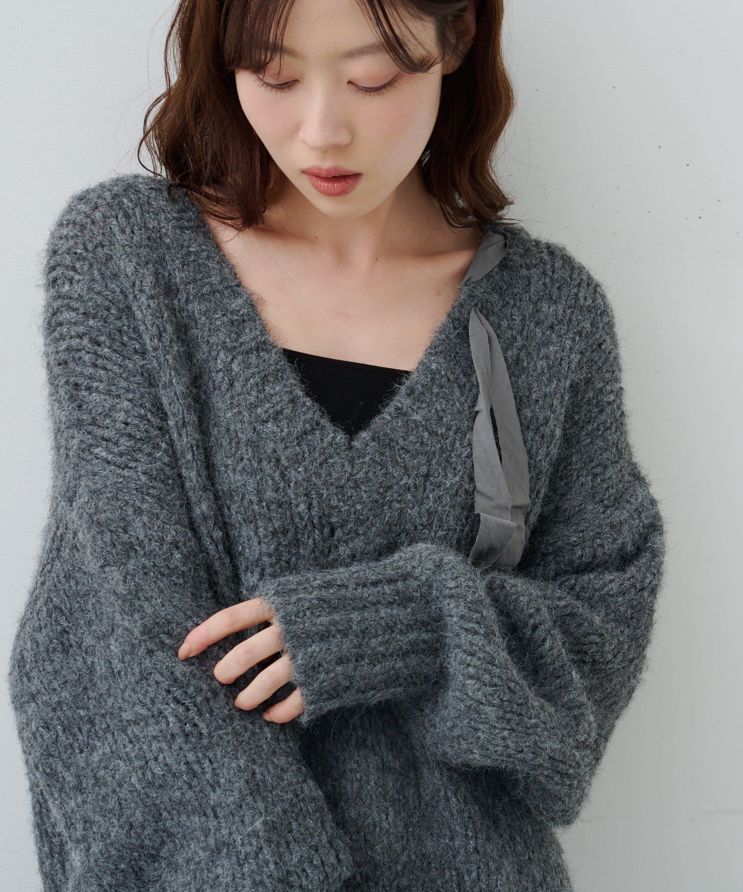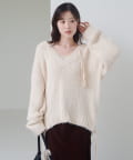 ゆったりとしたシルエットとリボンテープのディテールがポイントのローゲージニット。