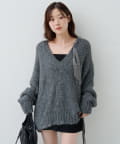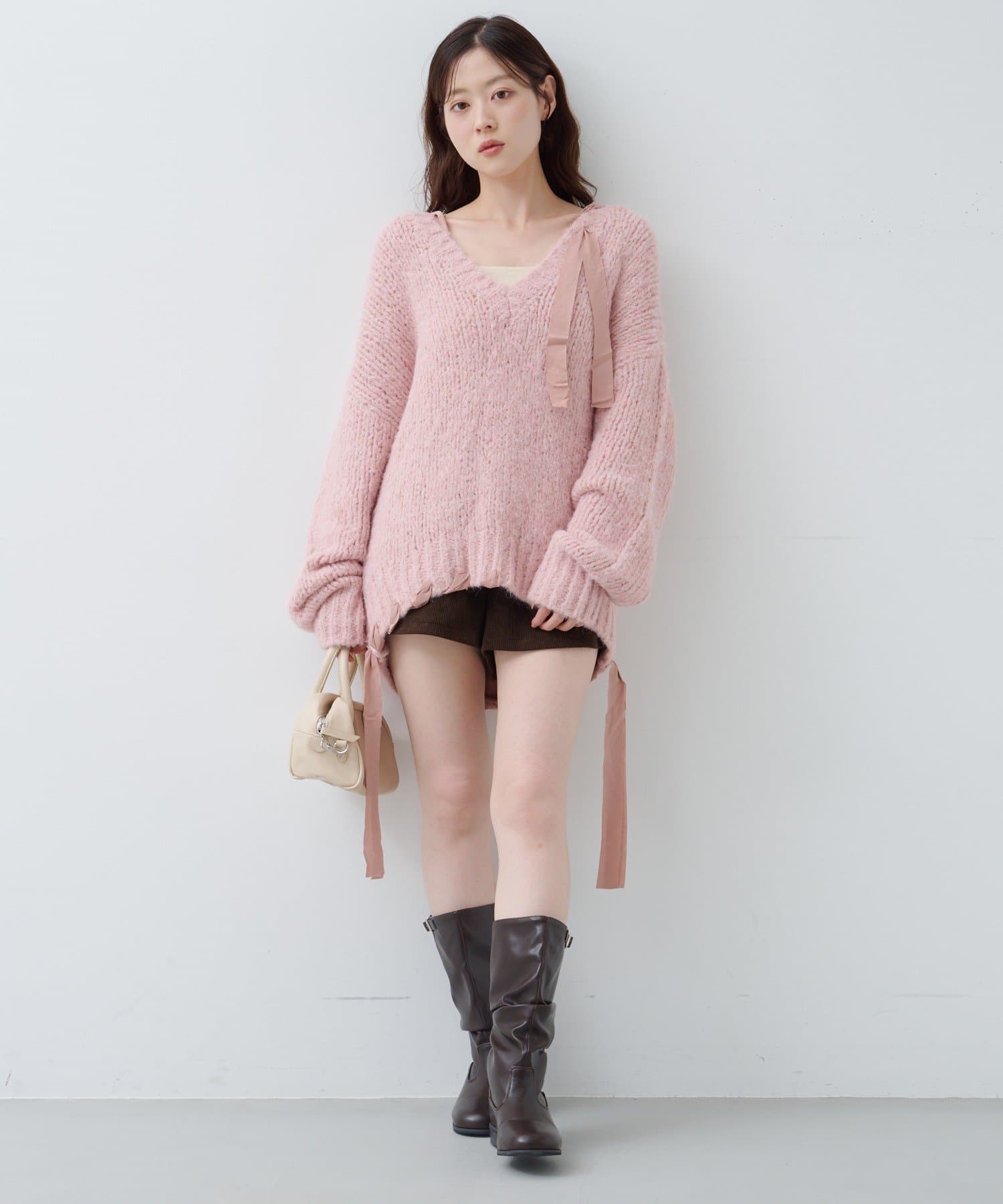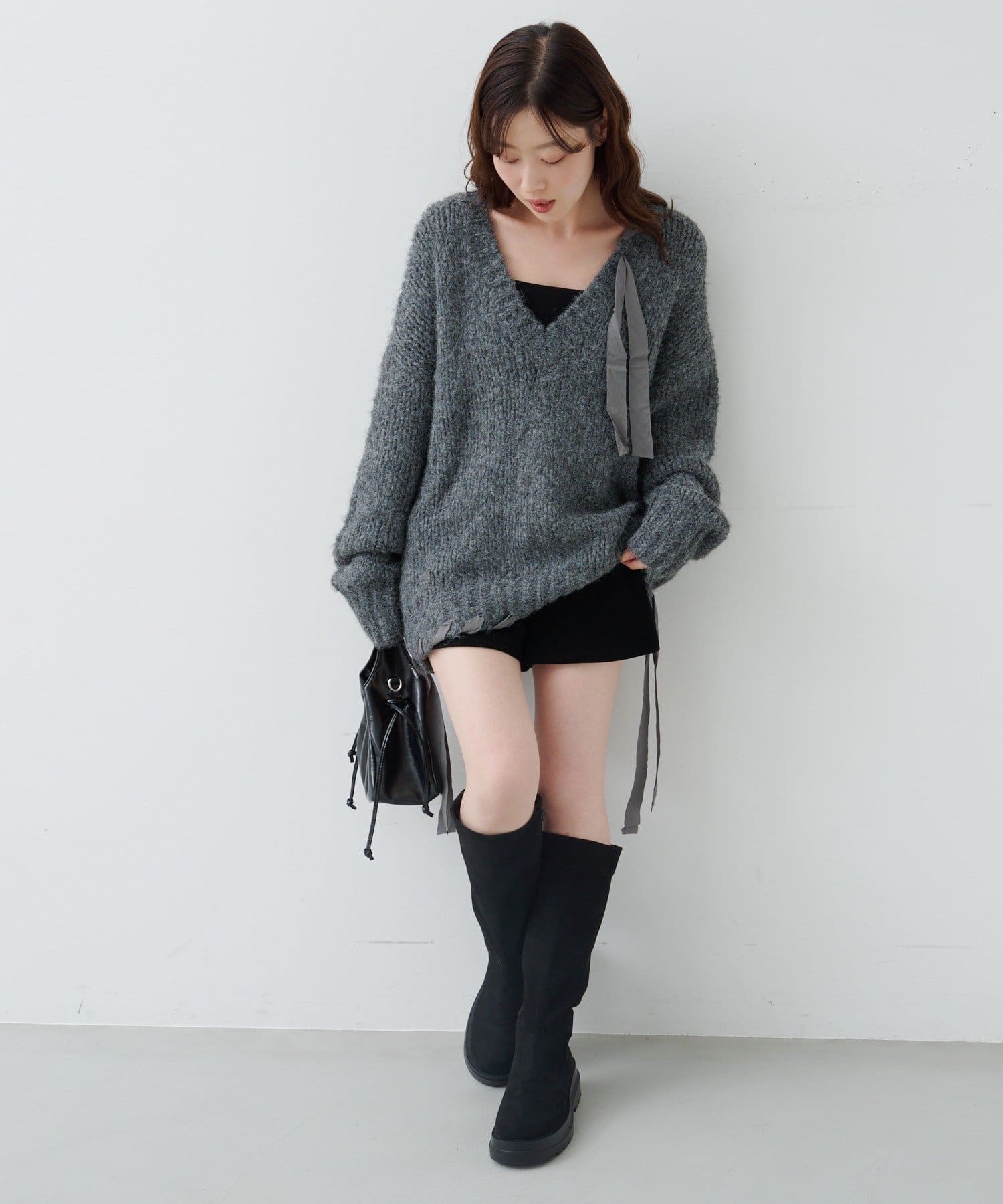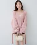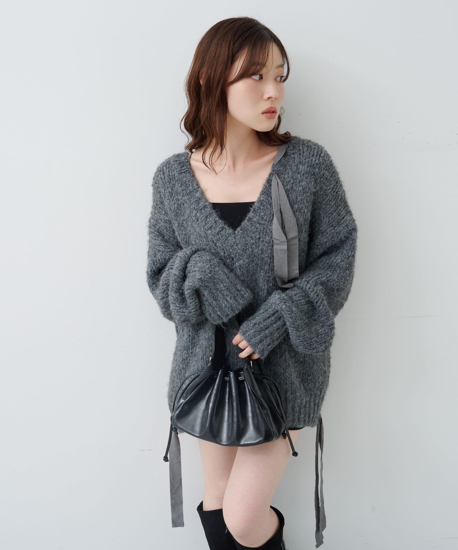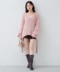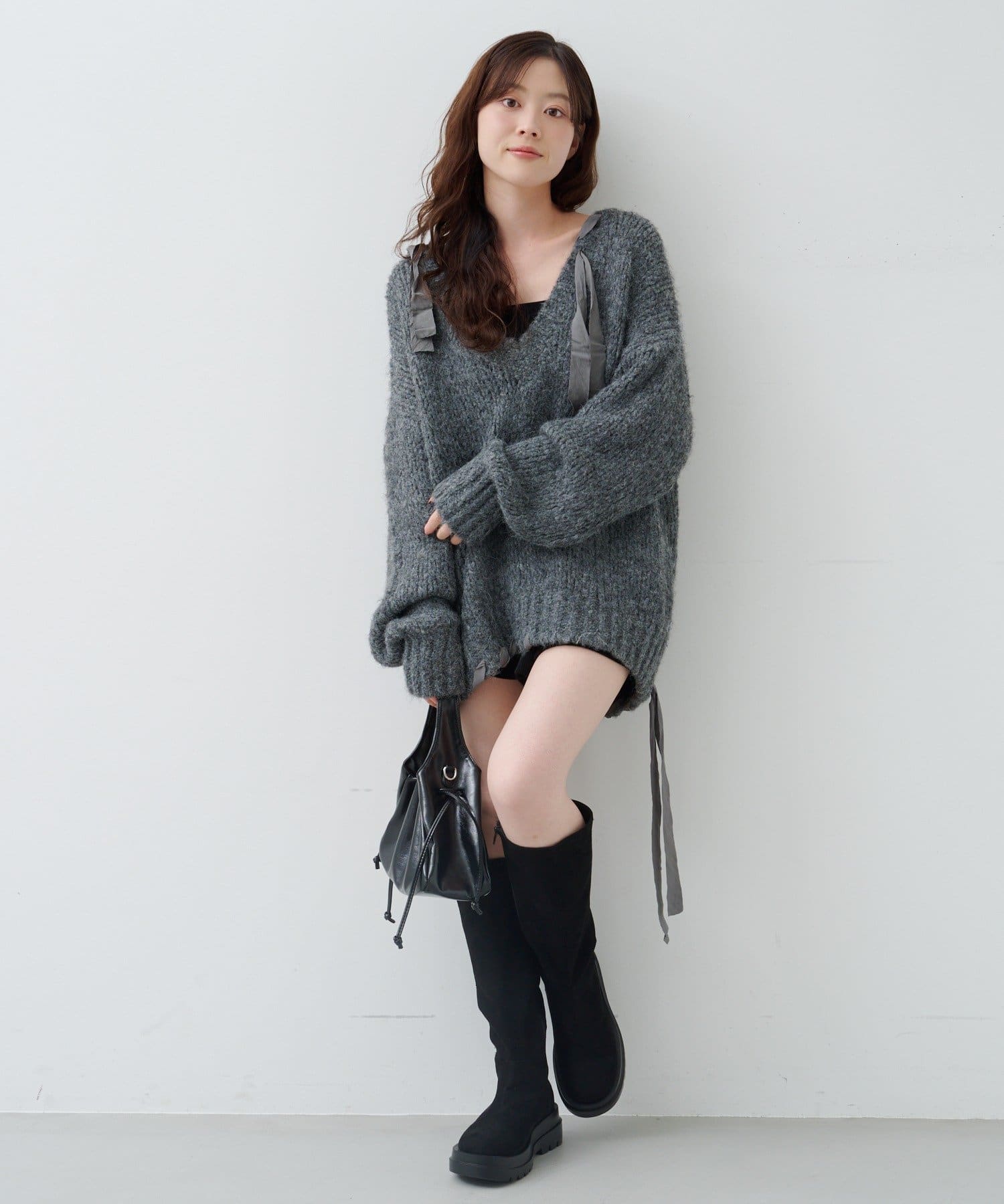 ゆったりとしたシルエットとリボンテープのディテールがポイントのローゲージニット。