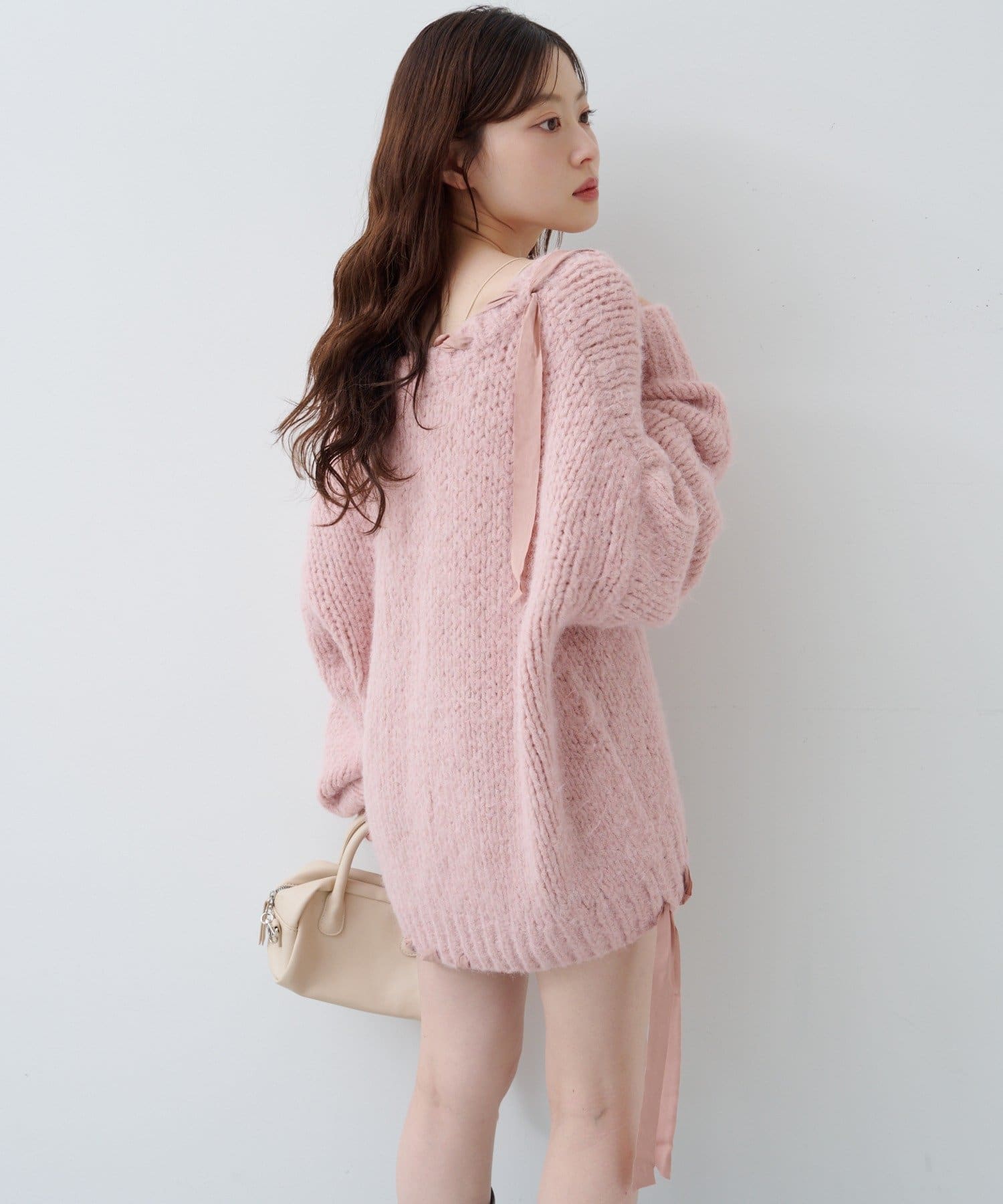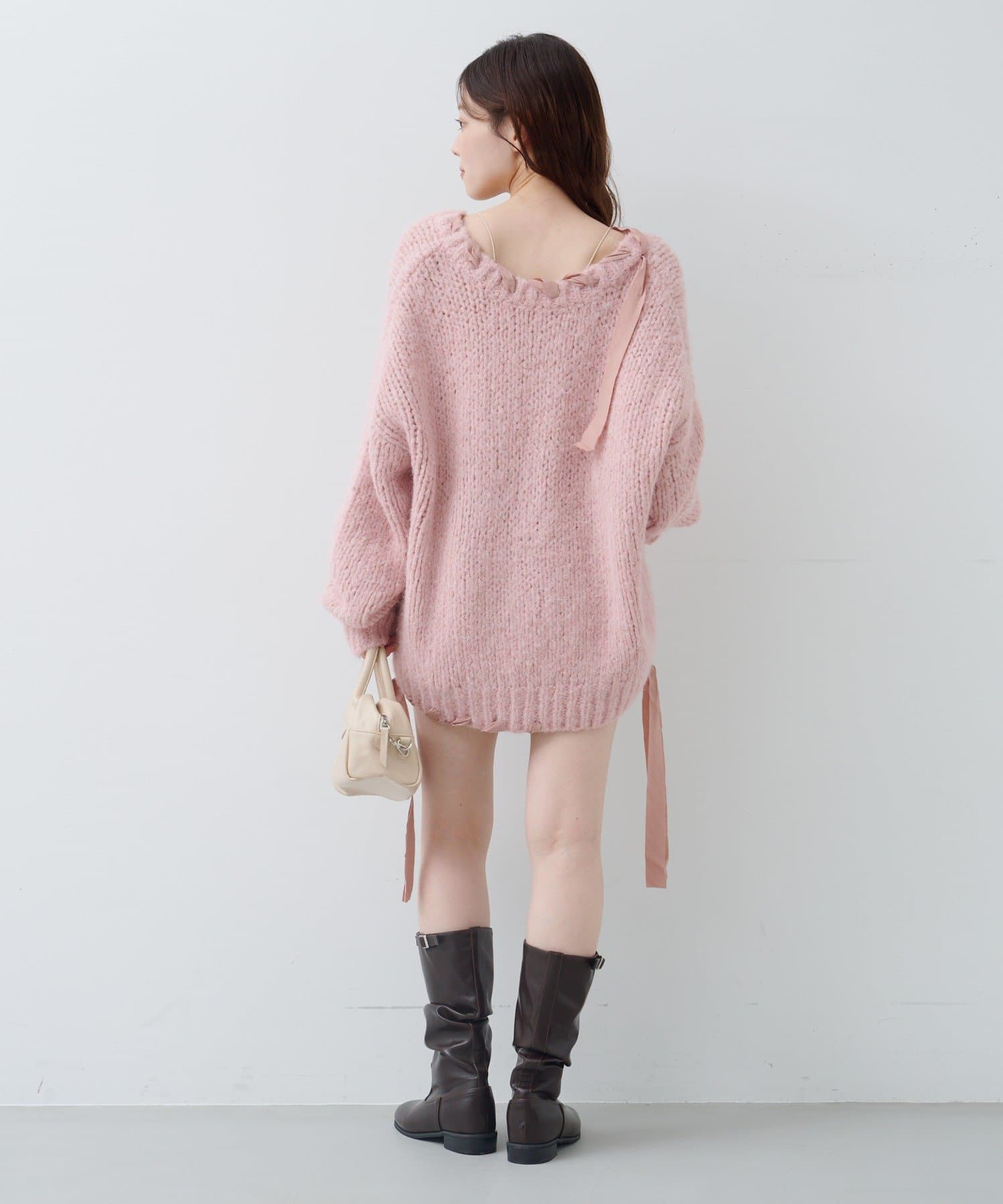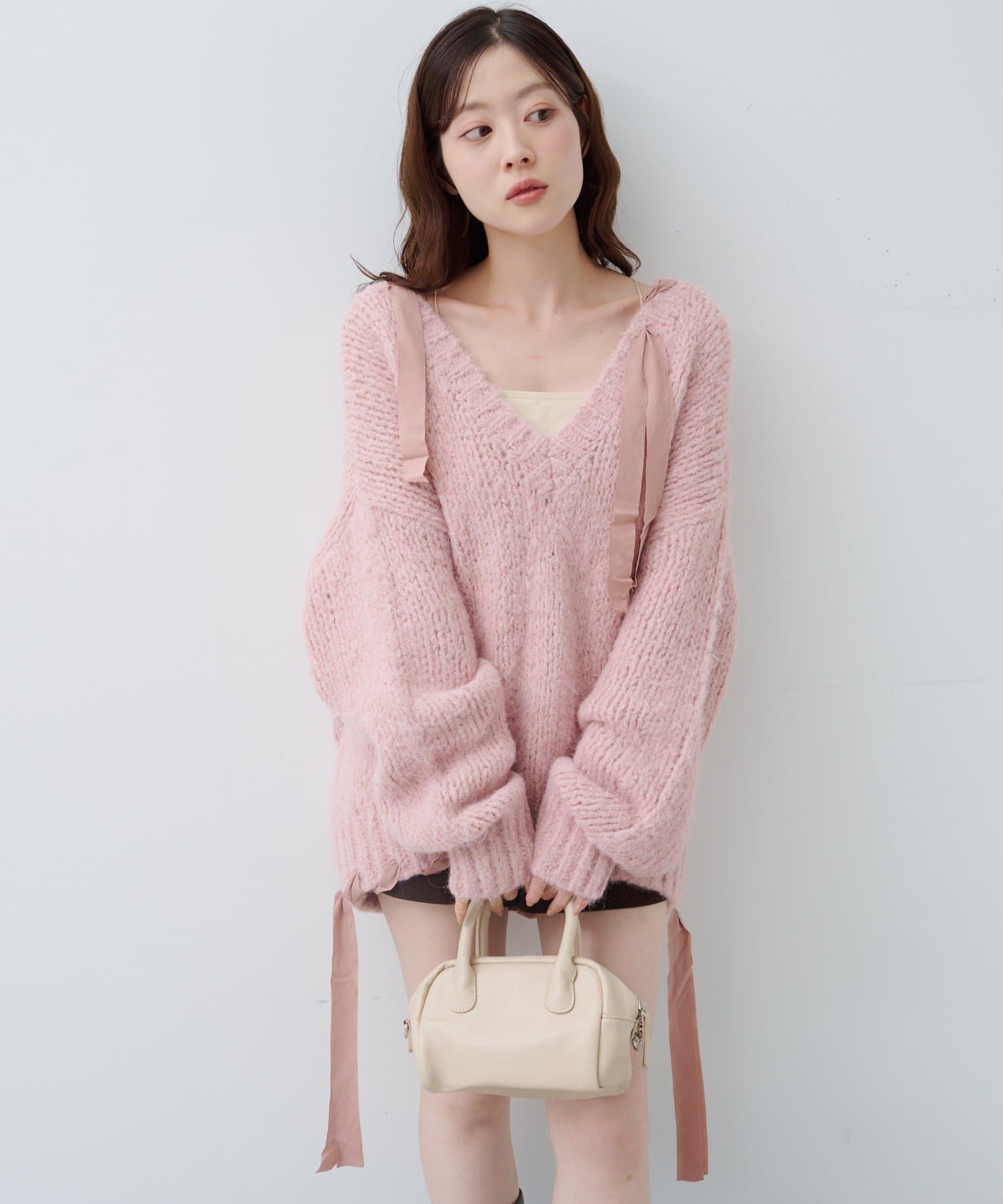 ざっくりとした編み地に、肩や裾にあしらわれたリボンが女性らしさを添えます。