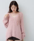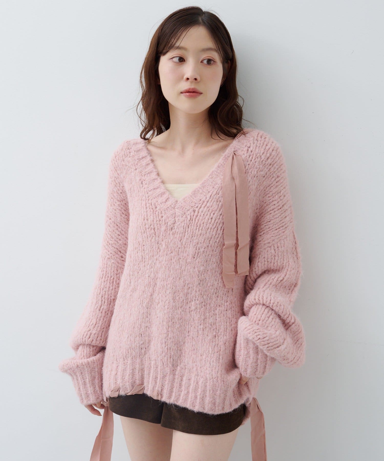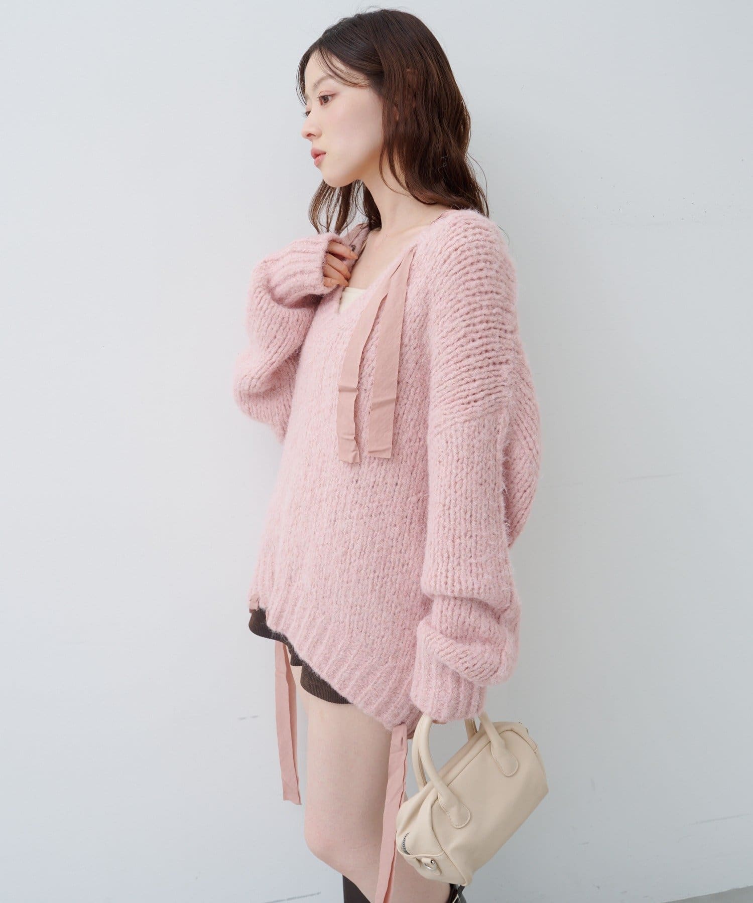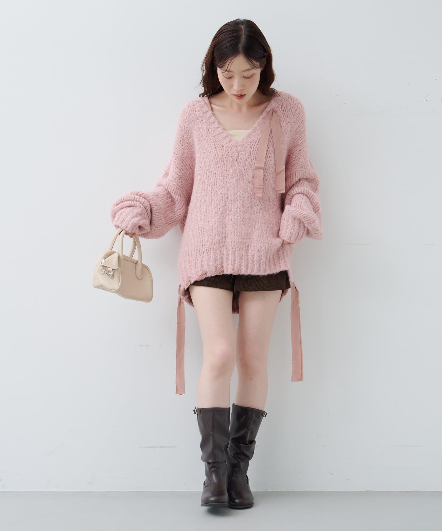 ざっくりとした編み地に、肩や裾にあしらわれたリボンが女性らしさを添えます。
