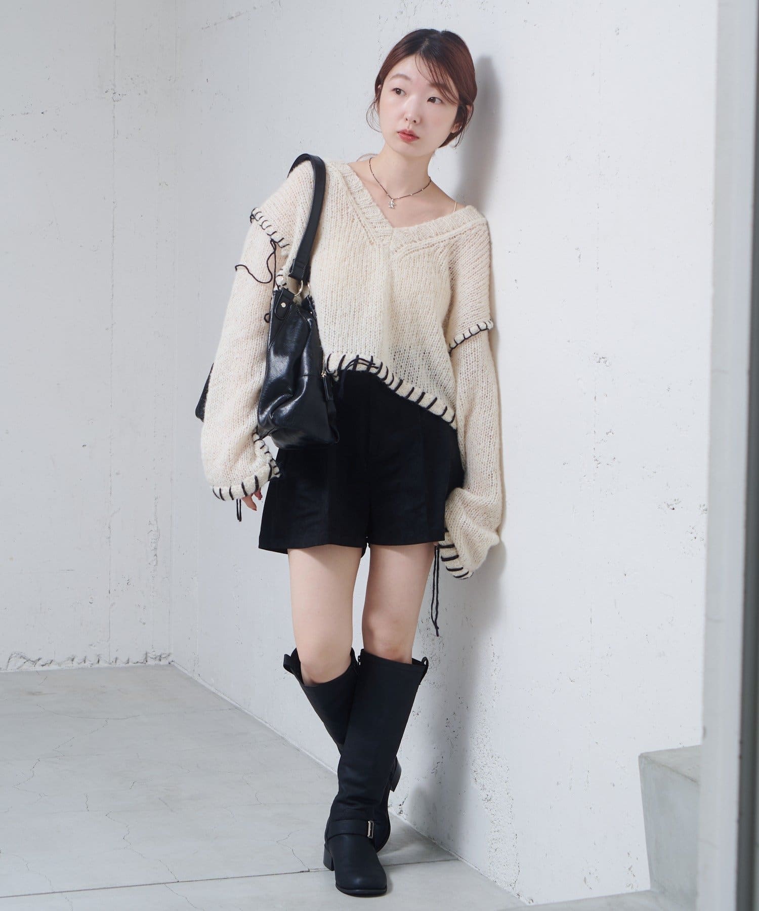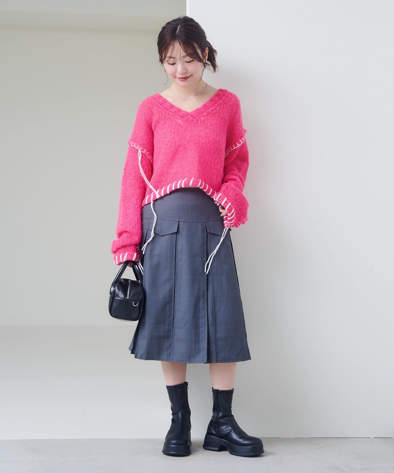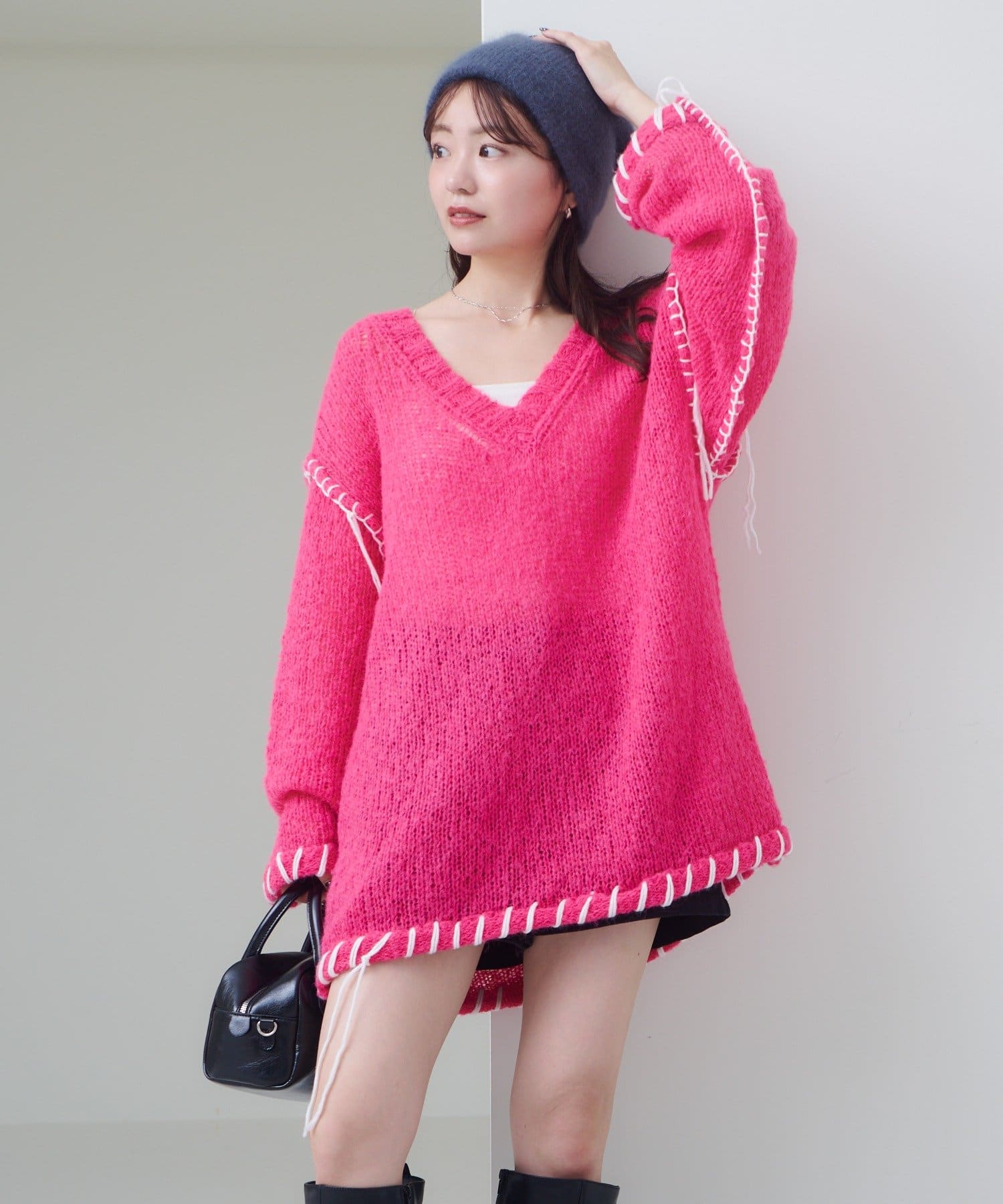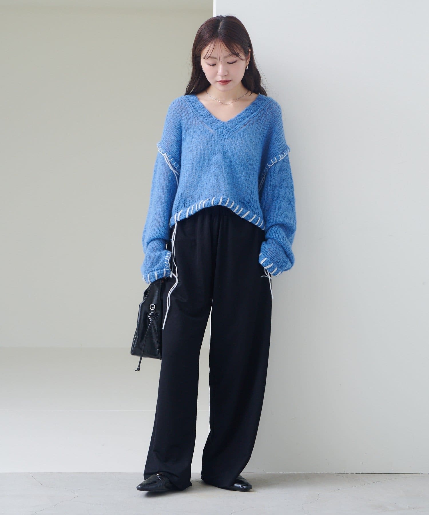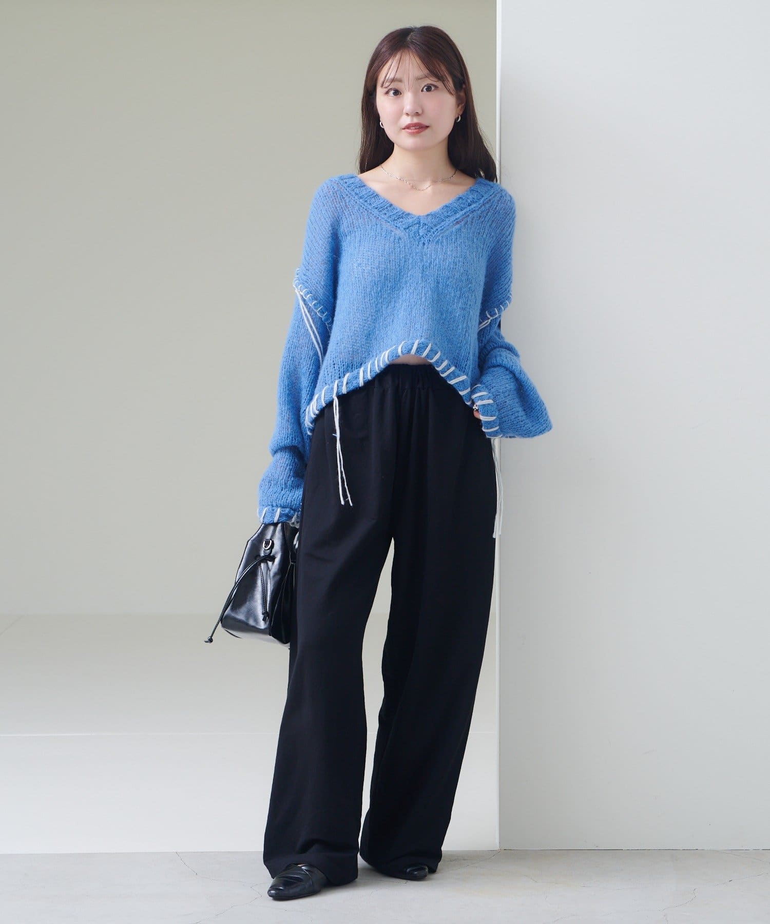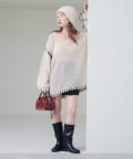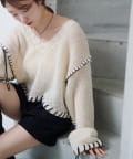 表情豊かなざっくりニットに太めのブランケットステッチを効かせた主役トップス。