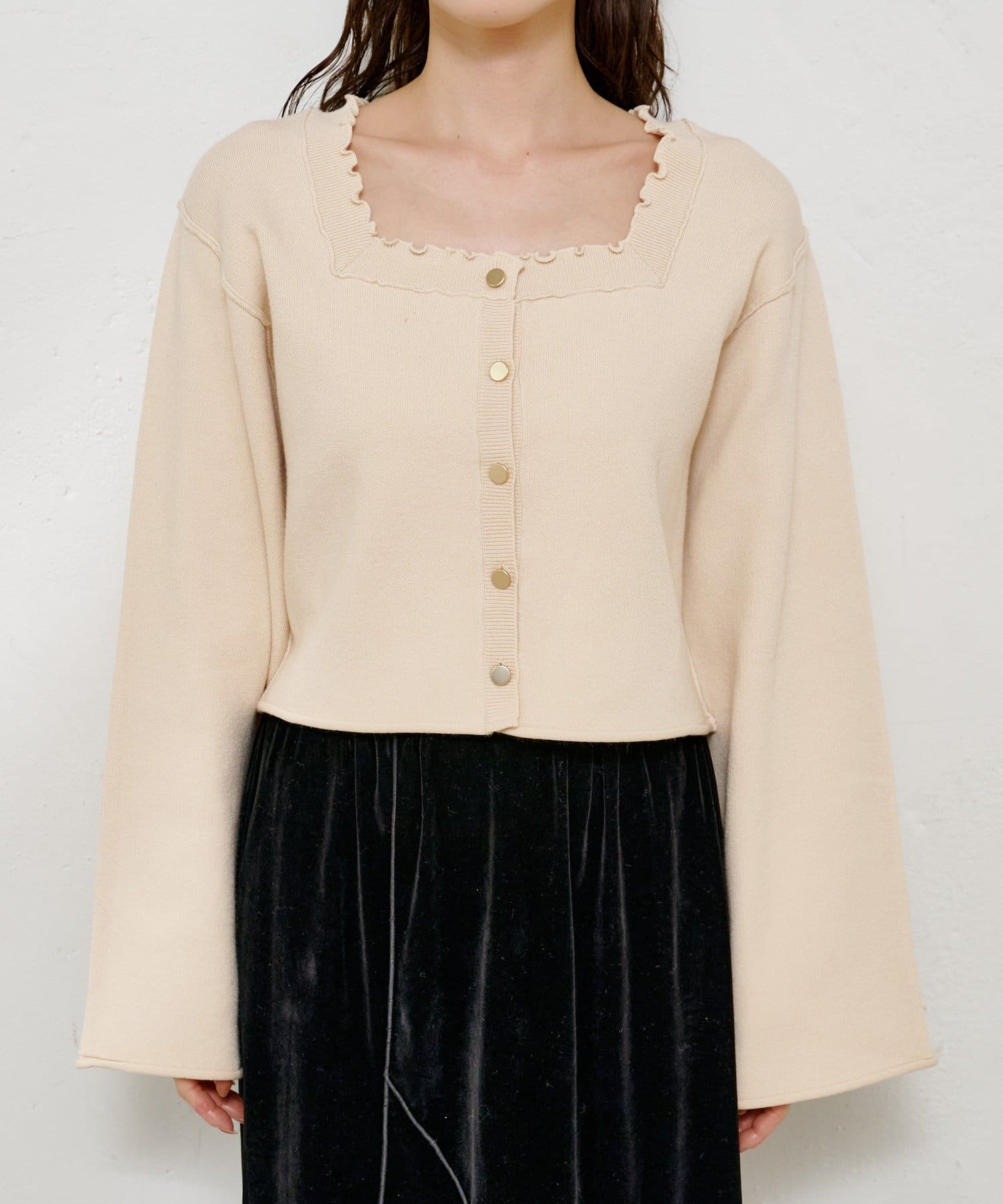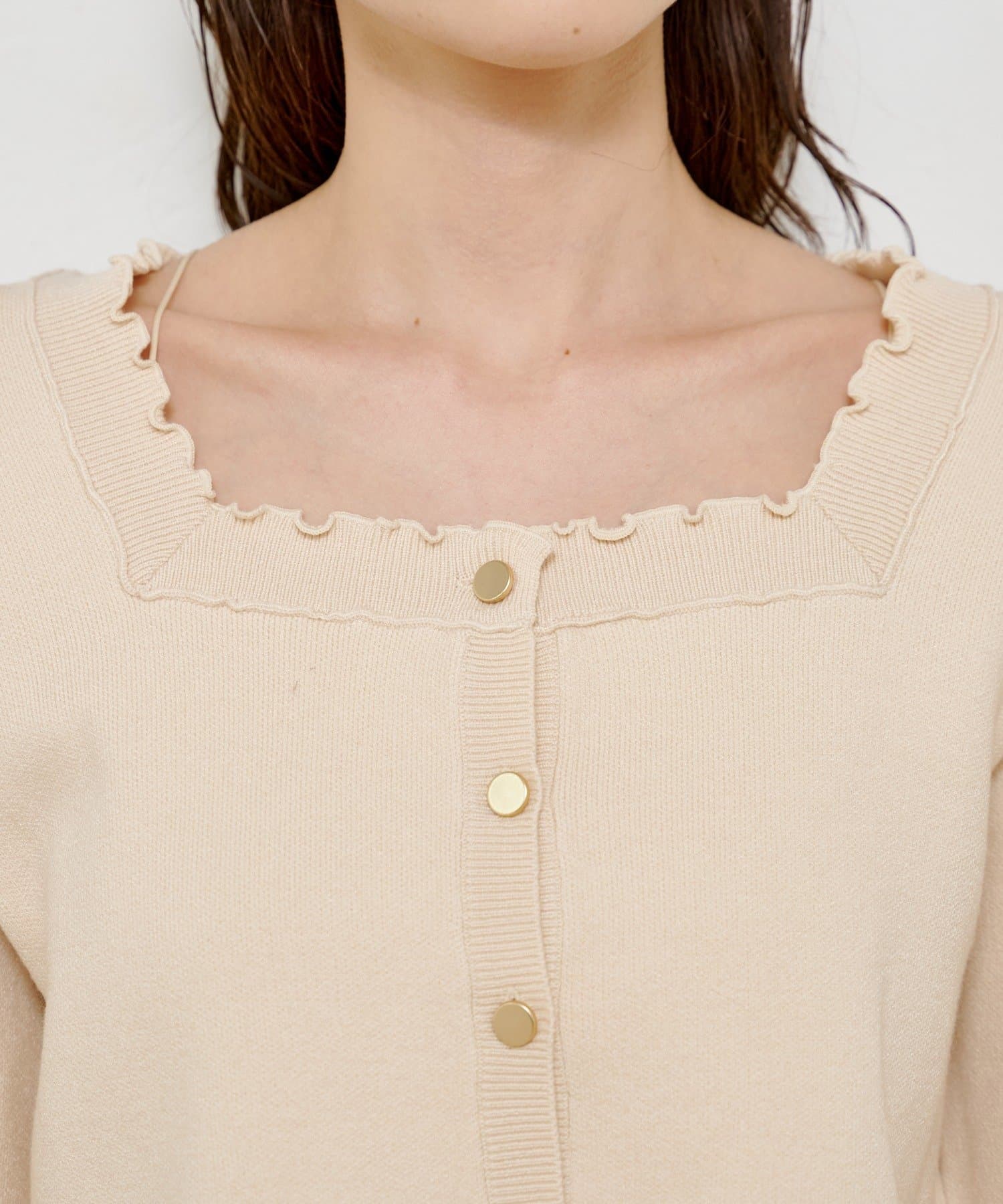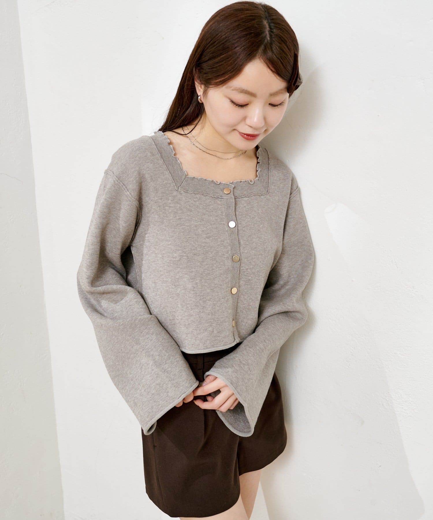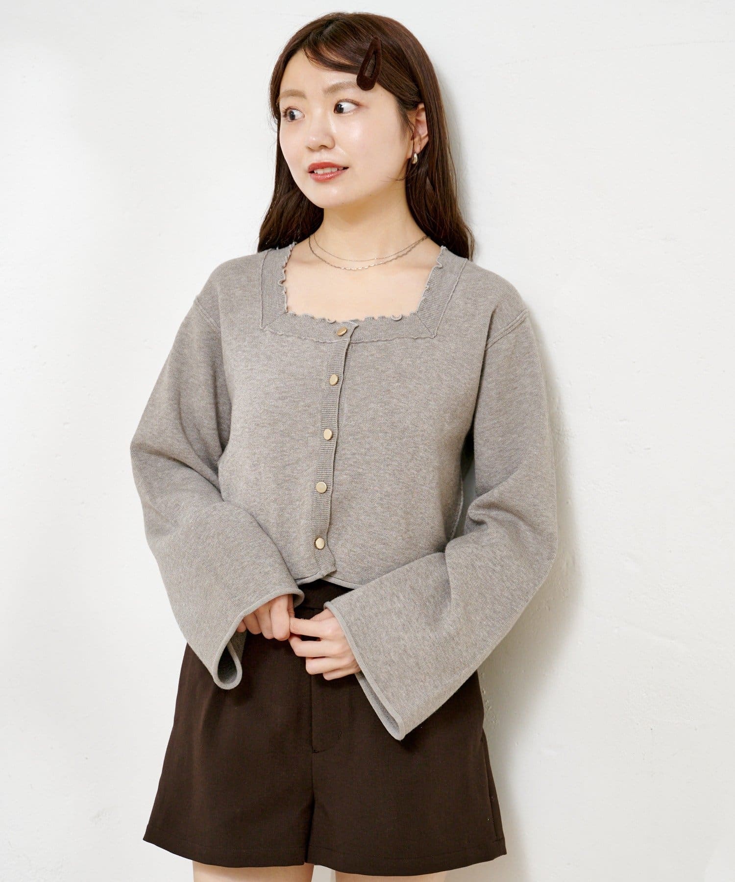 首元をすっきりと見せるスクエアネックが特徴のニットカーディガン