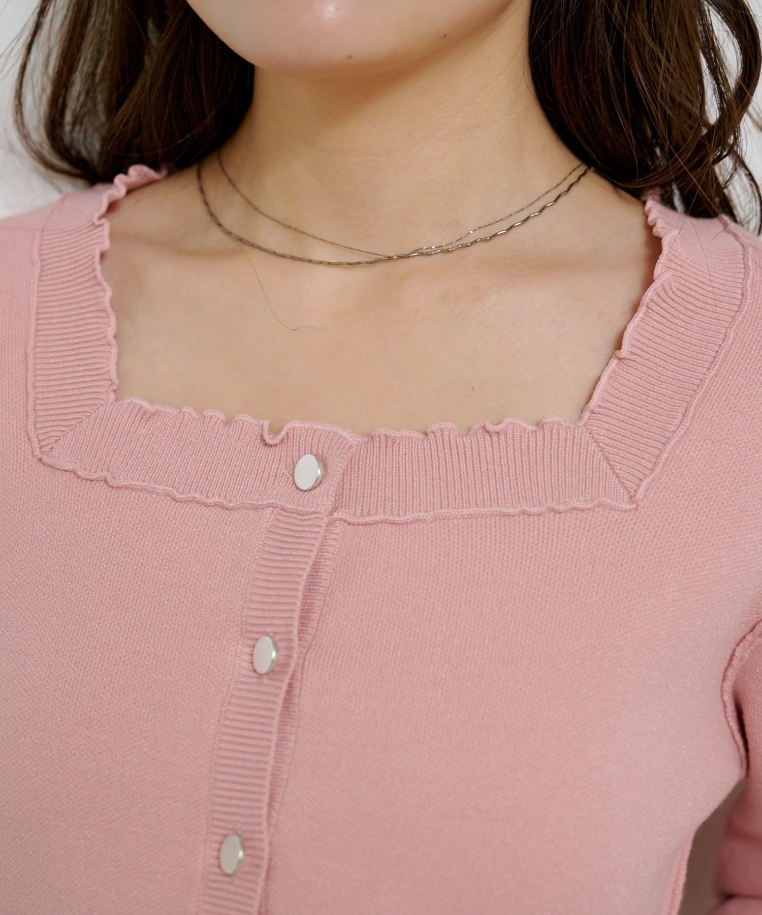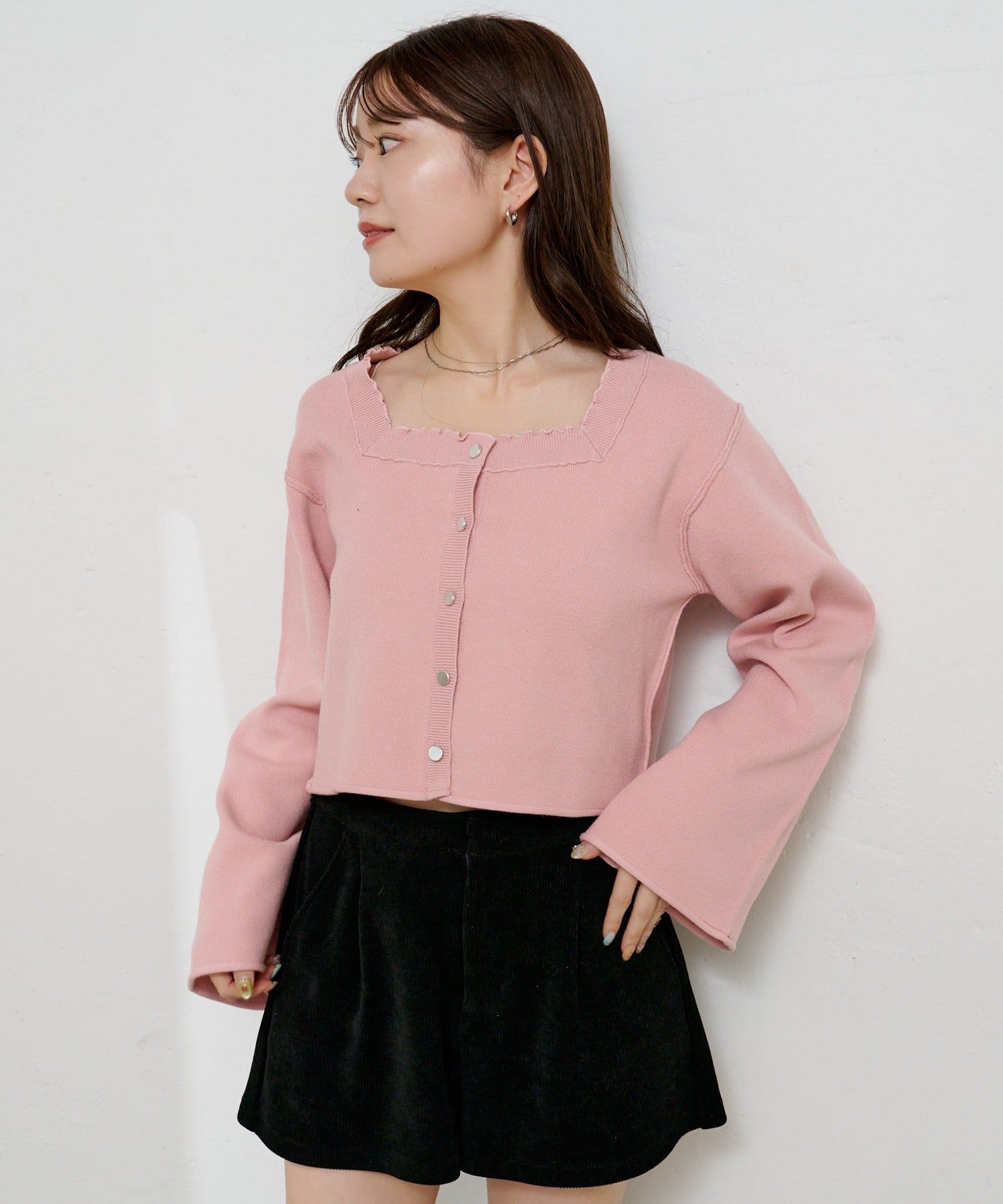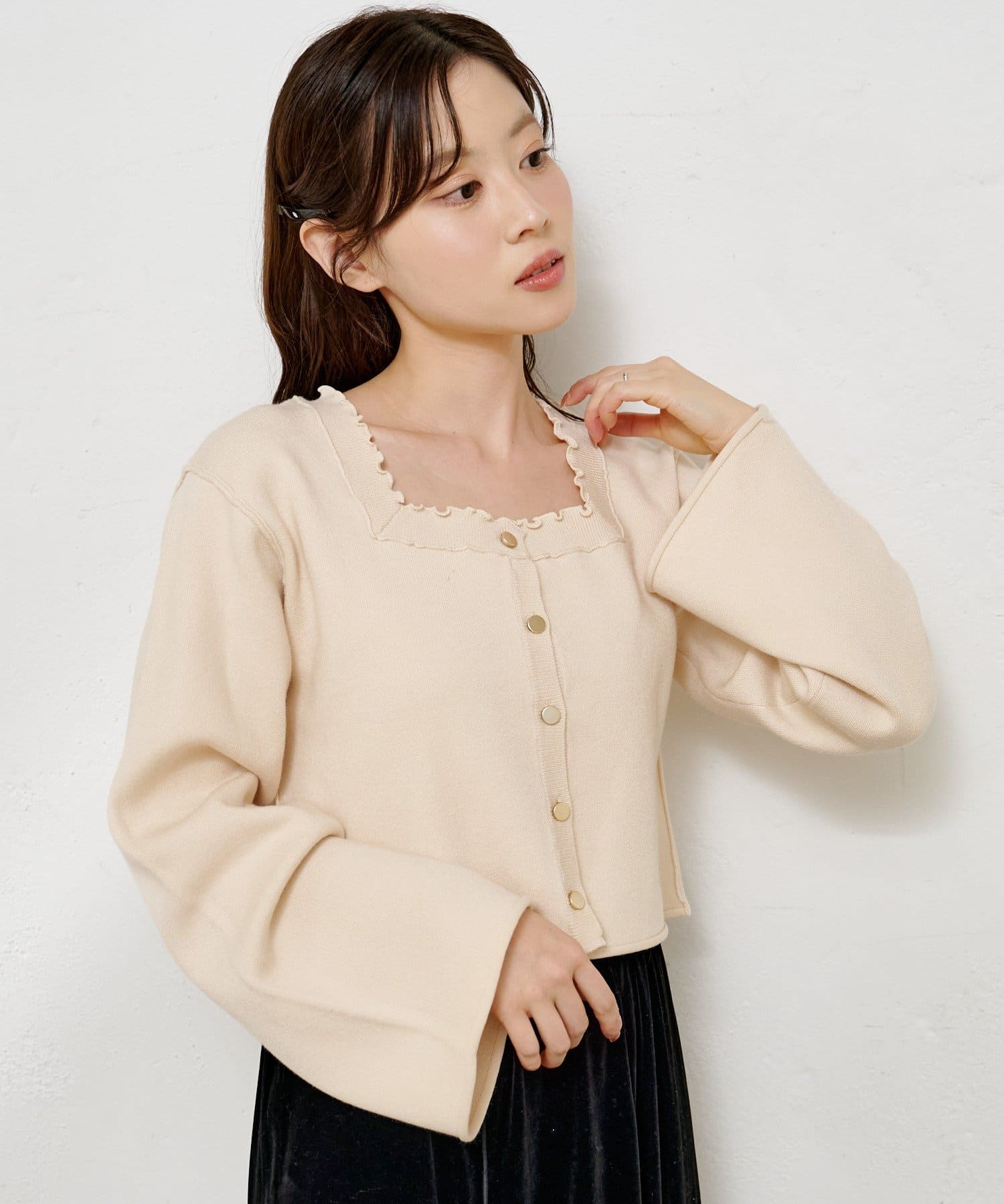 首元をすっきりと見せるスクエアネックが特徴のニットカーディガン
