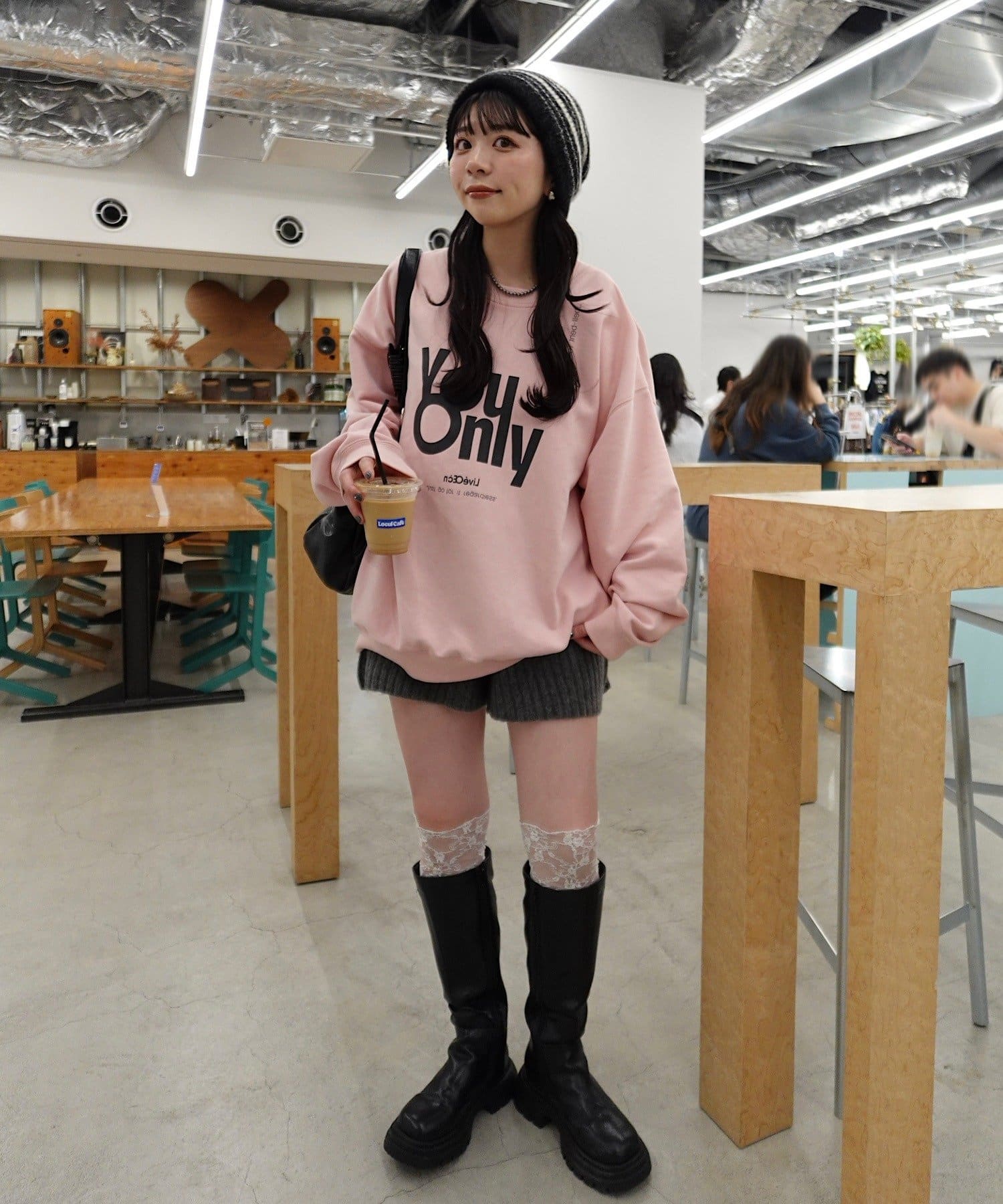 ミニボトム×ロングブーツでトレンド感のあるカジュアルカジュアルスタイルに。