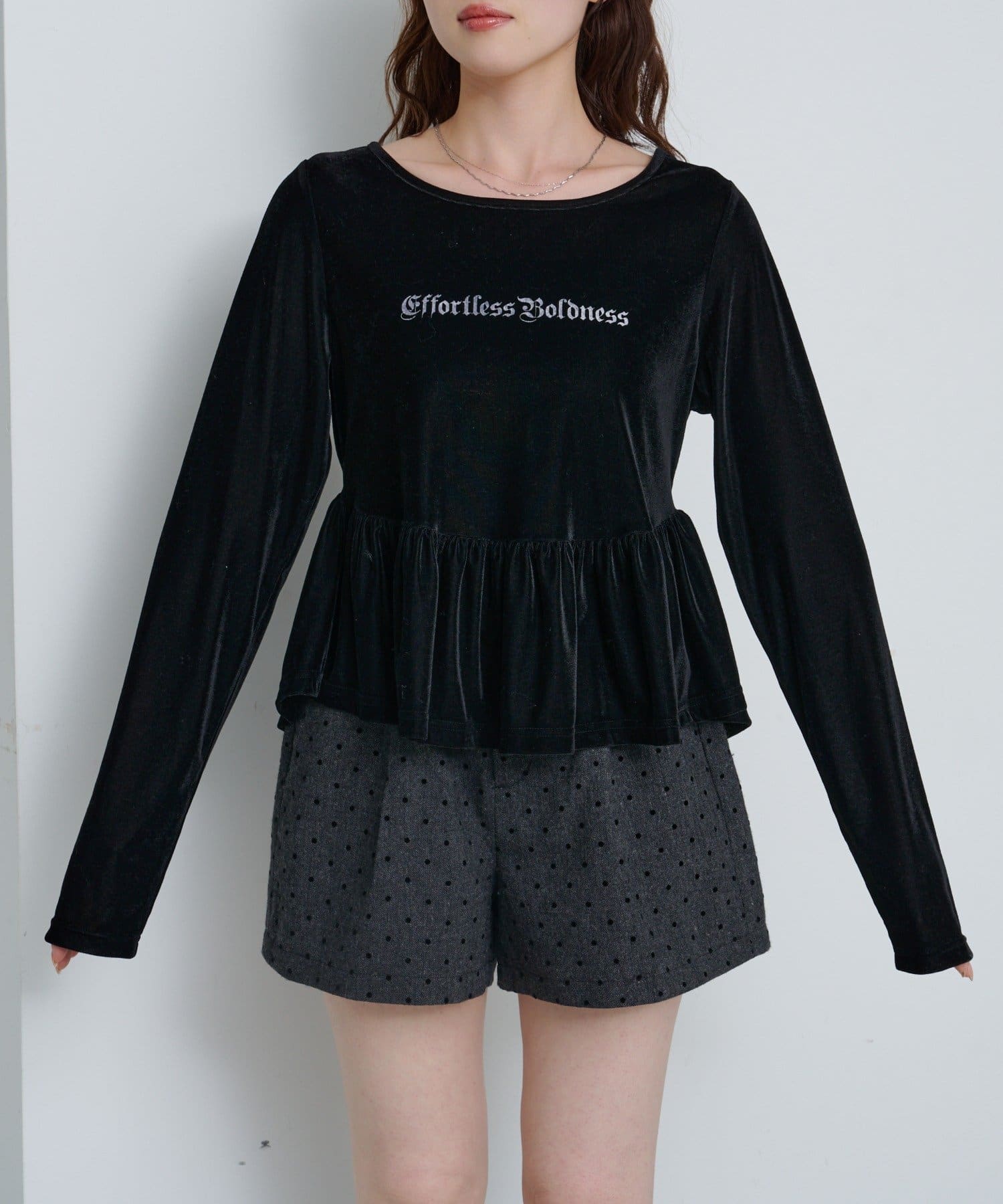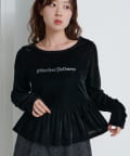 上品な光沢感が魅力のベロア素材を使用した、ロゴ入りペプラムトップス。
