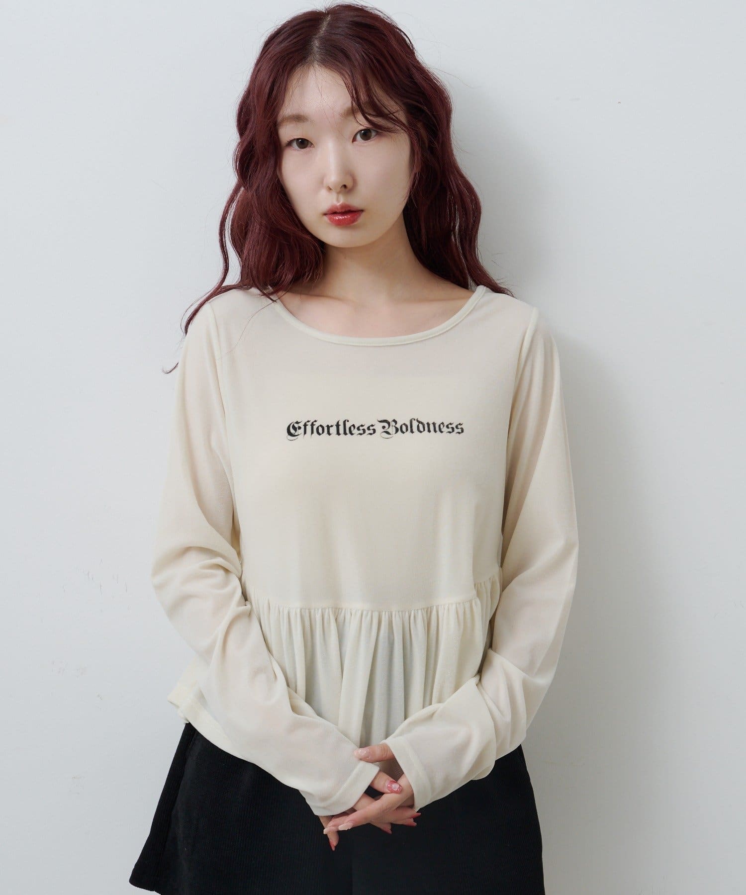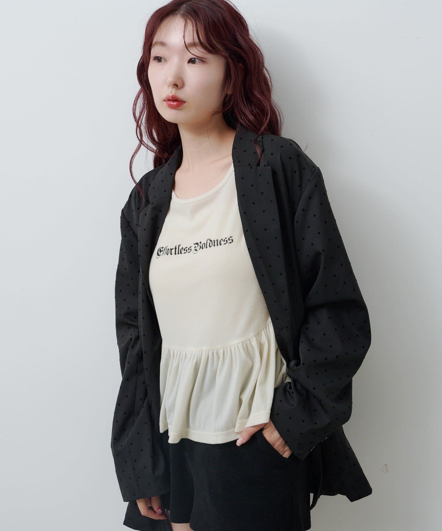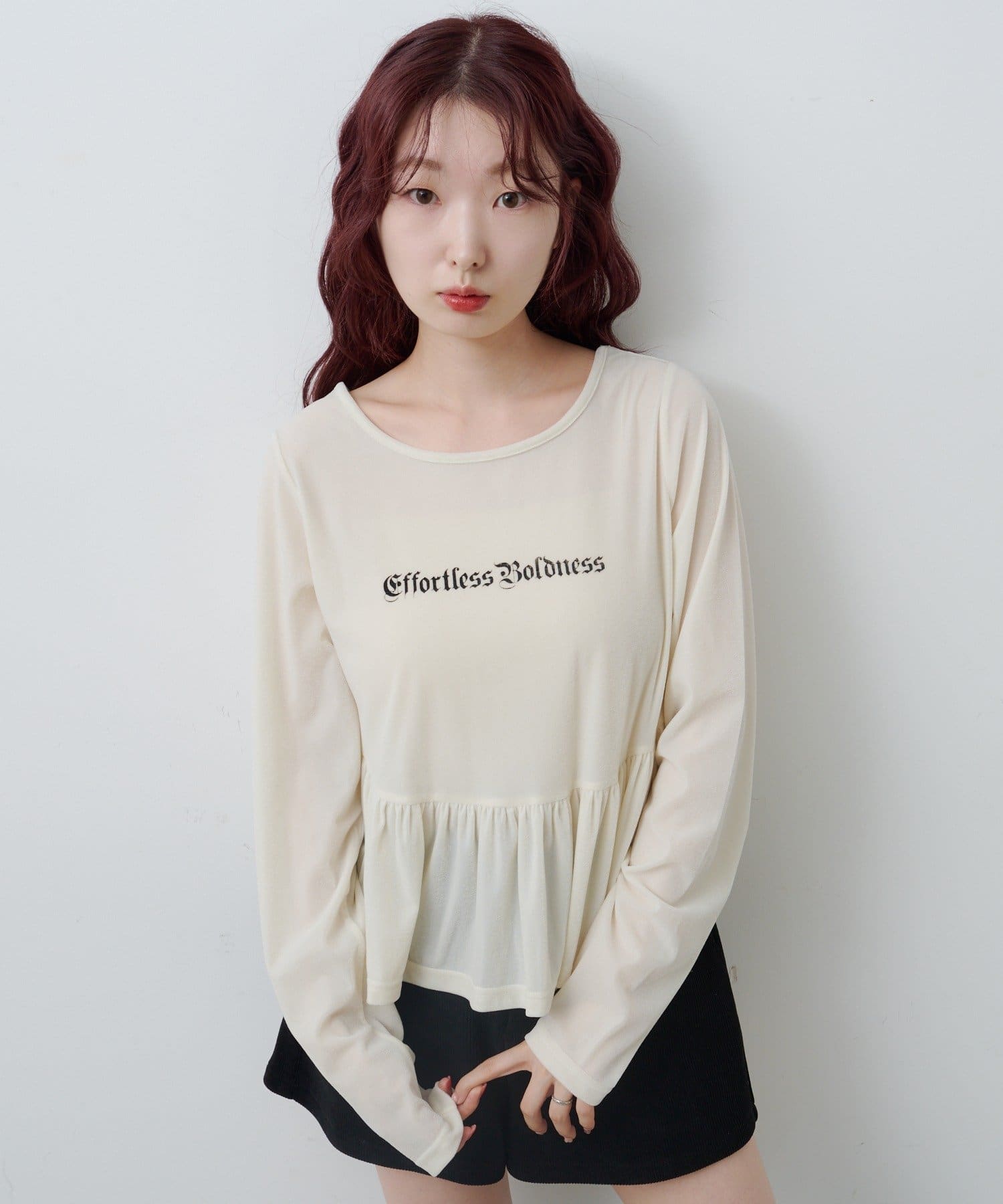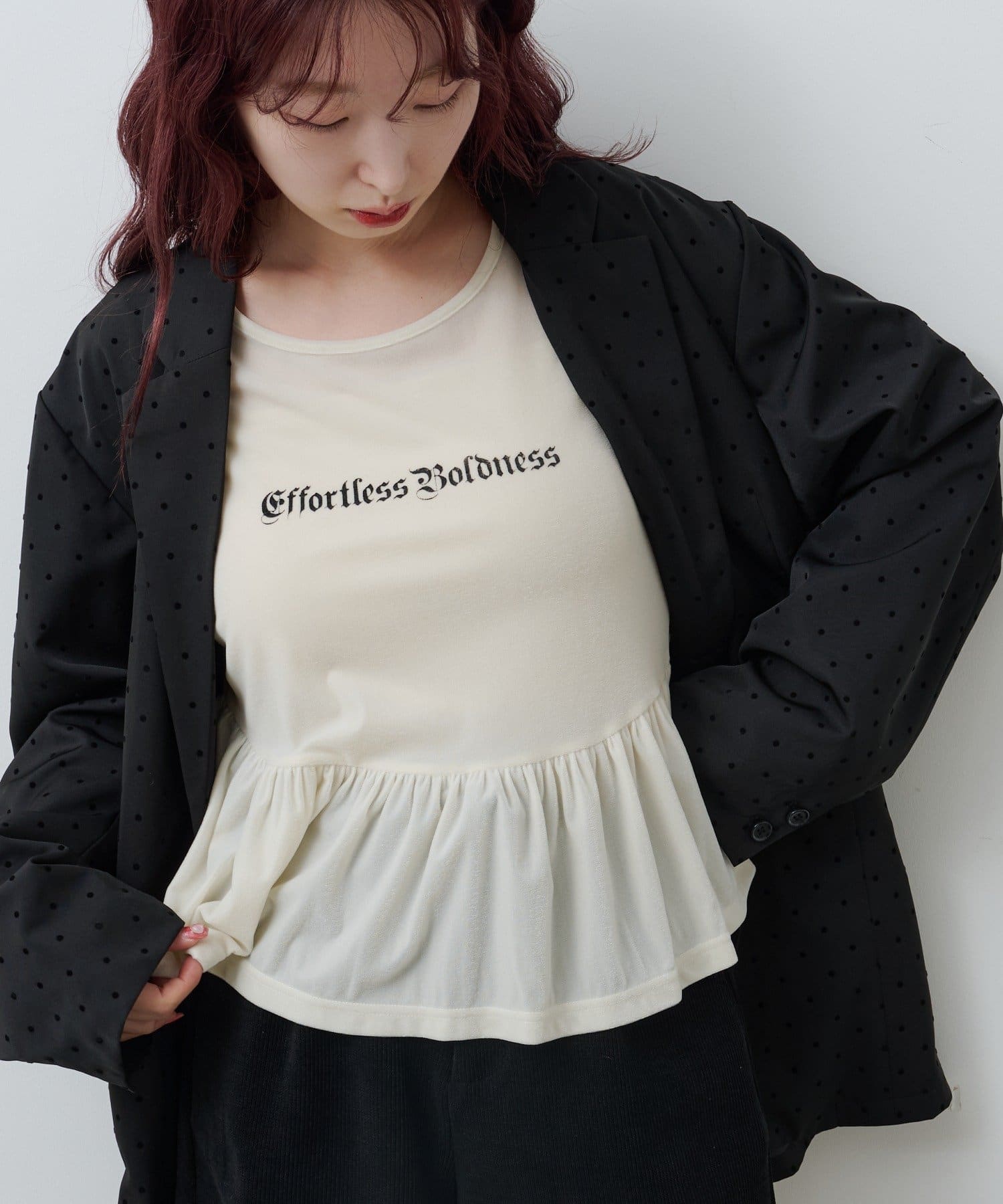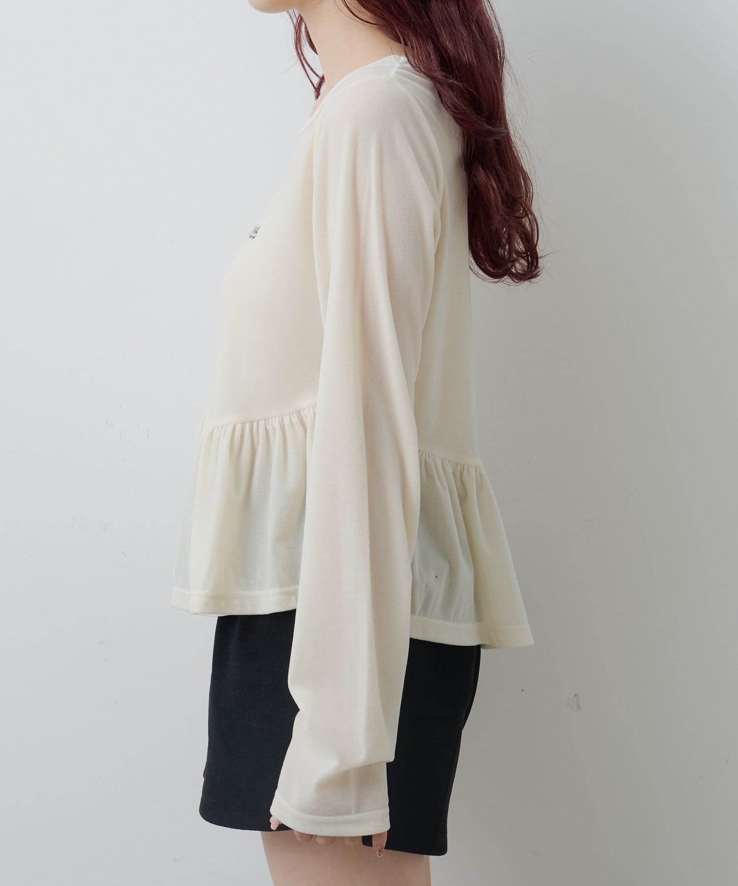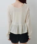 ショートパンツやミニスカートと合わせて、ペプラムの広がりを活かしたガーリーコーデに。