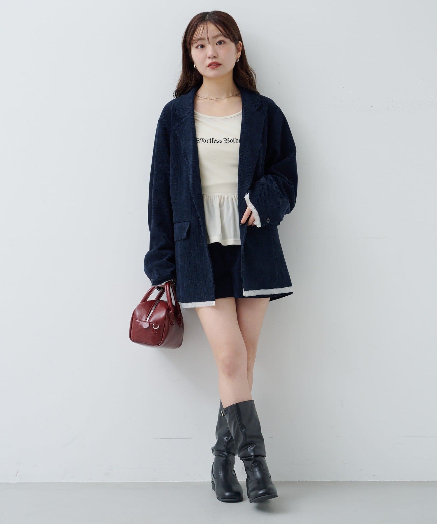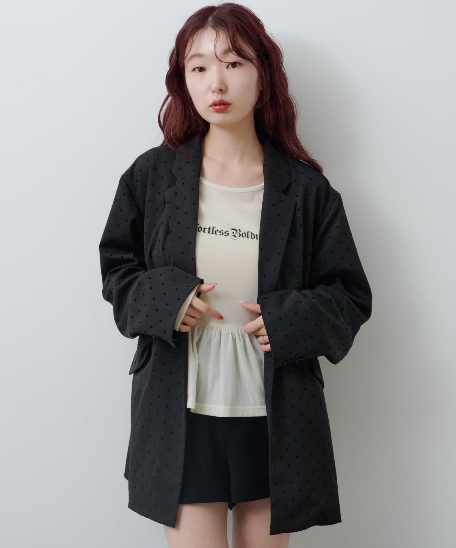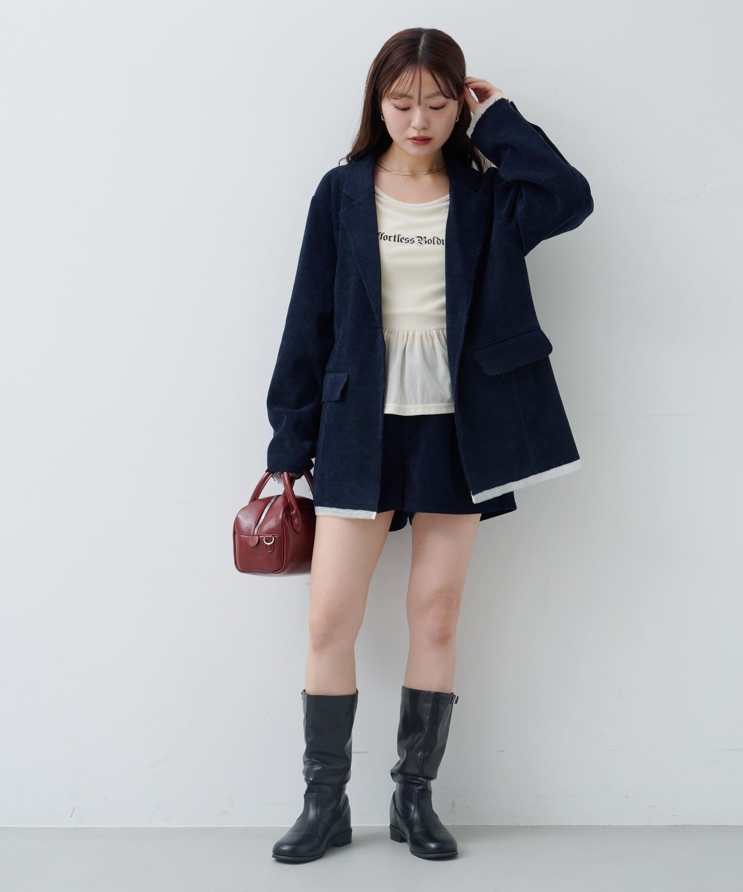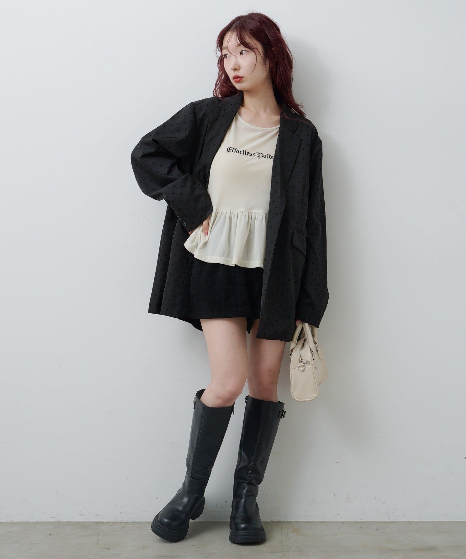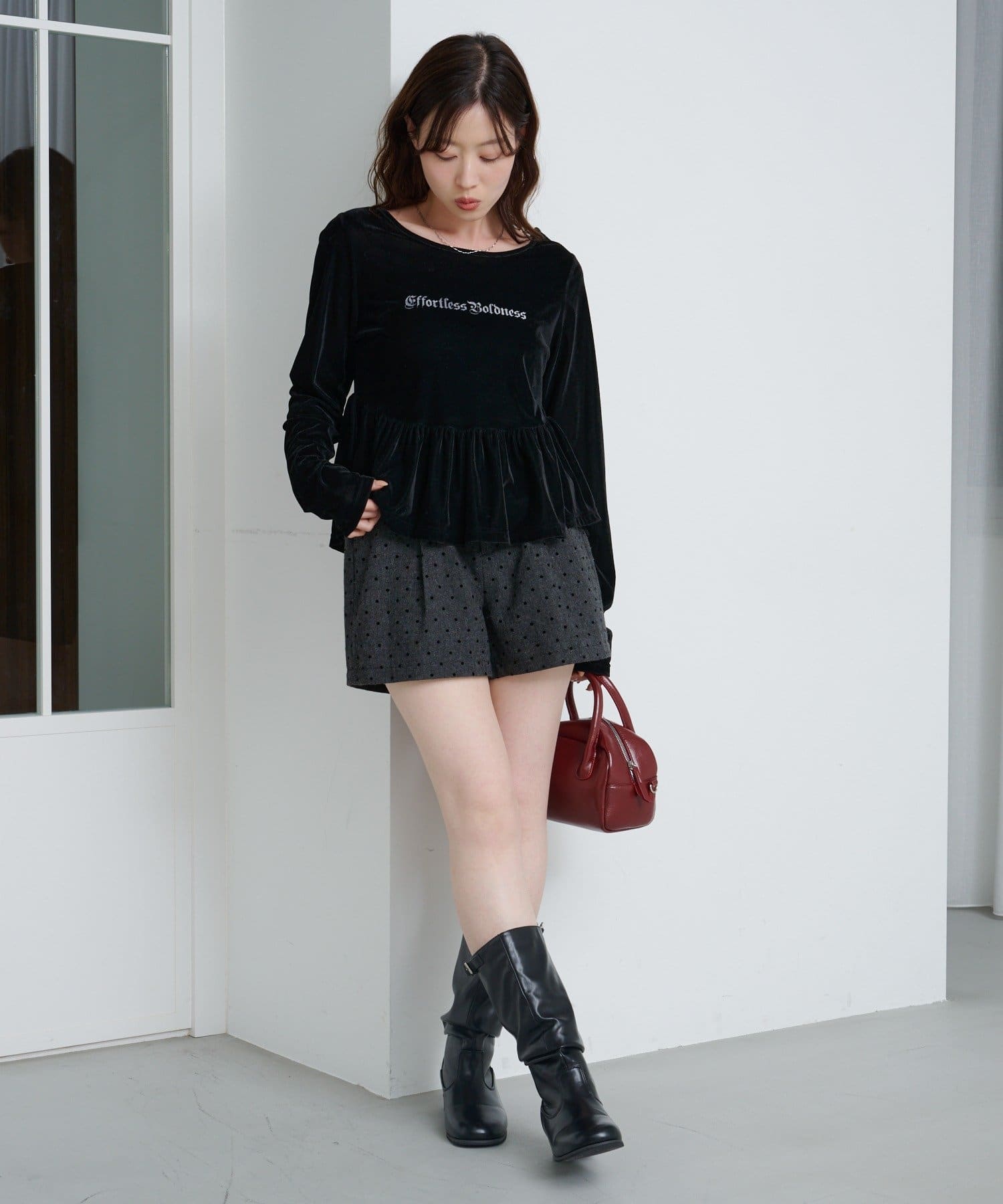 ショートパンツやミニスカートと合わせて、ペプラムの広がりを活かしたガーリーコーデに。