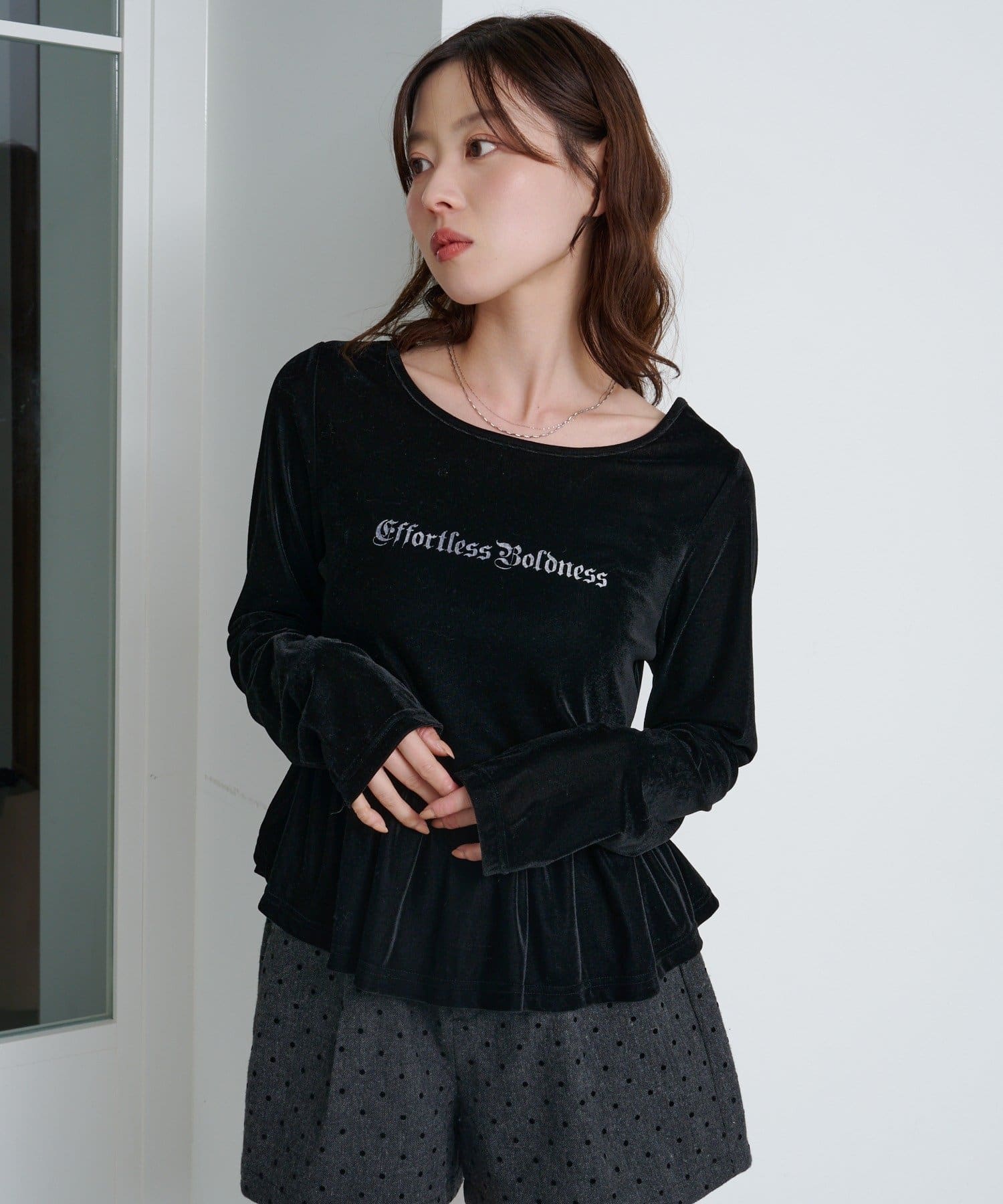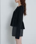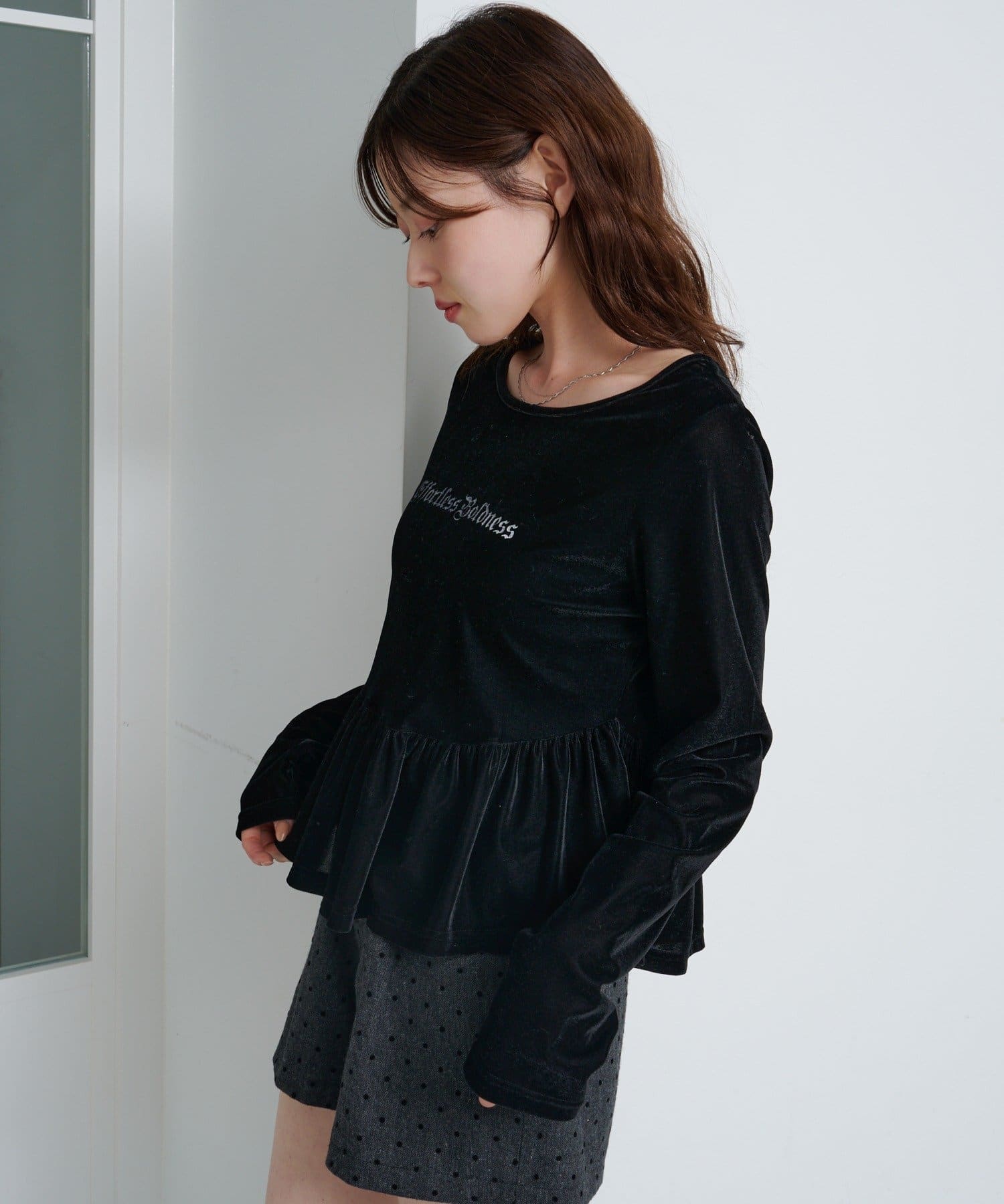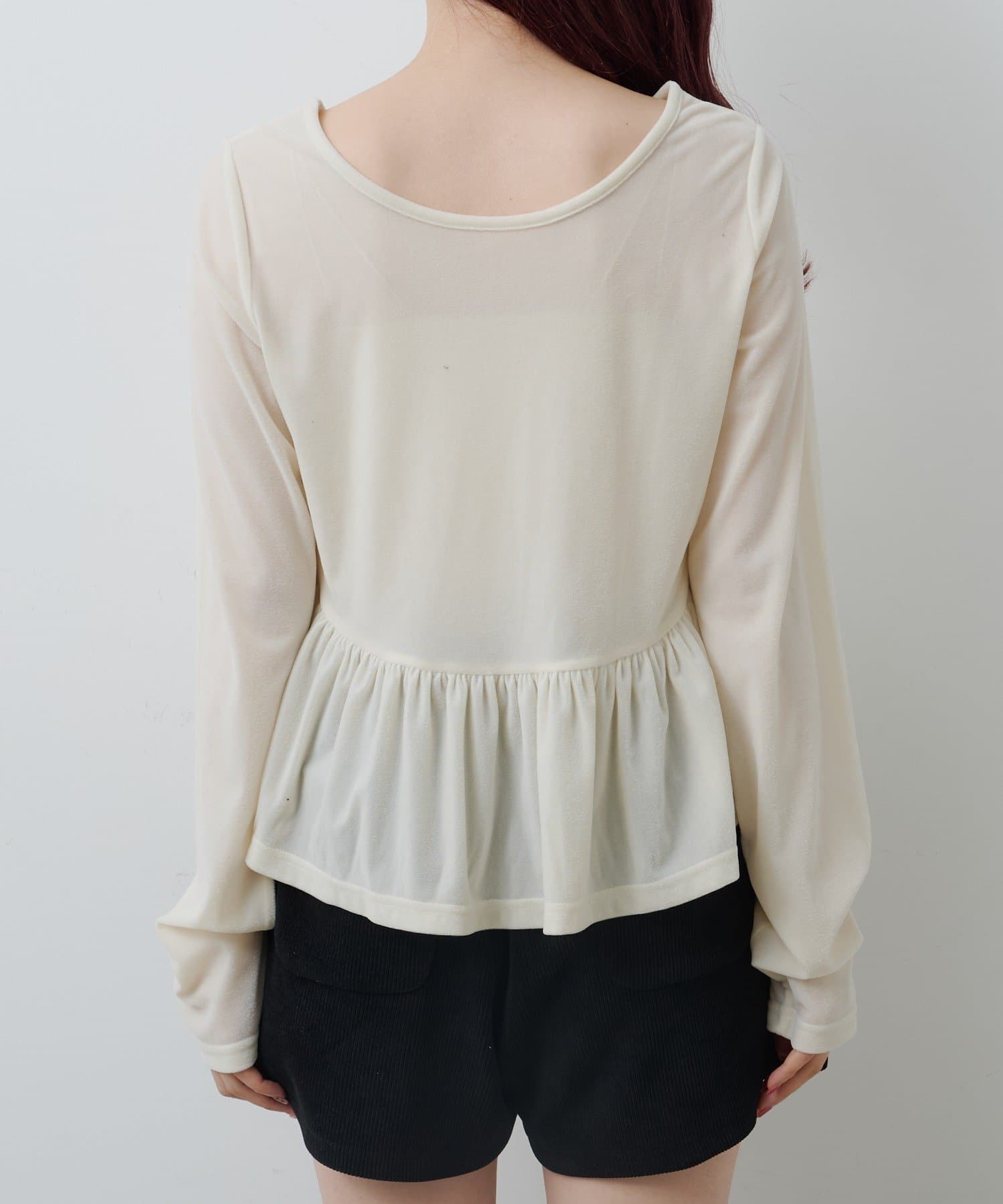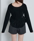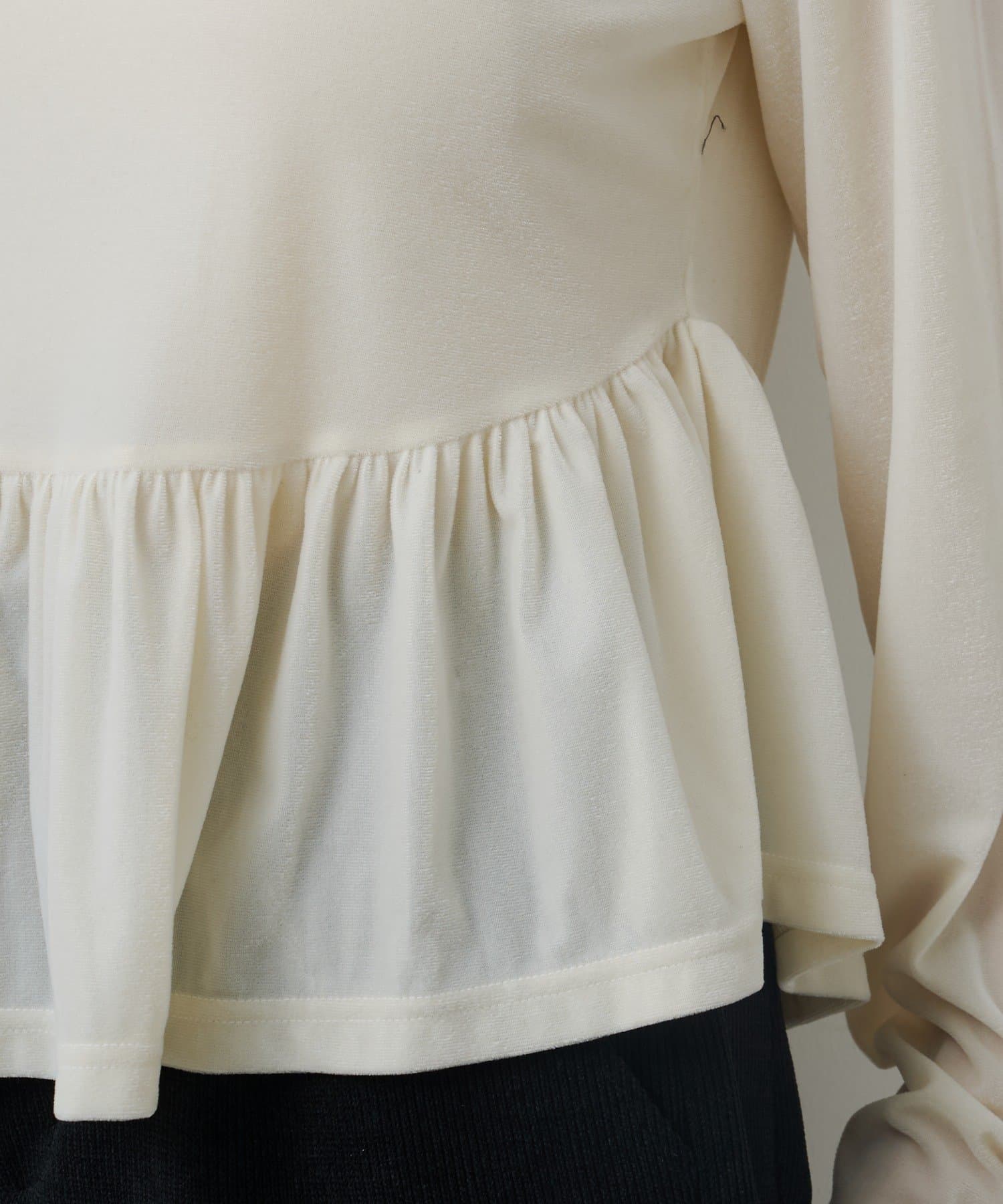上品な光沢感が魅力のベロア素材を使用した、ロゴ入りペプラムトップス。
