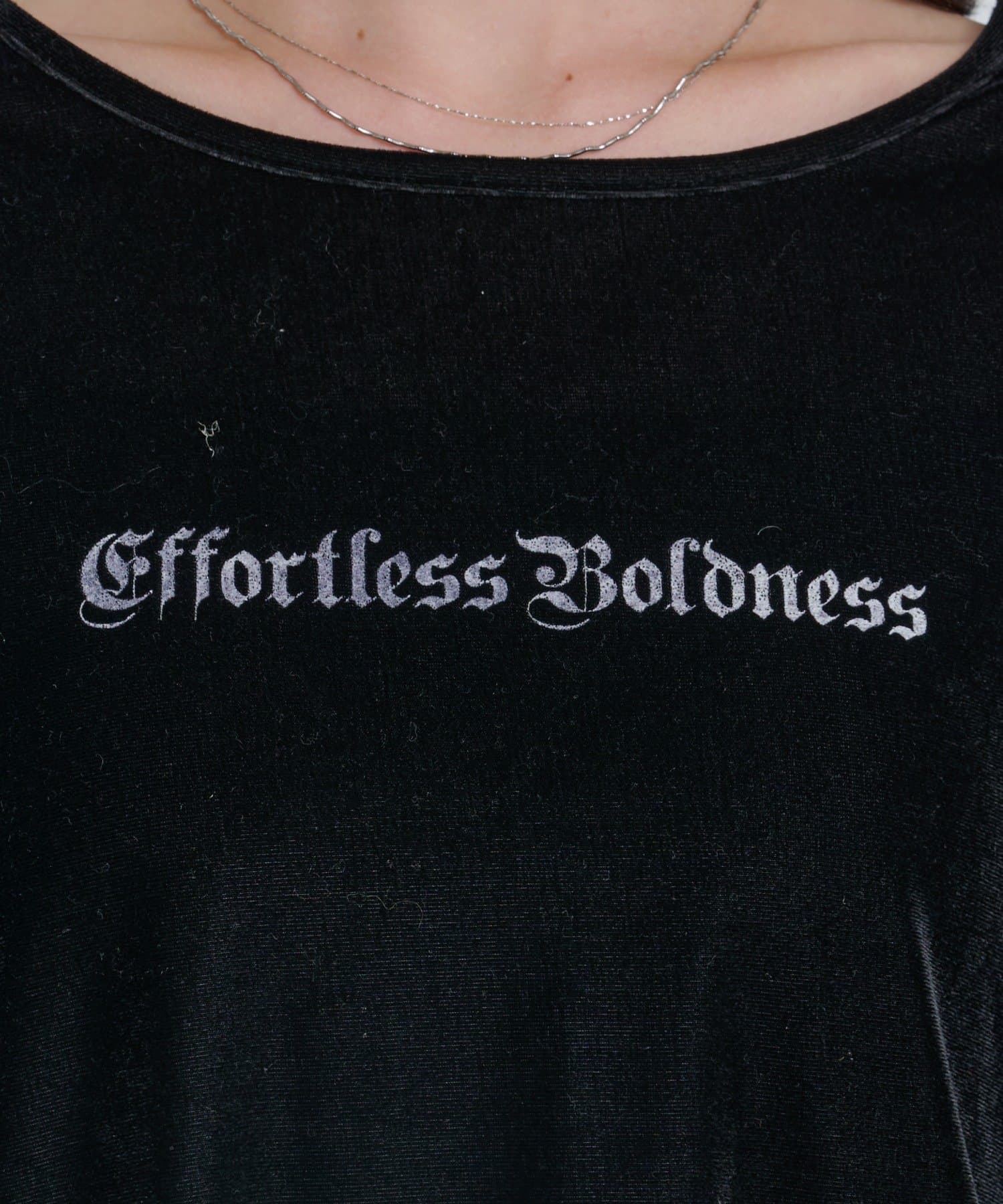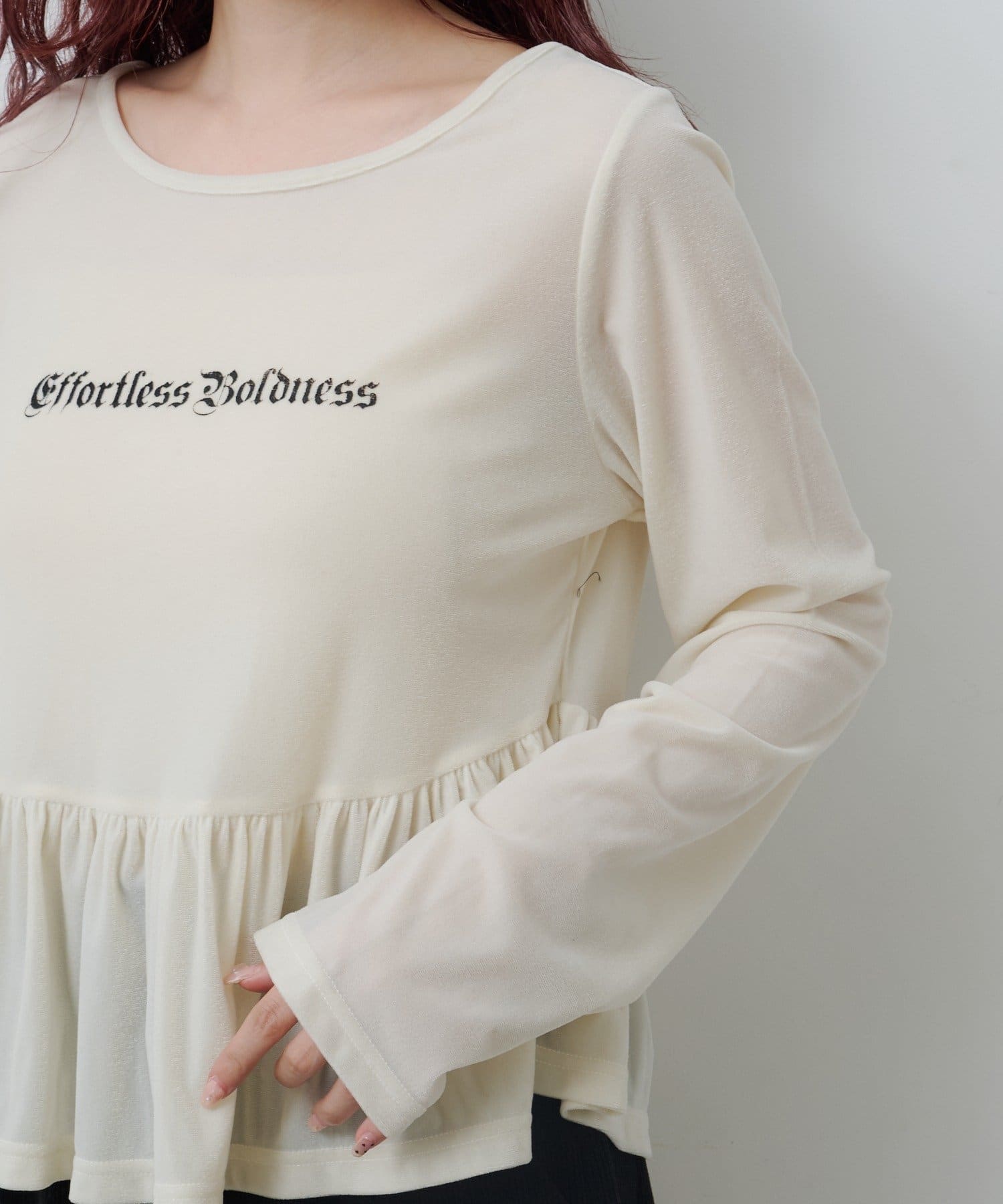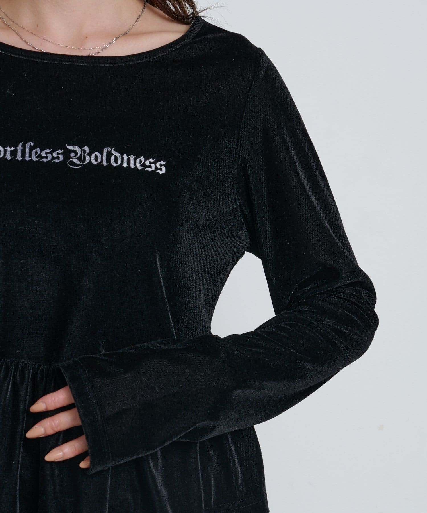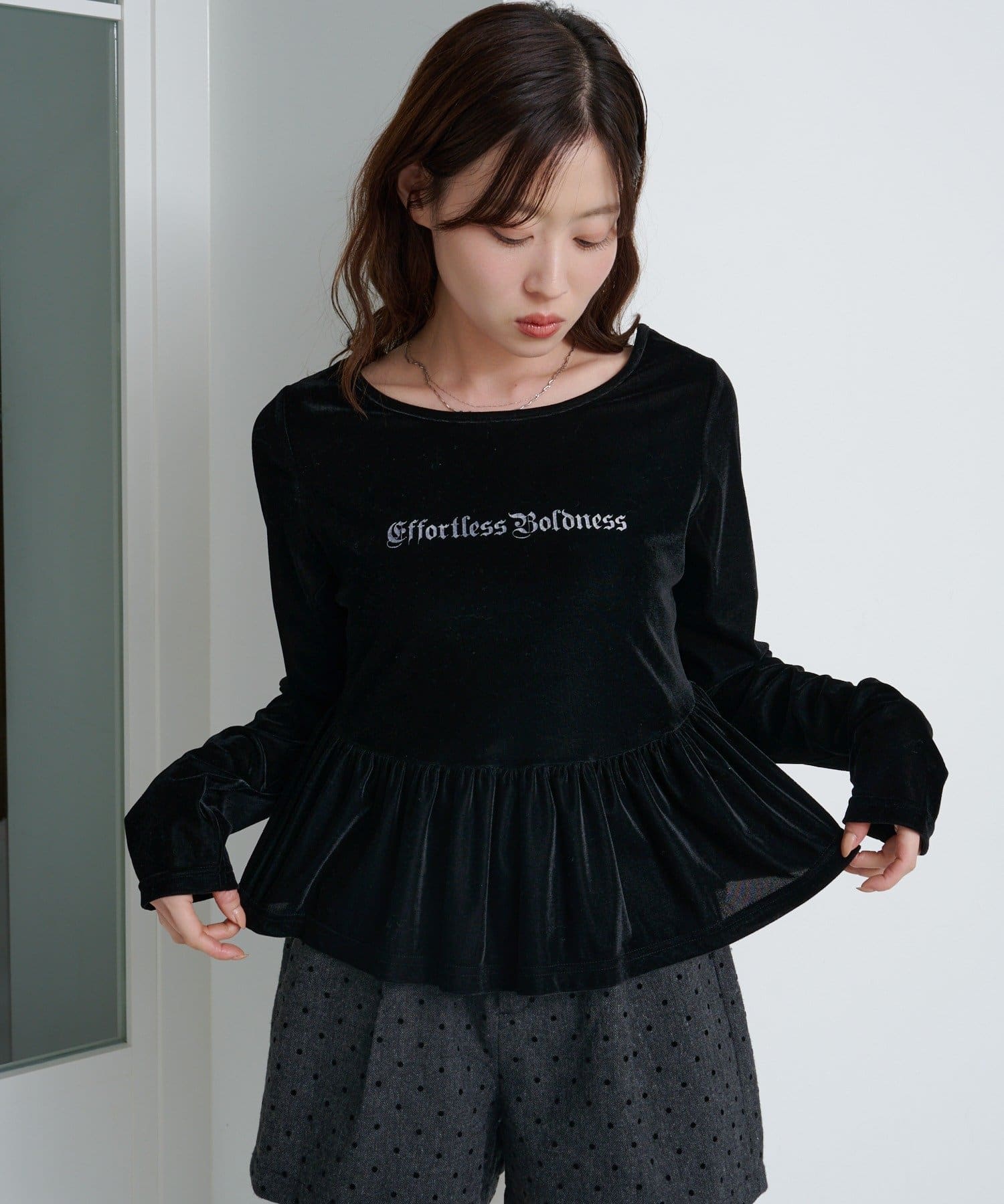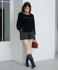 上品な光沢感が魅力のベロア素材を使用した、ロゴ入りペプラムトップス。