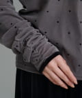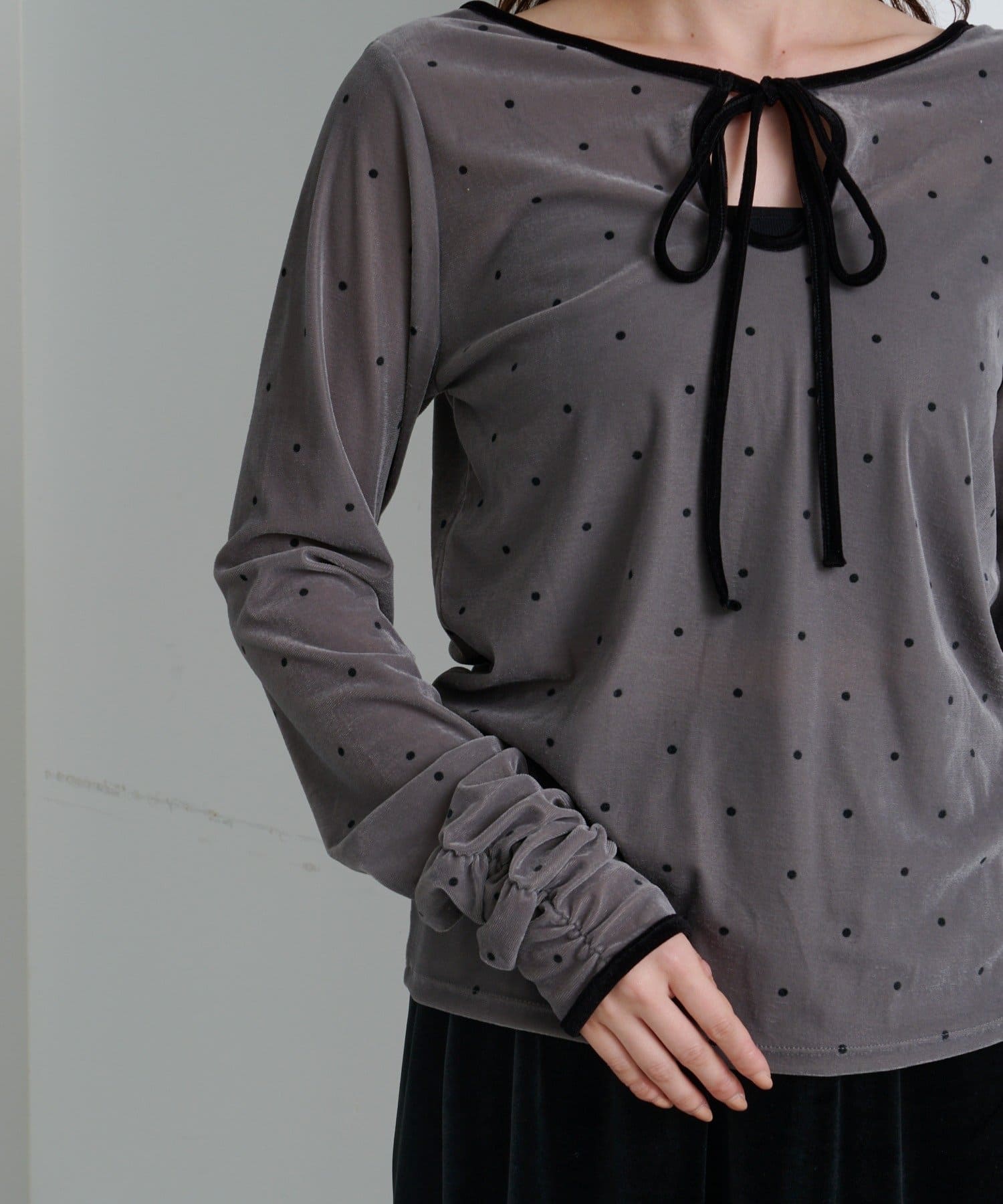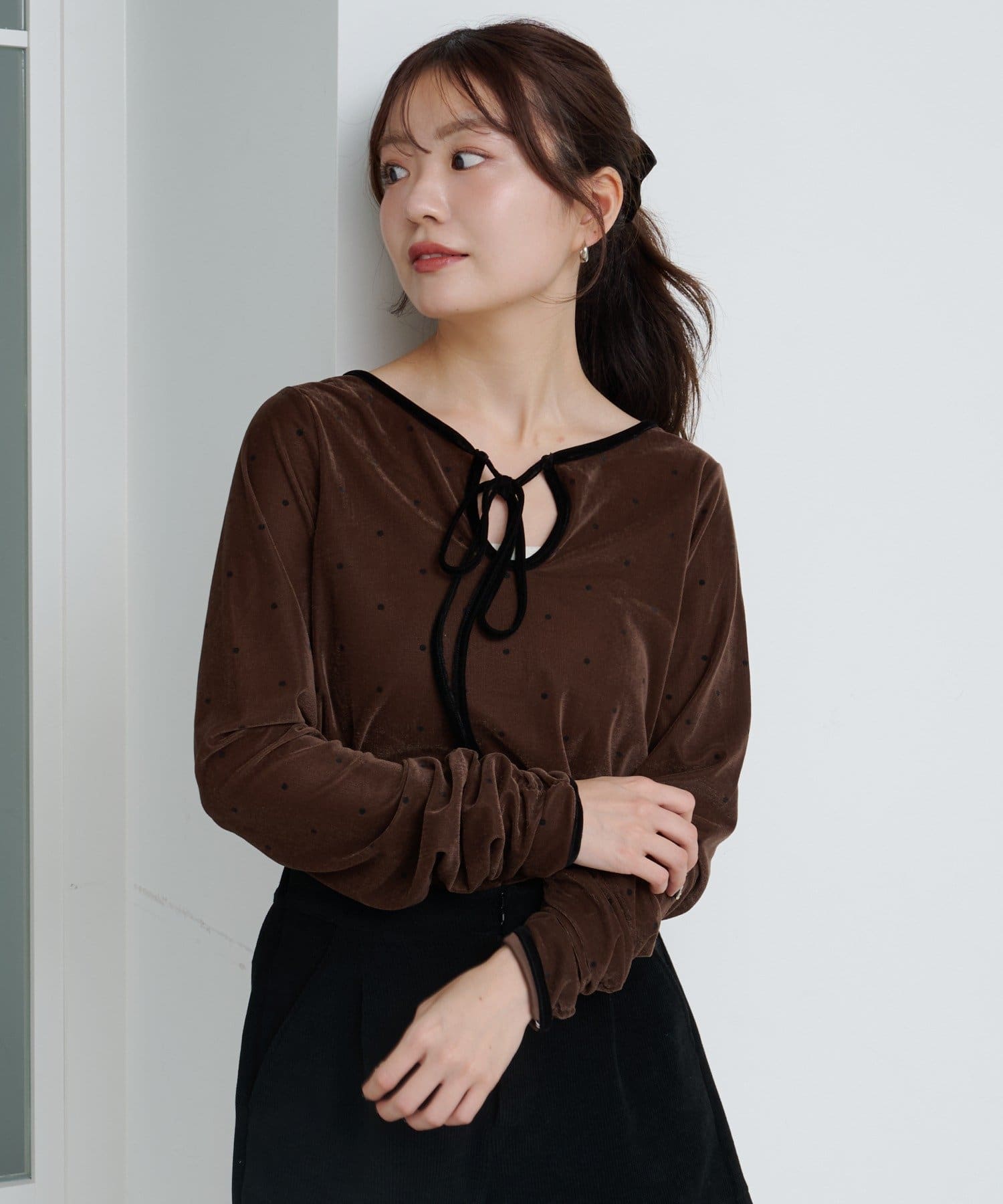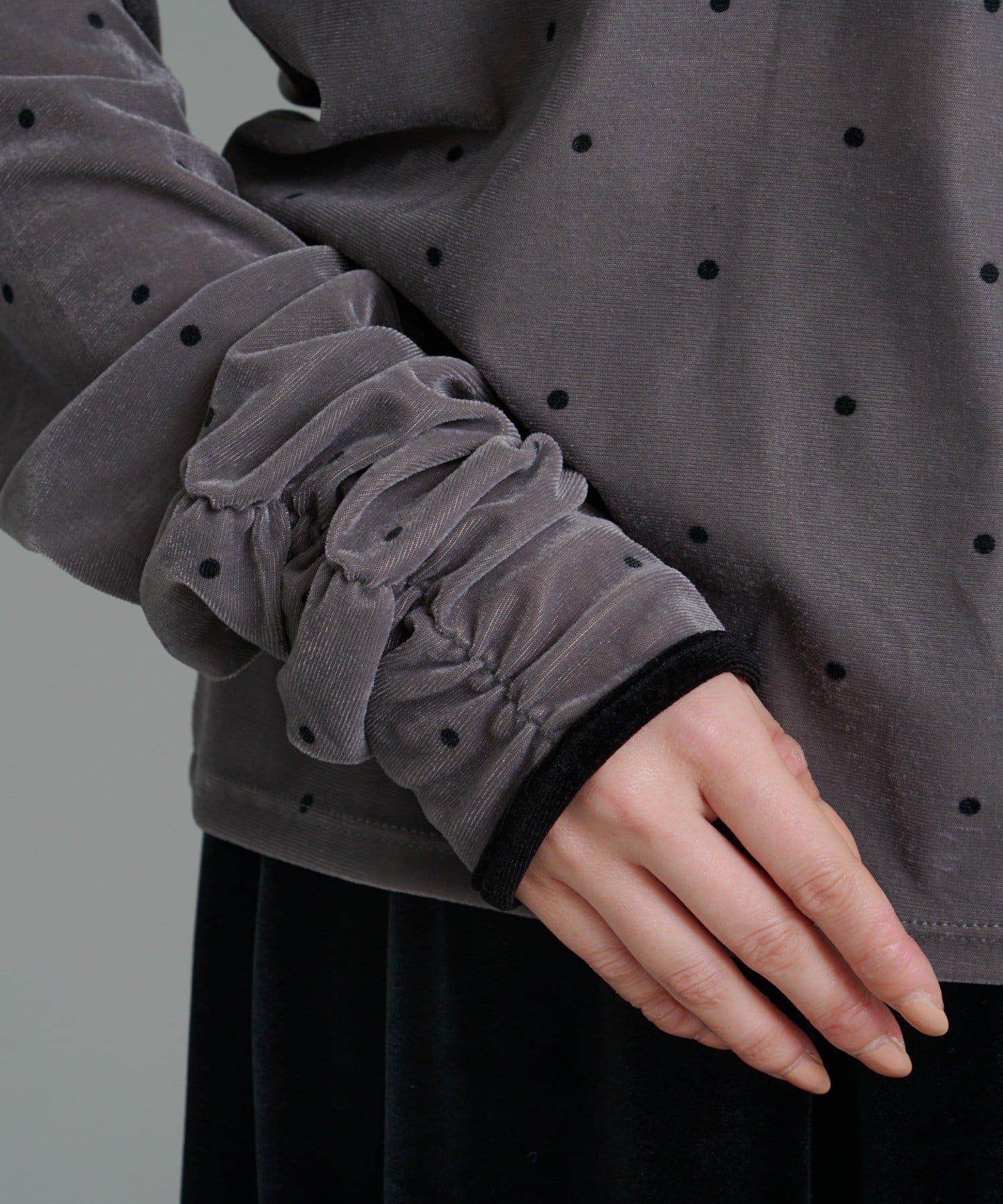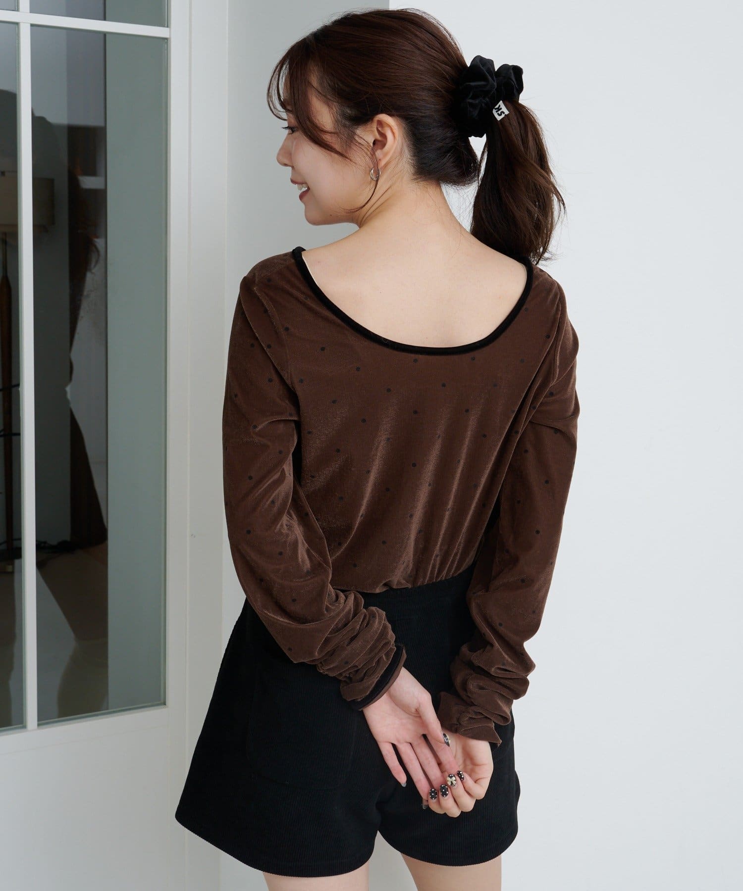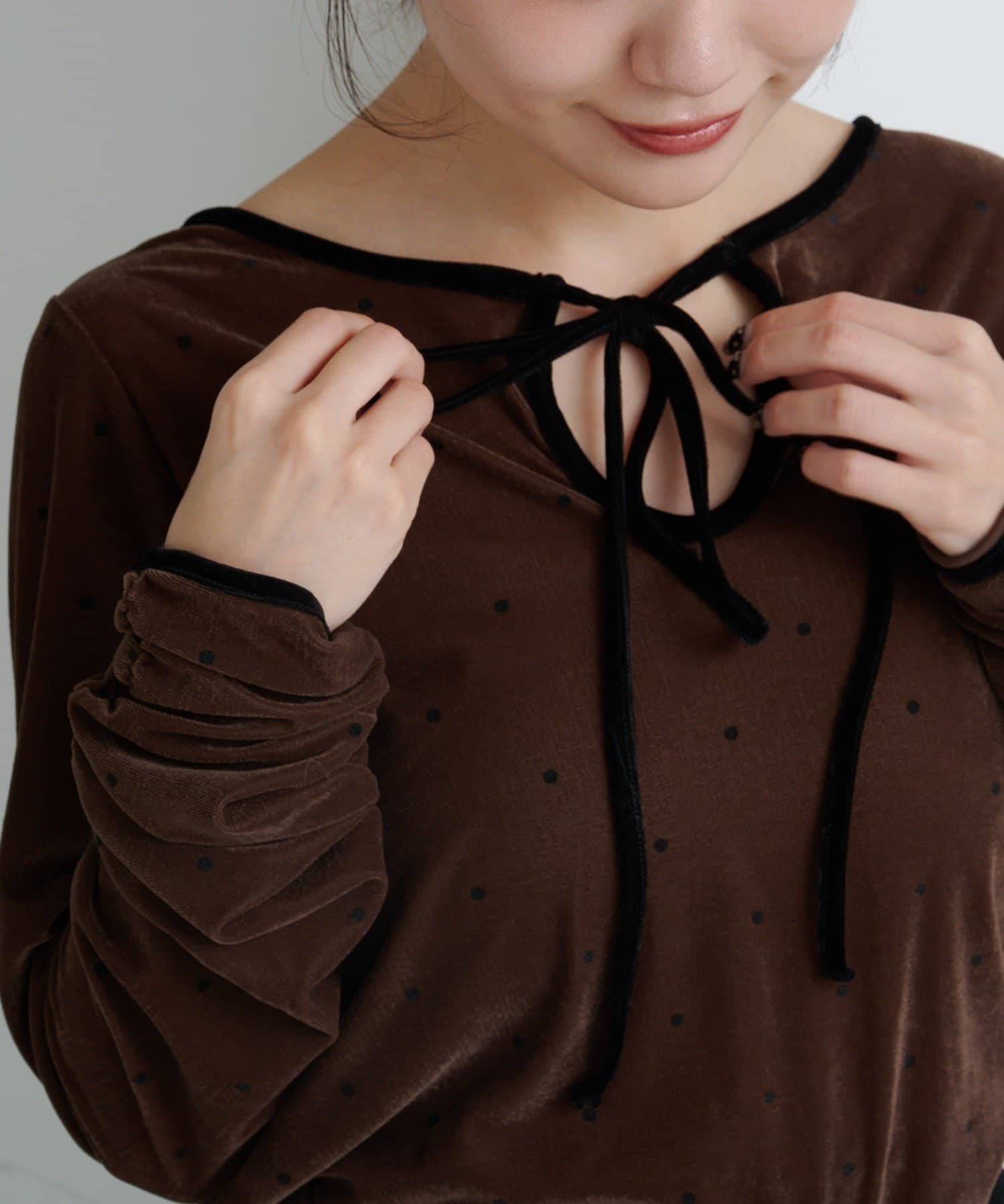 ドット柄と配色パイピングが目を引くベロアプルオーバー。