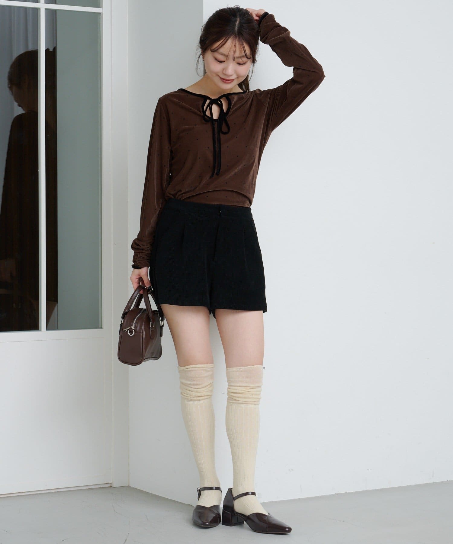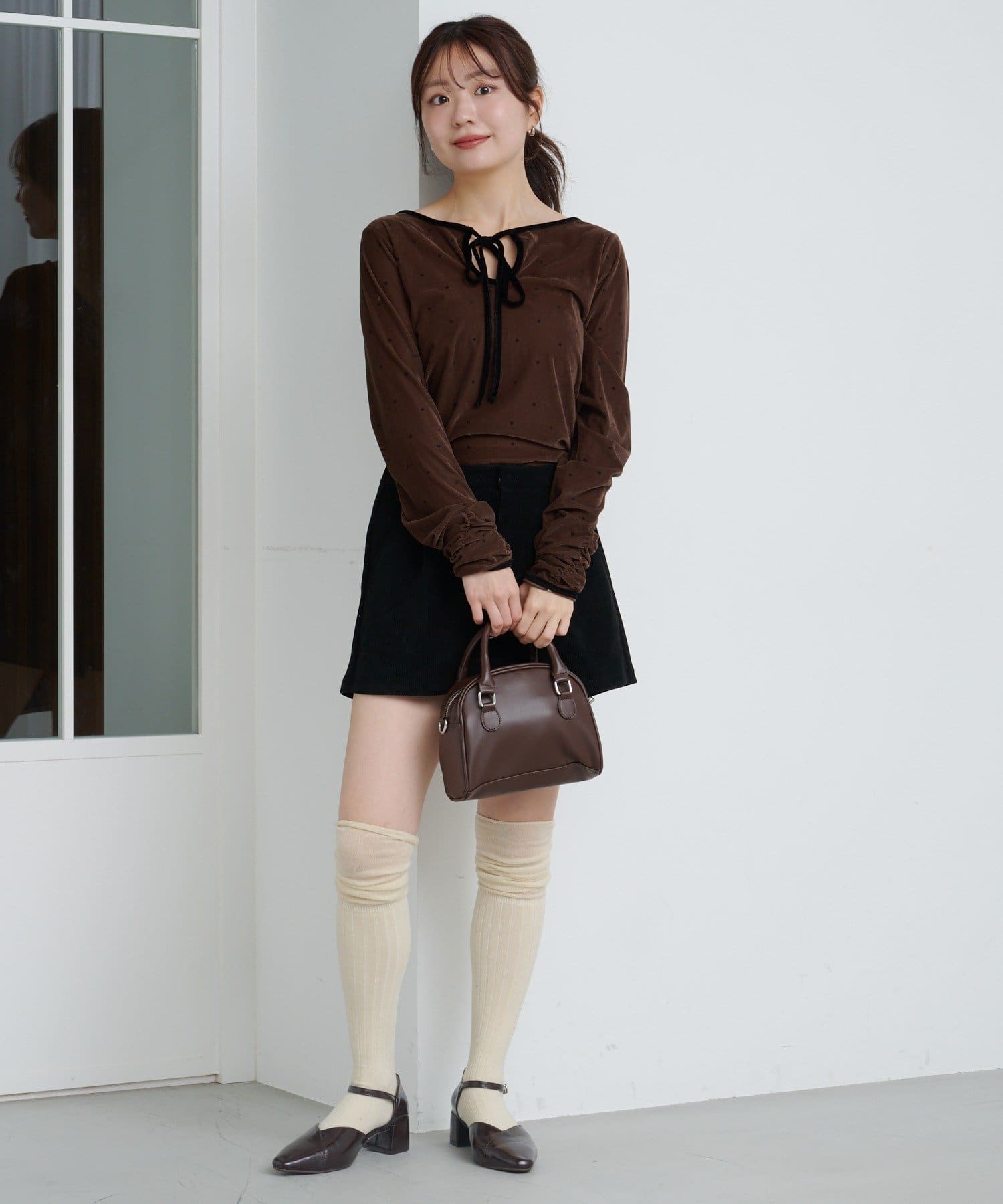 163cm/骨格ウェーブ:胸元のベロアリボンにドット柄がアウターと合わせたときのポイントに!