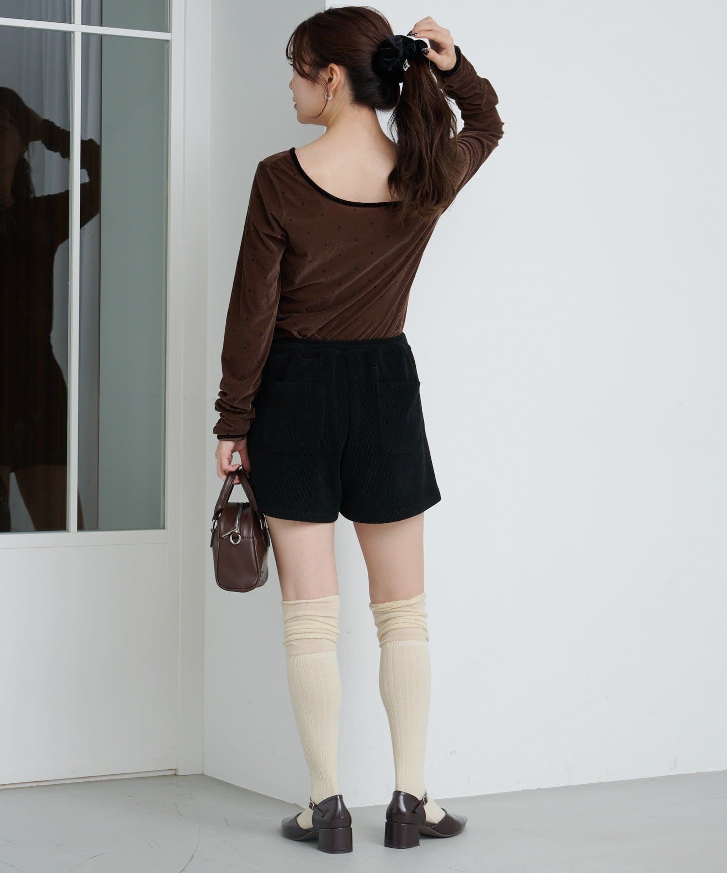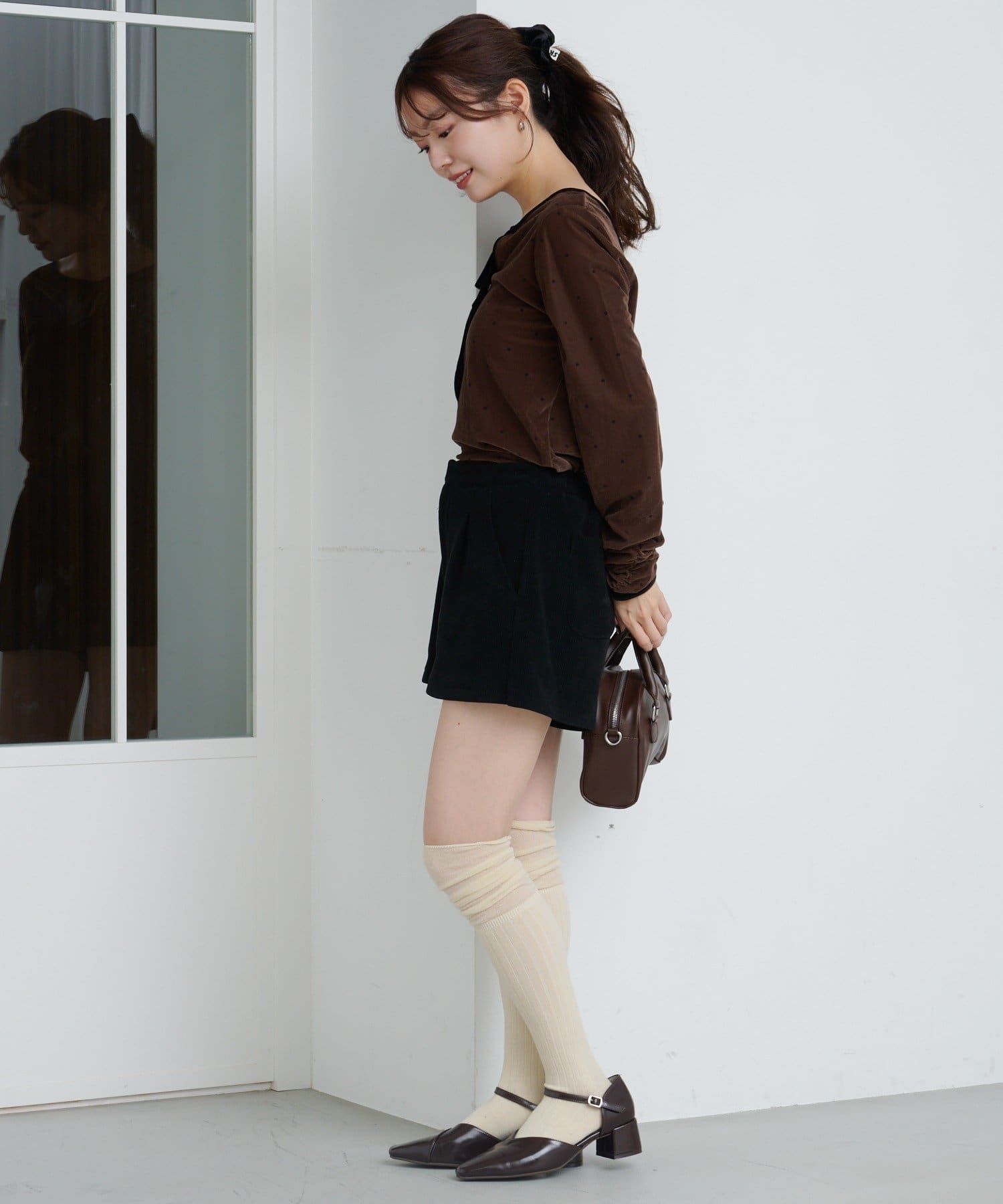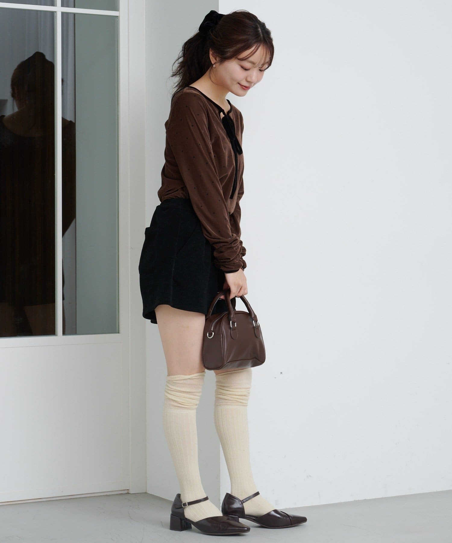 甘く見えがちなドット柄ですが、ベロア素材が上品に見せてくれます。