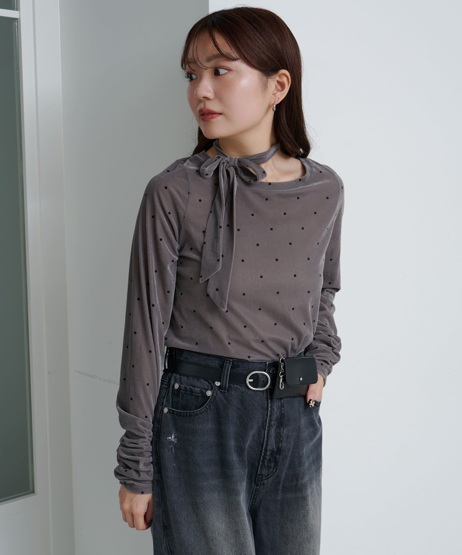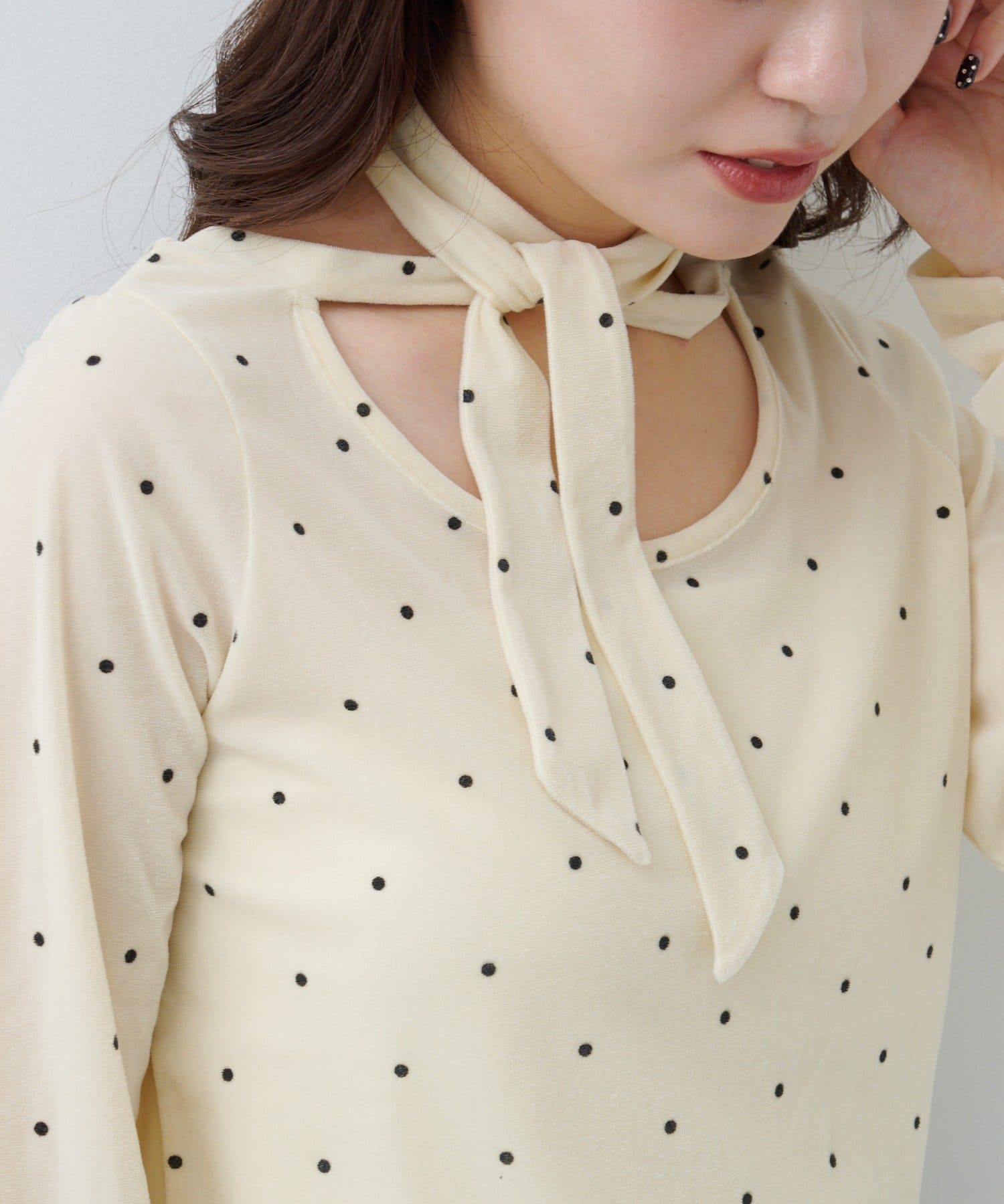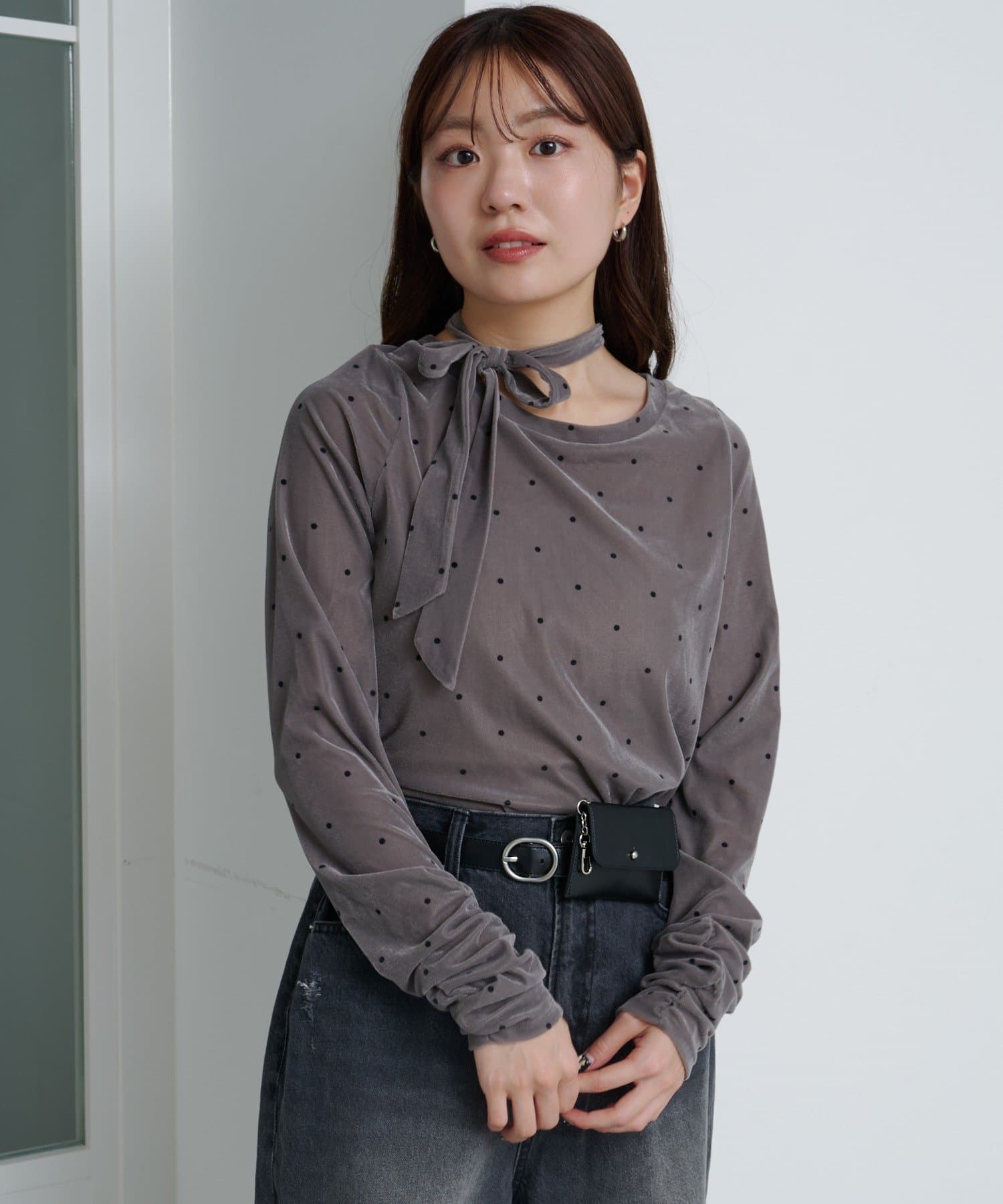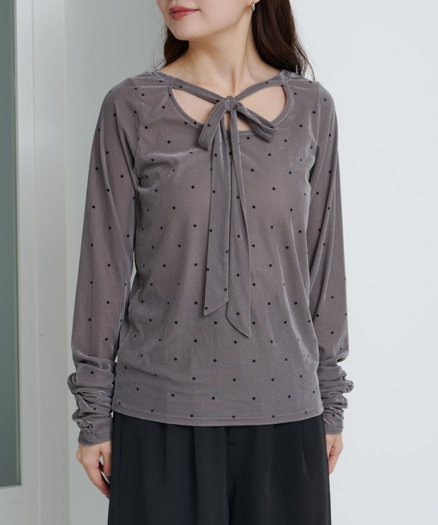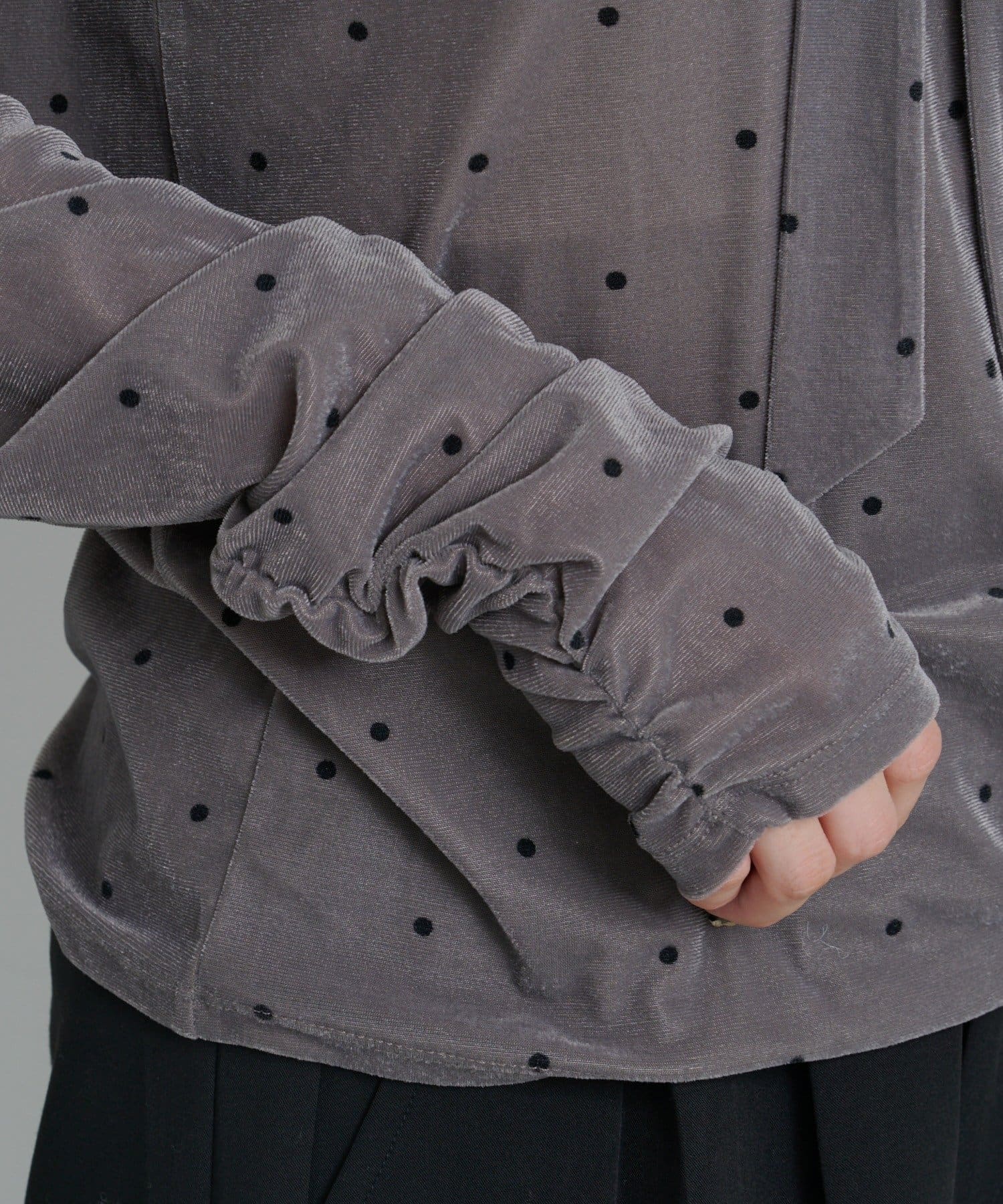 光沢ベロア×ドットで品よく映える、ボウタイプルオーバー