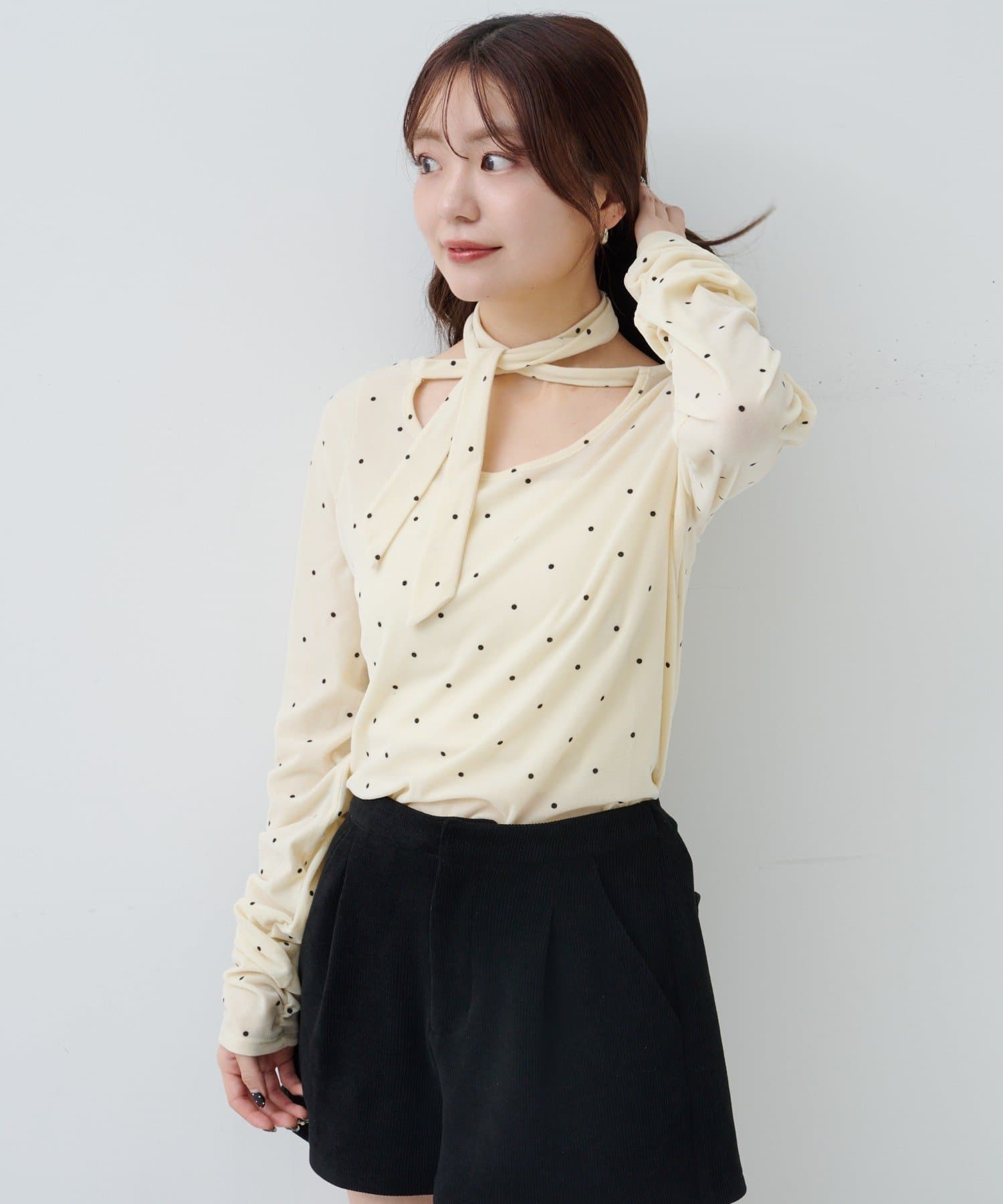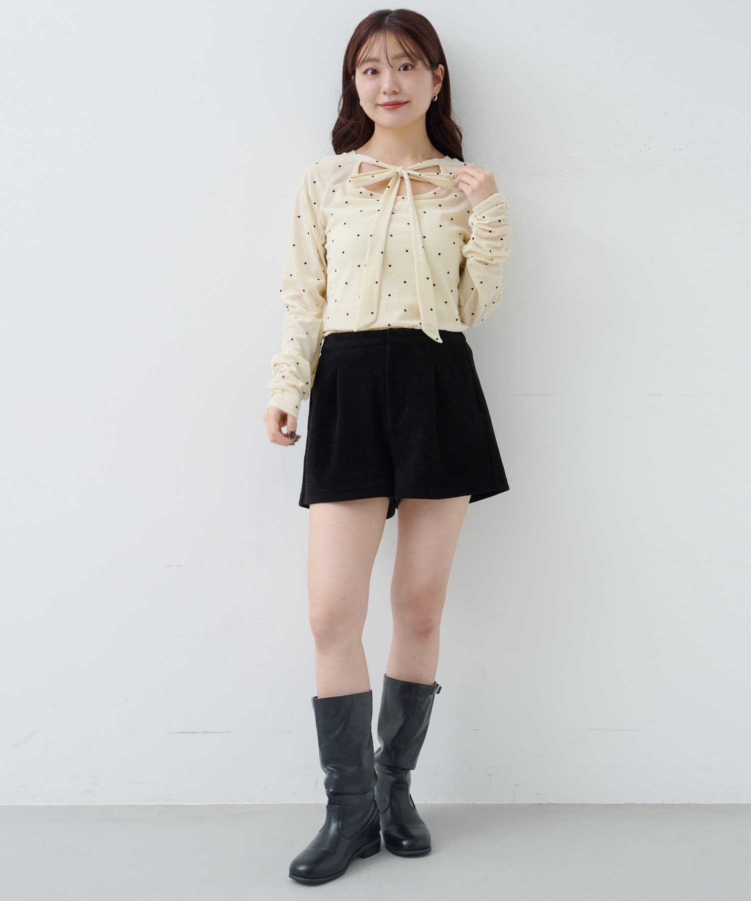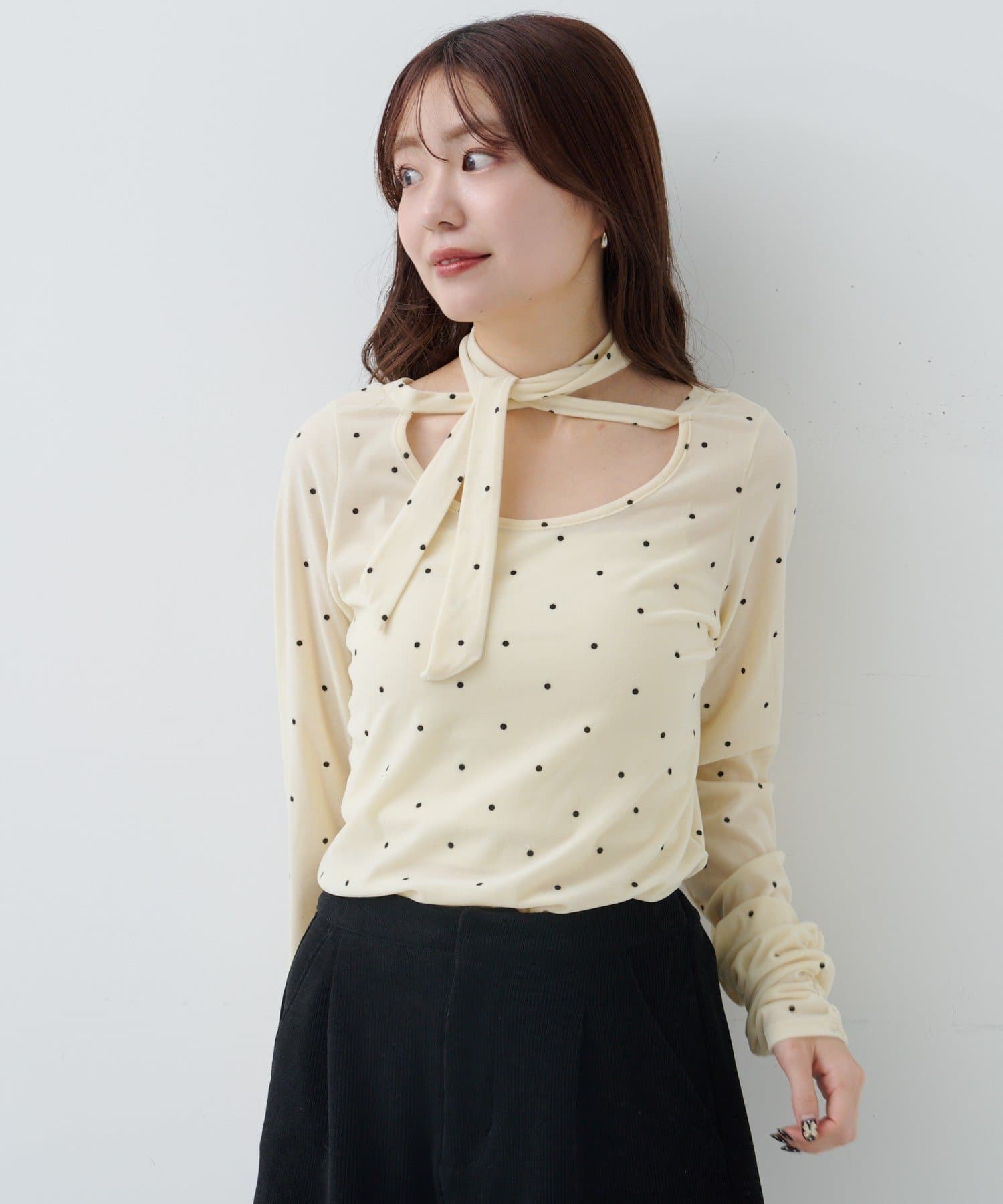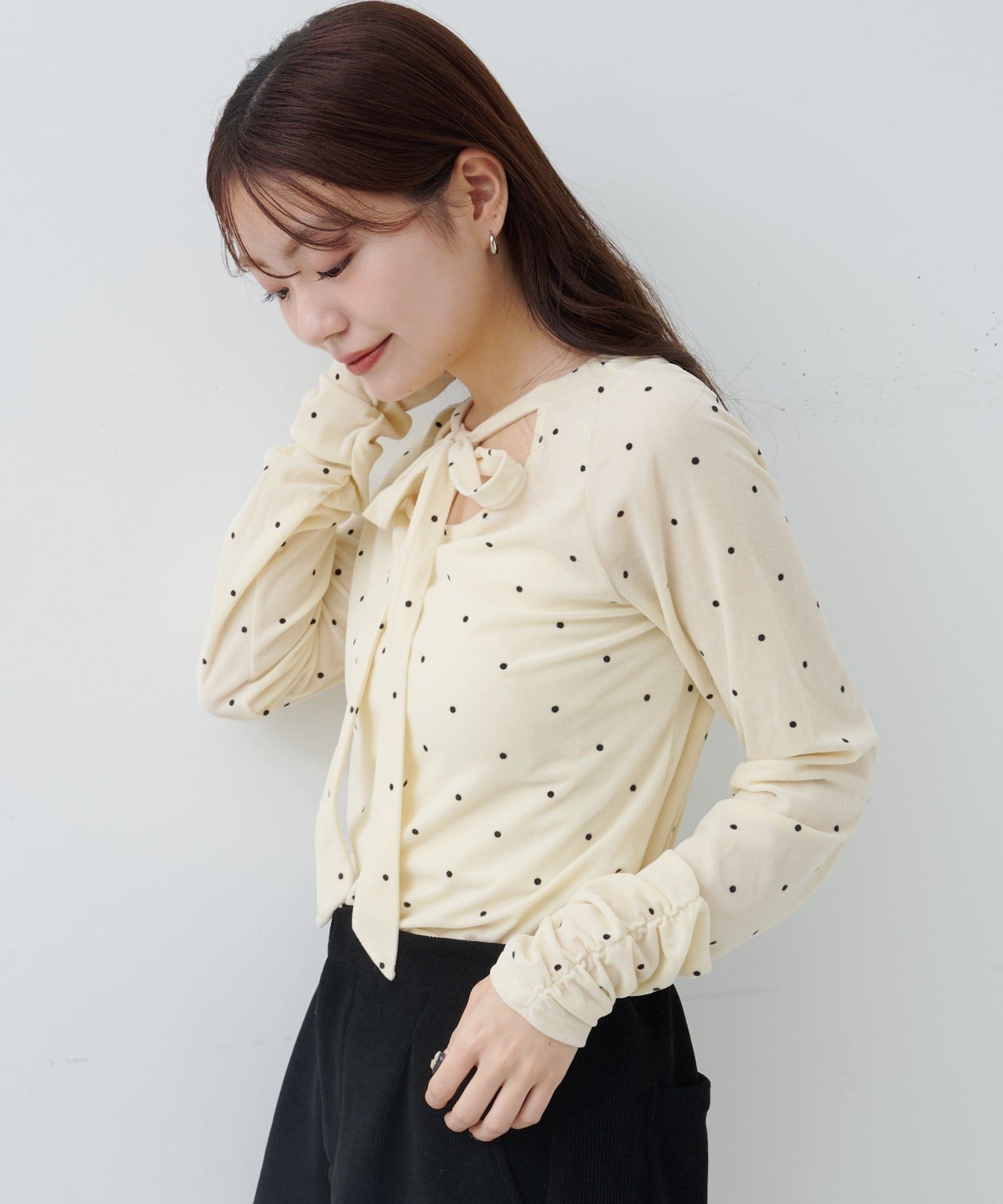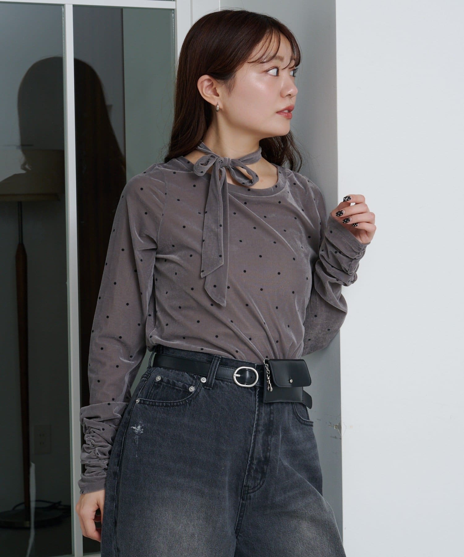 光沢ベロア×ドットで品よく映える、ボウタイプルオーバー