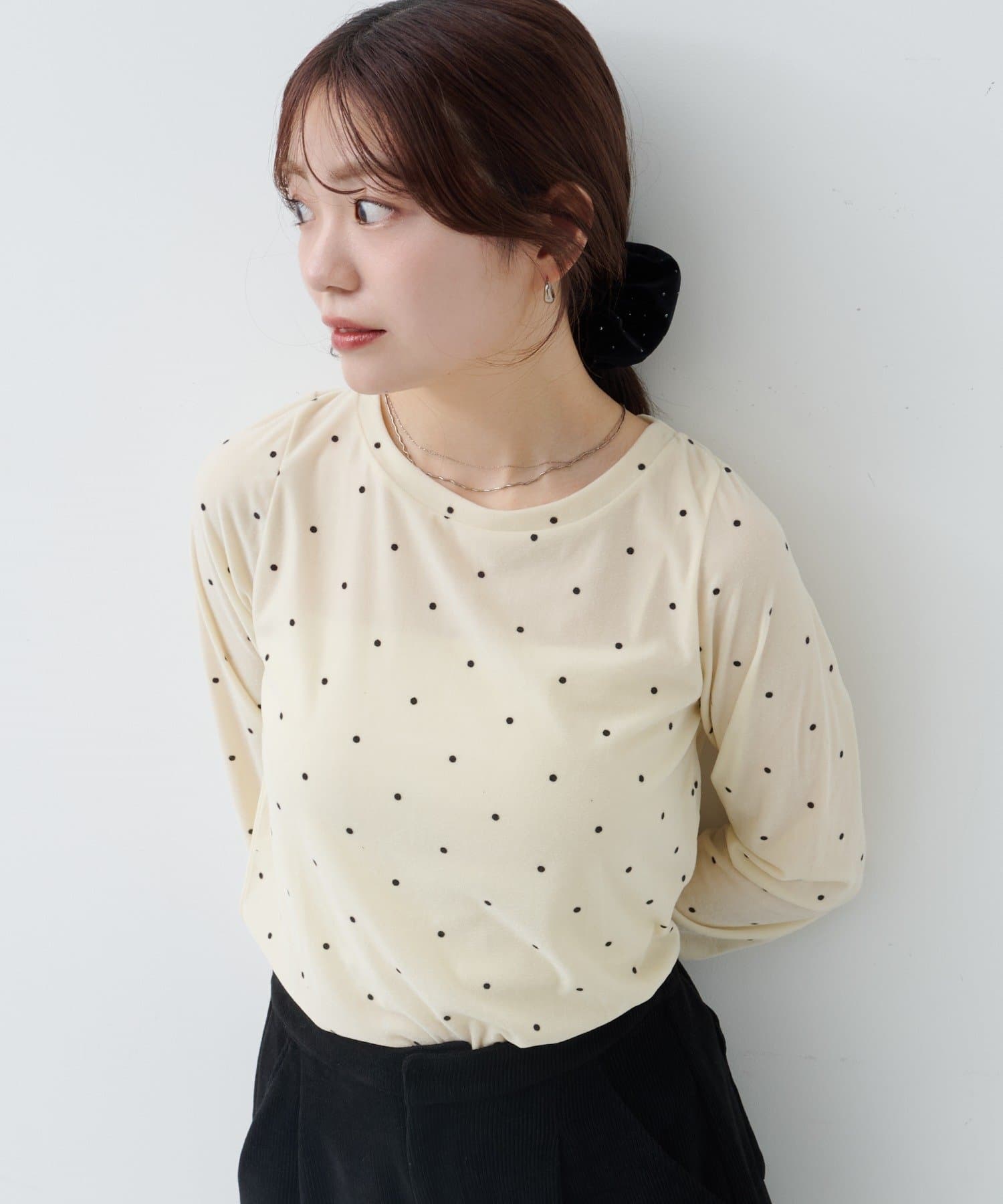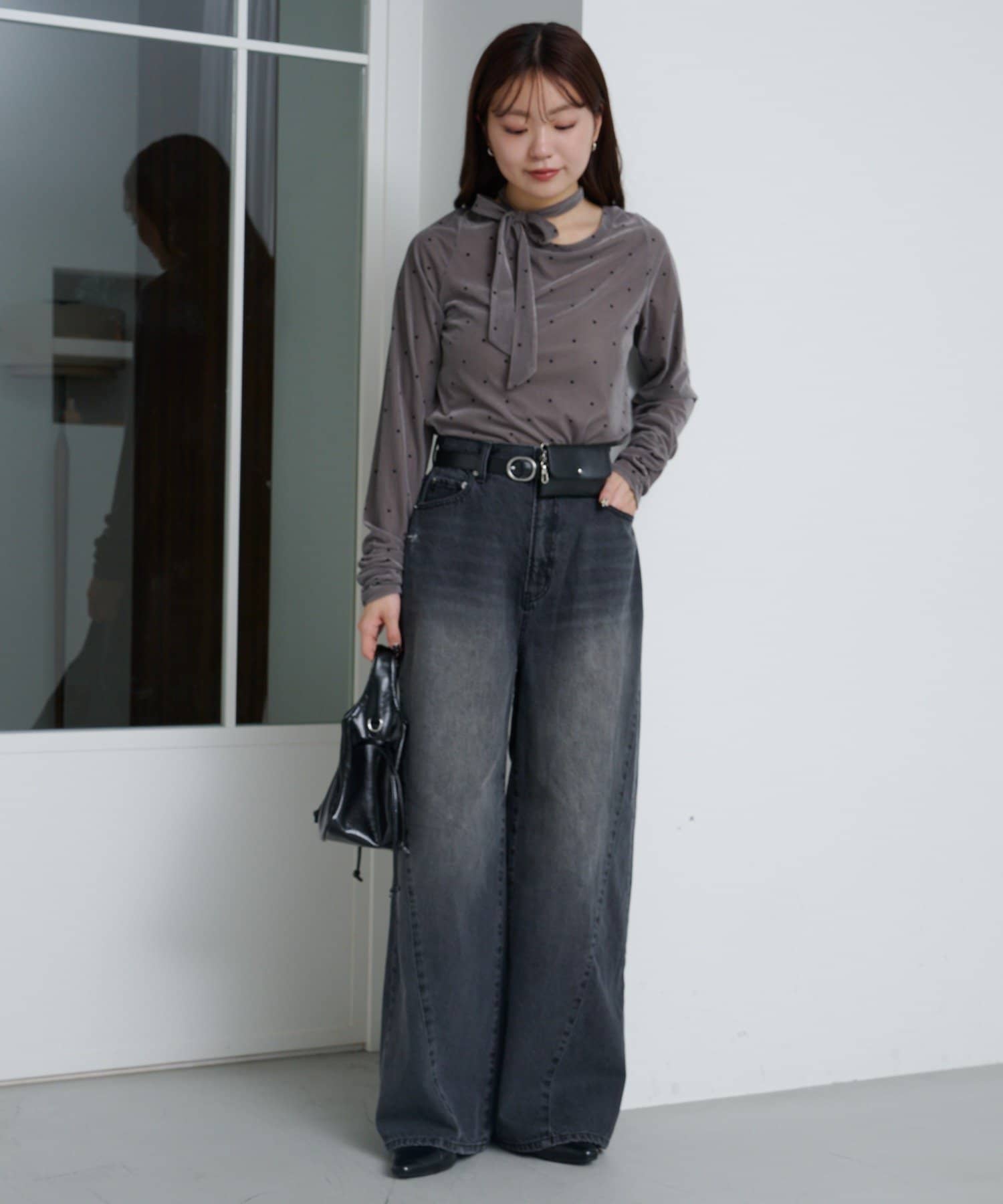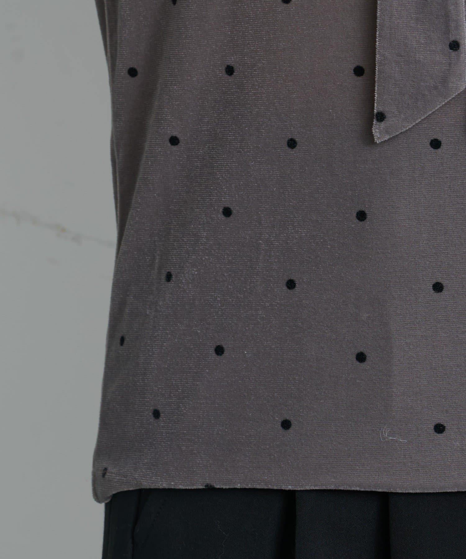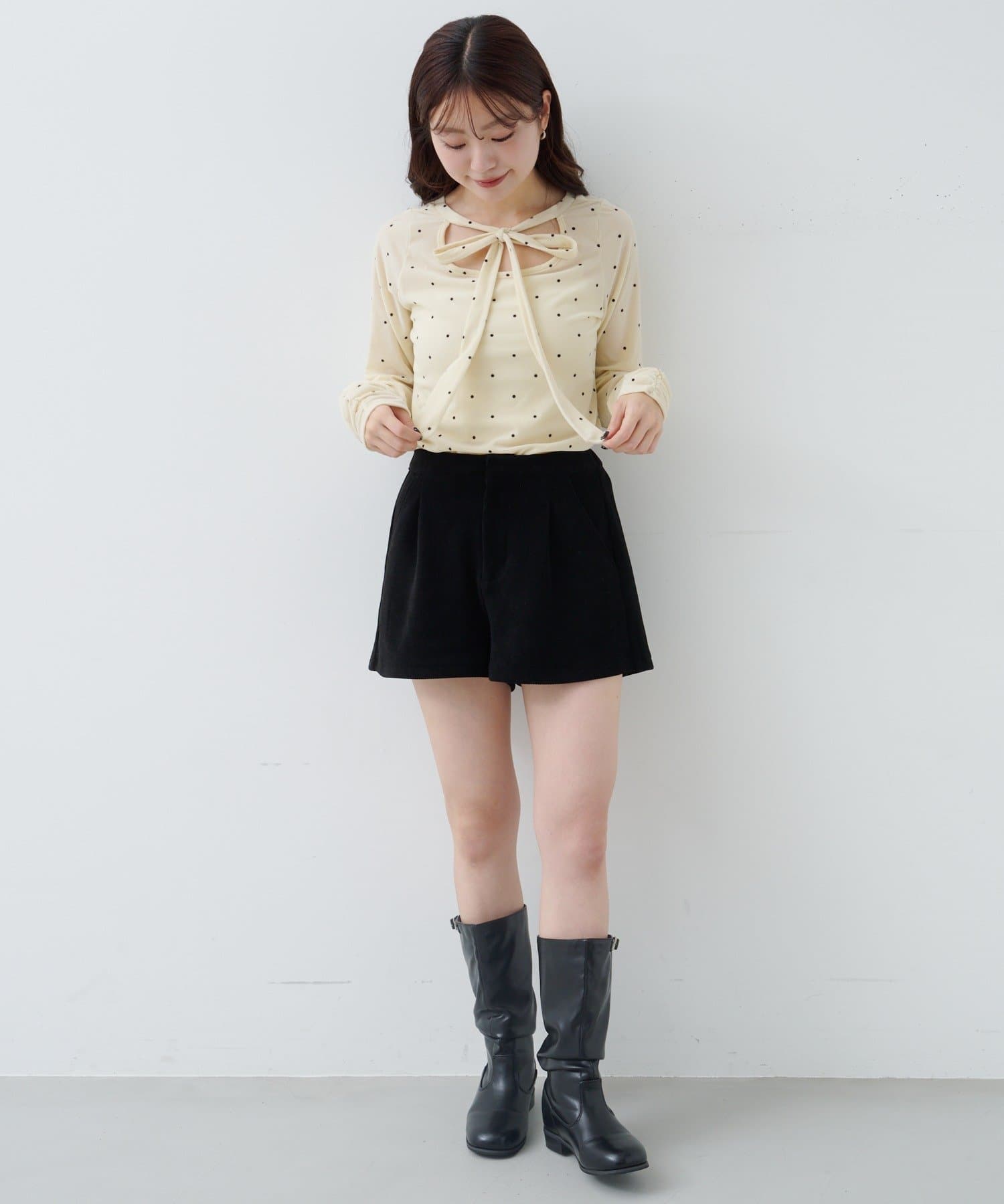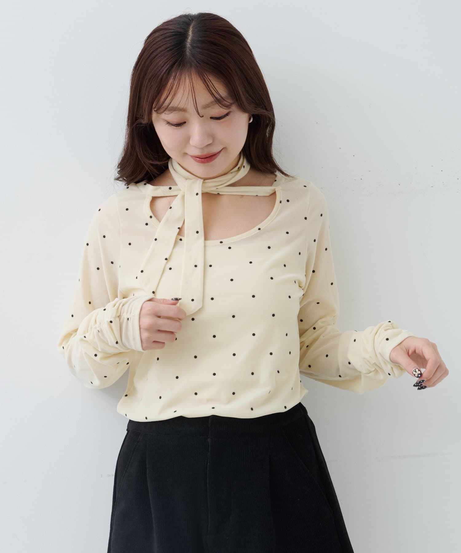光沢ベロア×ドットで品よく映える、ボウタイプルオーバー