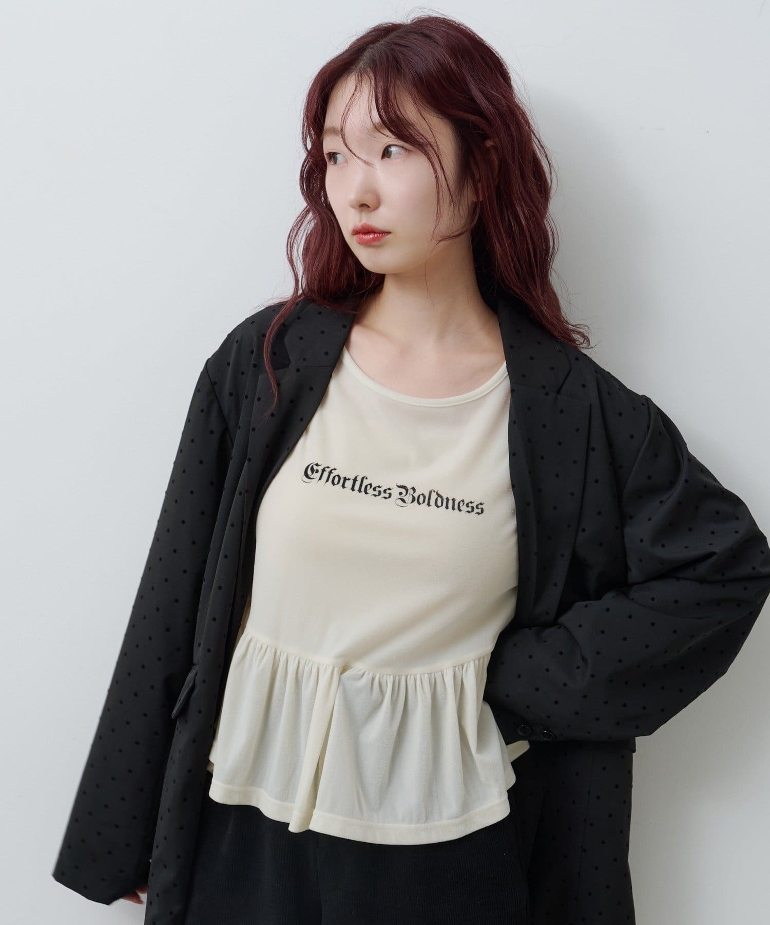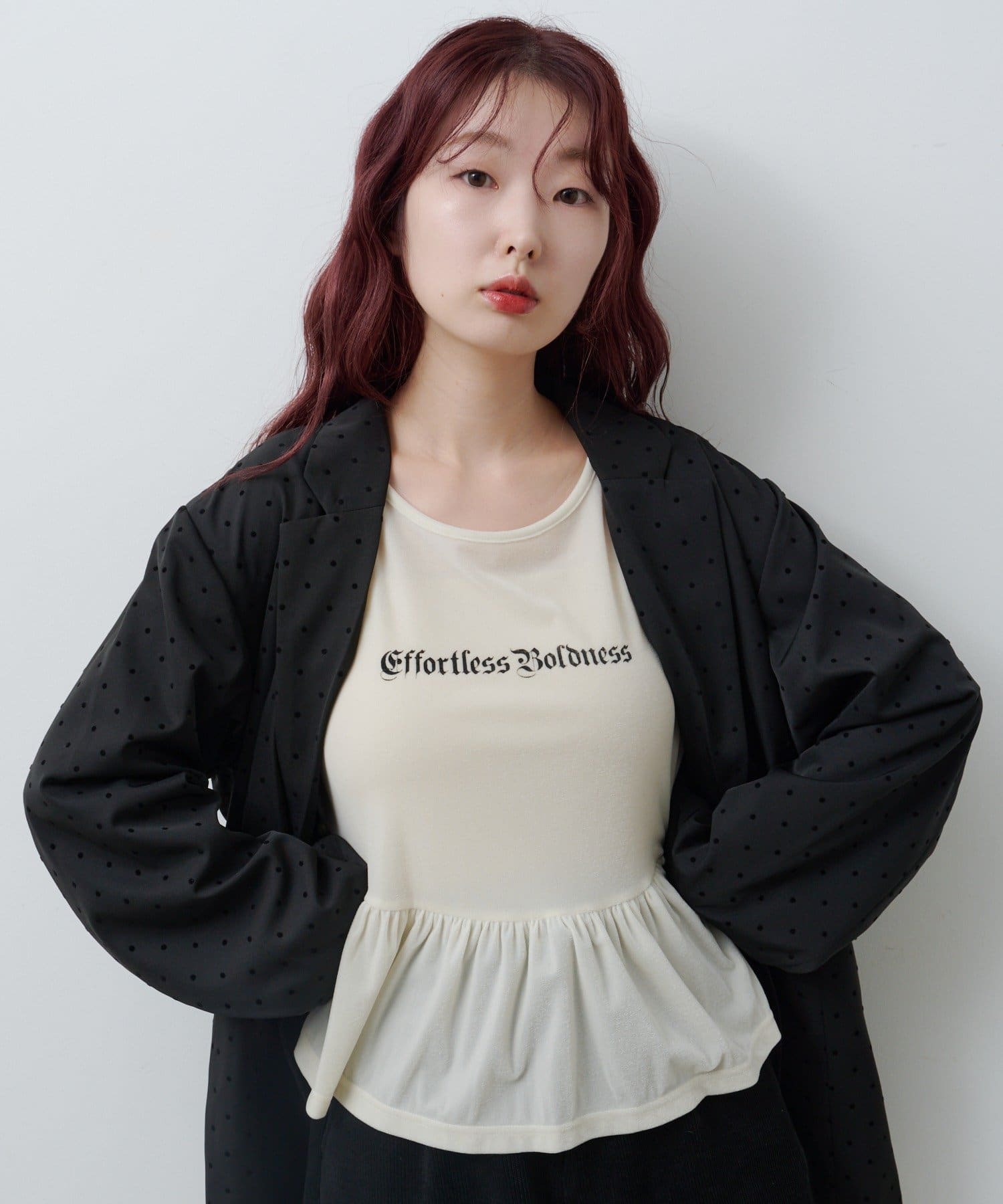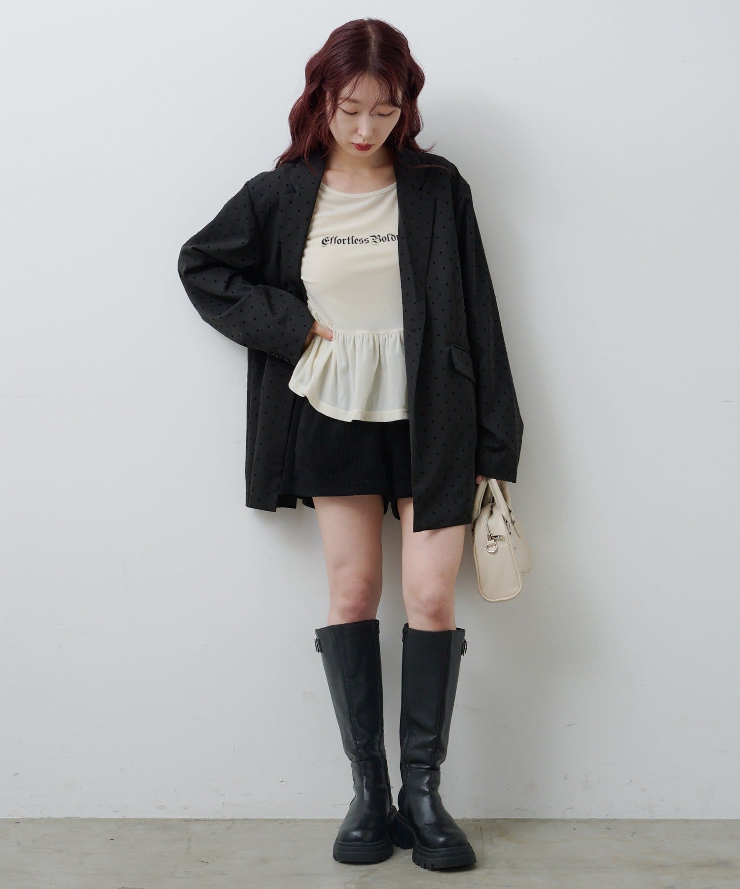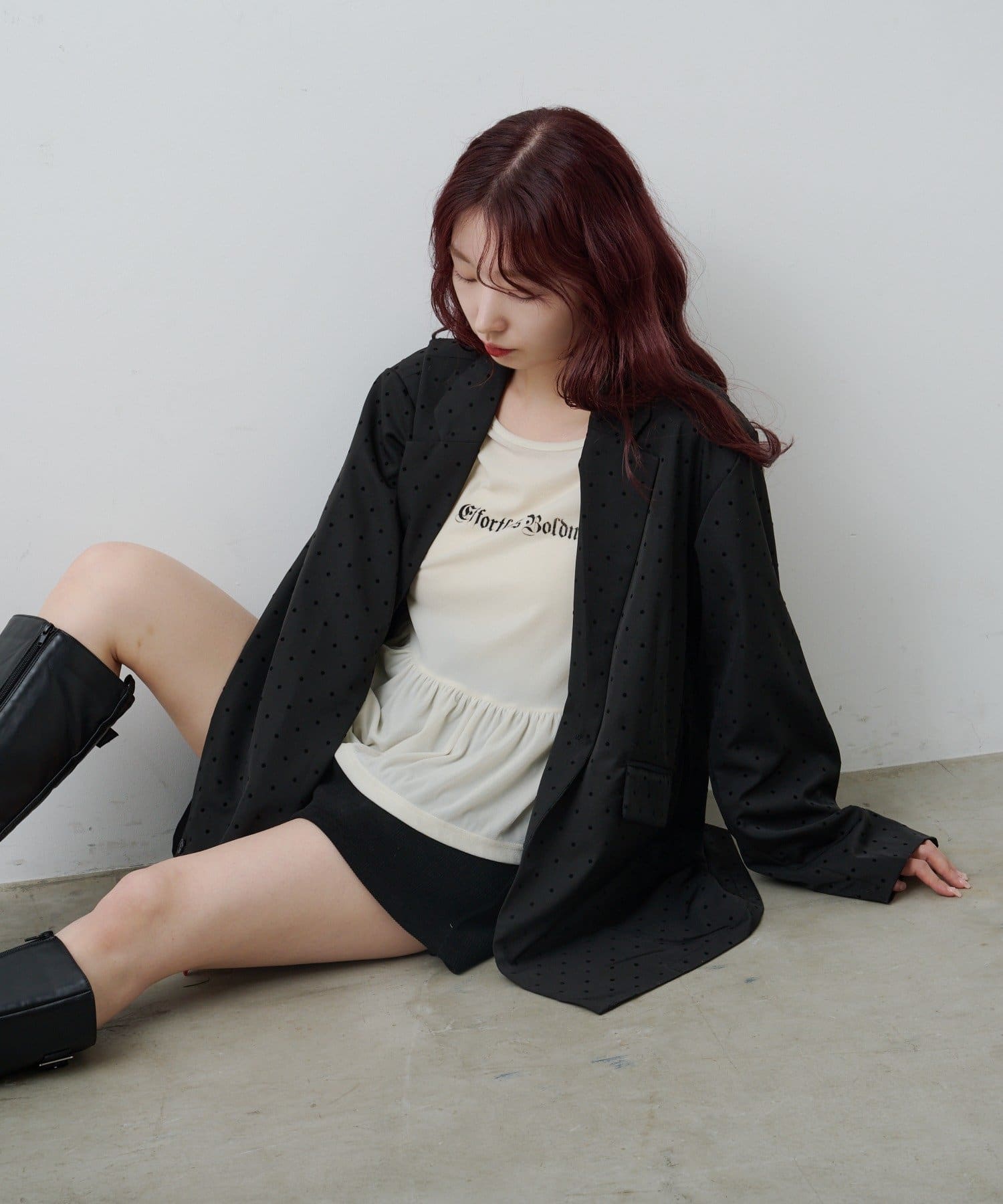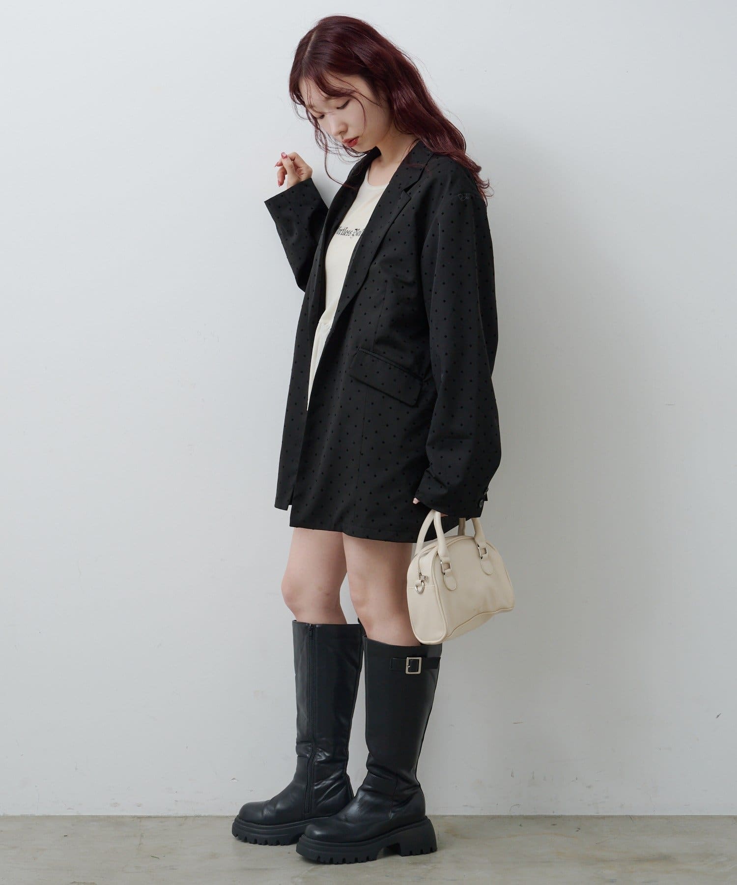 同素材のドットアイテムとのセットアップコーデもおすすめ。
