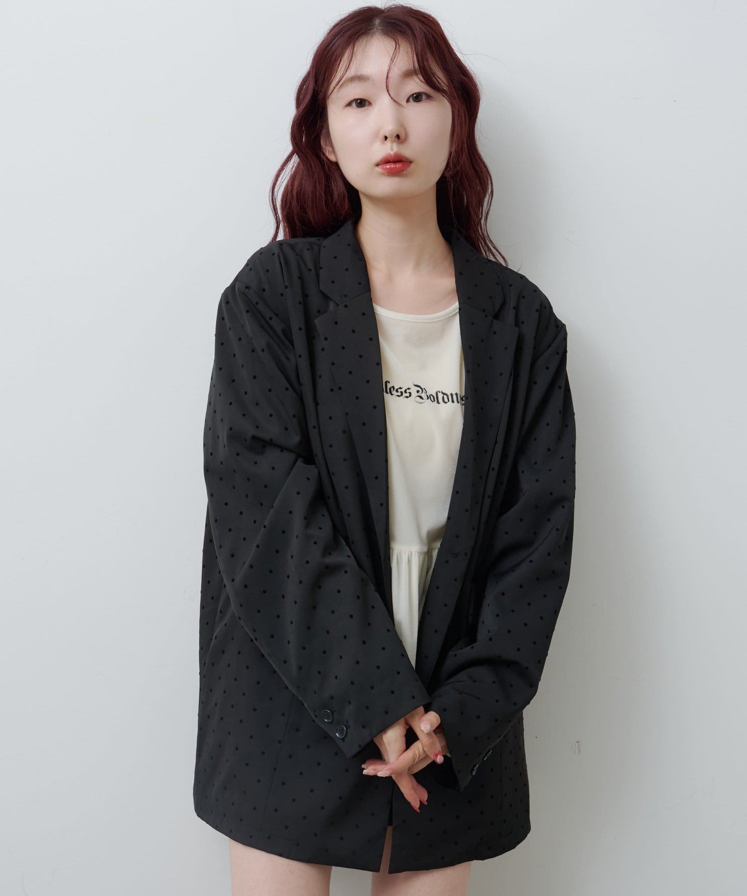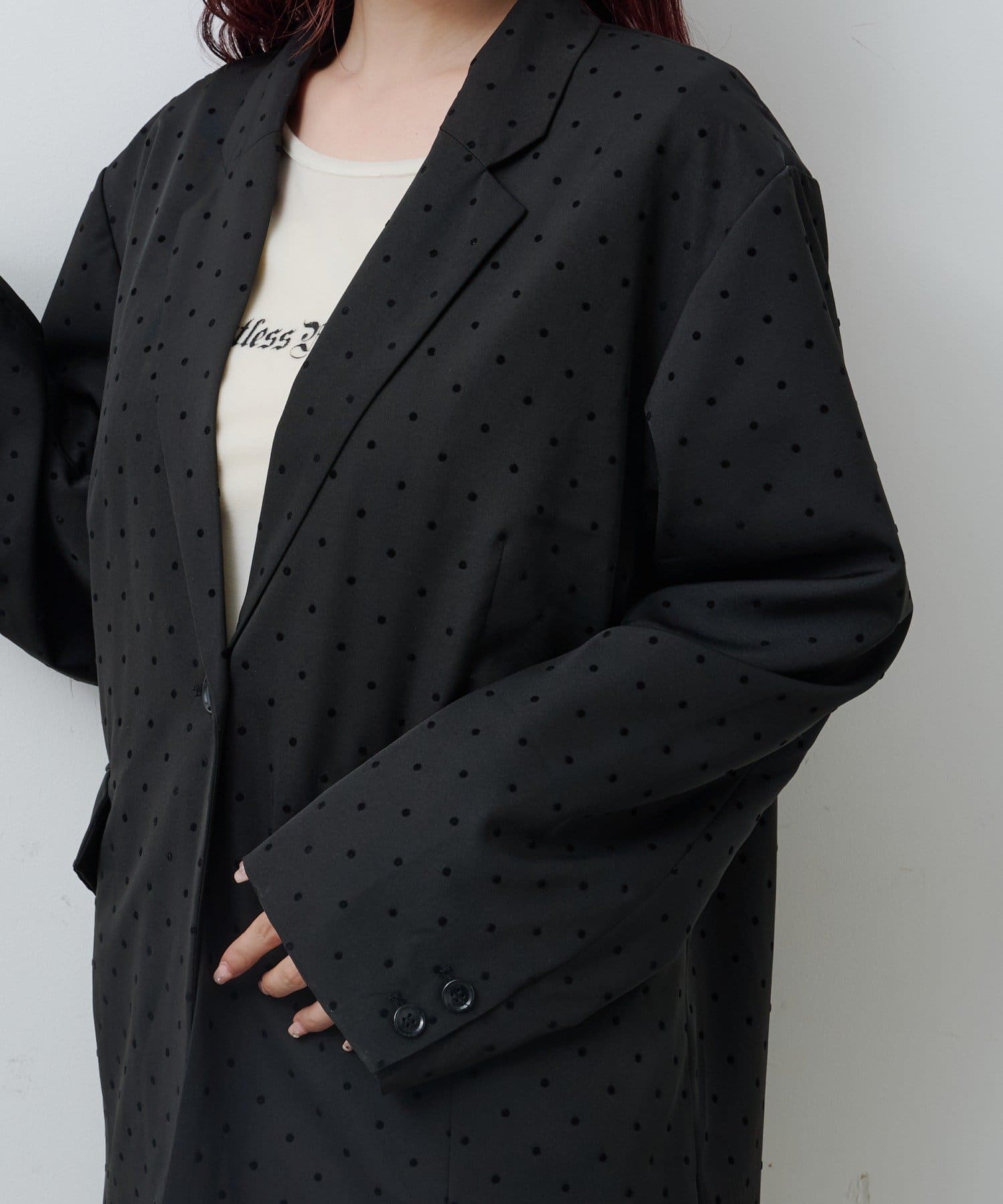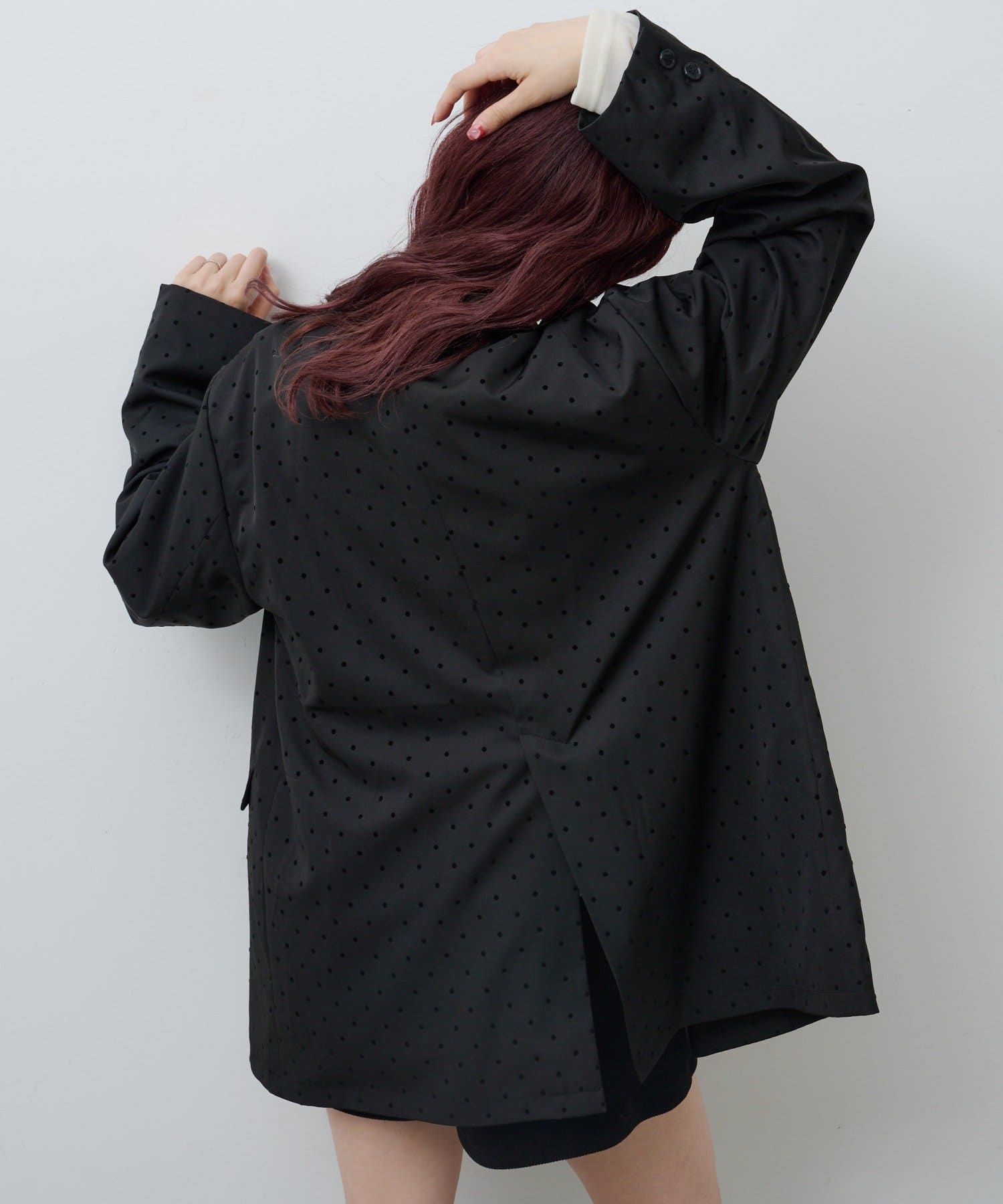 上品な光沢を纏ったサテン素材にドット柄を施したジャケット。
