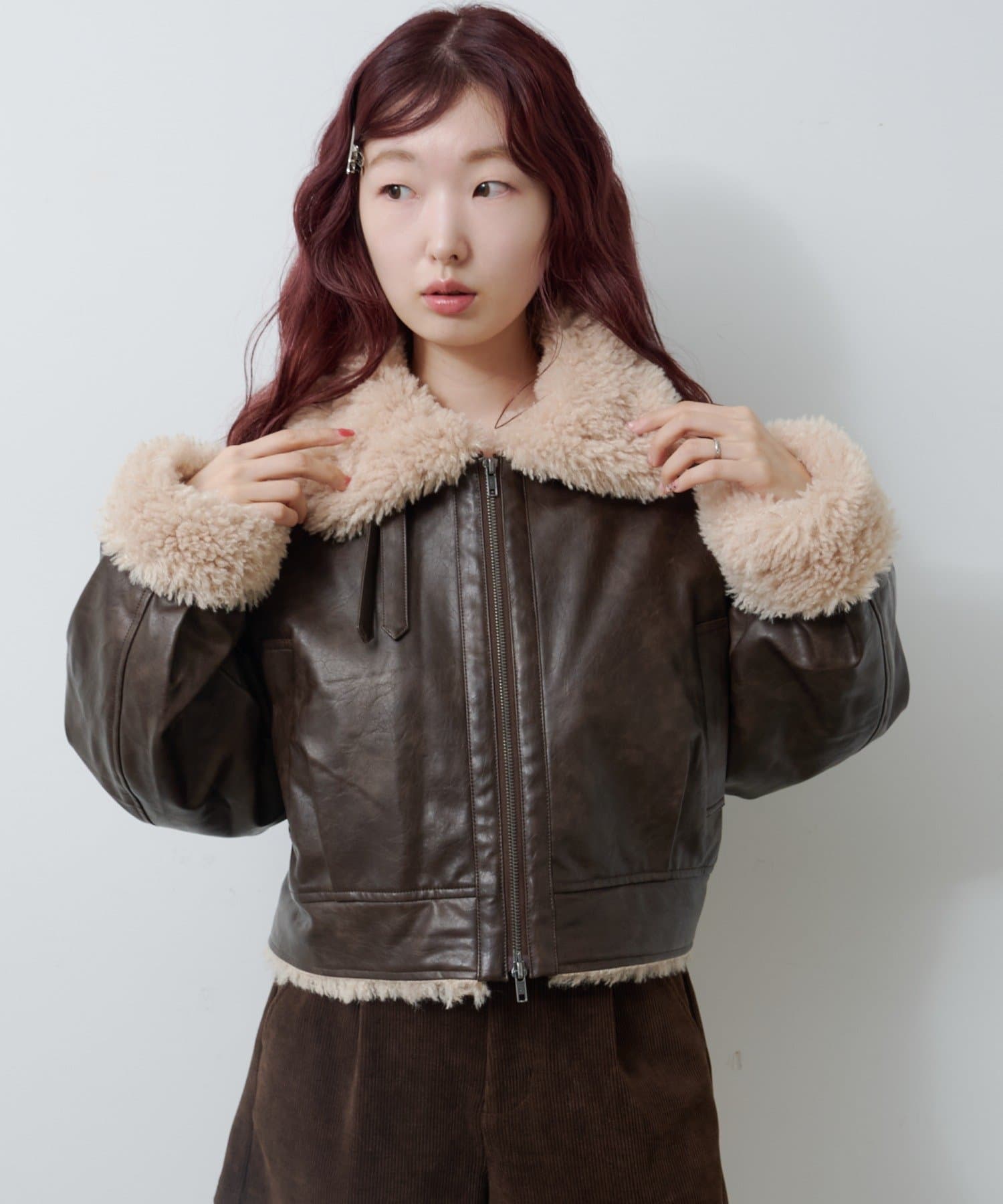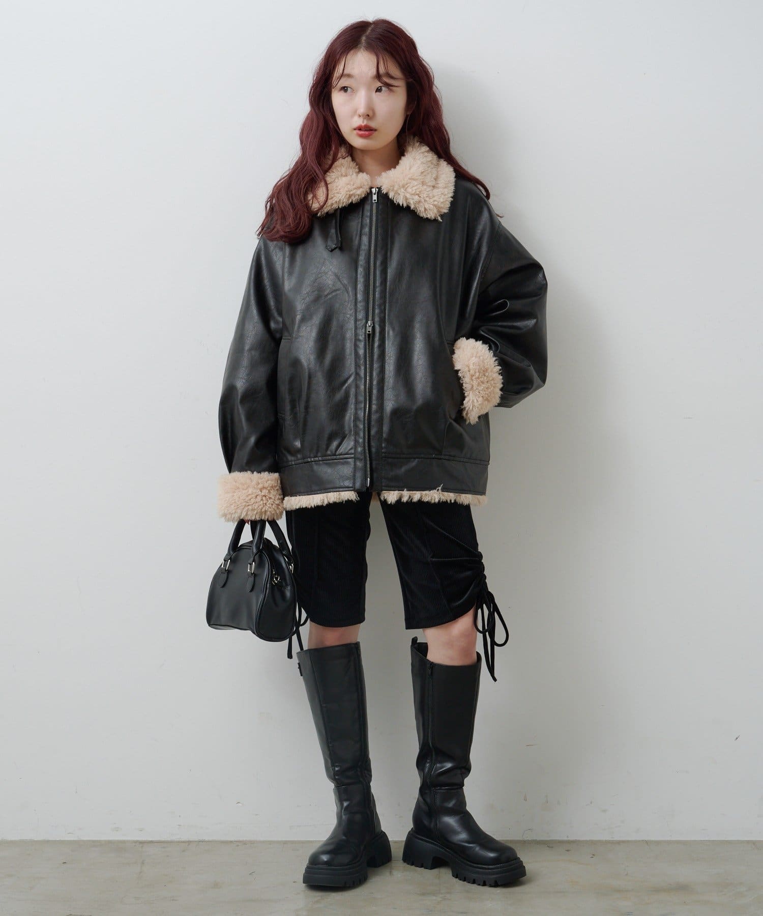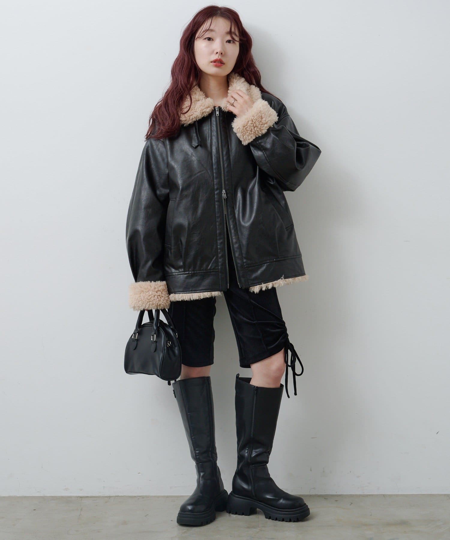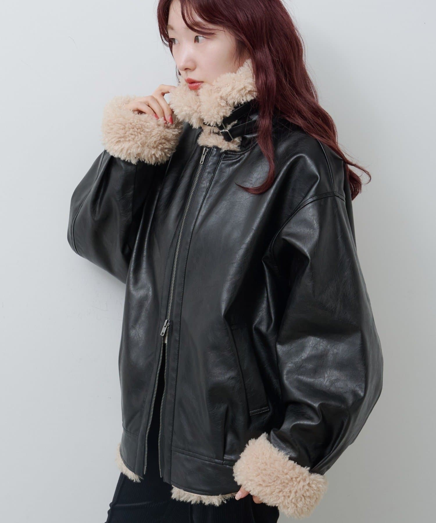 ボリュームのあるボア衿とレザー調素材の組み合わせが印象的なボアフライトジャケット。