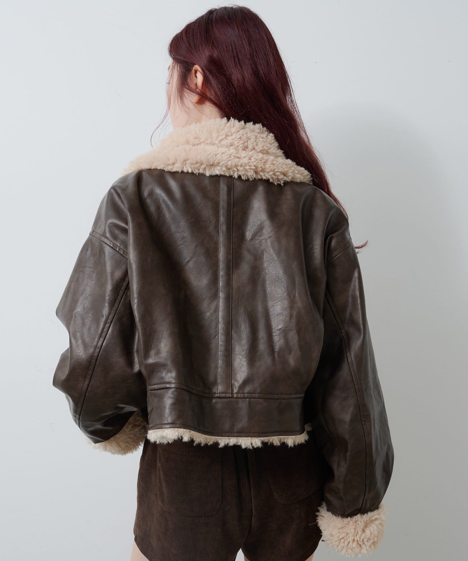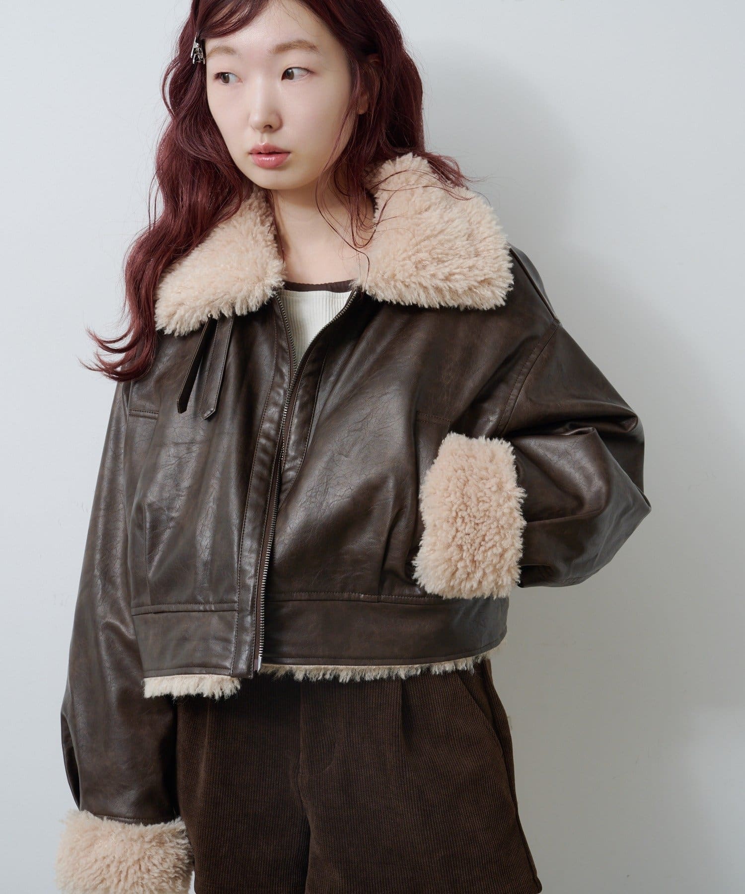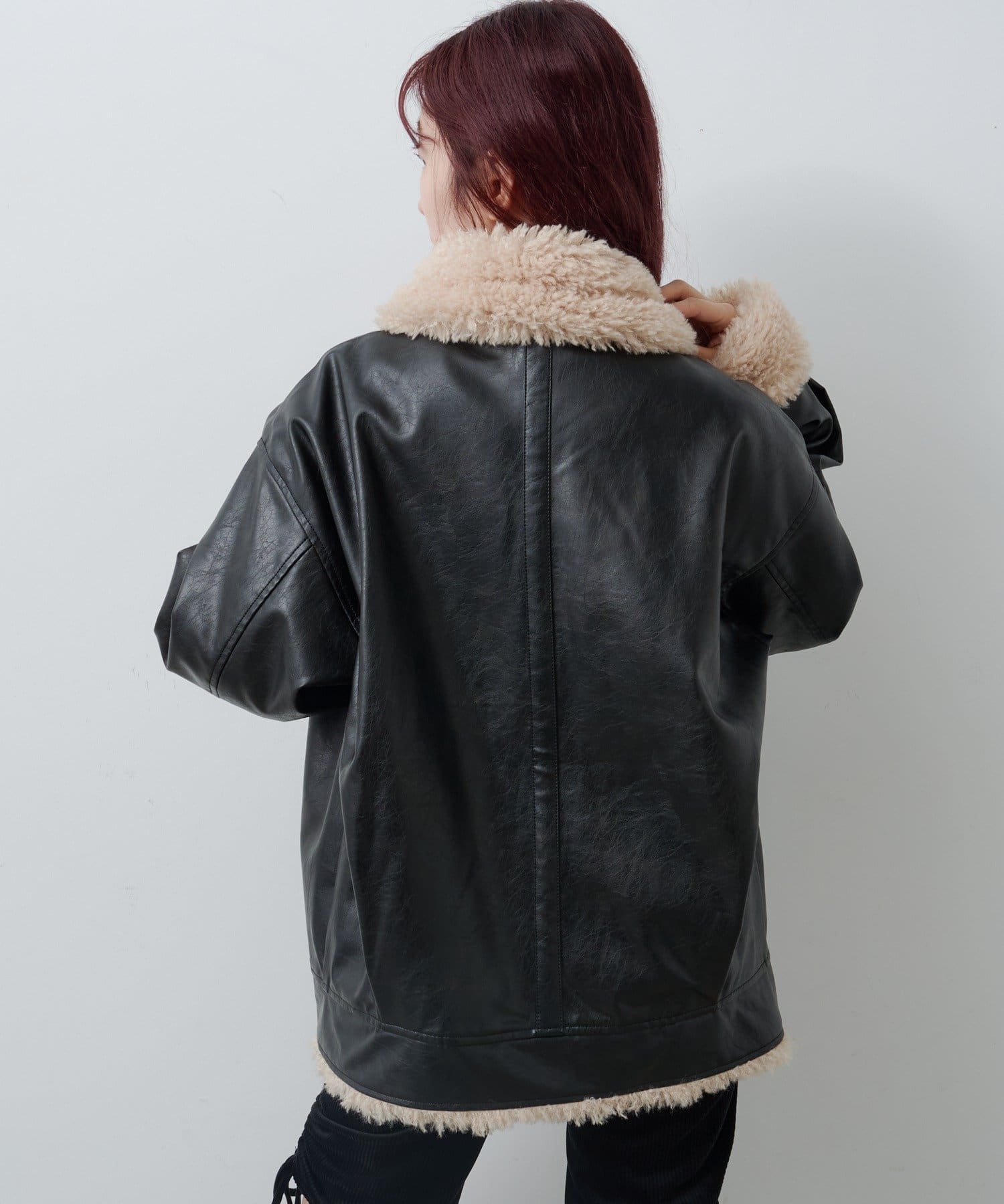 ボリュームのあるボア衿とレザー調素材の組み合わせが印象的なボアフライトジャケット。