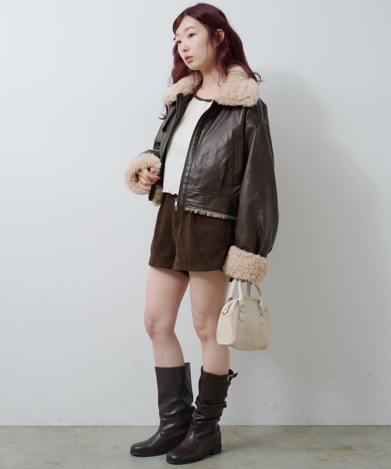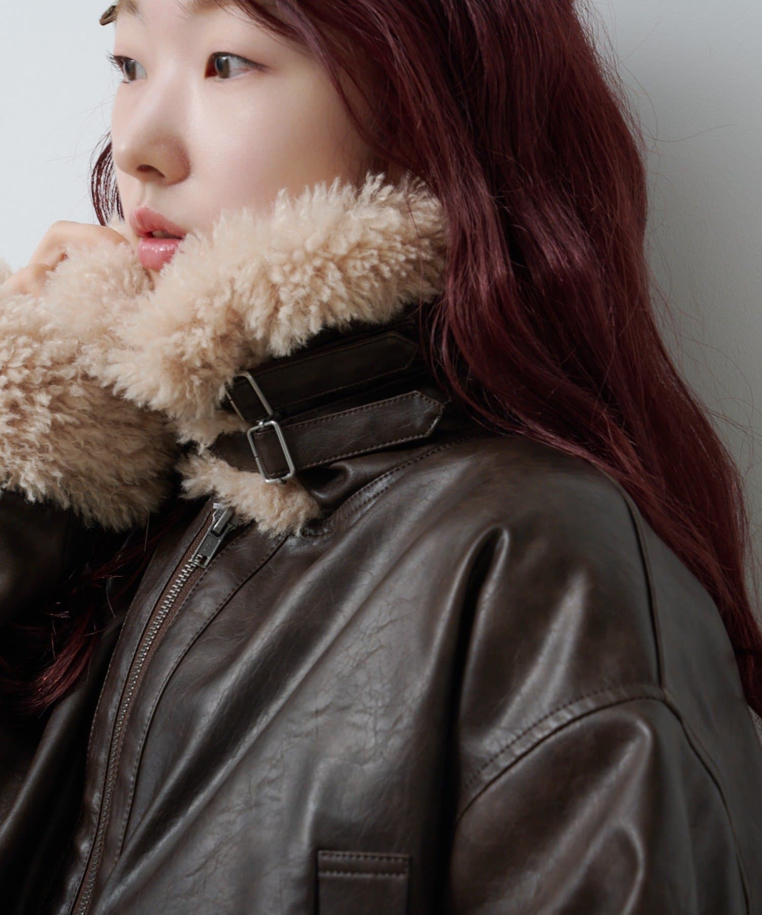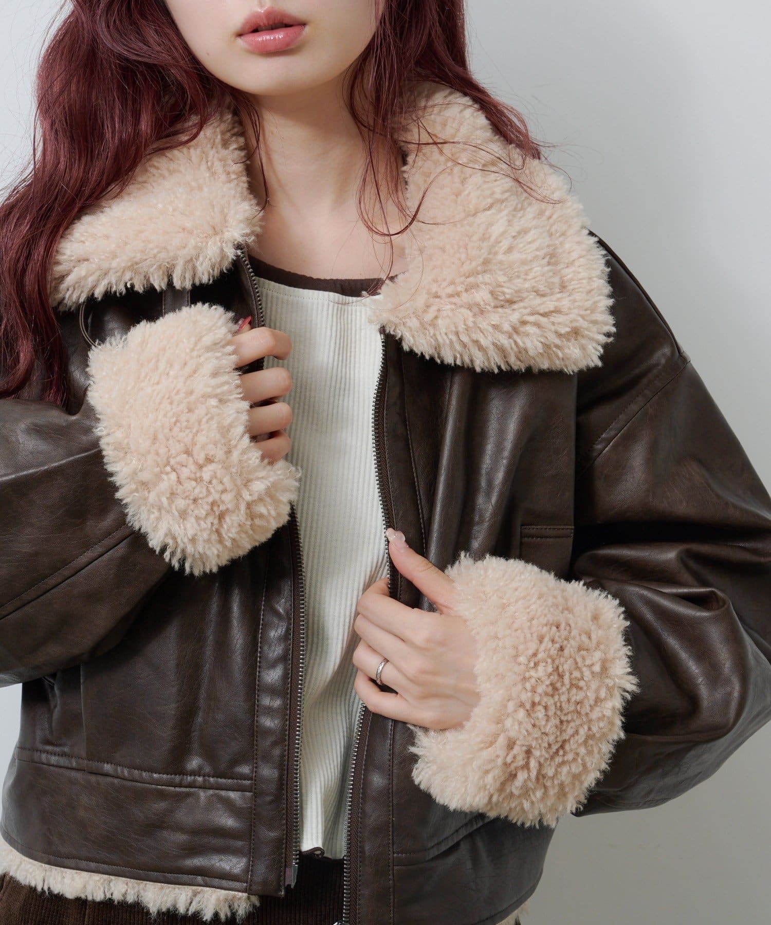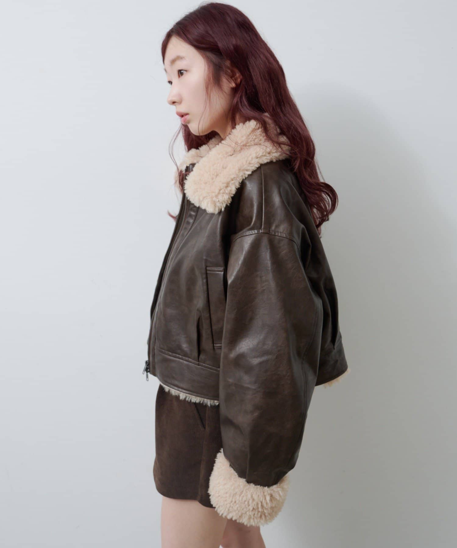 ボリュームのあるボア衿とレザー調素材の組み合わせが印象的なボアフライトジャケット。