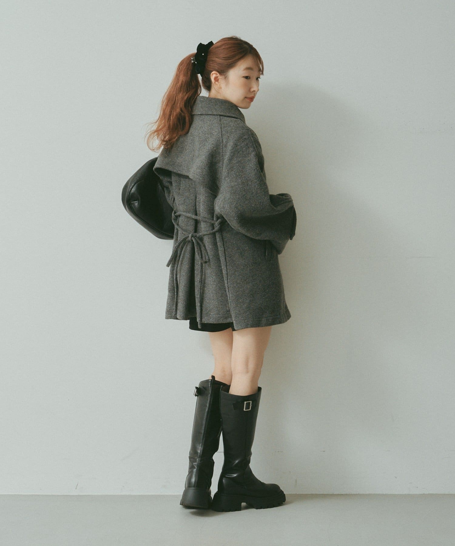 コートのフレアシルエットが際立ち、アウター主役のスタイリングで冬のお出かけにぴったりです。