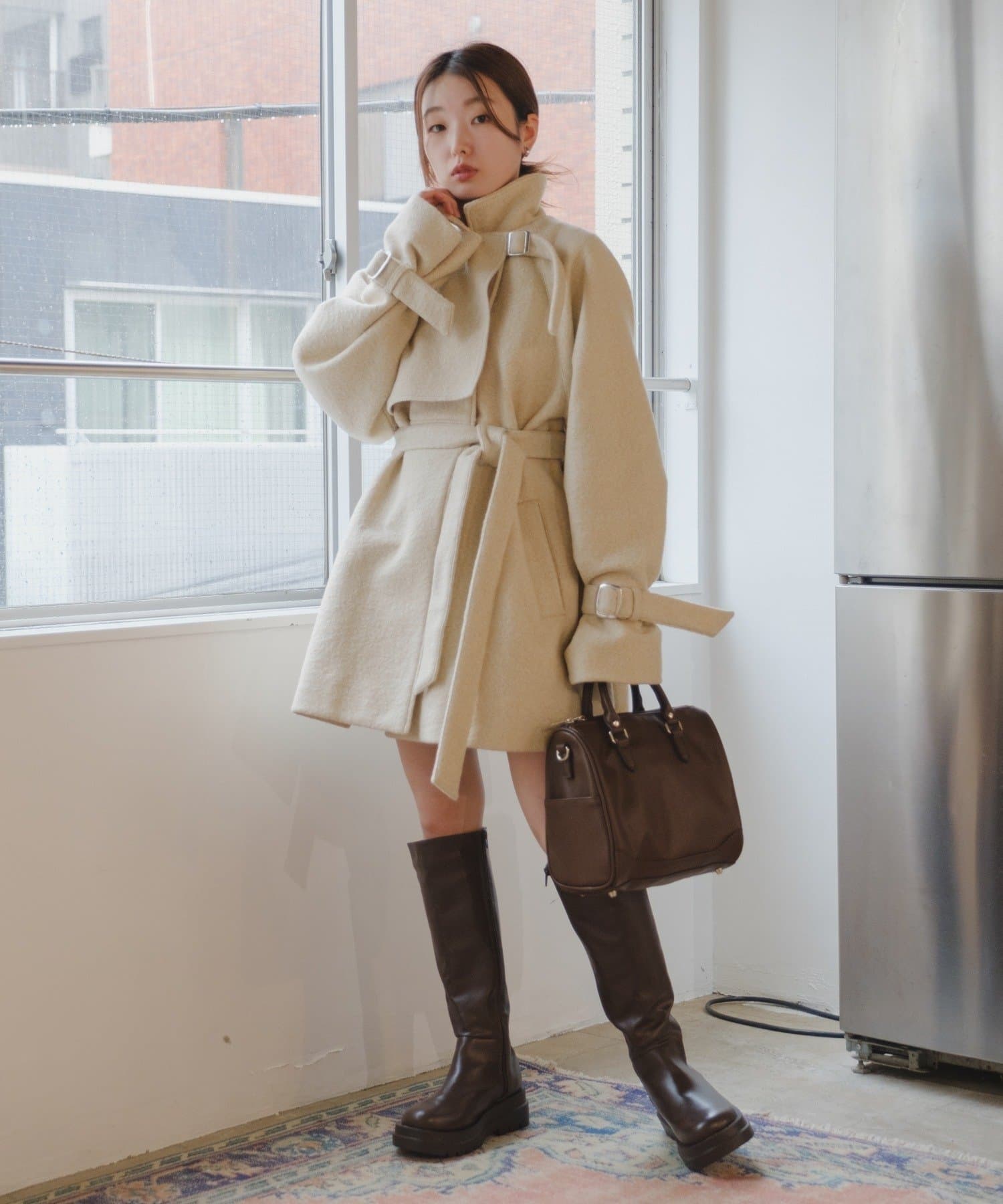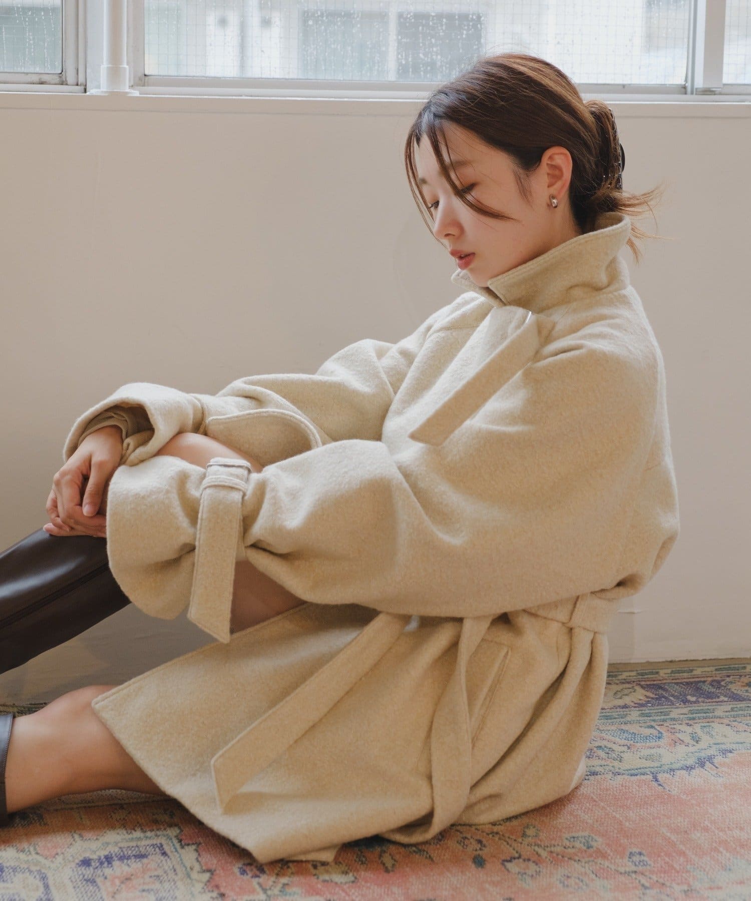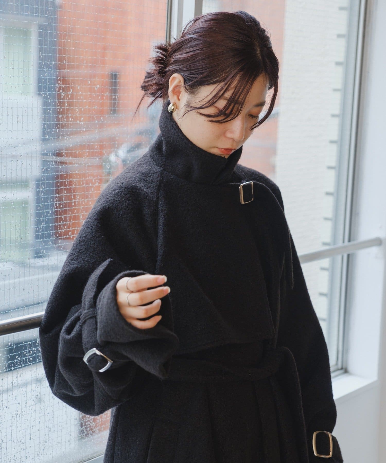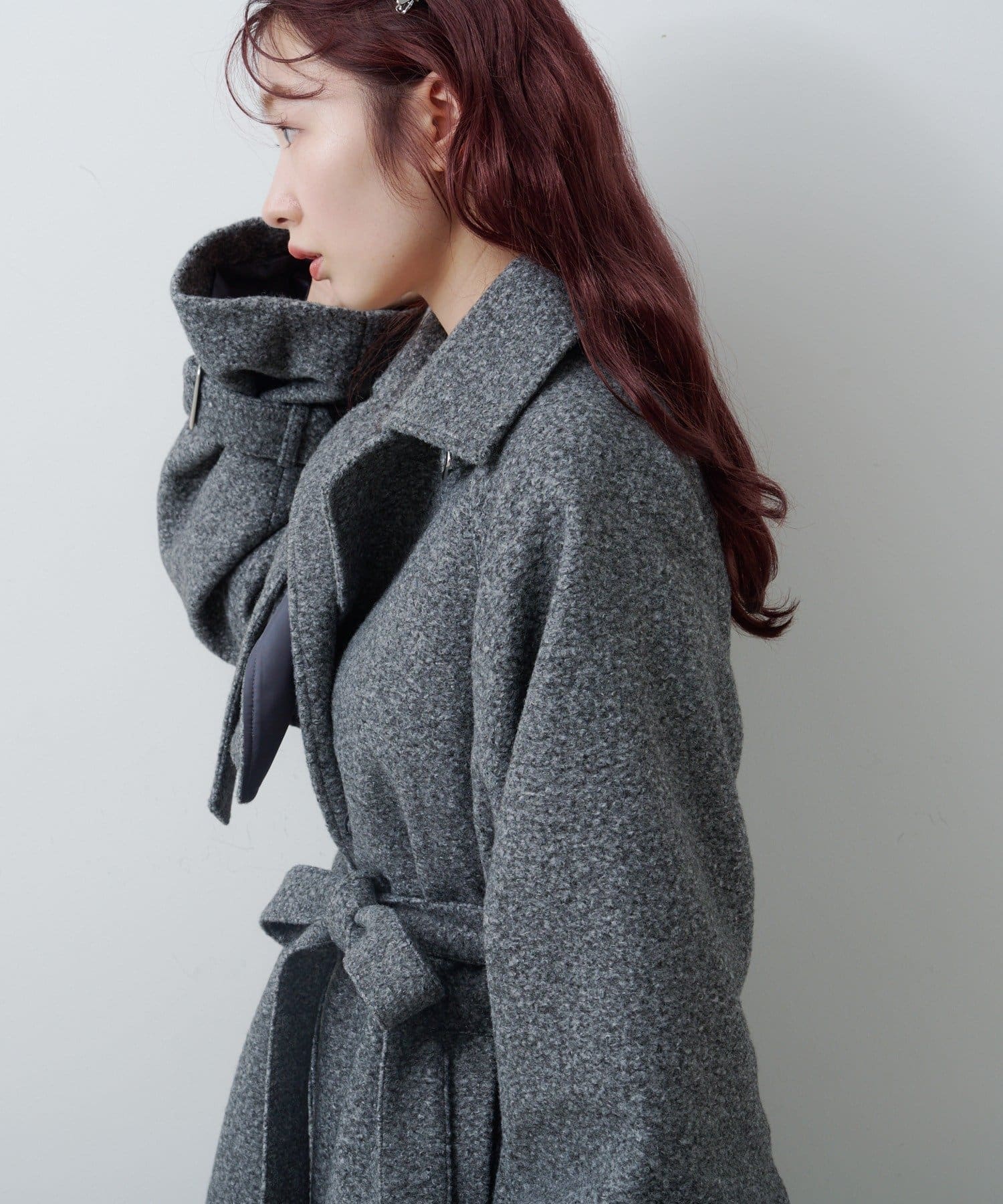 ふんわり広がるフレアシルエットが上品な印象を与えるハイネックコート。