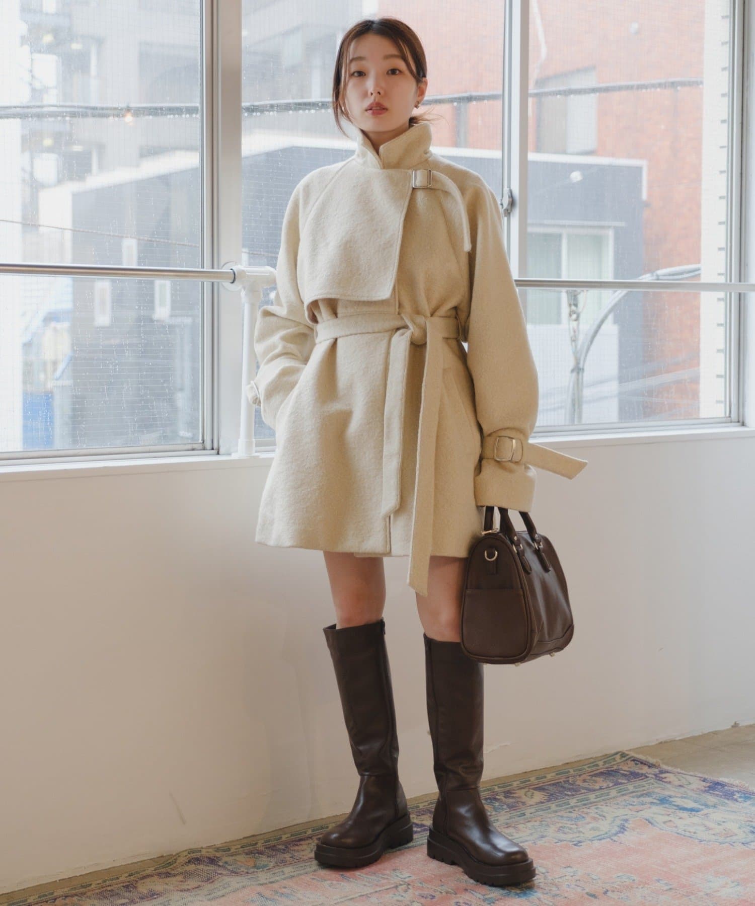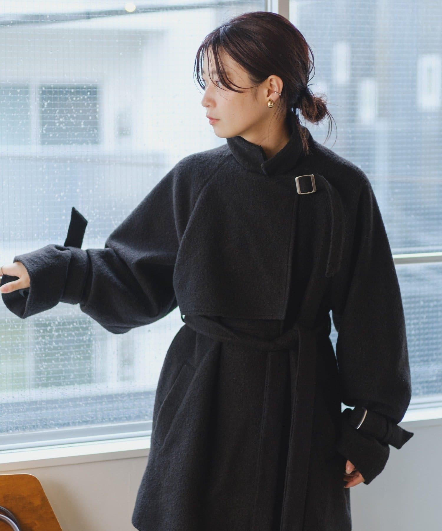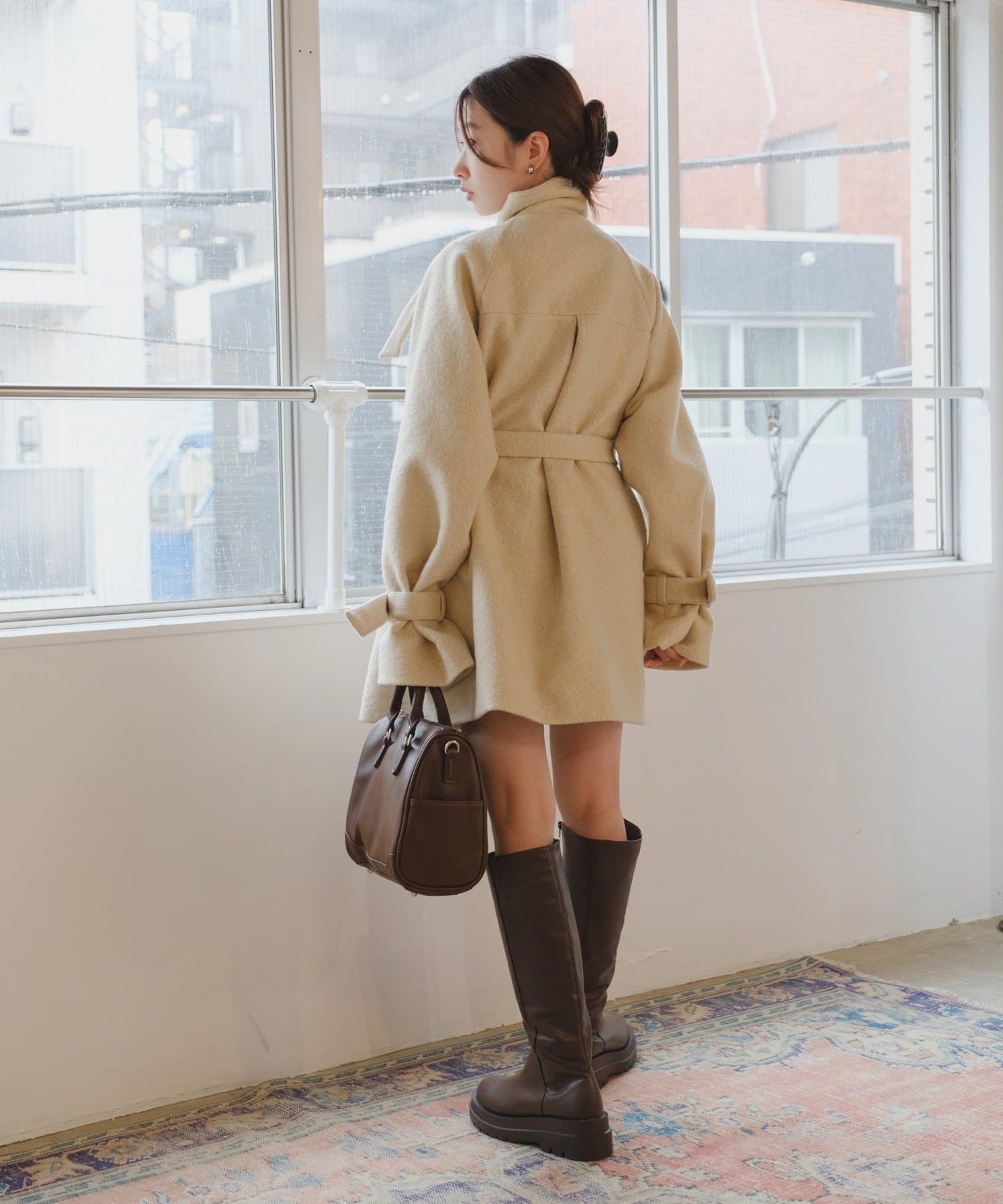 ふんわり広がるフレアシルエットが上品な印象を与えるハイネックコート。