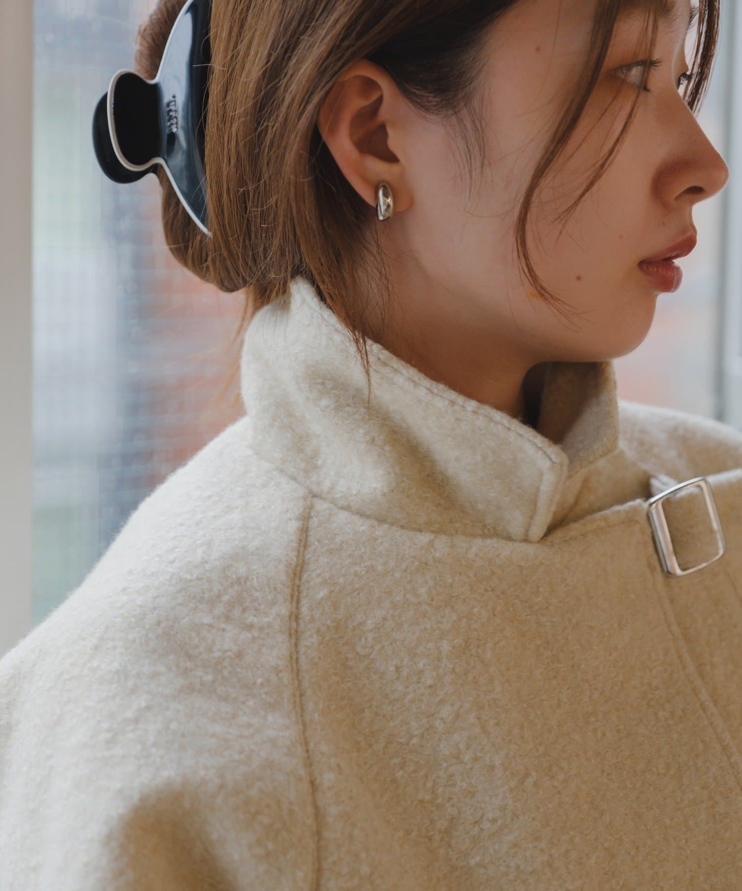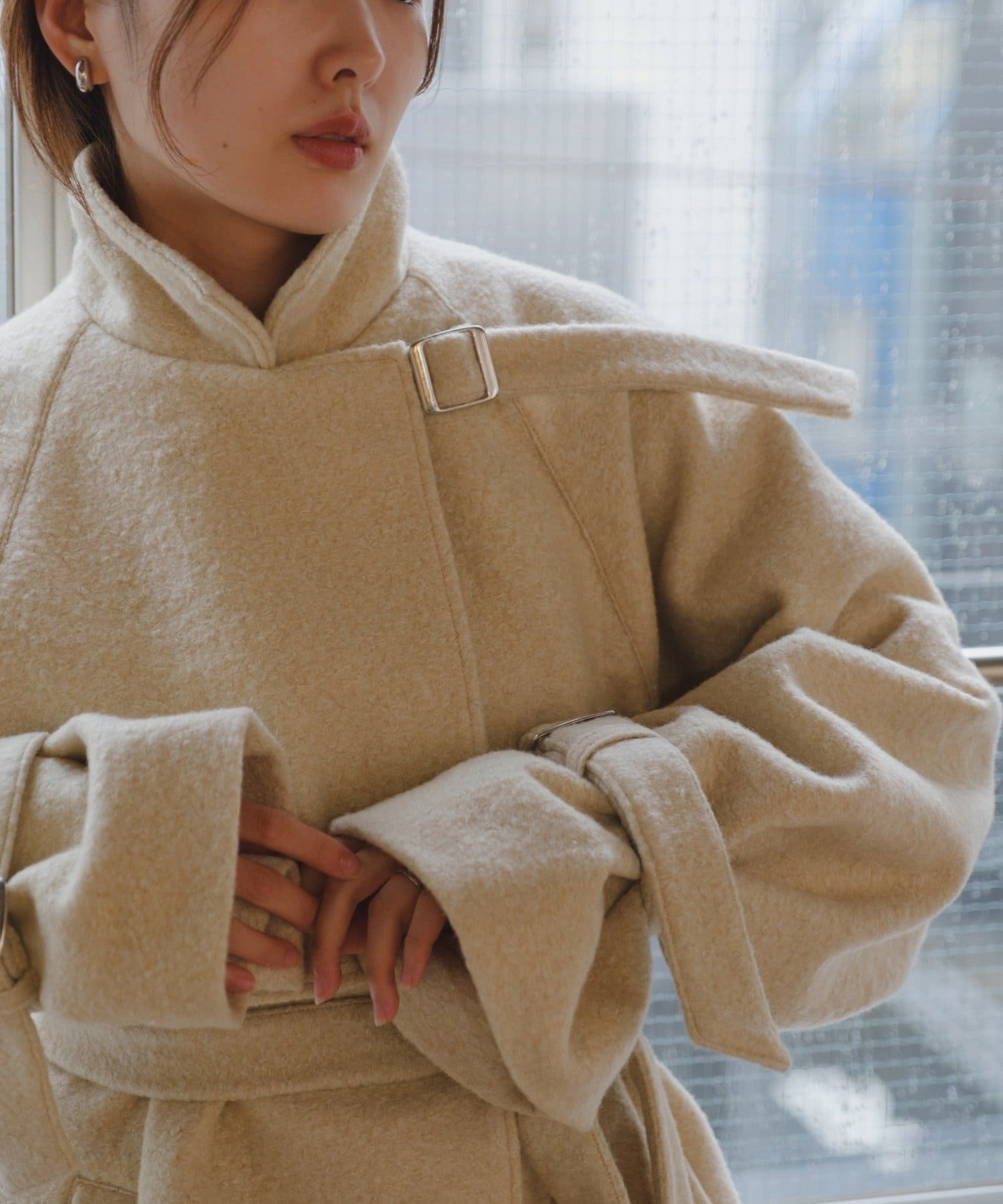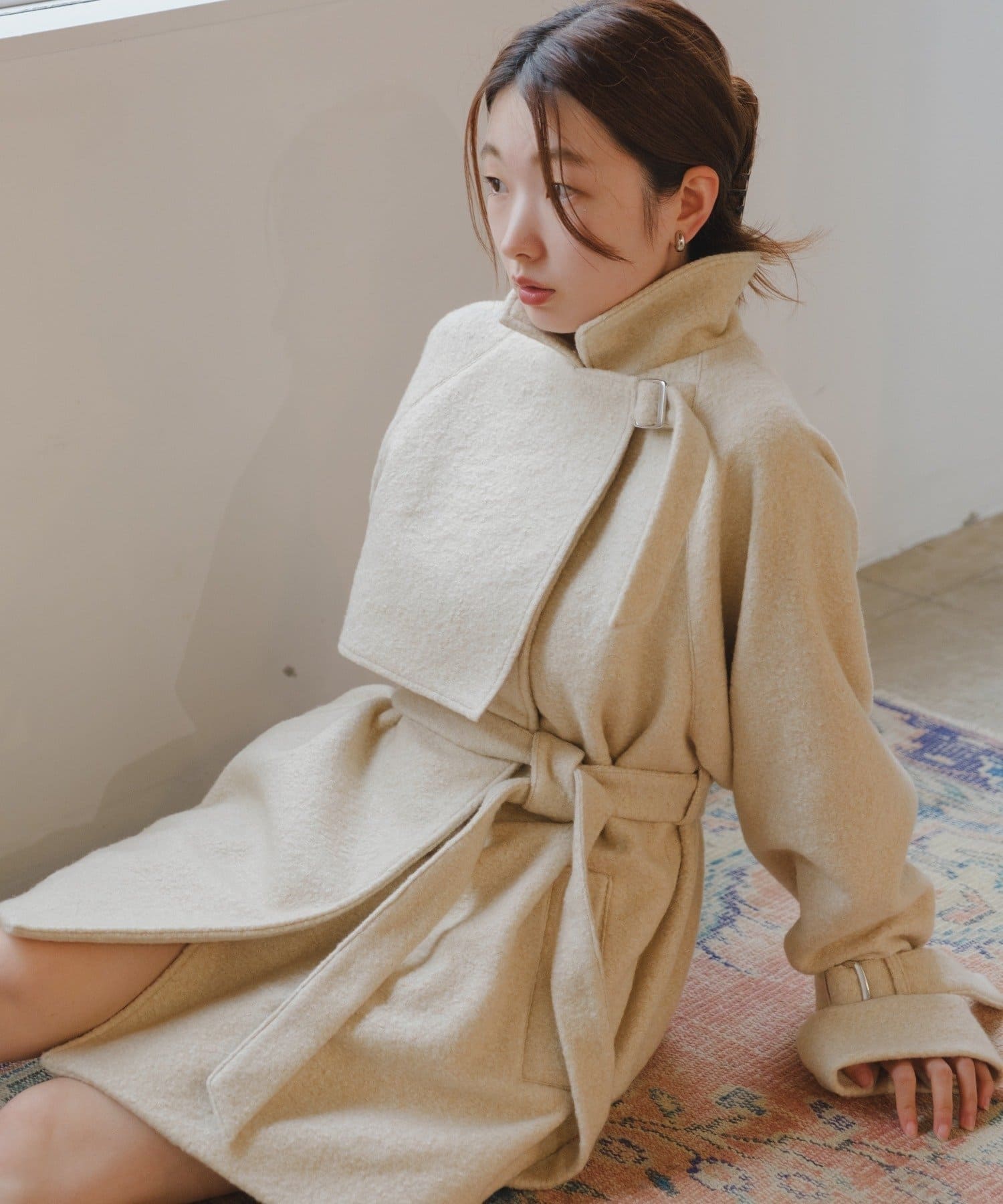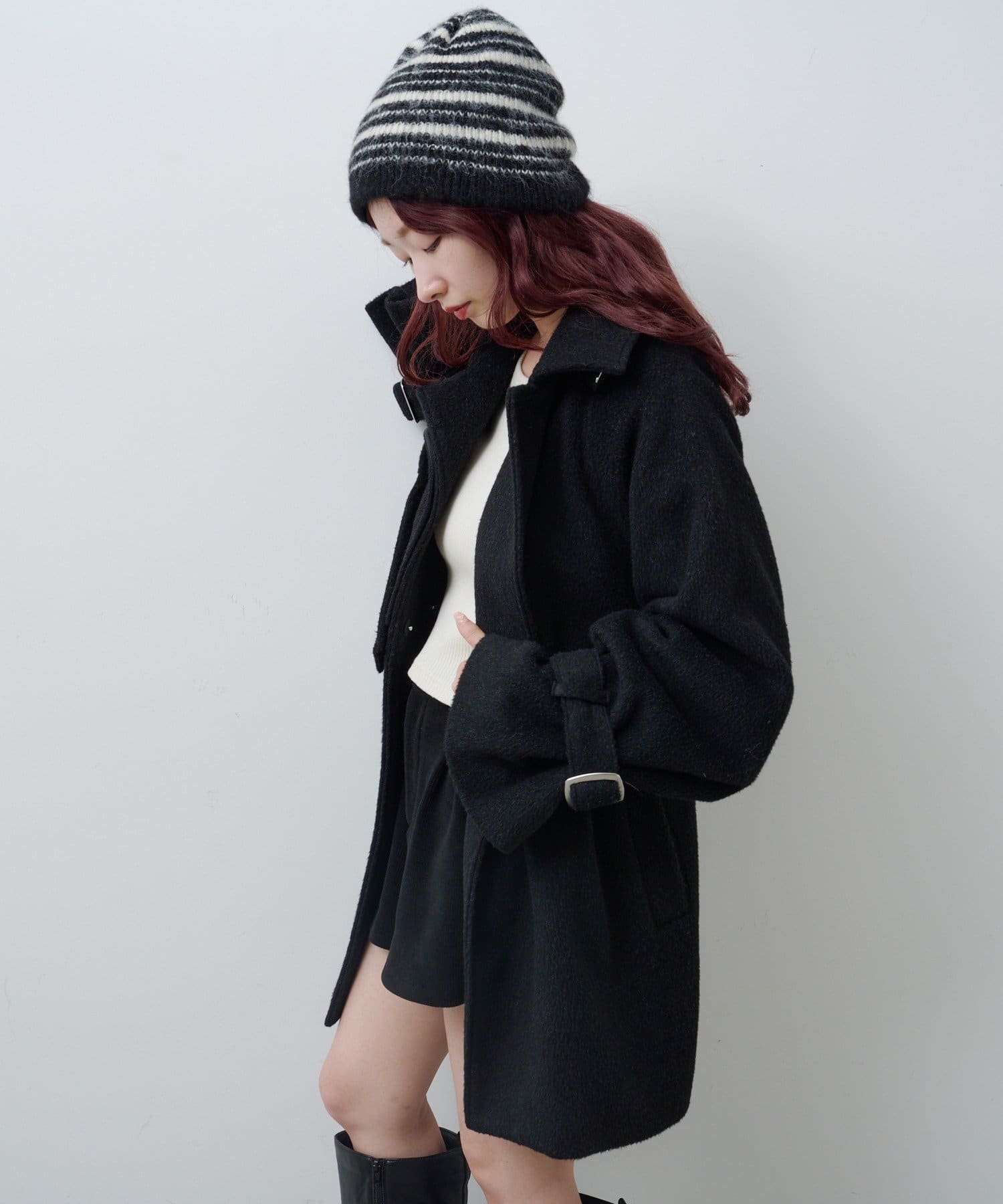 ふんわり広がるフレアシルエットが上品な印象を与えるハイネックコート。