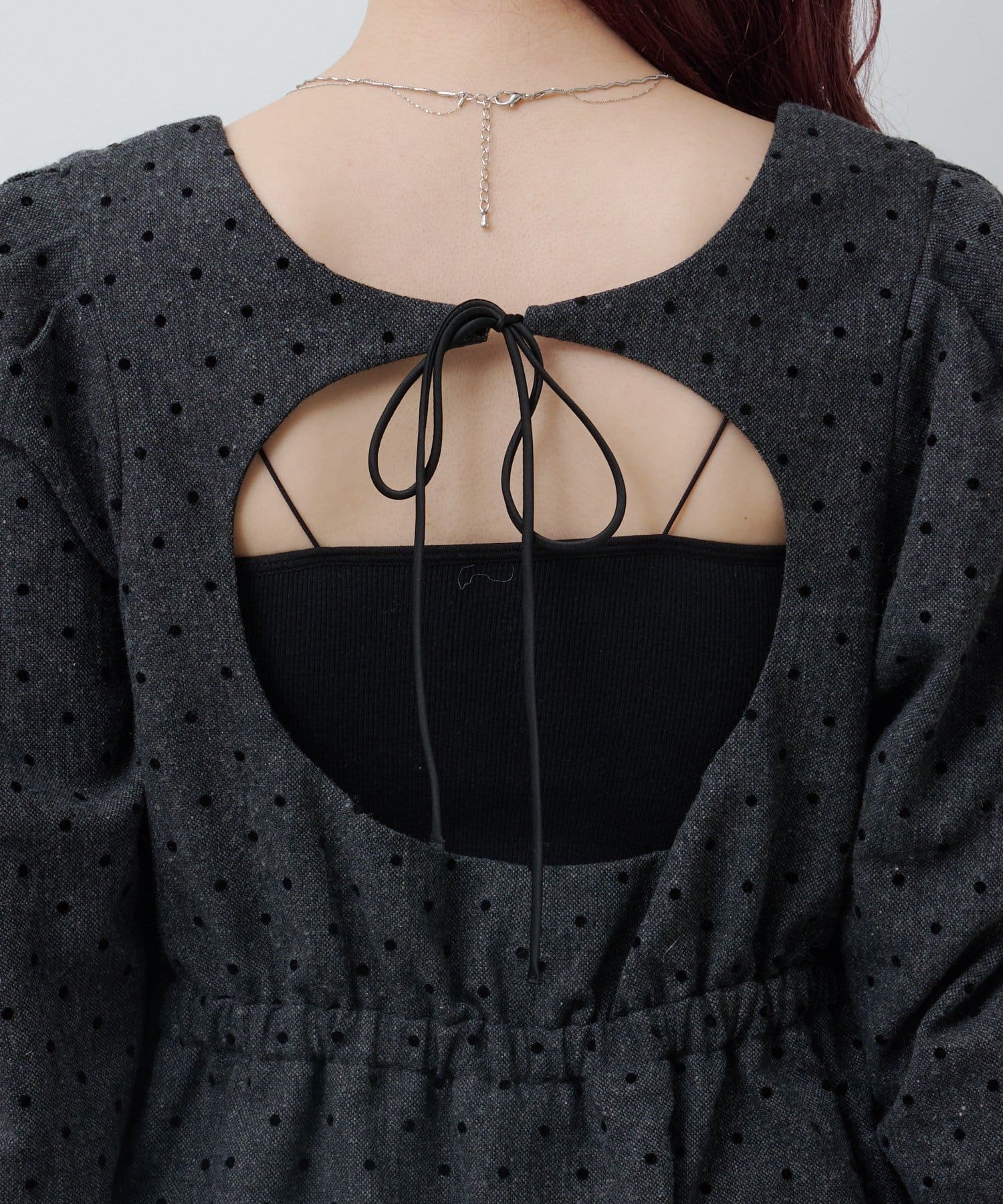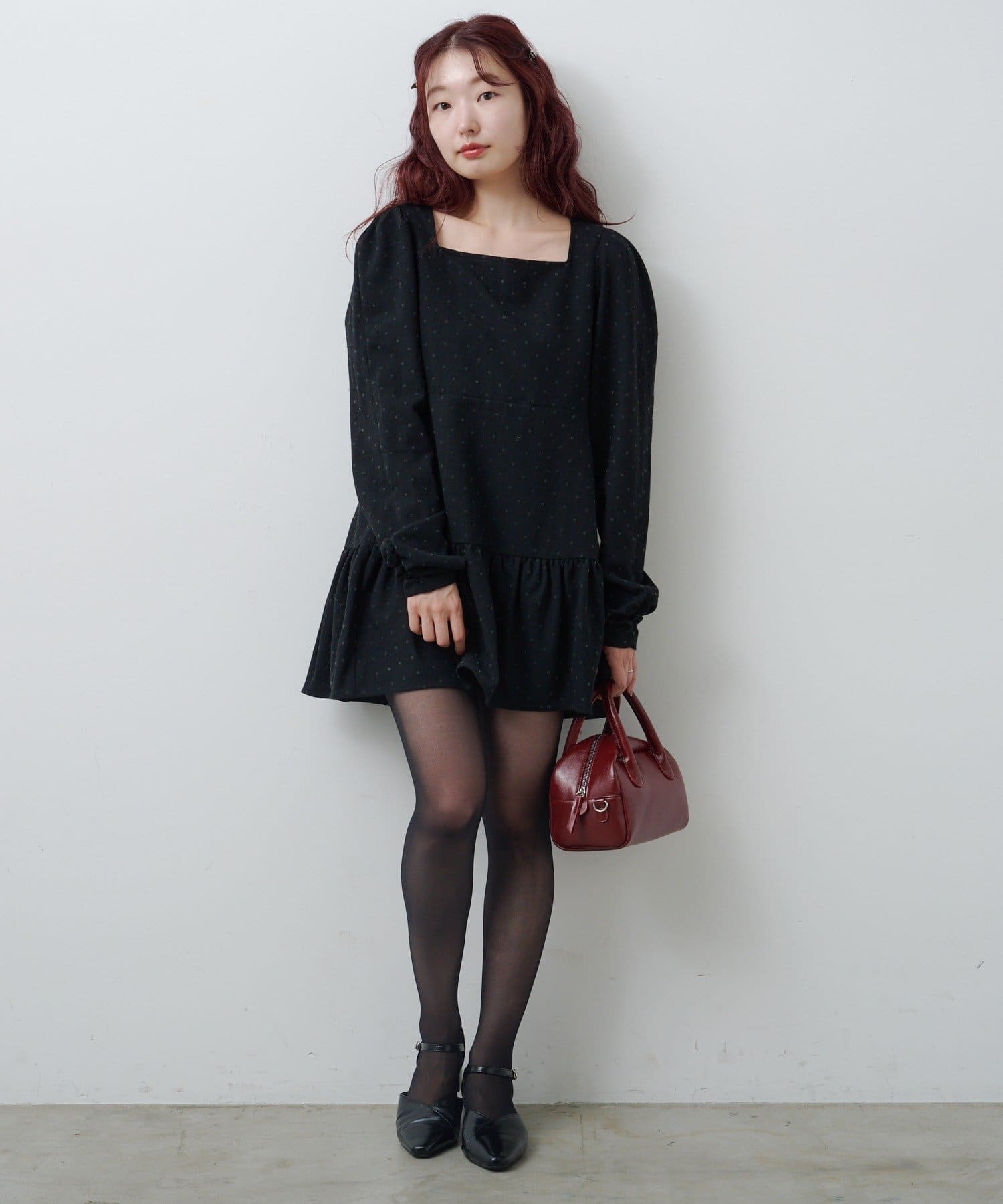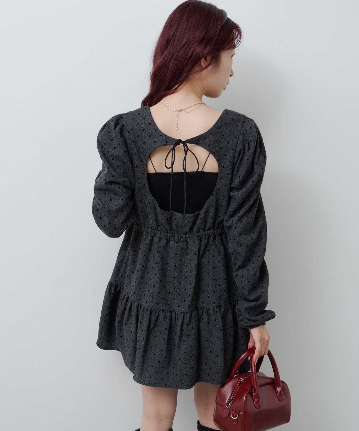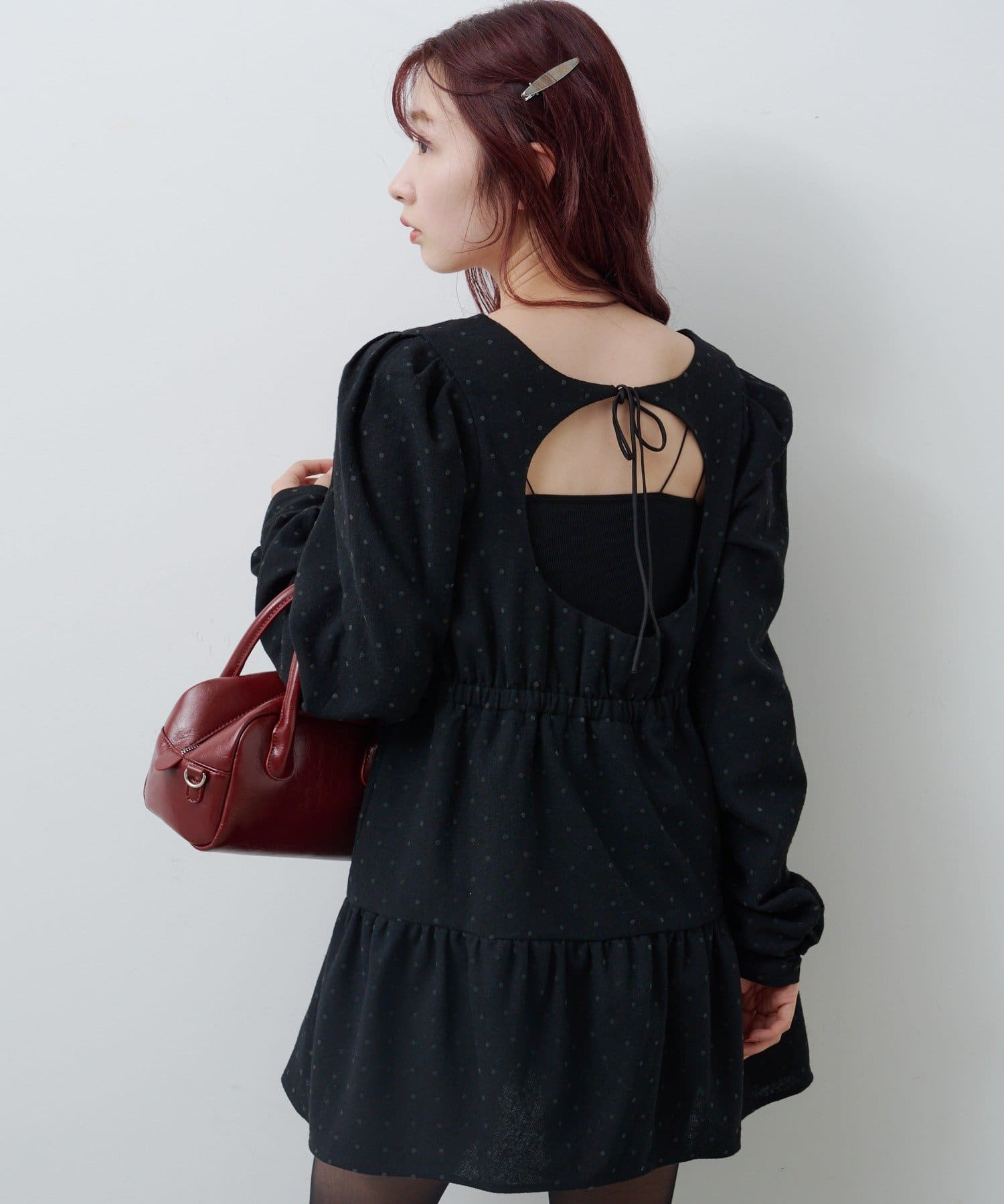 ふんわり袖と切り替えフレアシルエットで女性らしさを引き立てます。