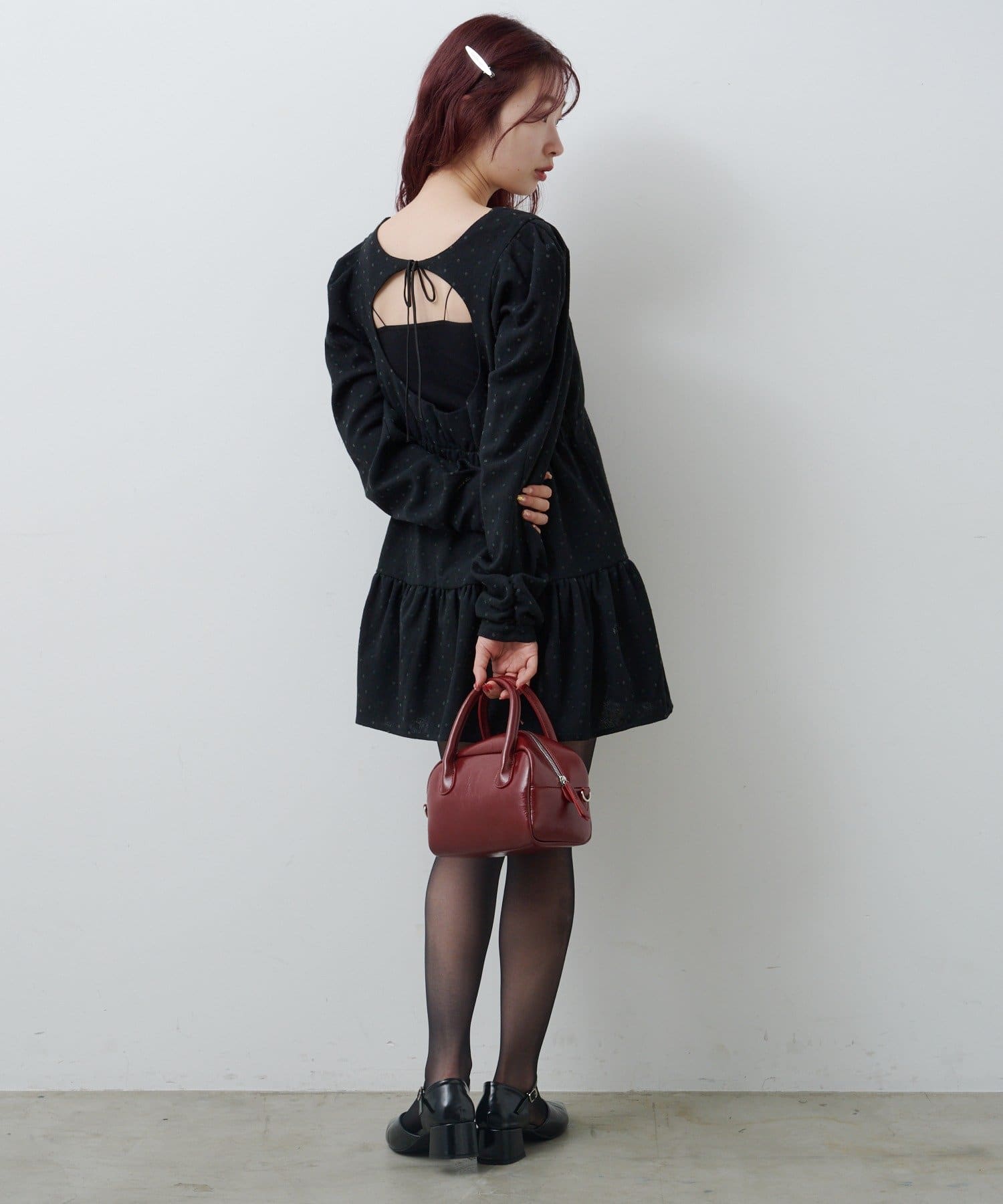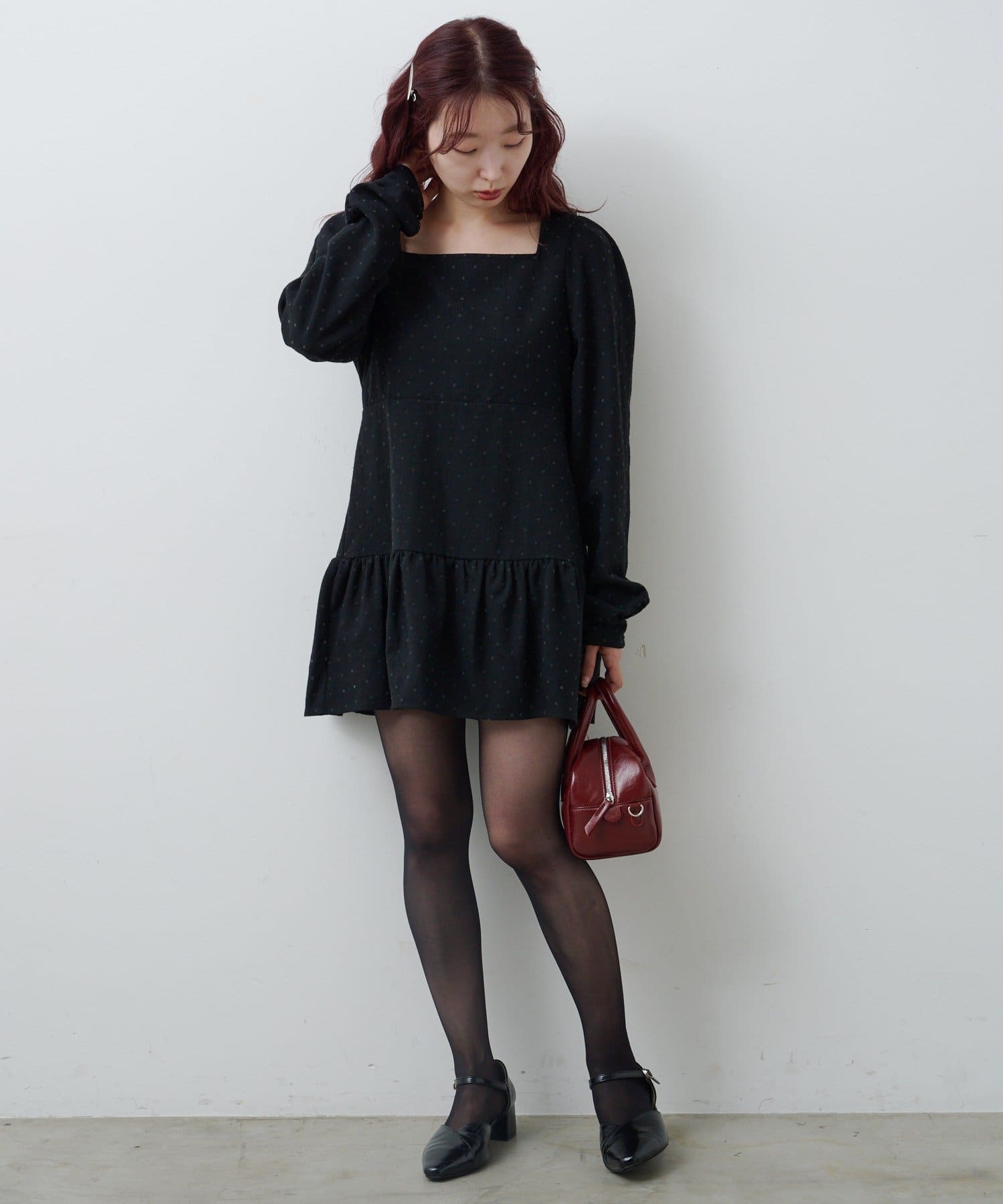 タイツやバッグでカラーを差して、こなれた秋冬スタイルに仕上げるのもおすすめ。