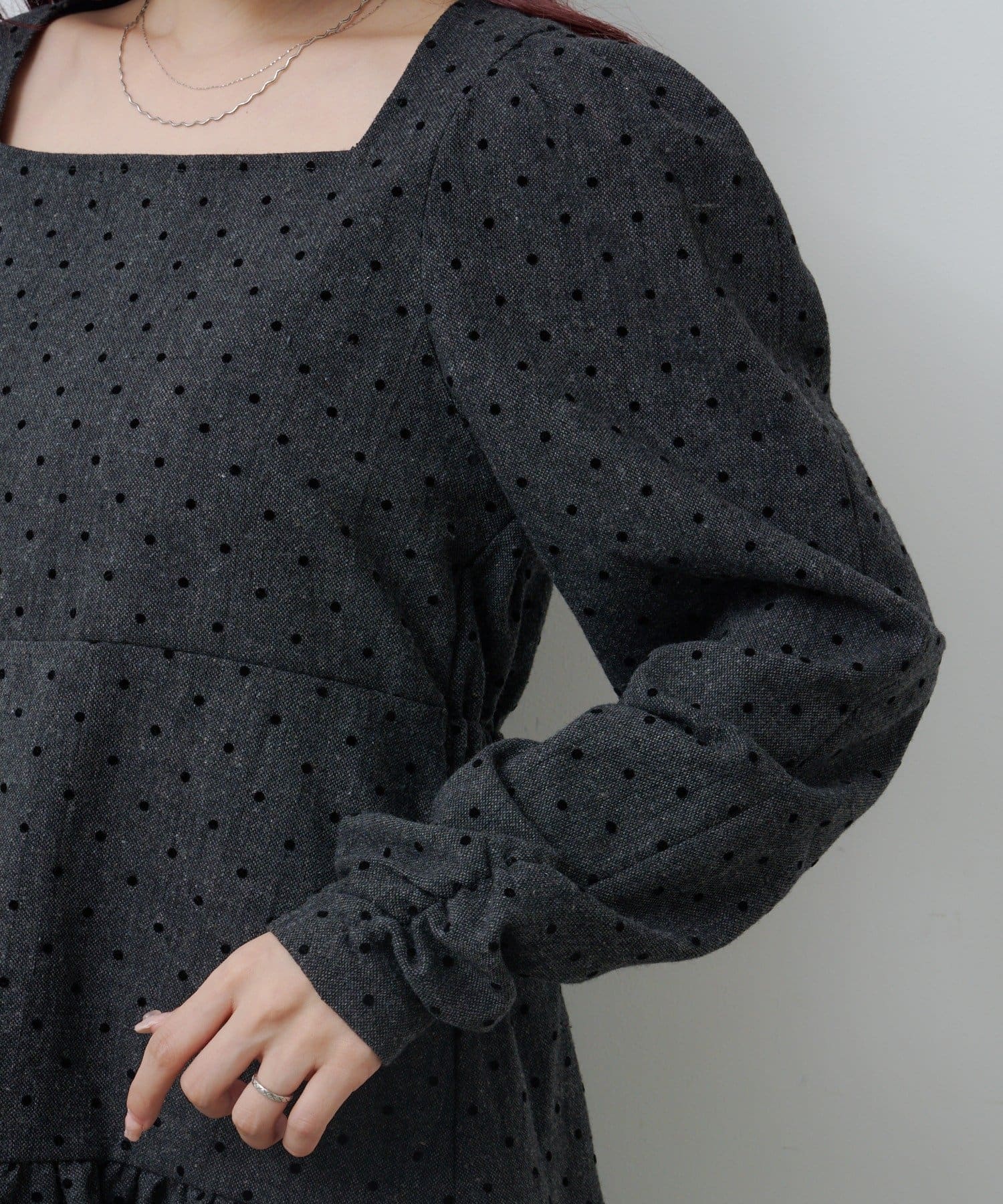 すっきりとしたスクエアネックがデコルテを美しく見せ、