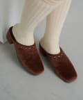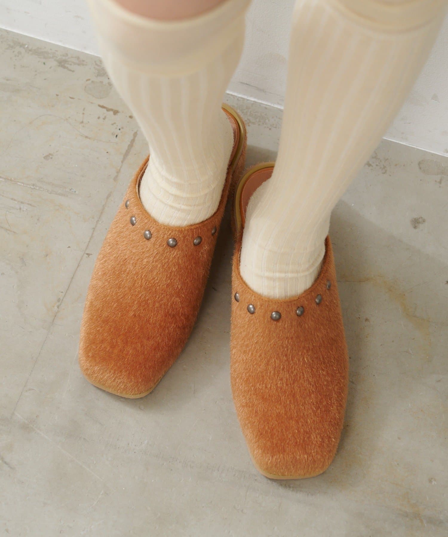 ふんわりとしたハラコ素材に、きらりと光るラウンドスタッズを添えたミュール