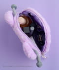 淡いパープルのファーに包まれたまんまるフォルムが可愛く、ジップを開けると中は整理しやすい広めのスペース。
