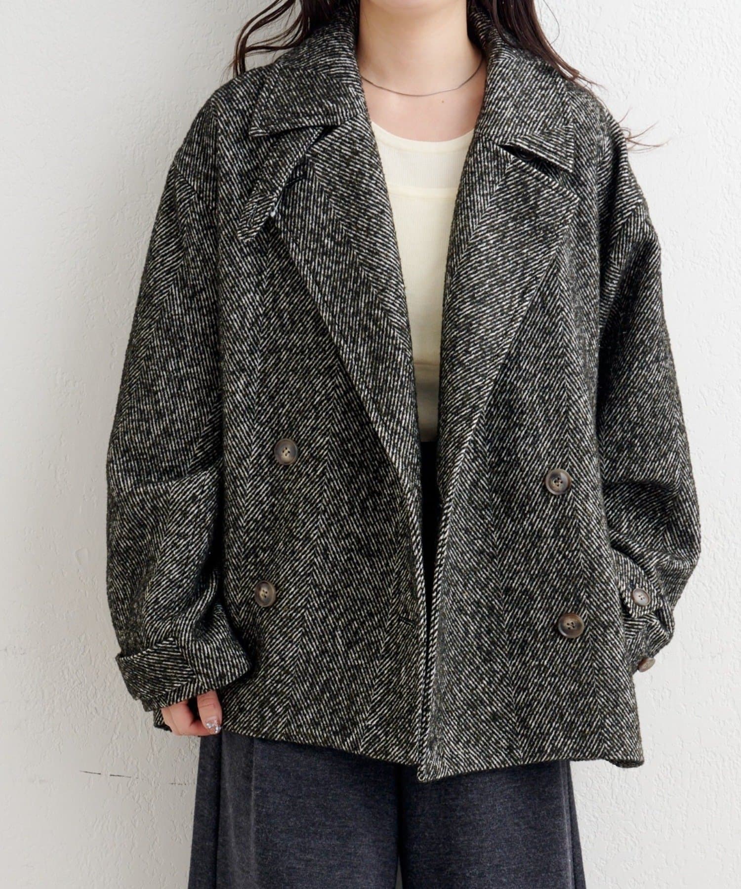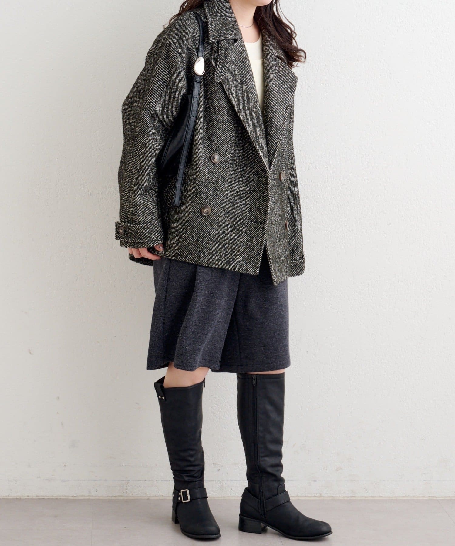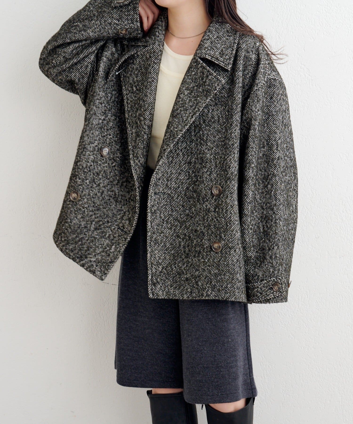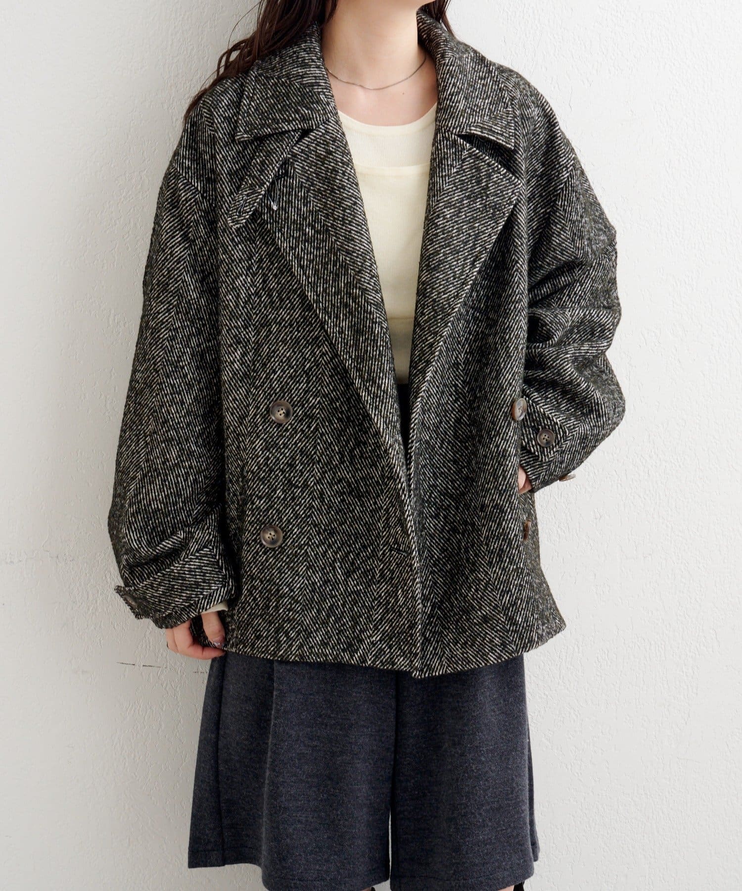 しっかりとしたツイード調の生地で高見えし、ゆとりのある身幅がインナーを選ばずロングシーズン活躍。