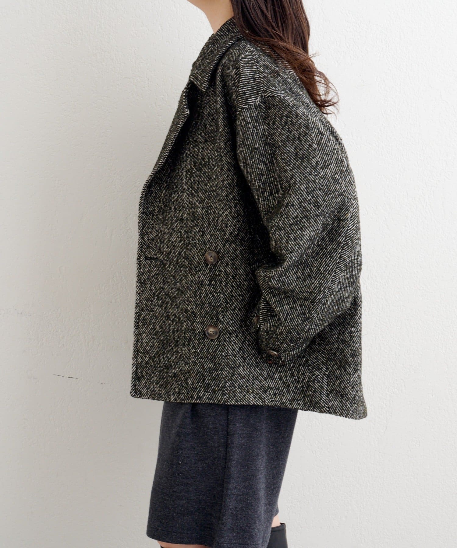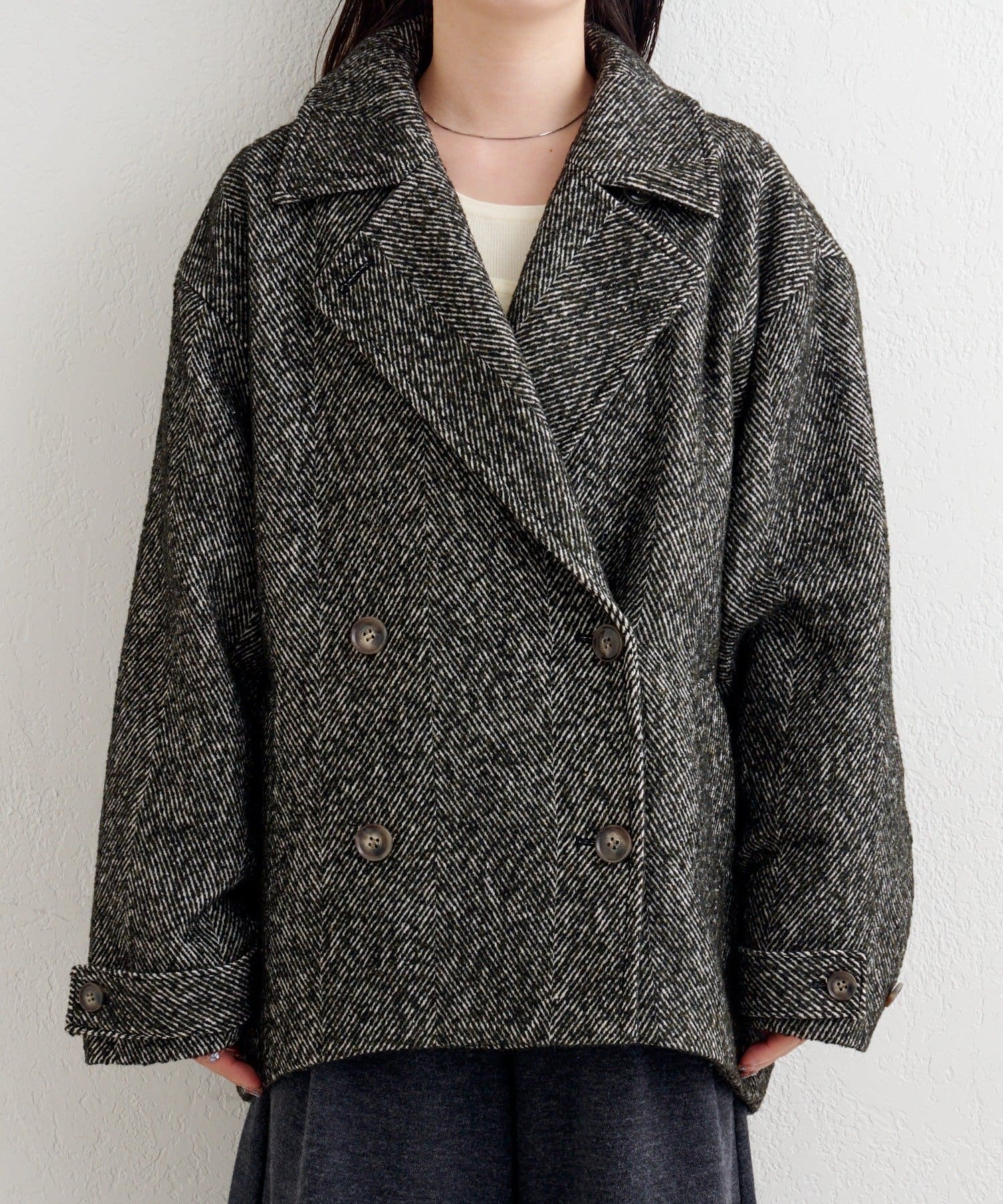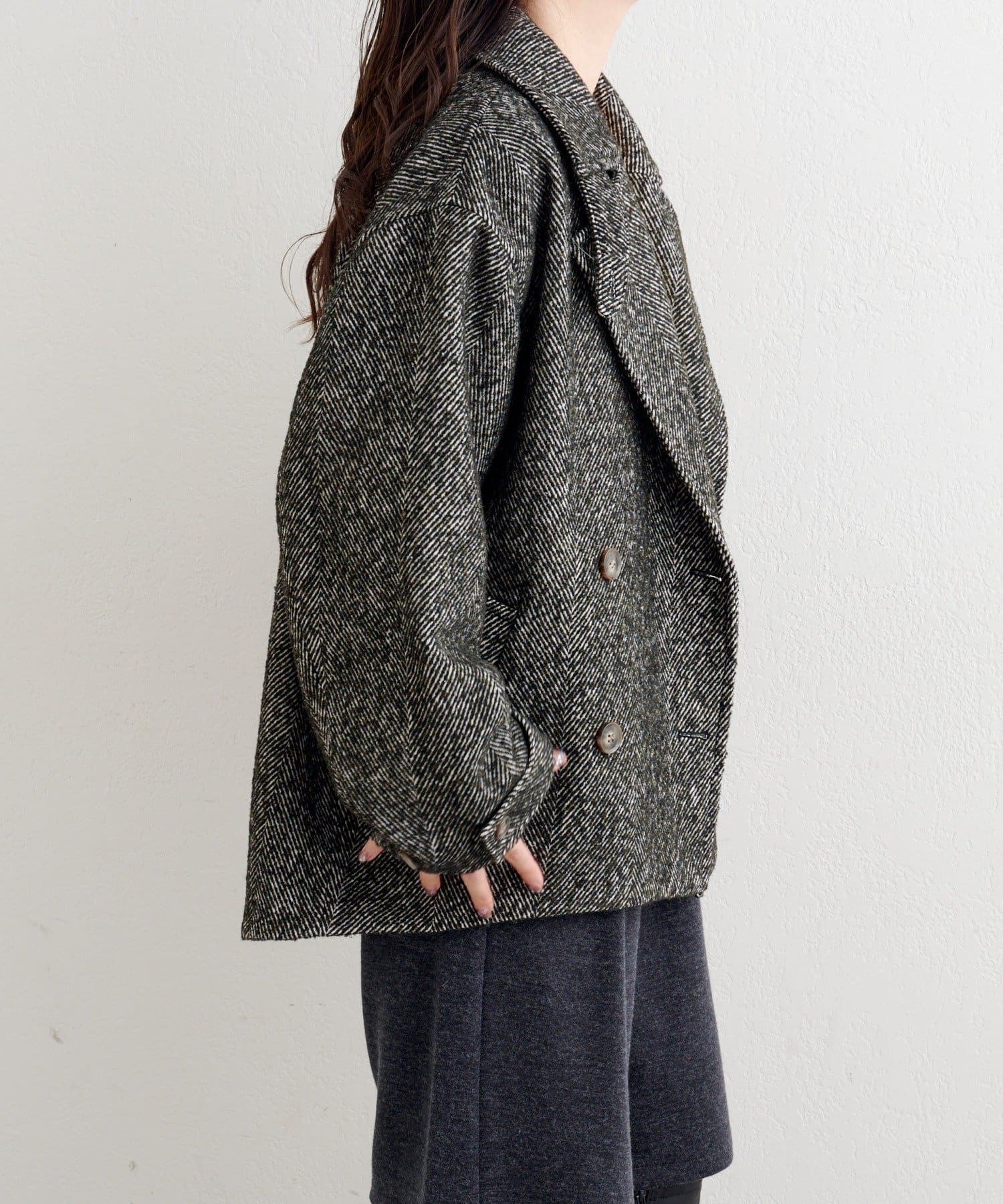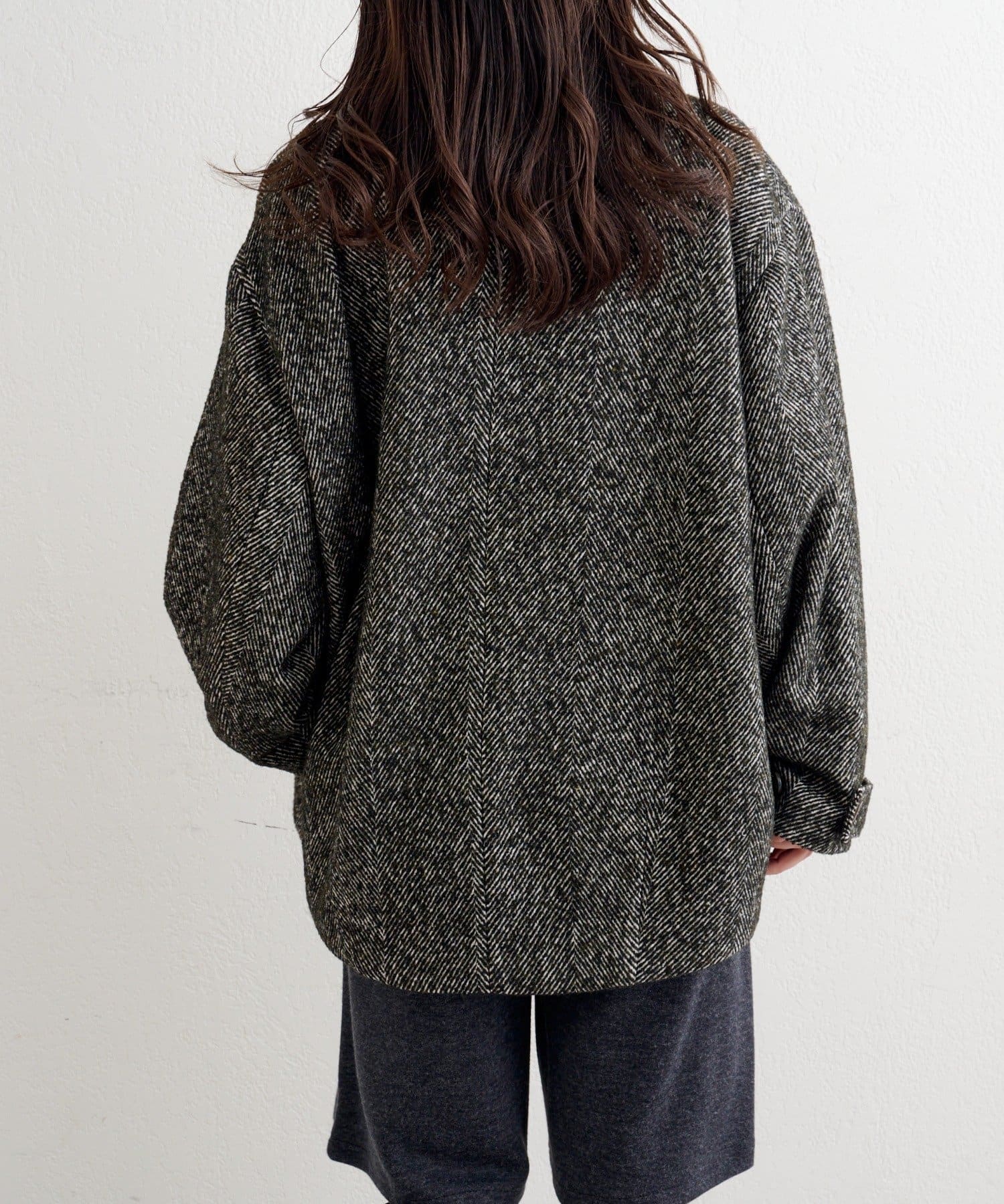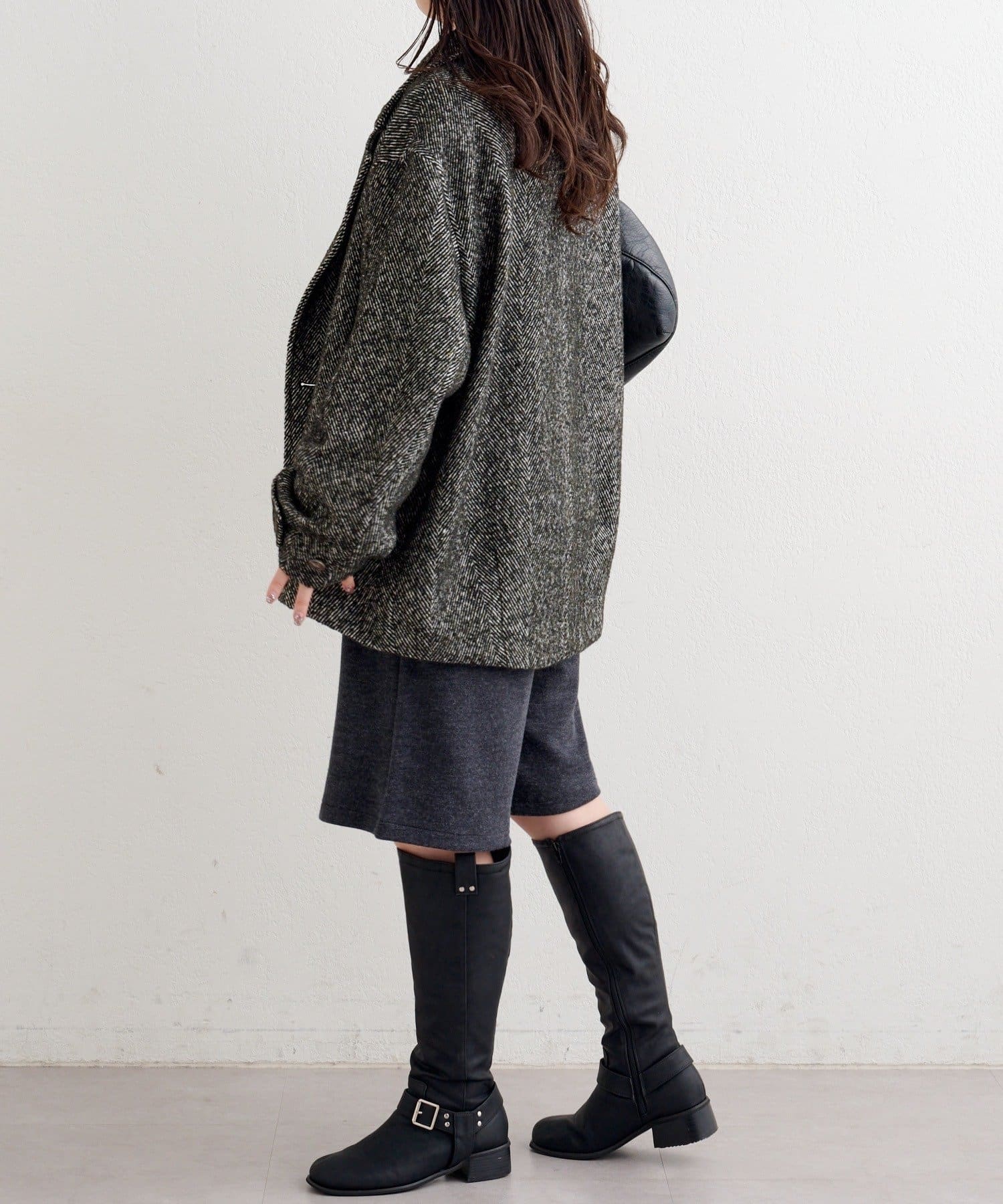 しっかりとしたツイード調の生地で高見えし、ゆとりのある身幅がインナーを選ばずロングシーズン活躍。