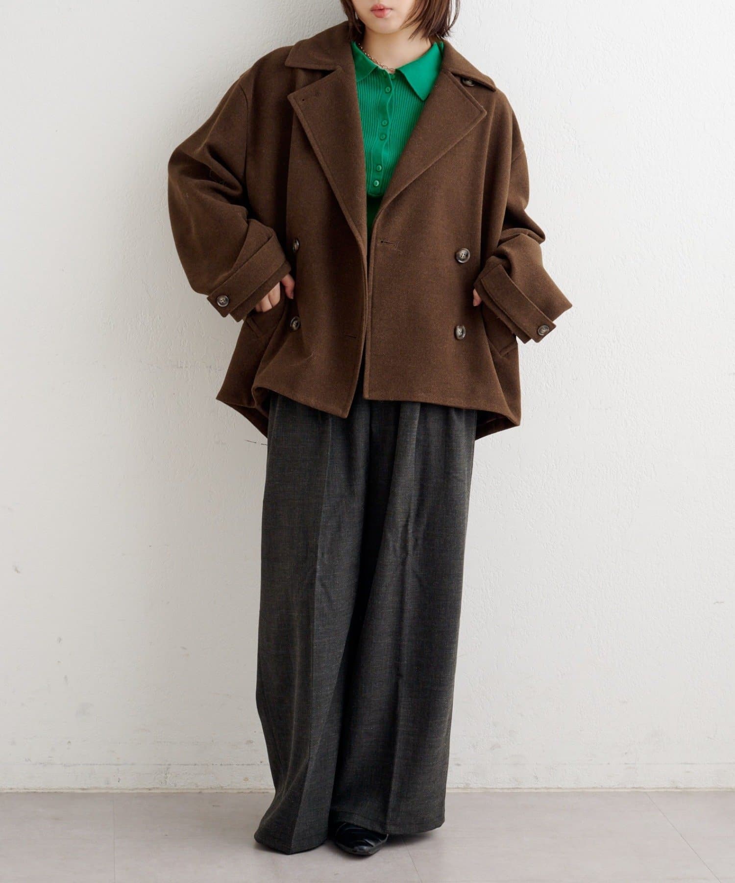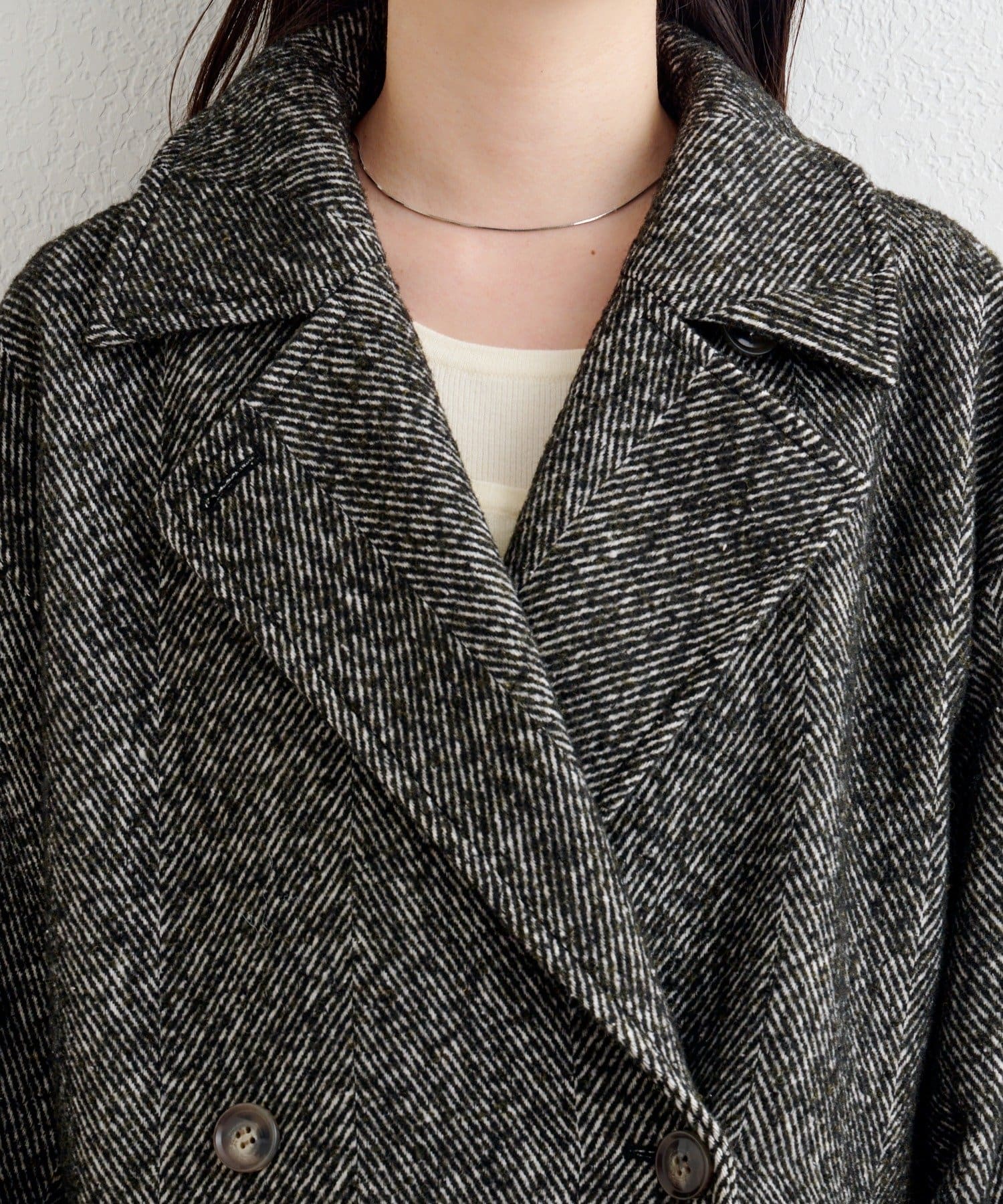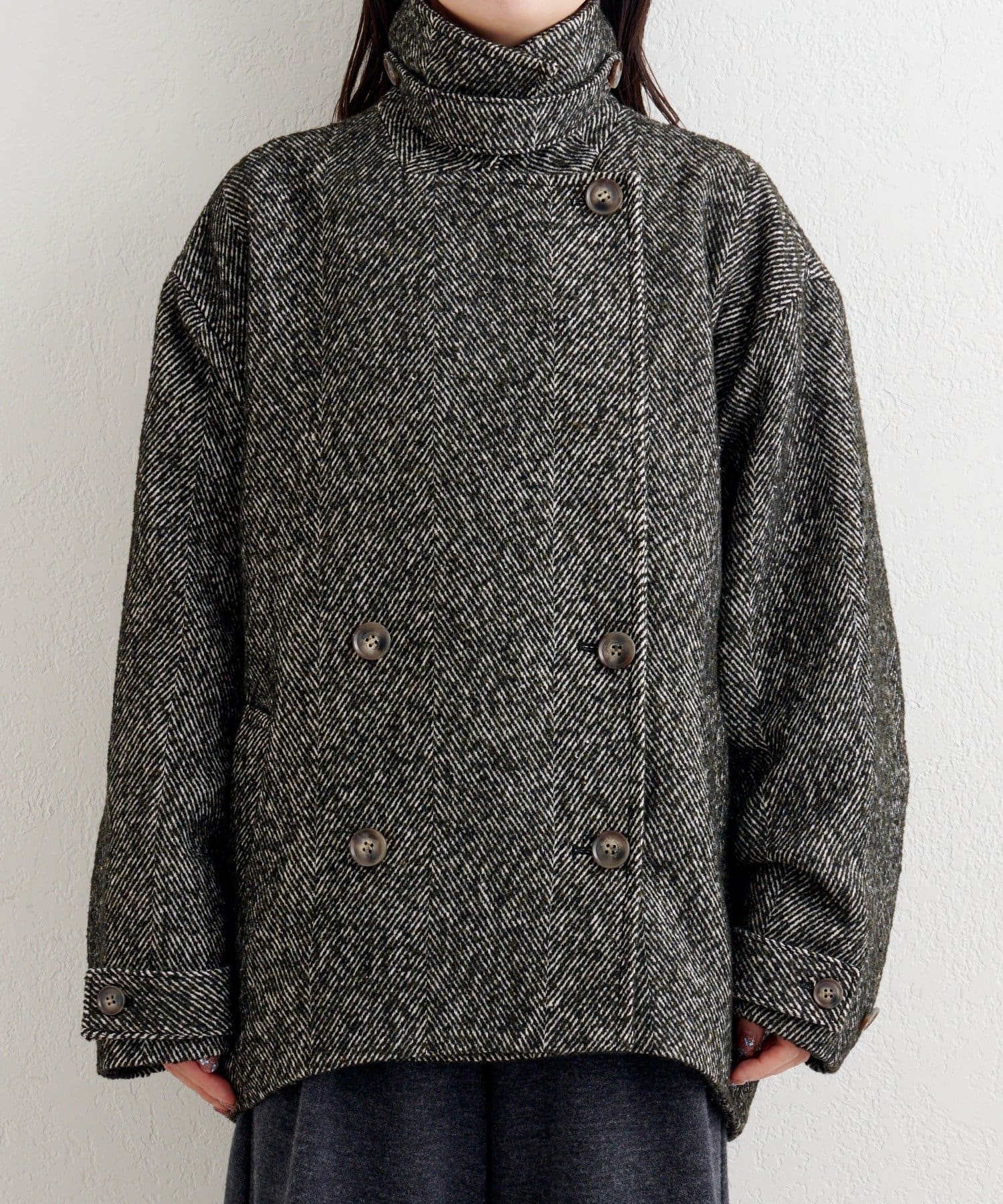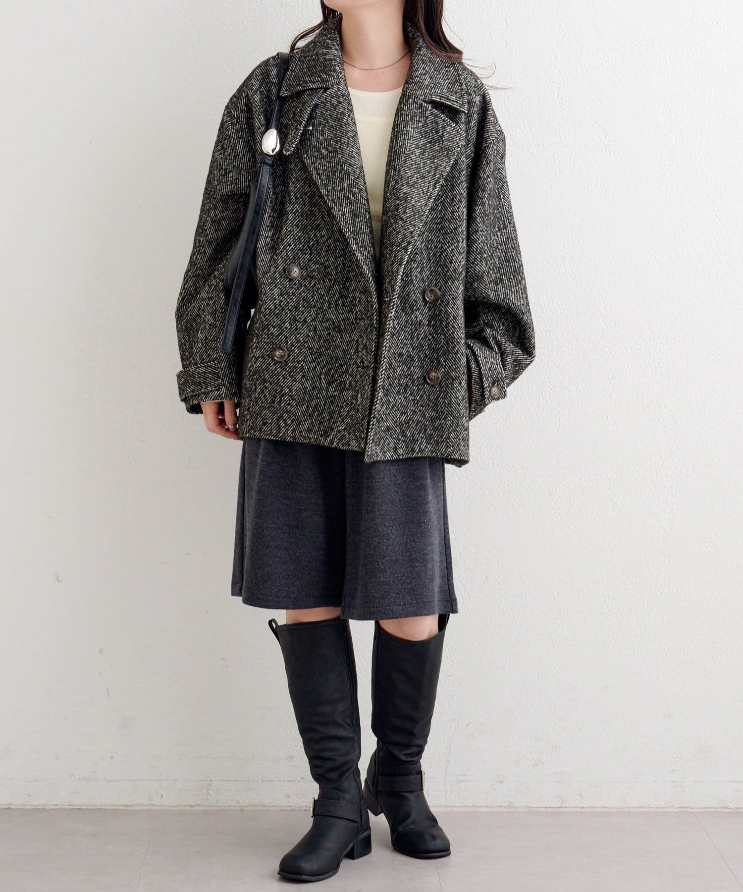 しっかりとしたツイード調の生地で高見えし、ゆとりのある身幅がインナーを選ばずロングシーズン活躍。