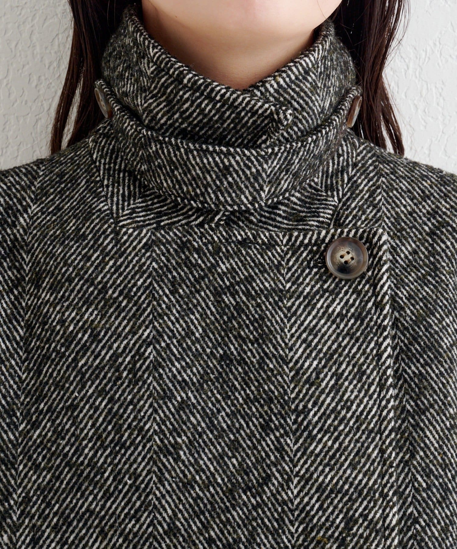 前を留めると衿が立ち上がるデザインで、風避けにもなりつつ一気にモードな印象に。