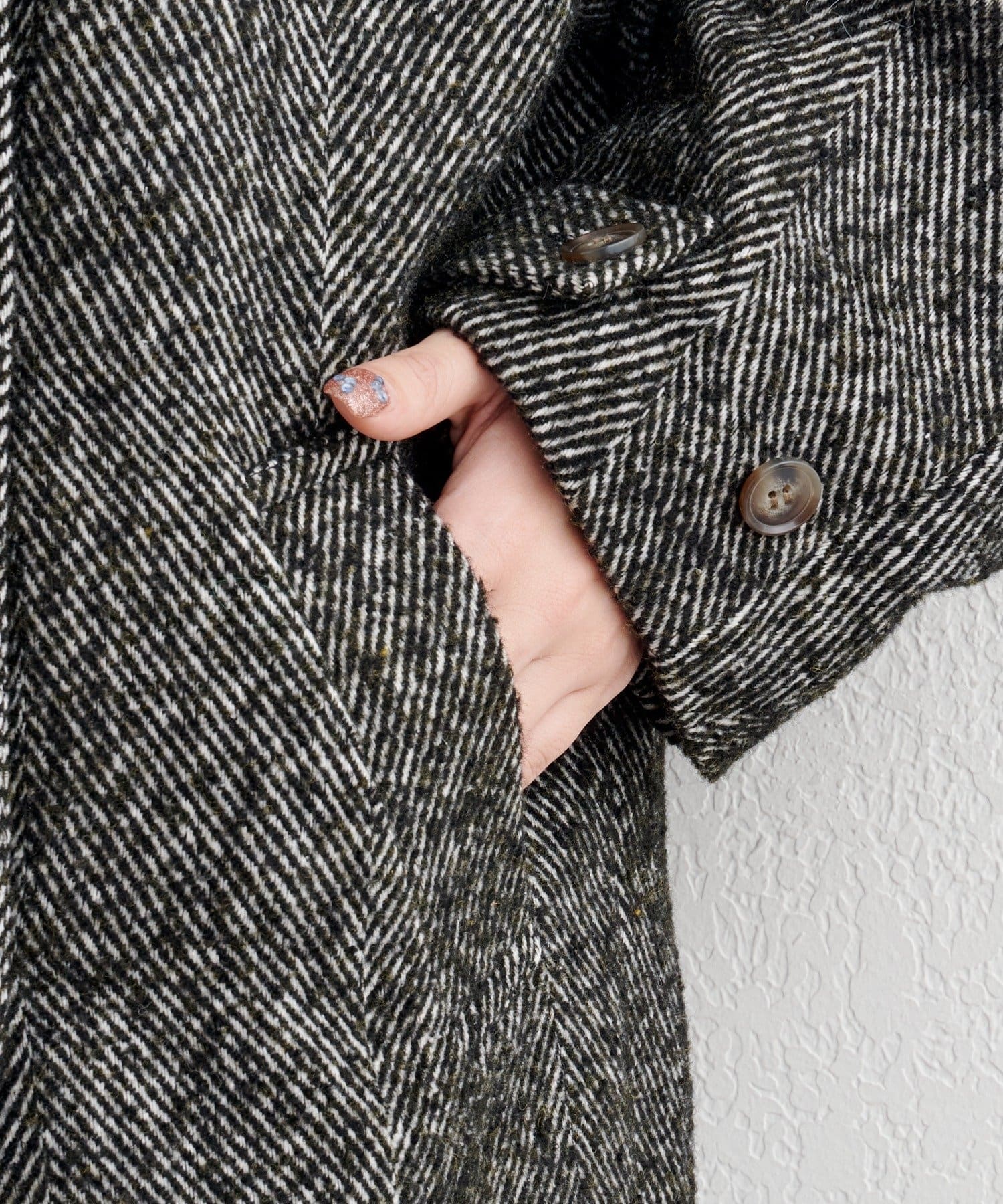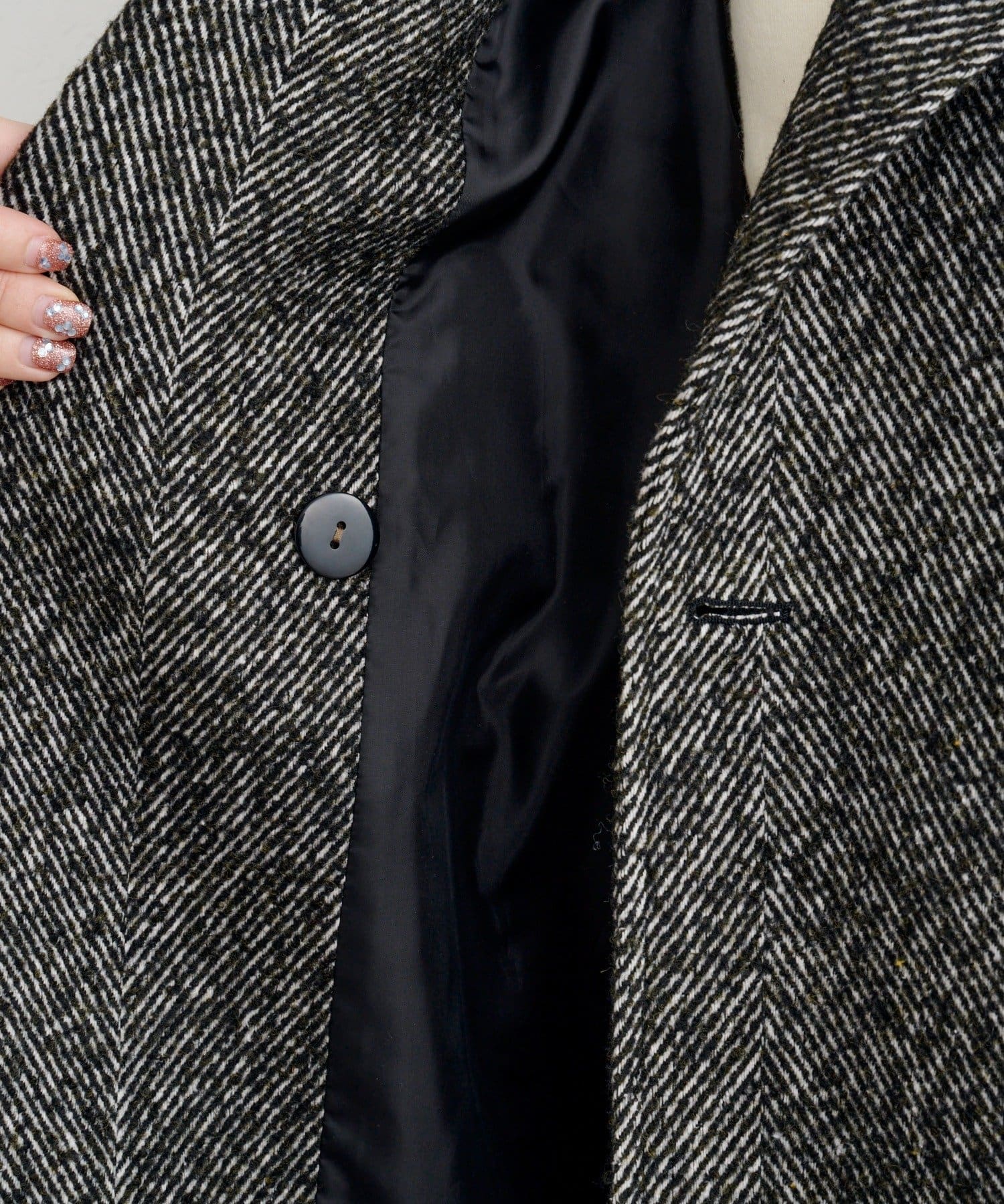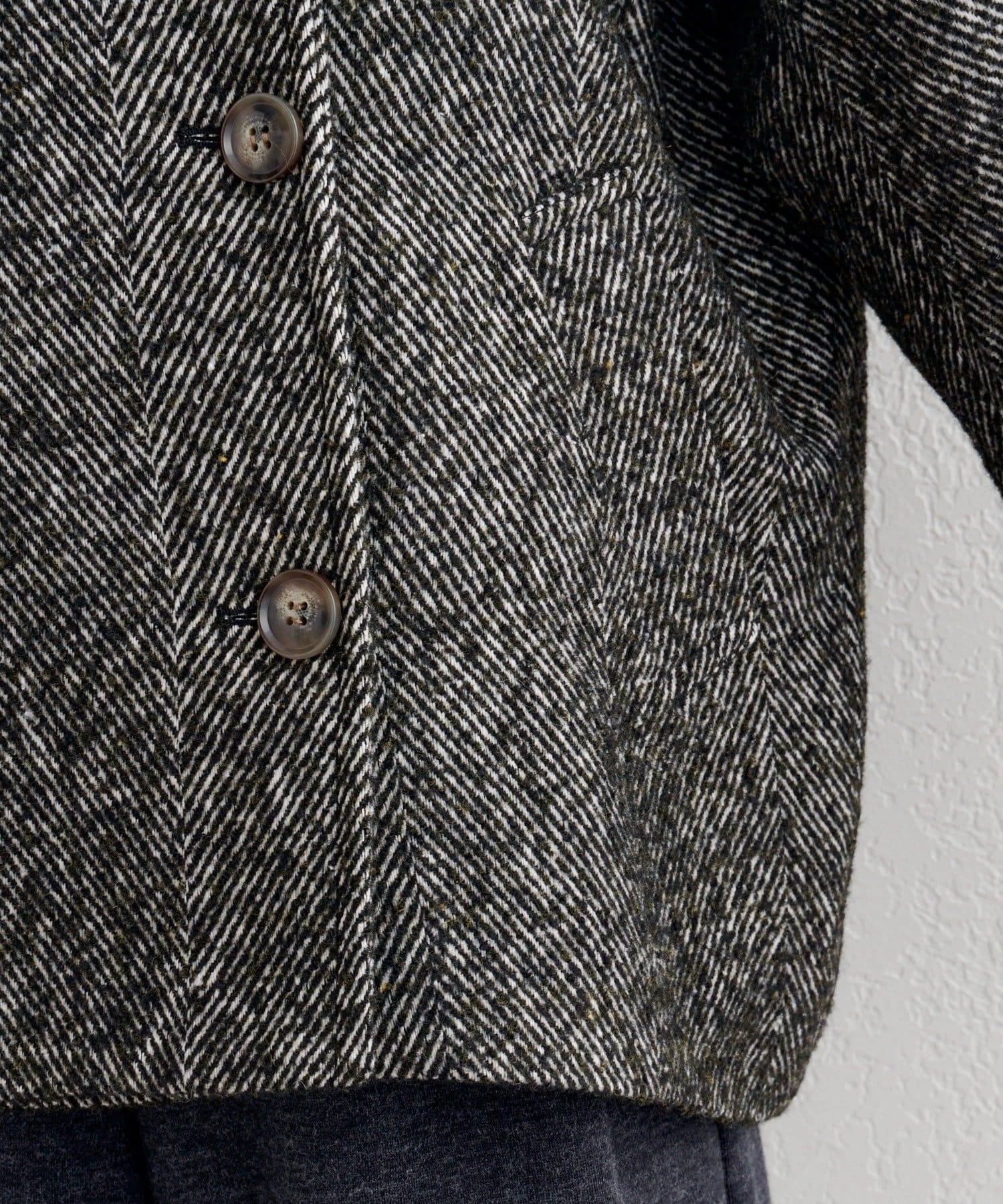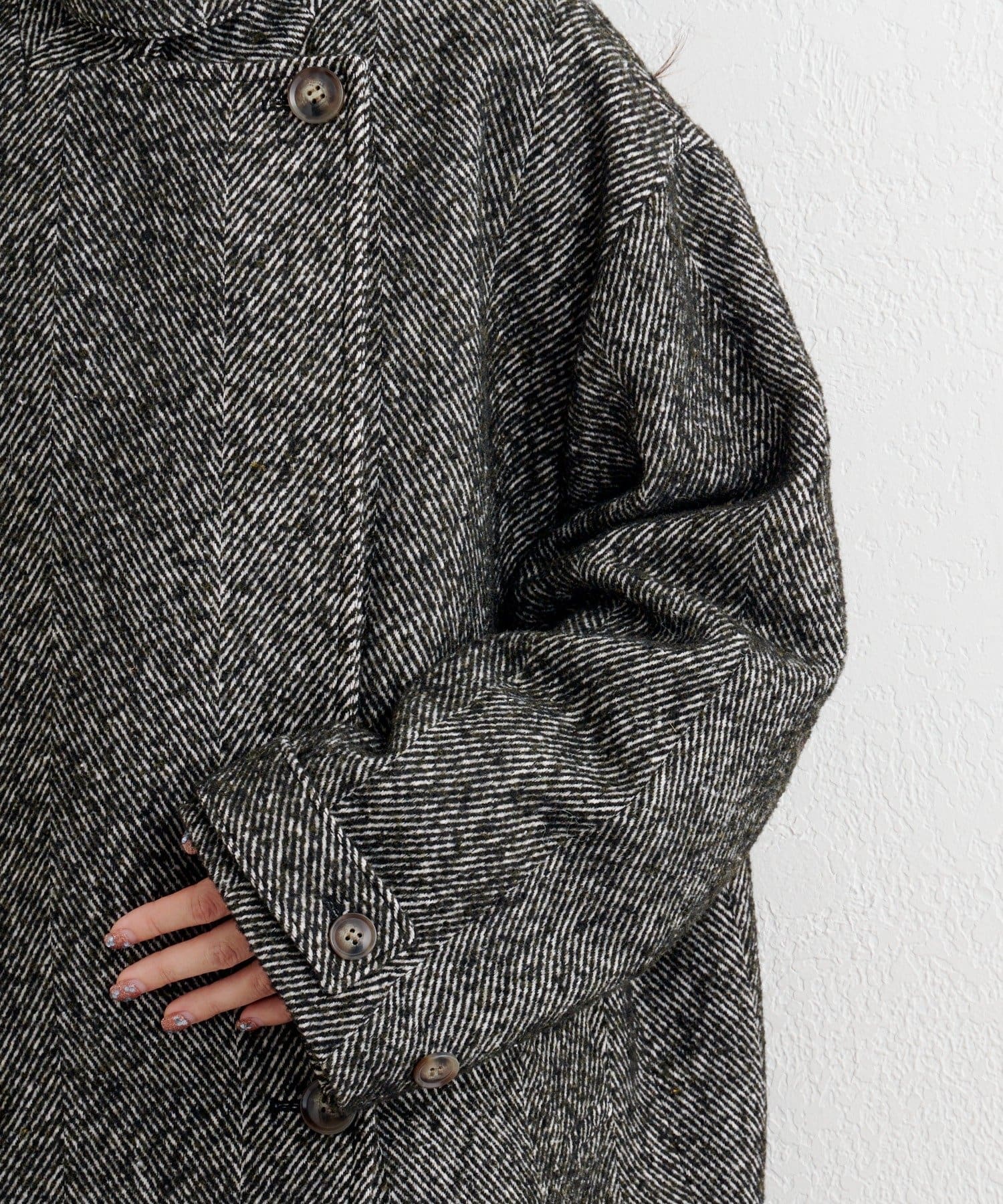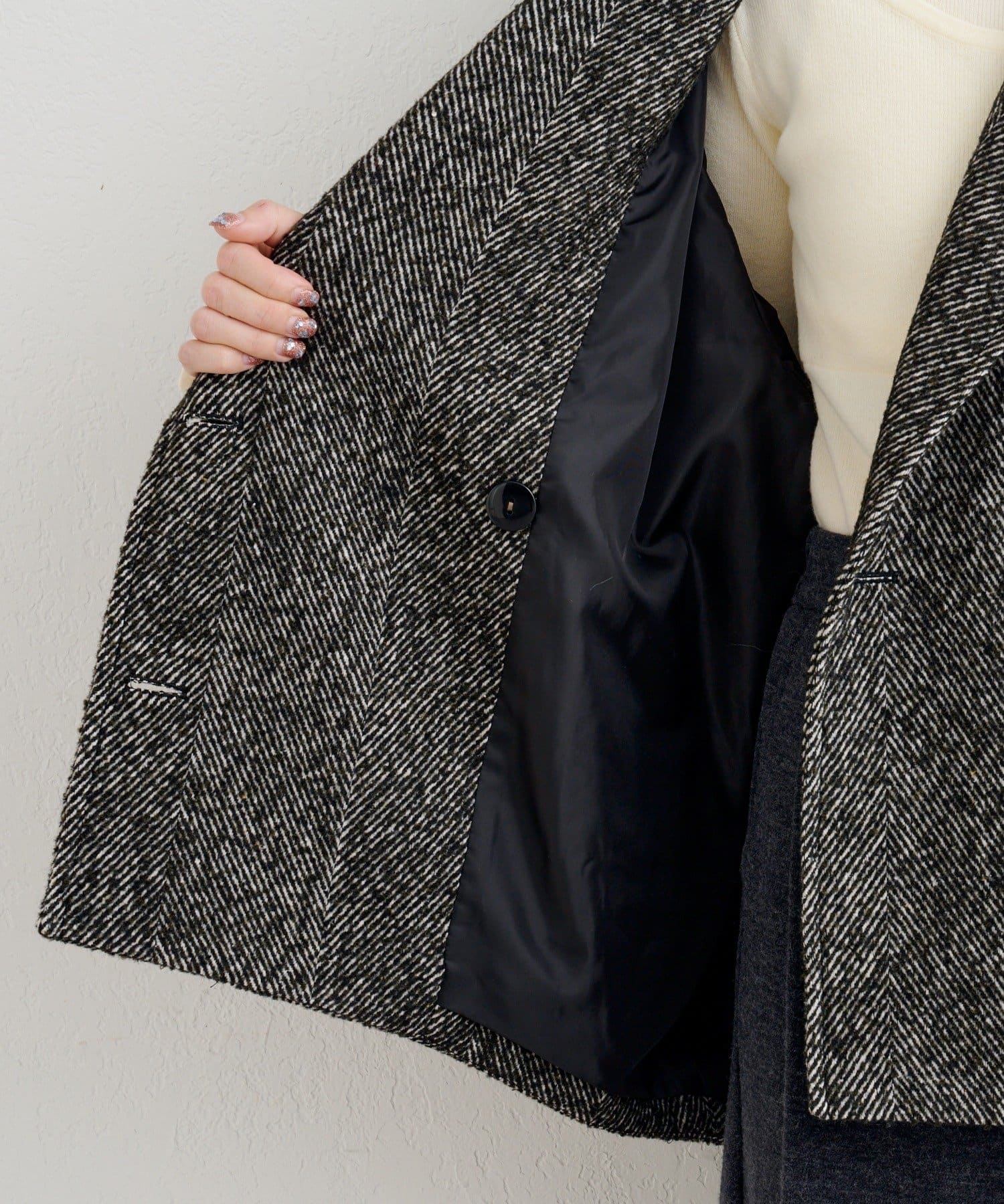 ほどよい厚みのあるツイード調素材で、細かなヘリンボーン柄が上品さを演出。