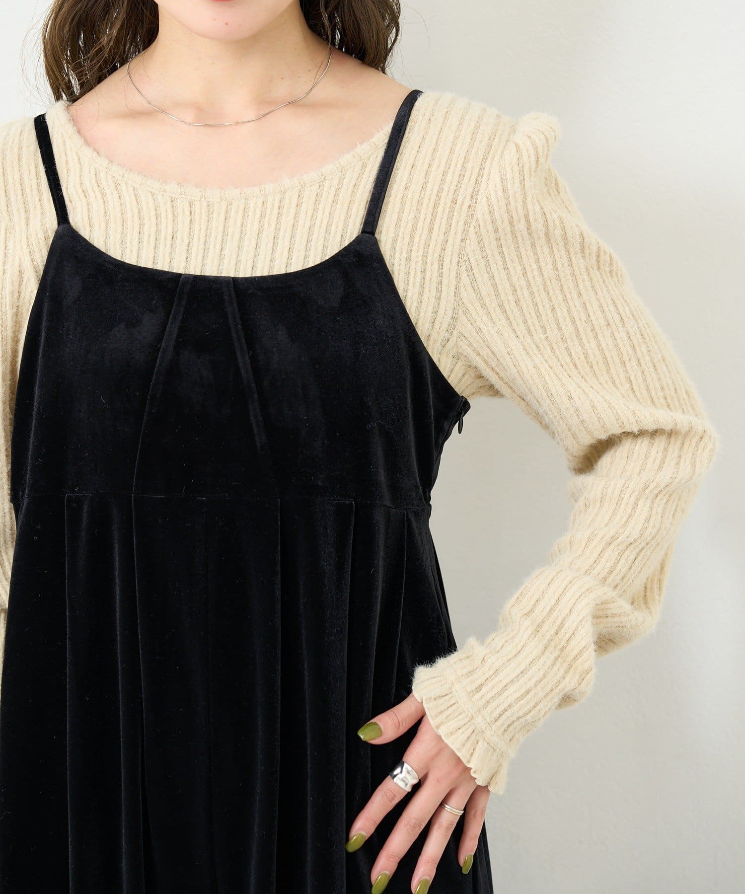 華奢な肩紐とゆったりとしたシルエットが女性らしさを引き立て、インナー次第でカジュアルにもきれいめにも着回せる一枚です。
