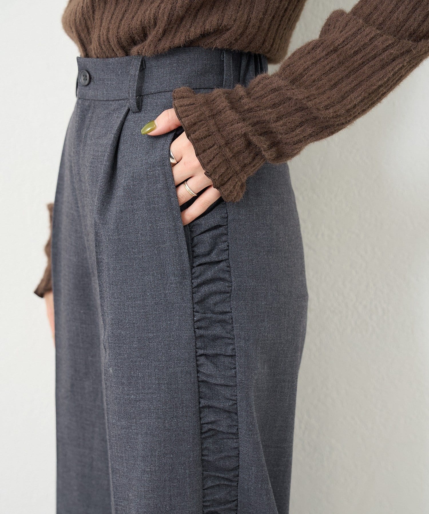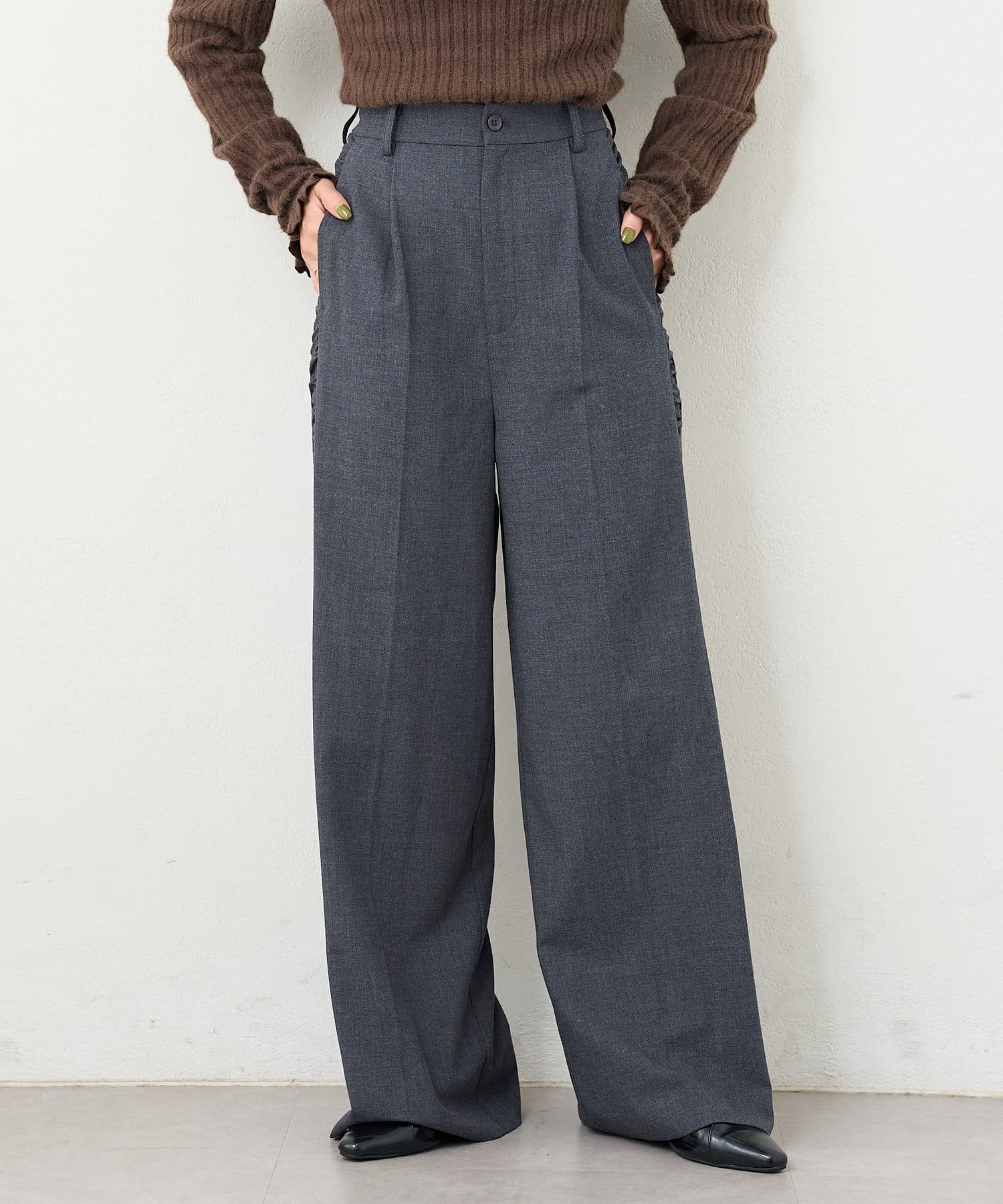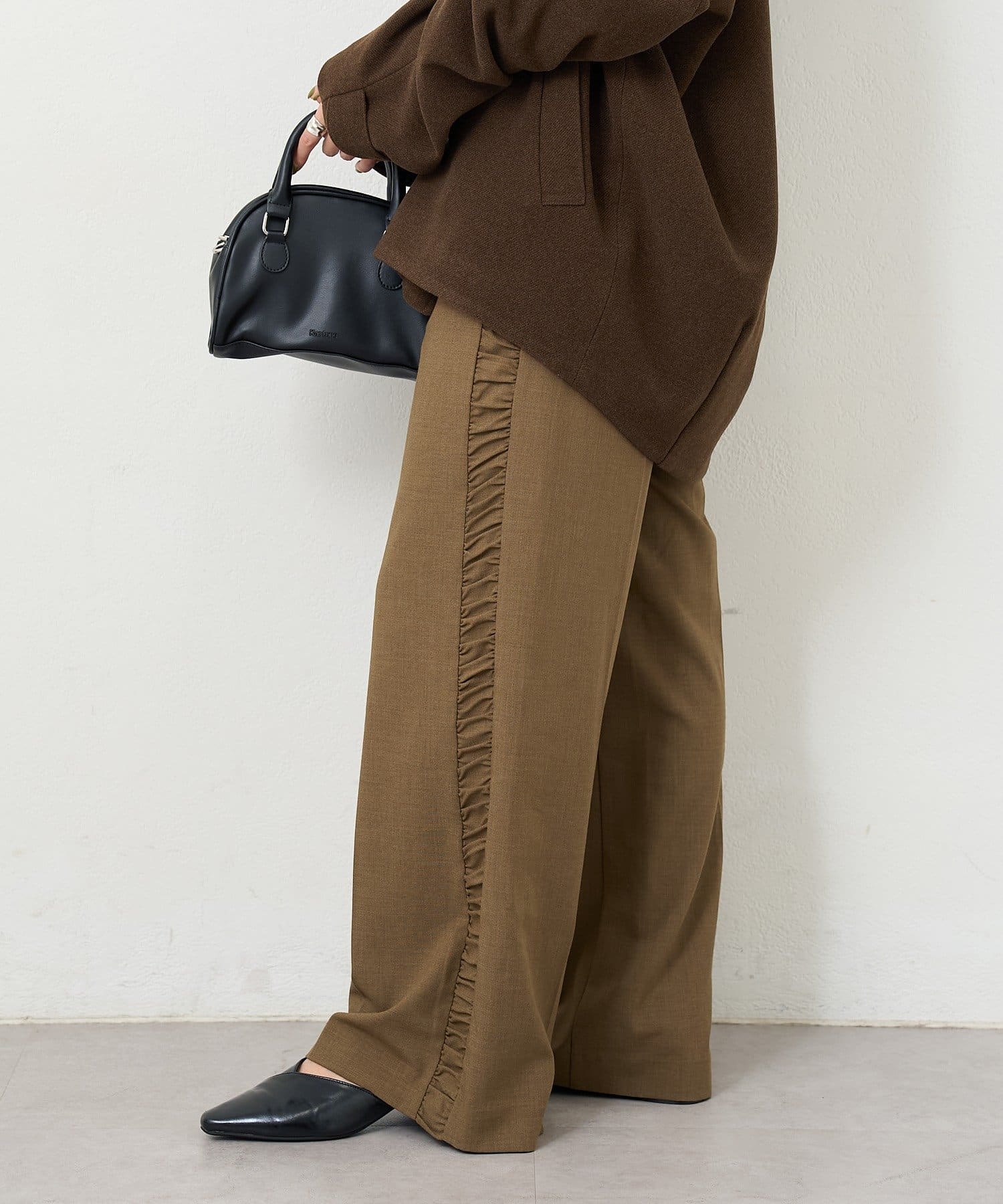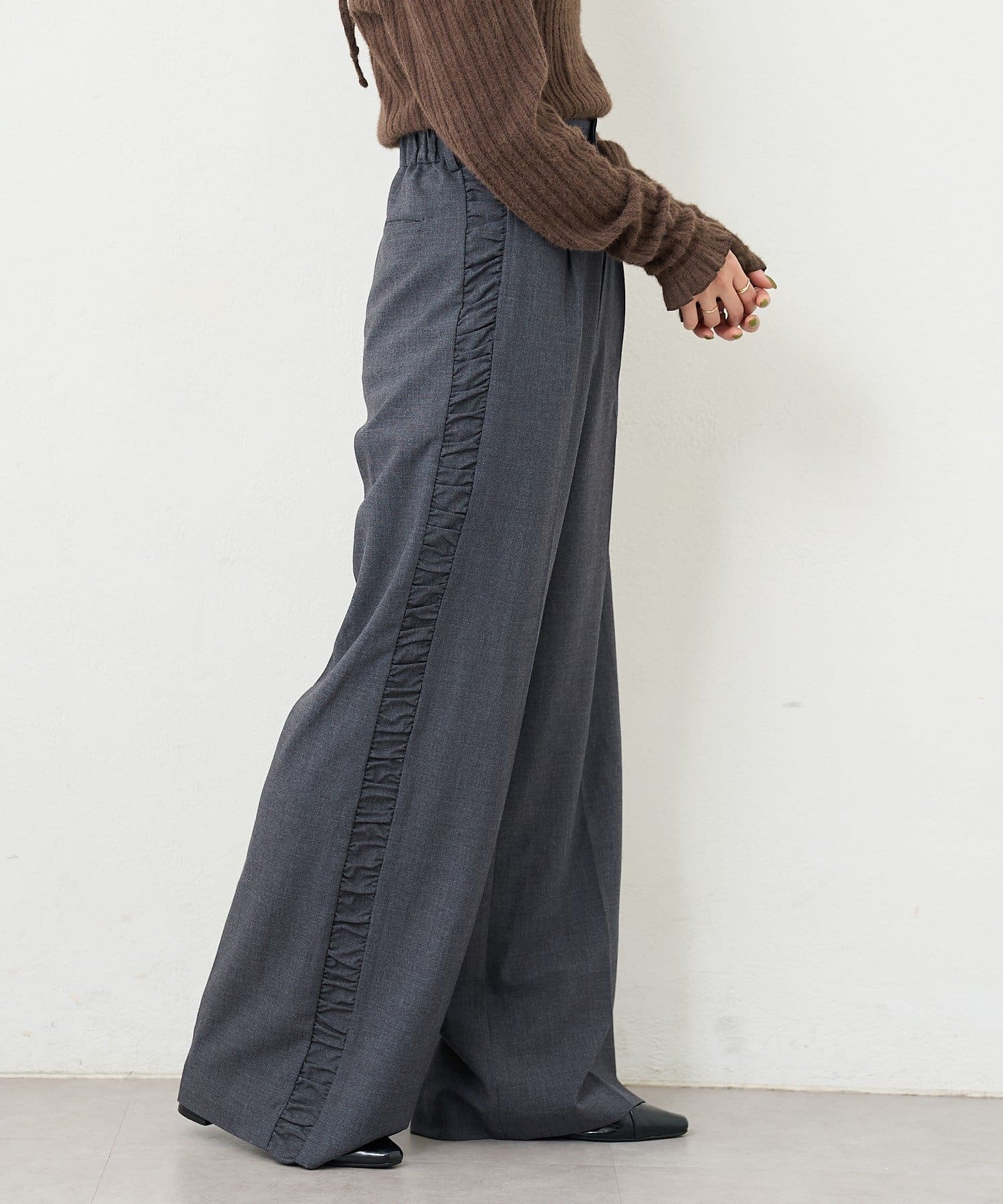 サイドに施されたシャーリングデザインがアクセントになったスラックス。