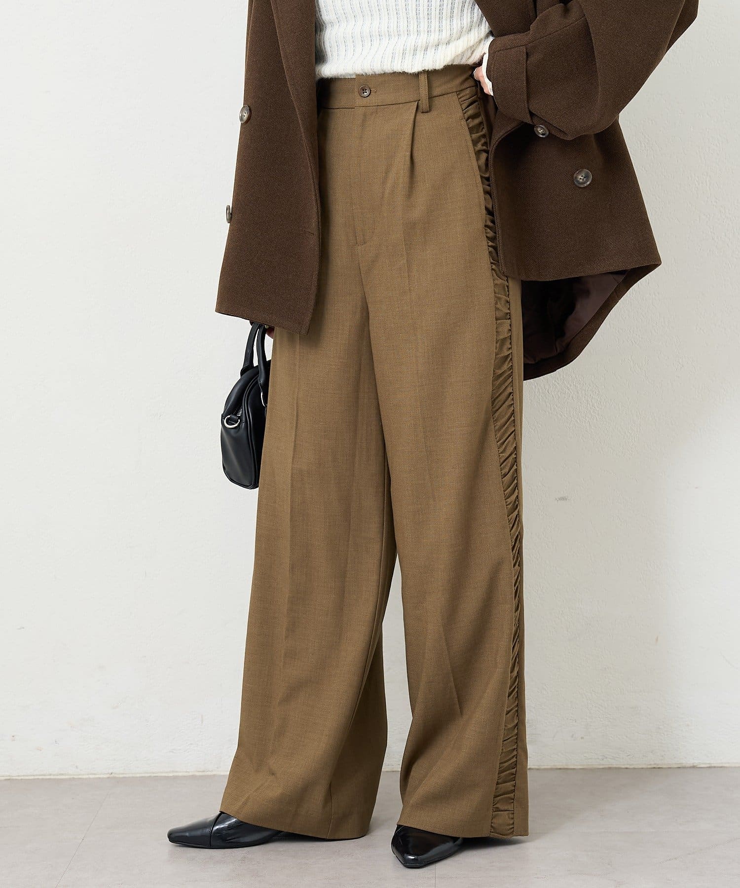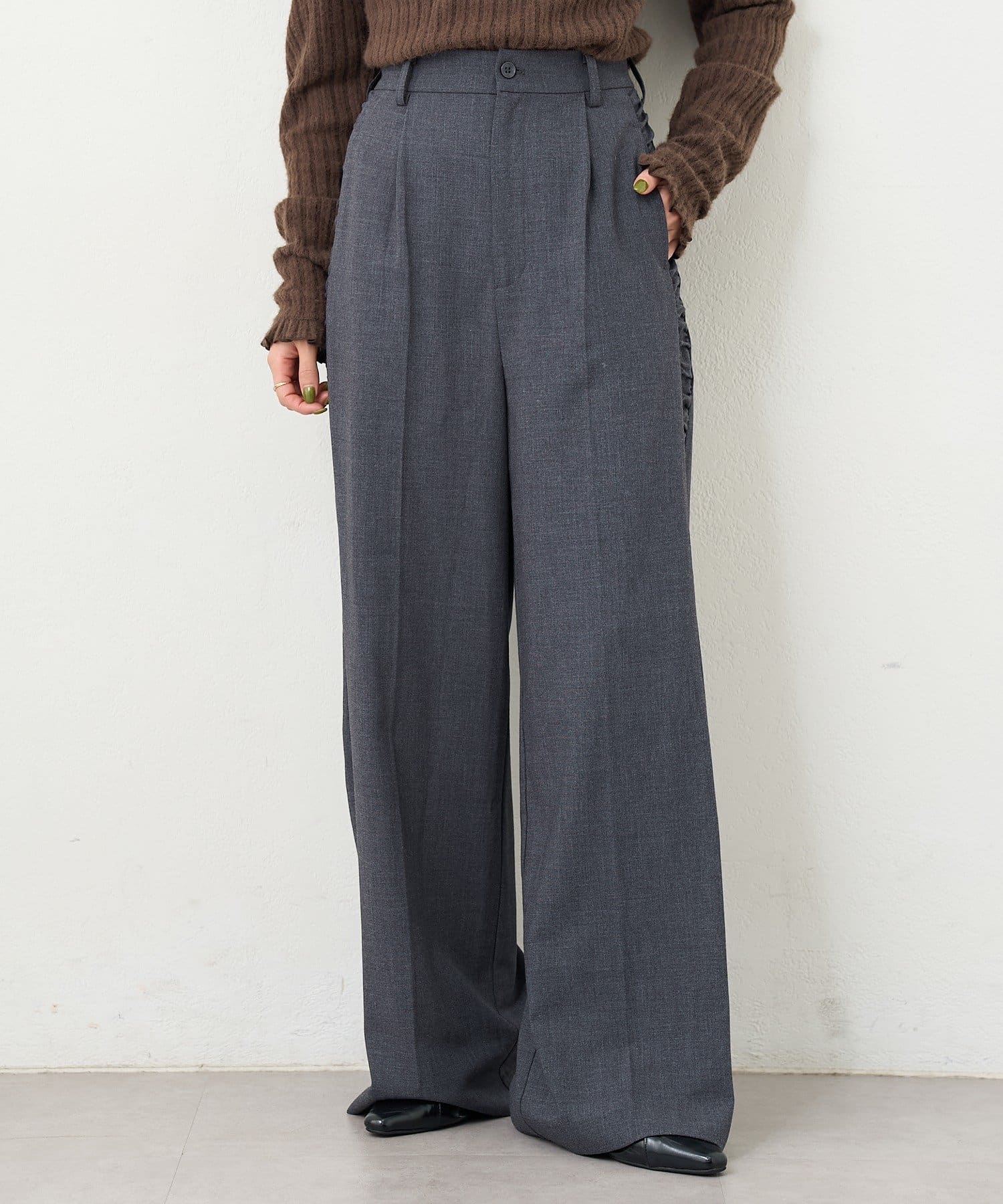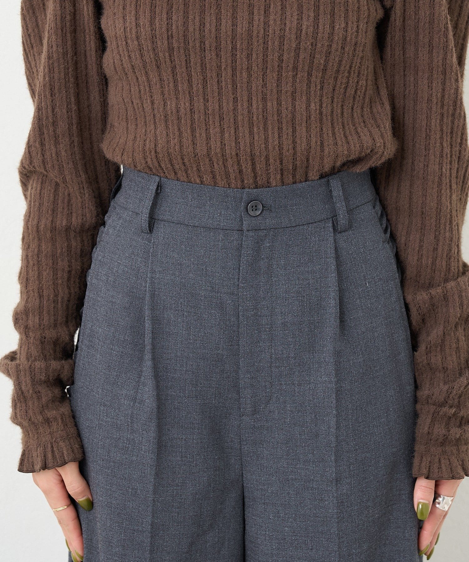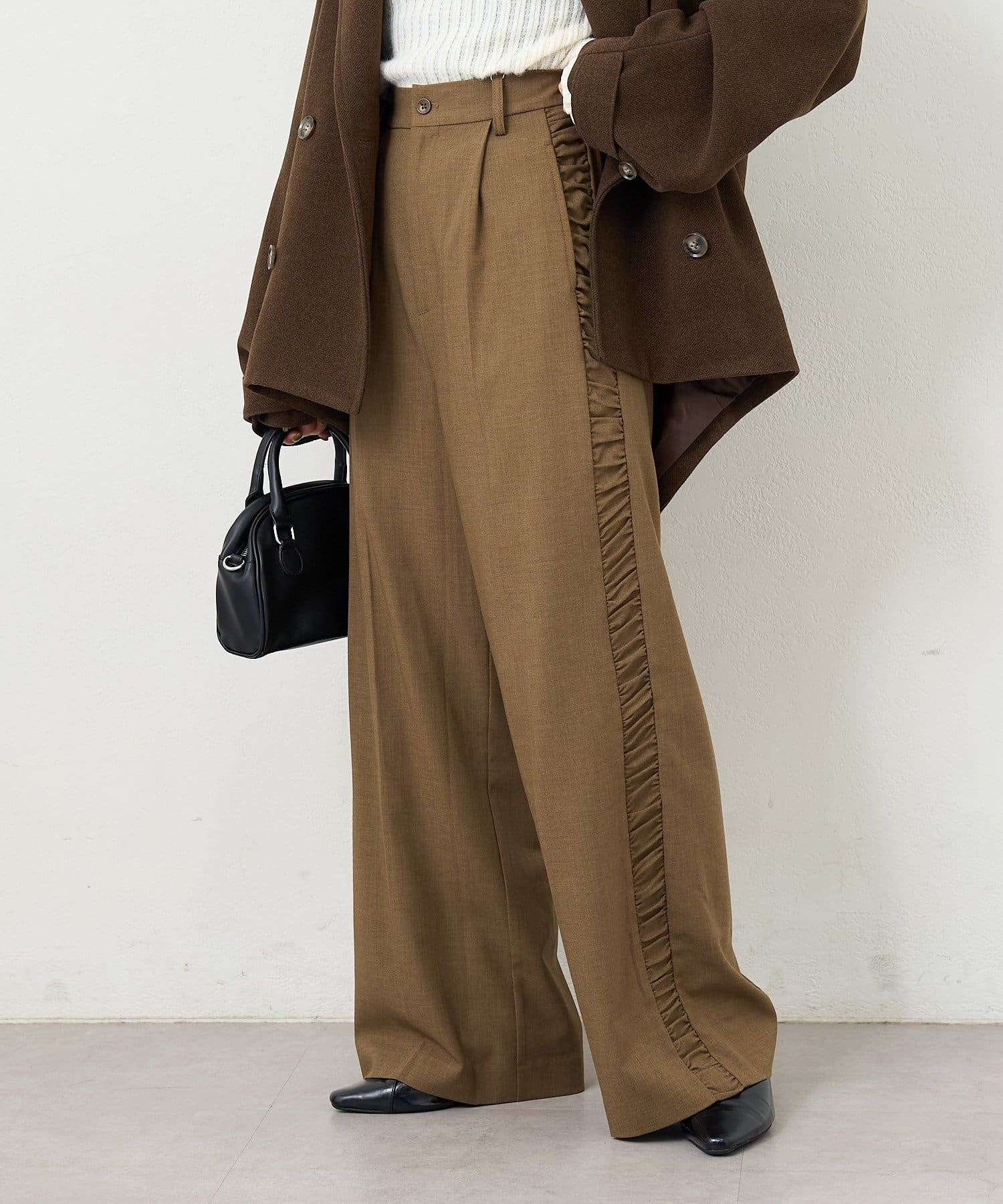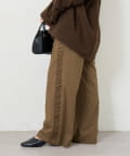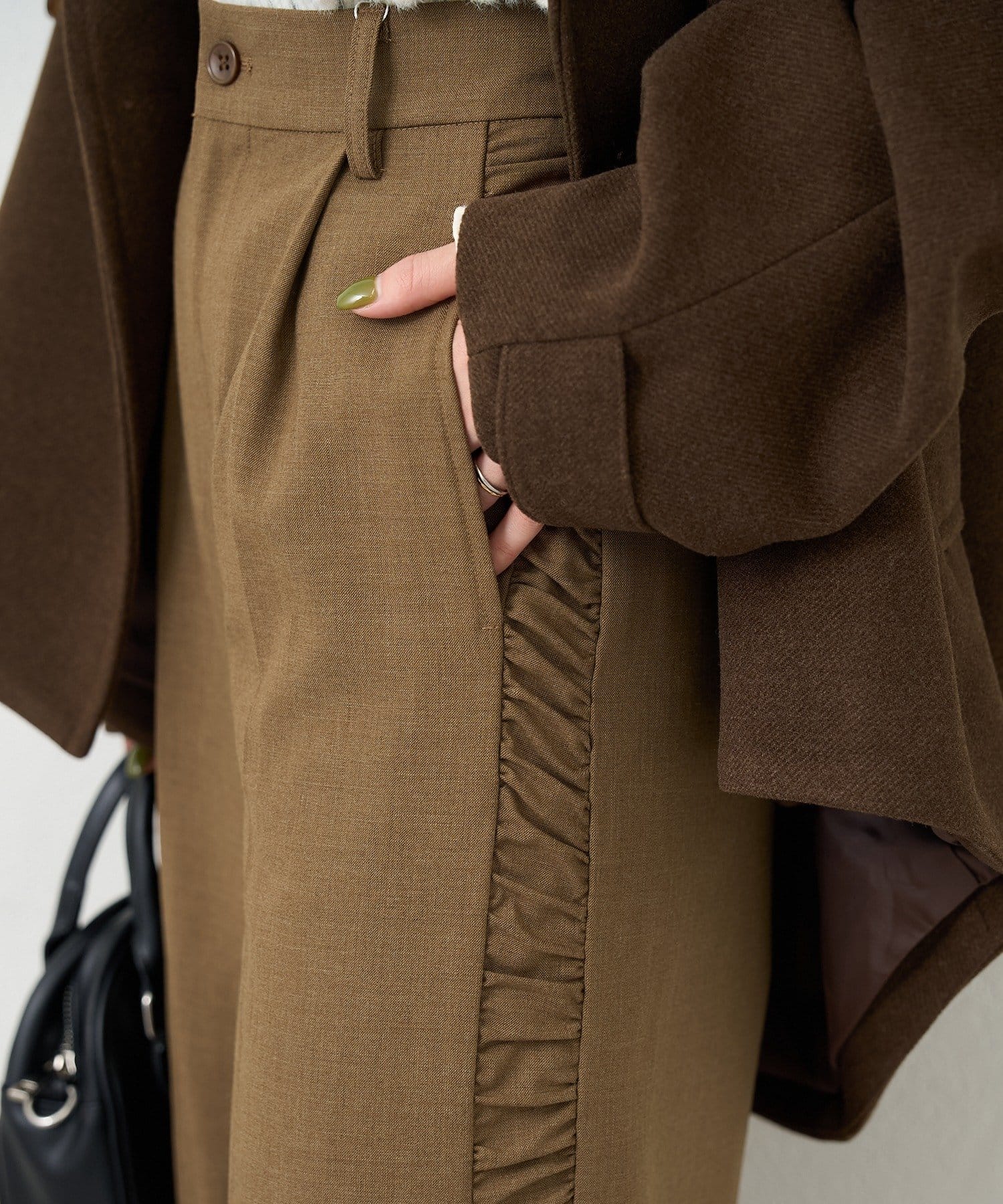 サイドに施されたシャーリングデザインがアクセントになったスラックス。