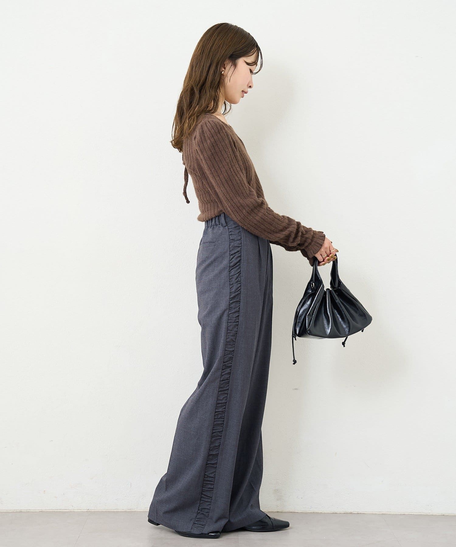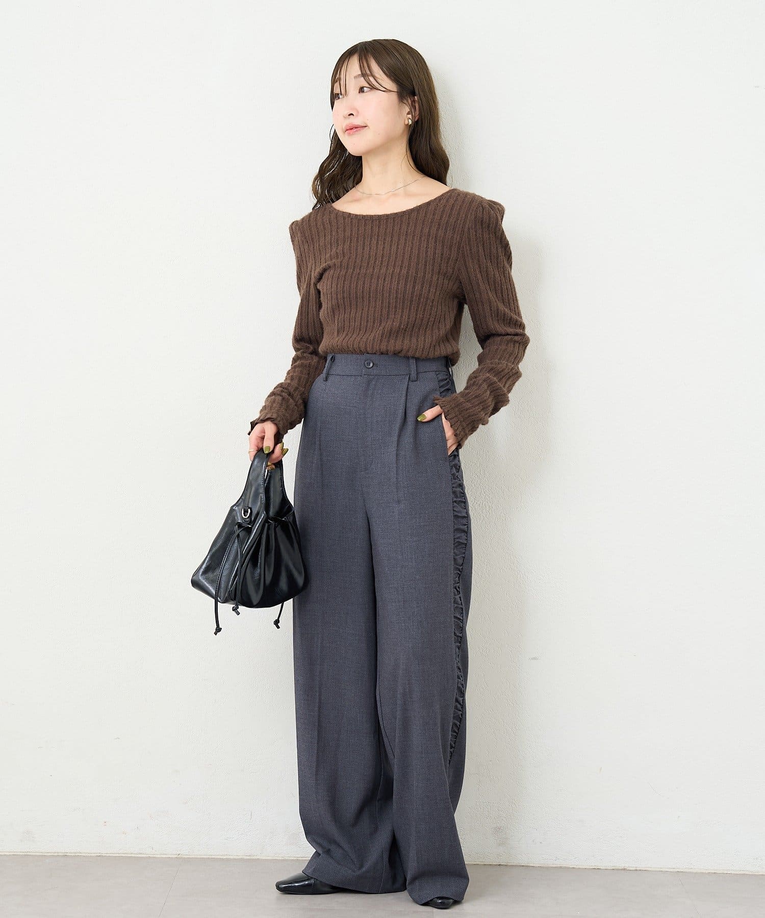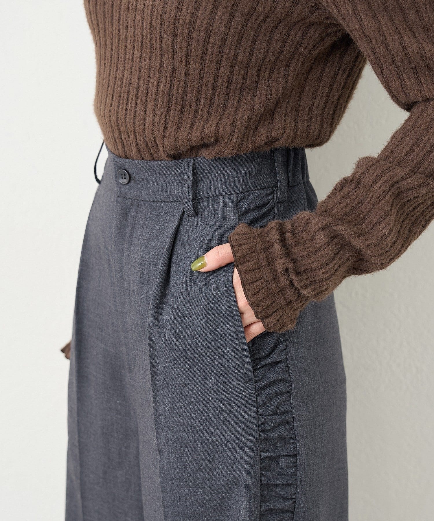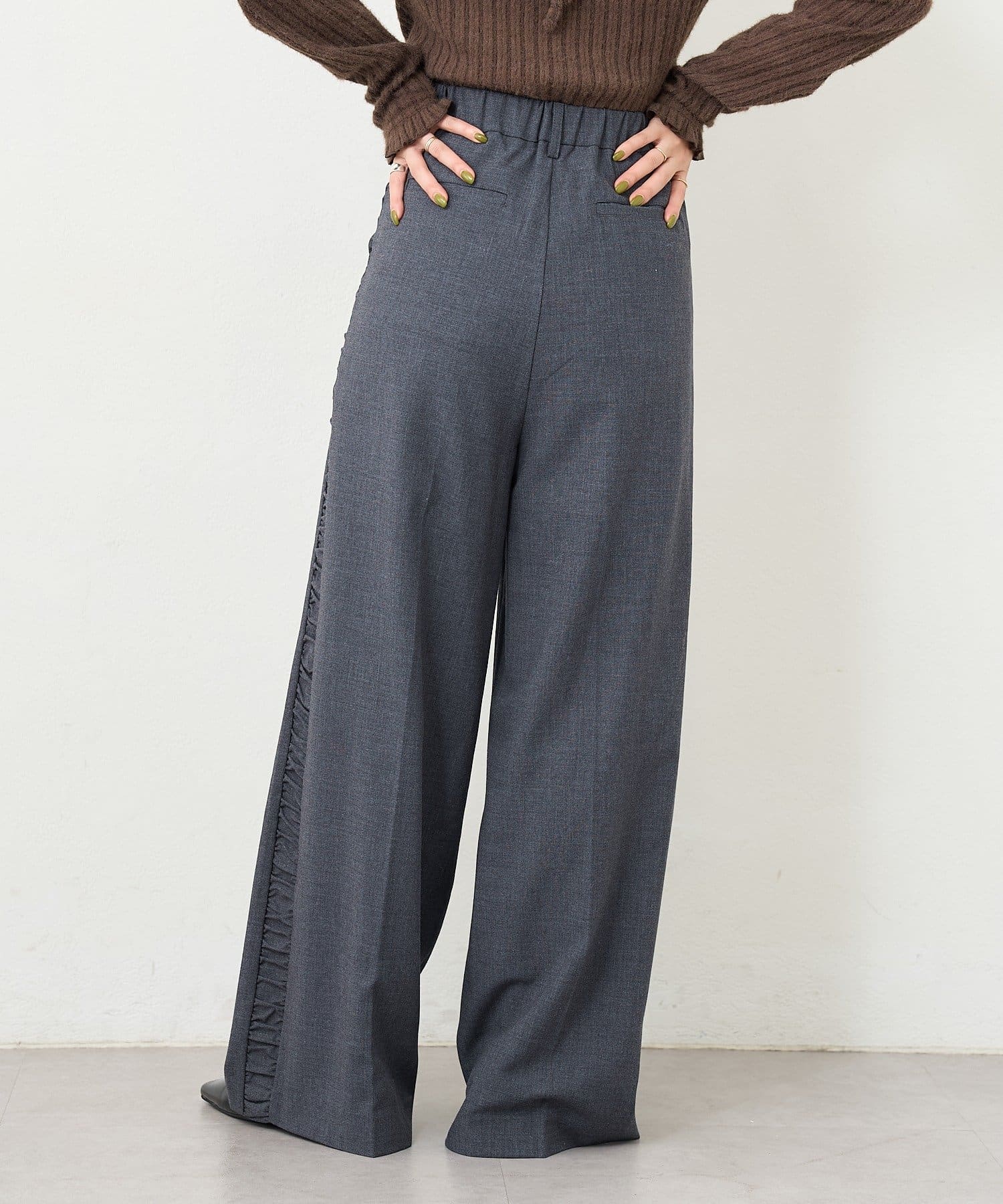 サイドに施されたシャーリングデザインがアクセントになったスラックス。