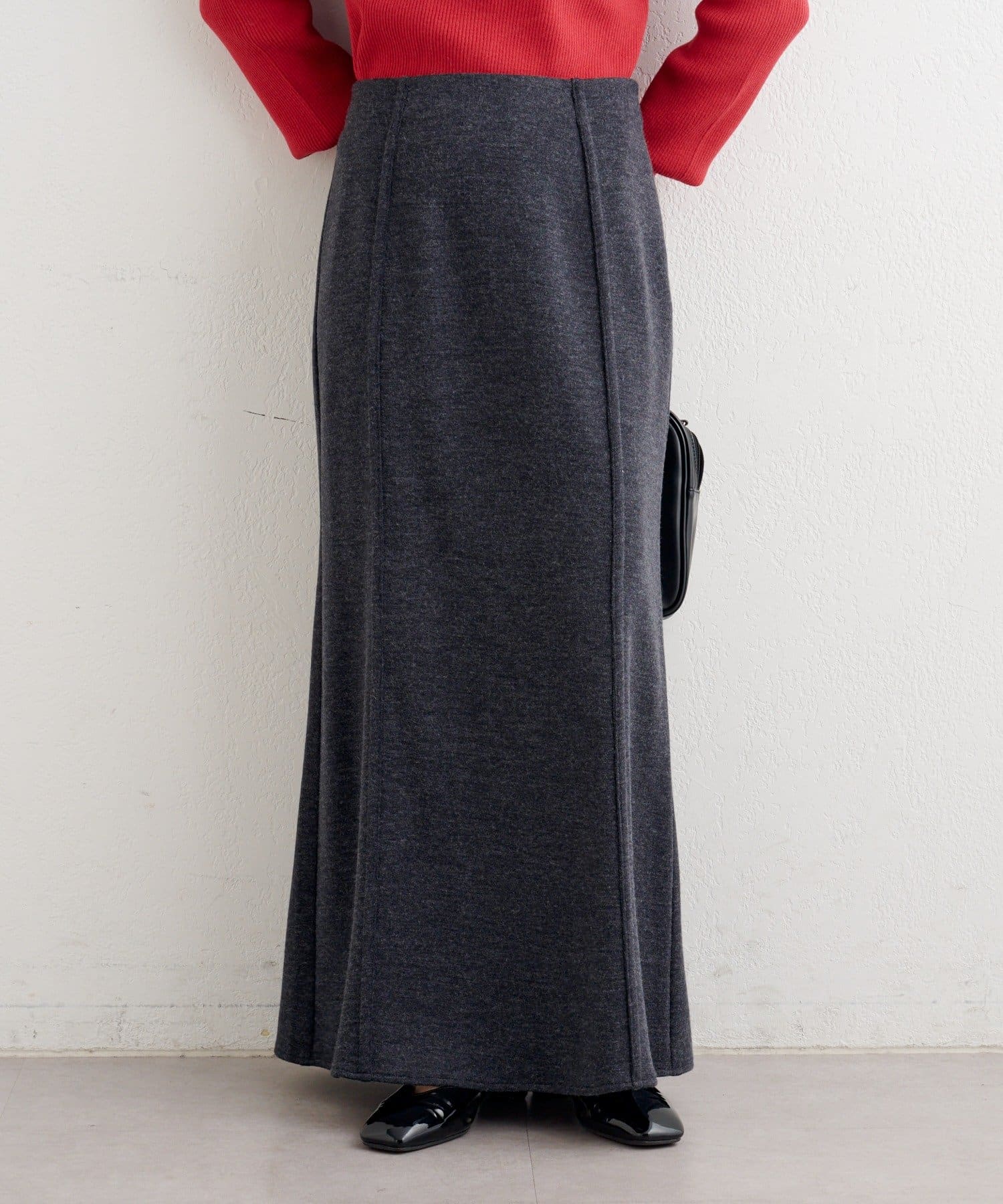 縦ラインを強調するパネル切替が、腰まわりをすっきり見せながら自然なフレアを生み、上品なロングシルエットを演出します。