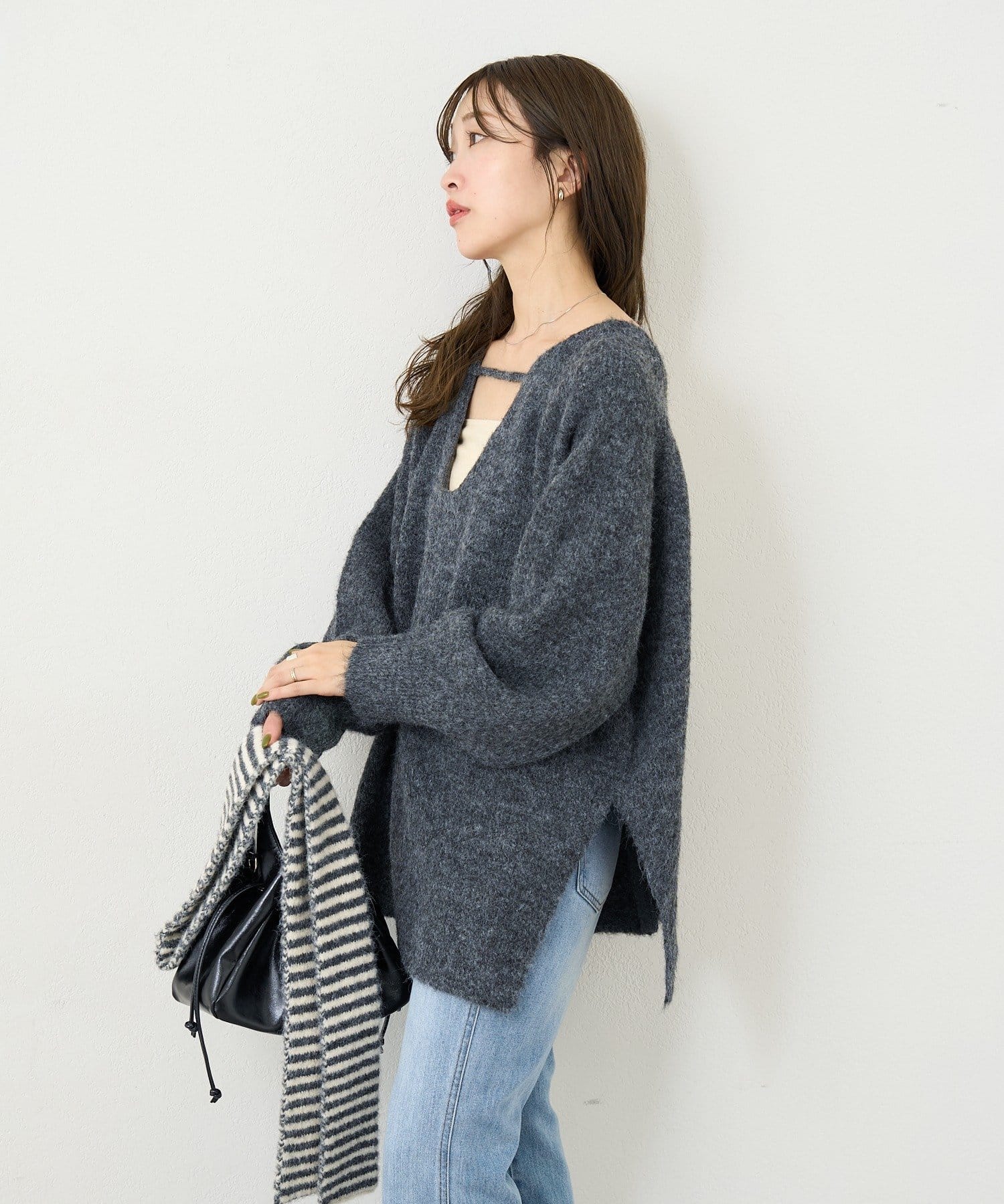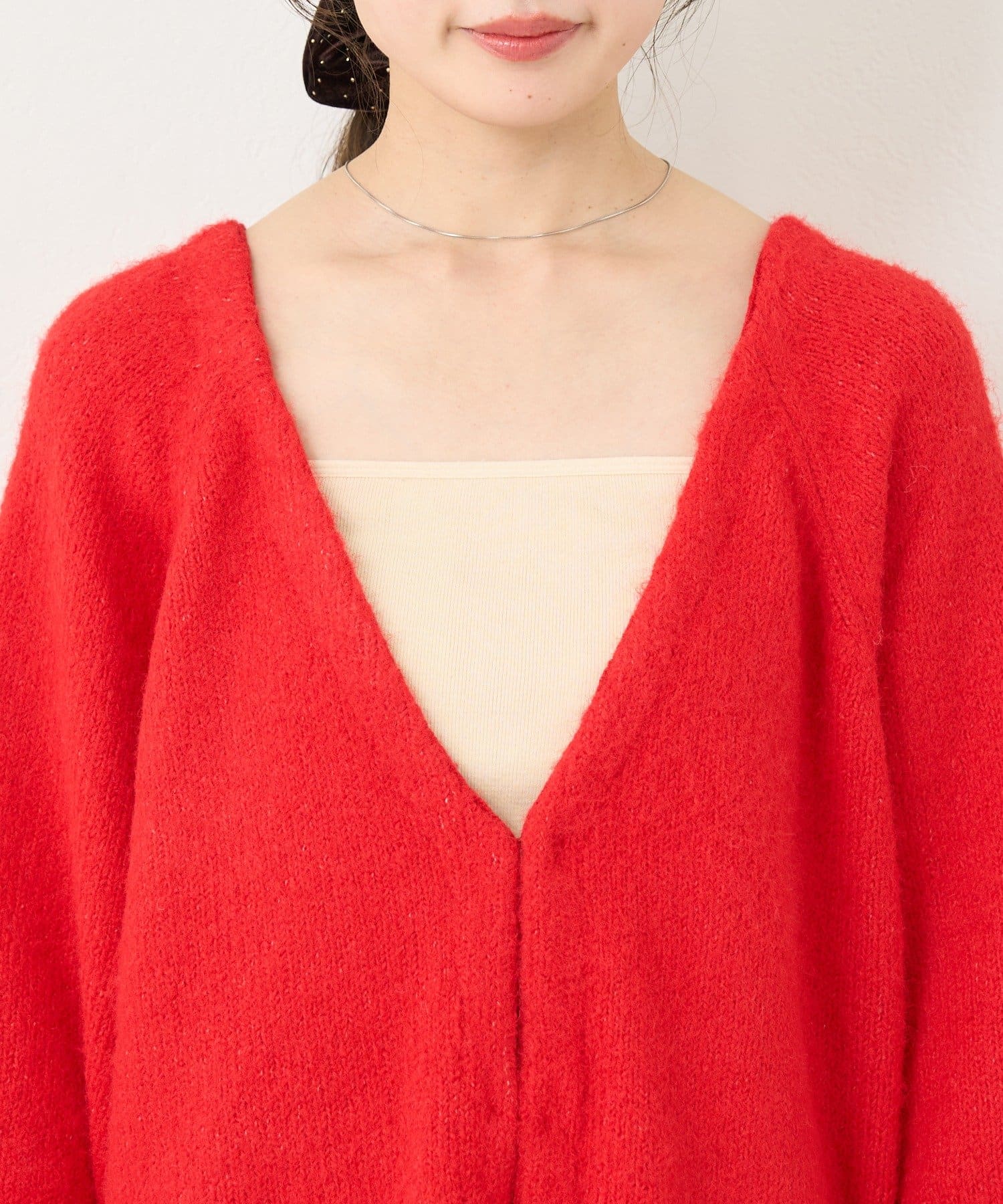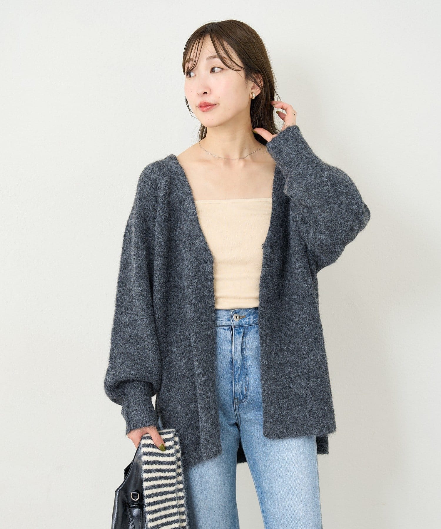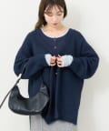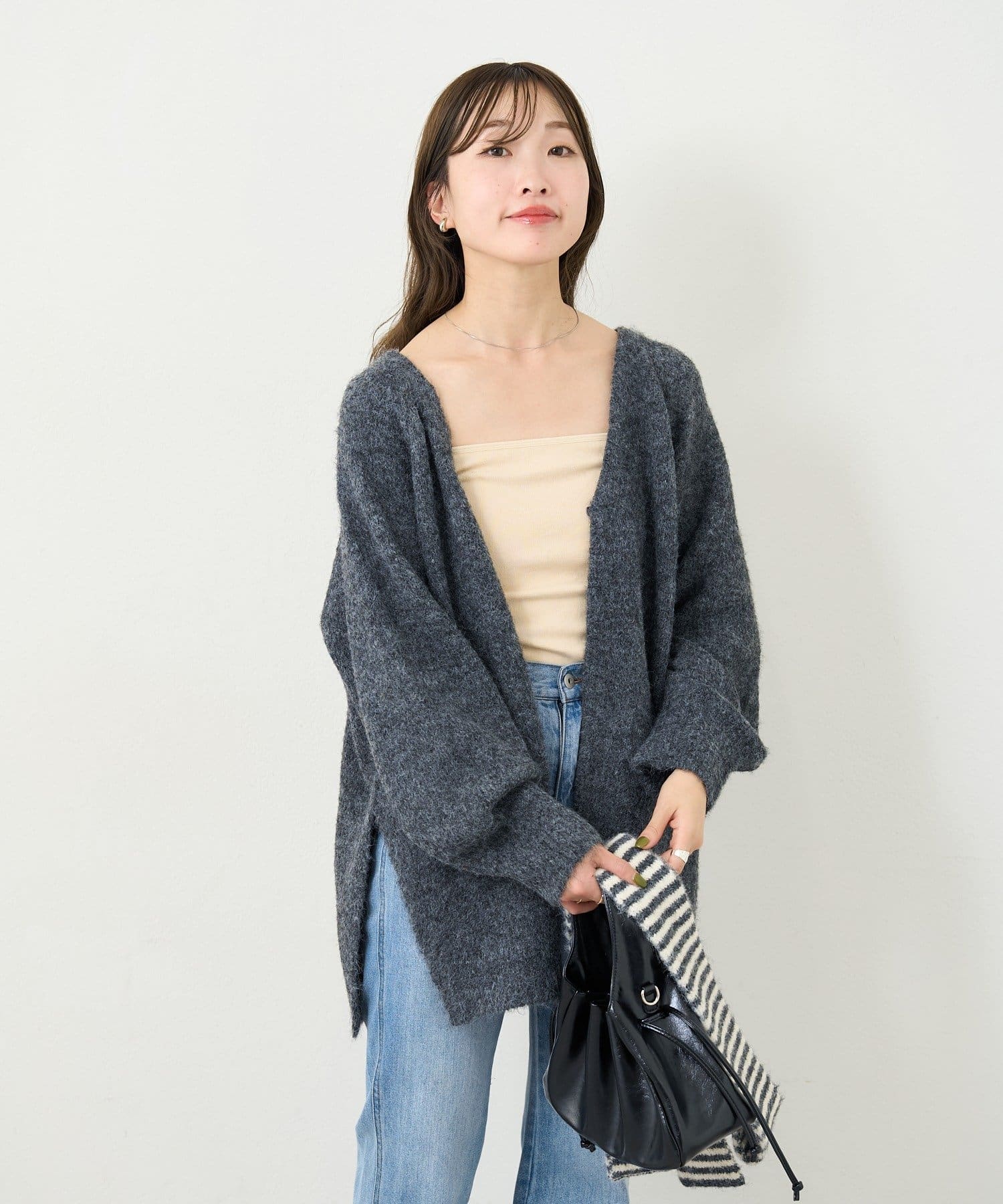 ホック開きのデザインで、カーディガンとして羽織っても、トップス風にも着られる万能アイテム。