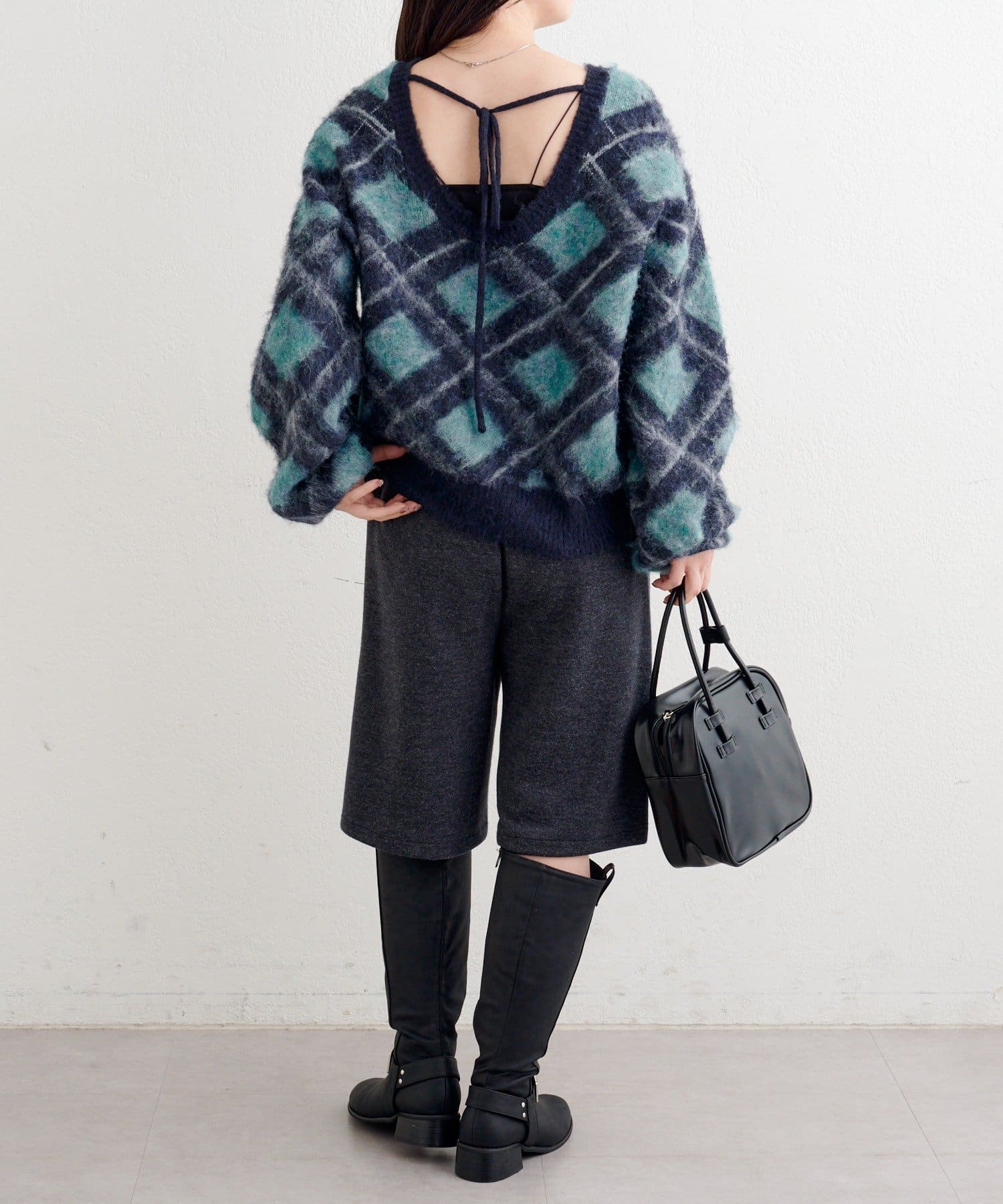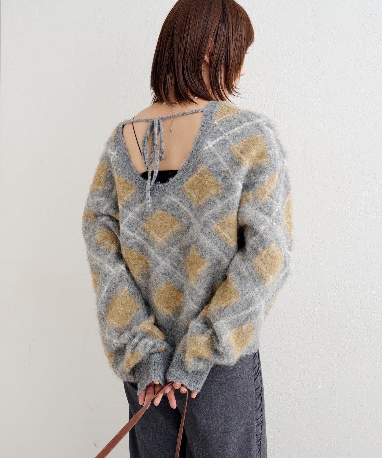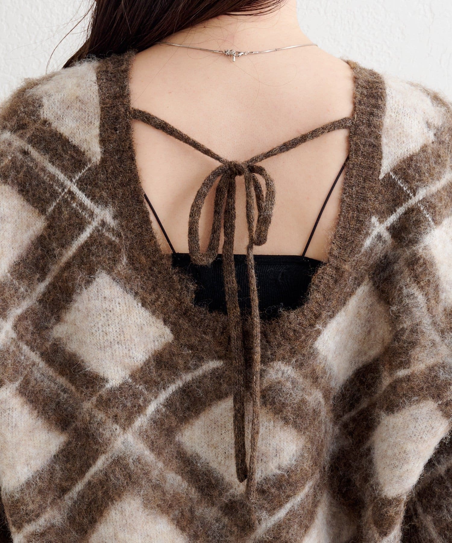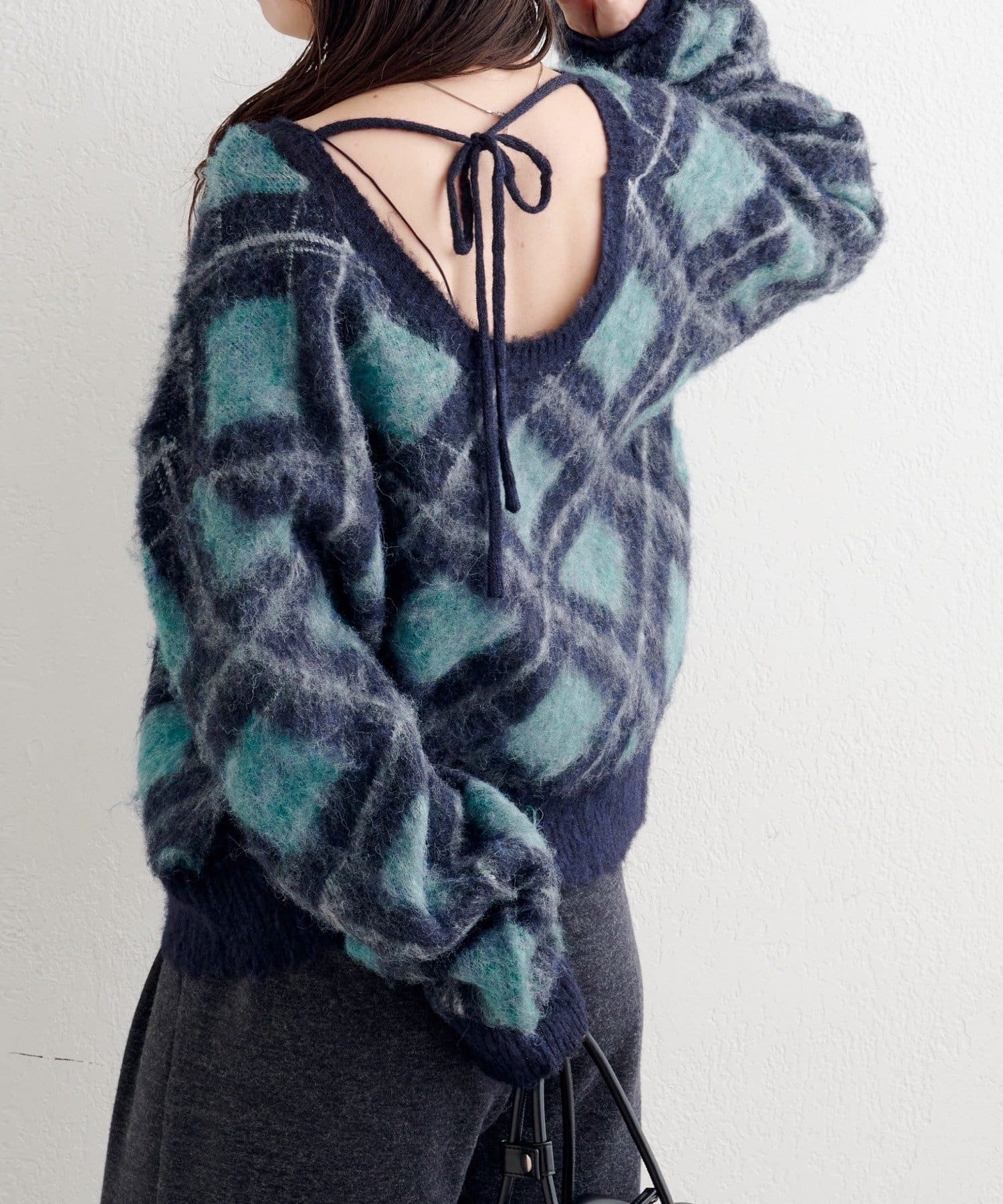 ふわっと軽い起毛感と背中リボンが可愛い、冬映えアーガイルニット