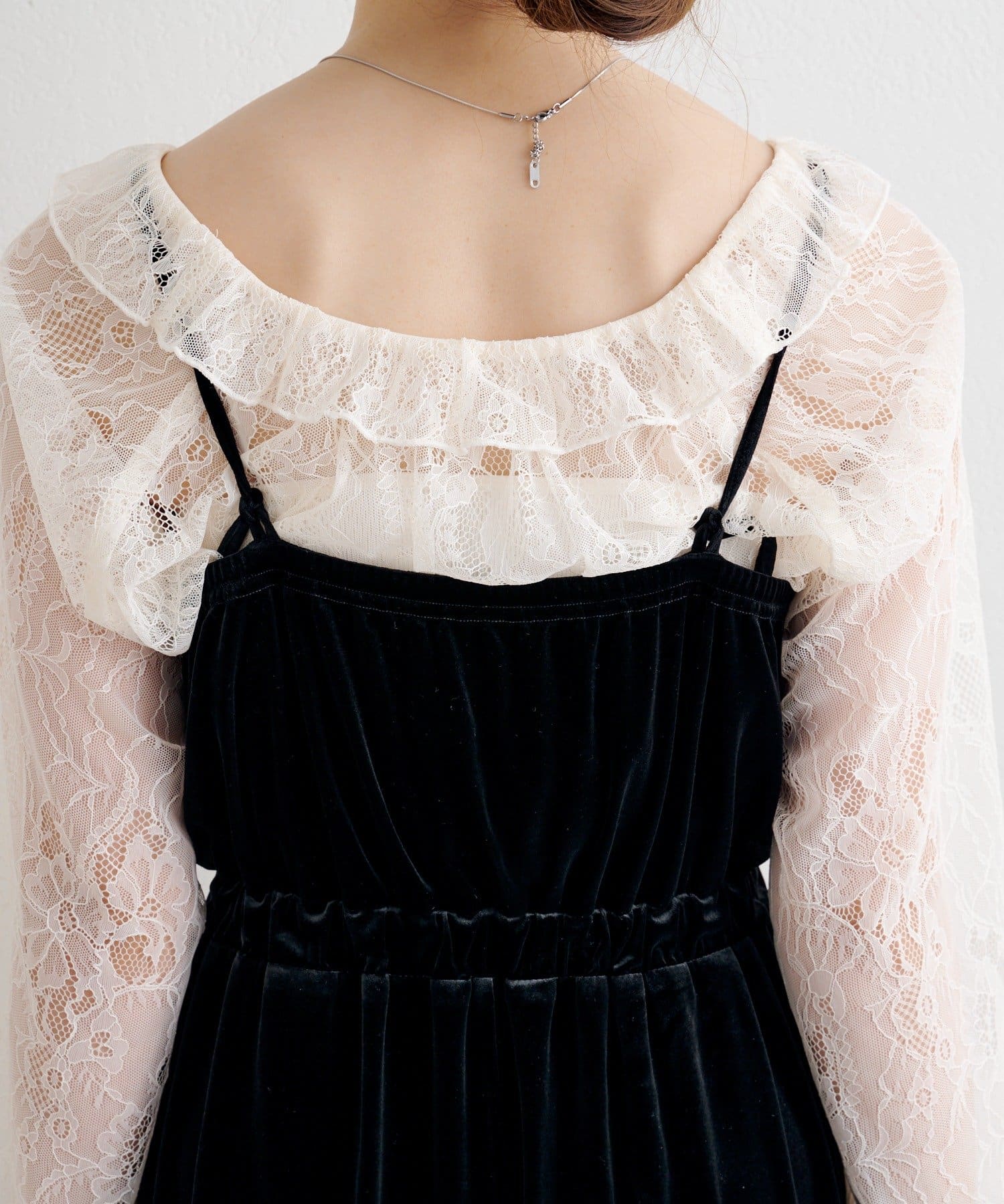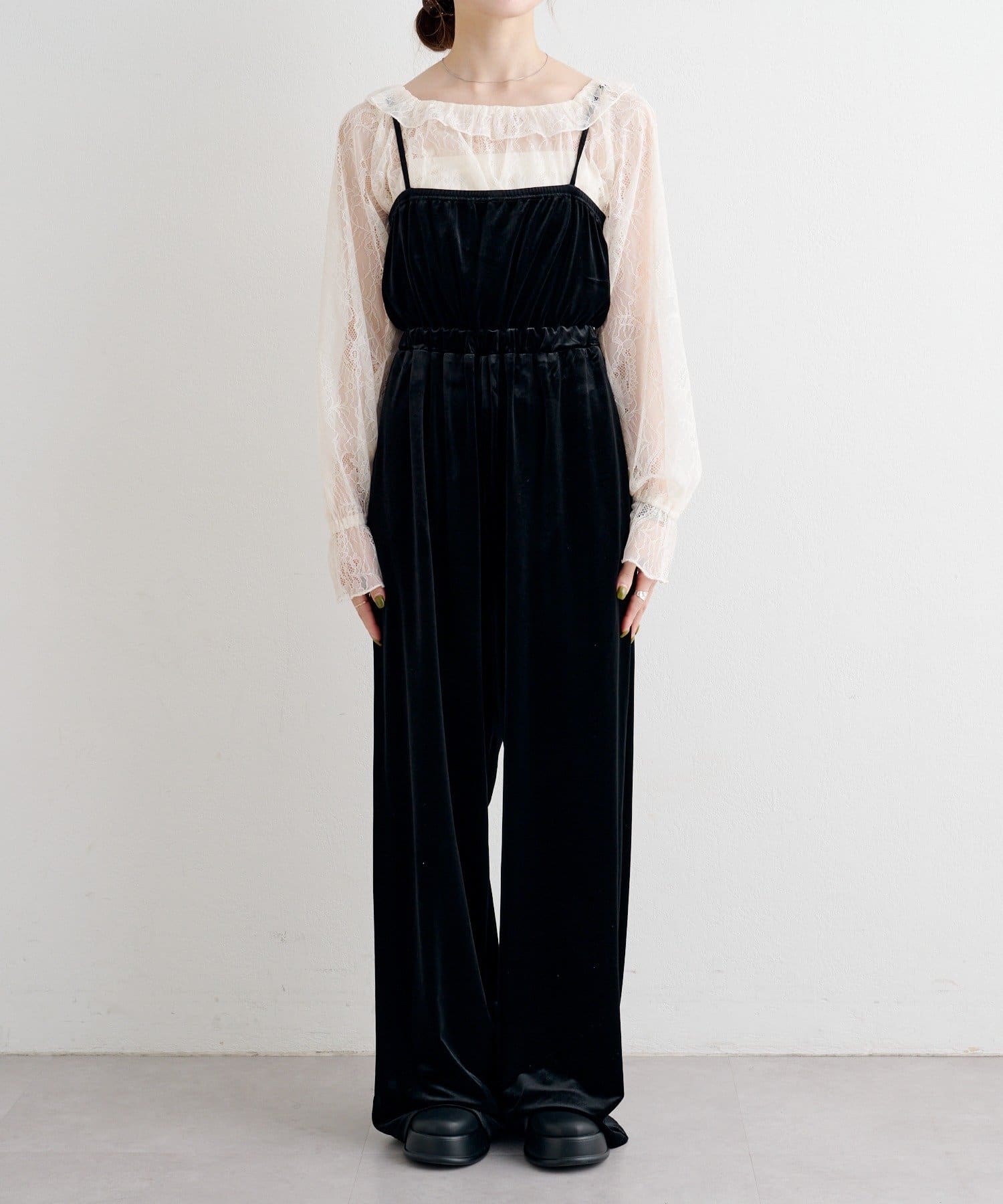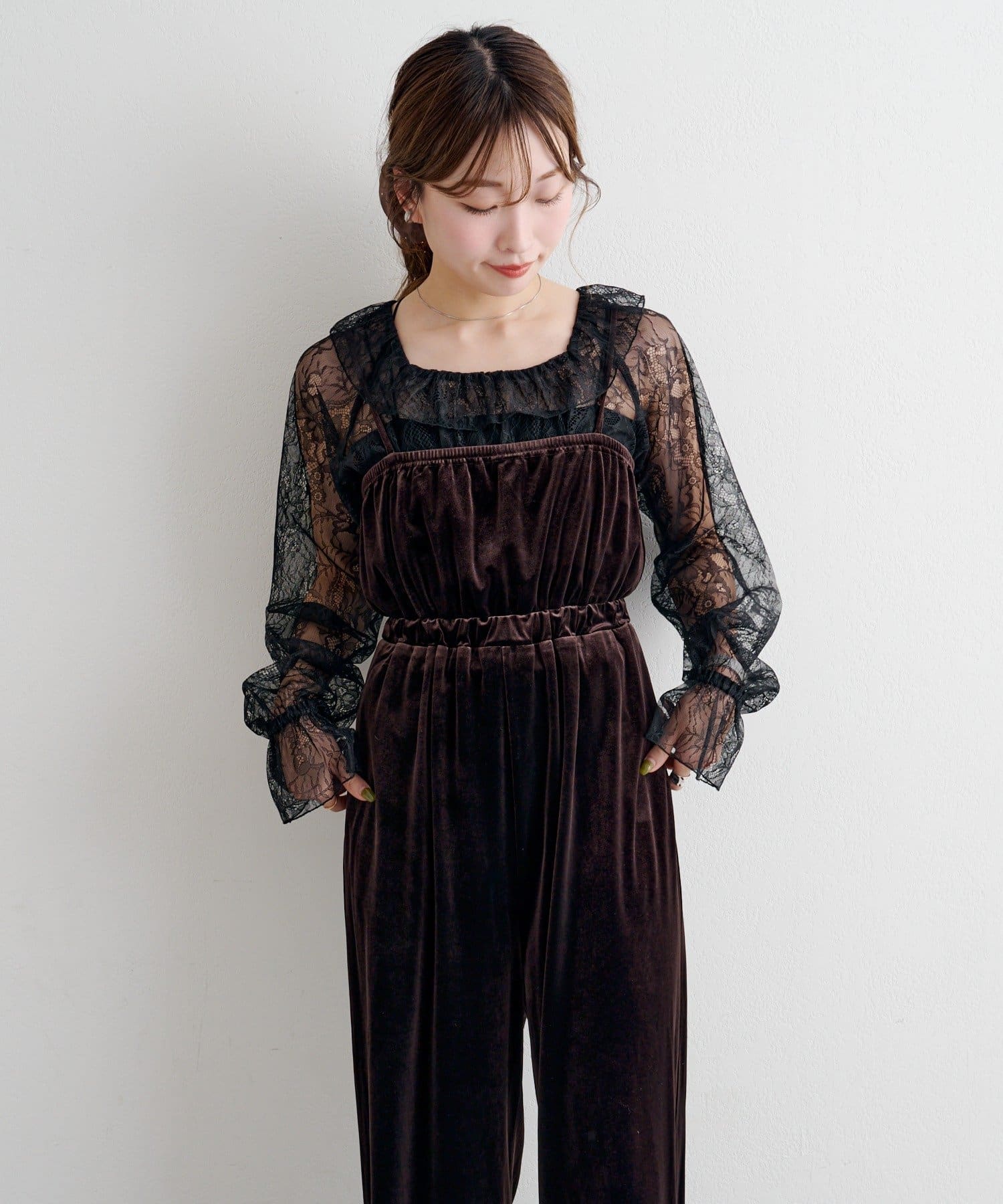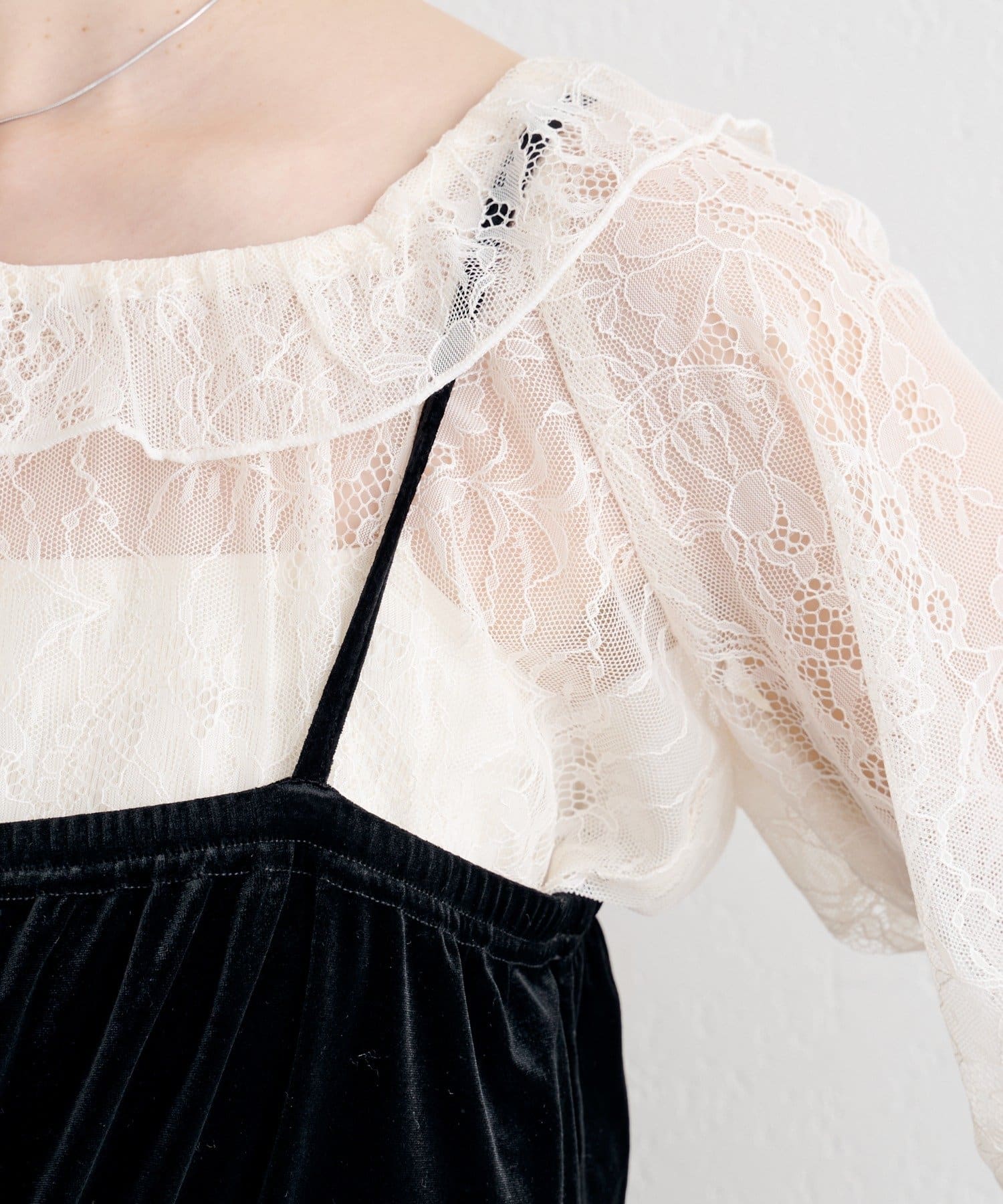 レーストップスとベロアコンビネゾンがセットになった、華やかさと上品さを兼ね備えたアイテム。